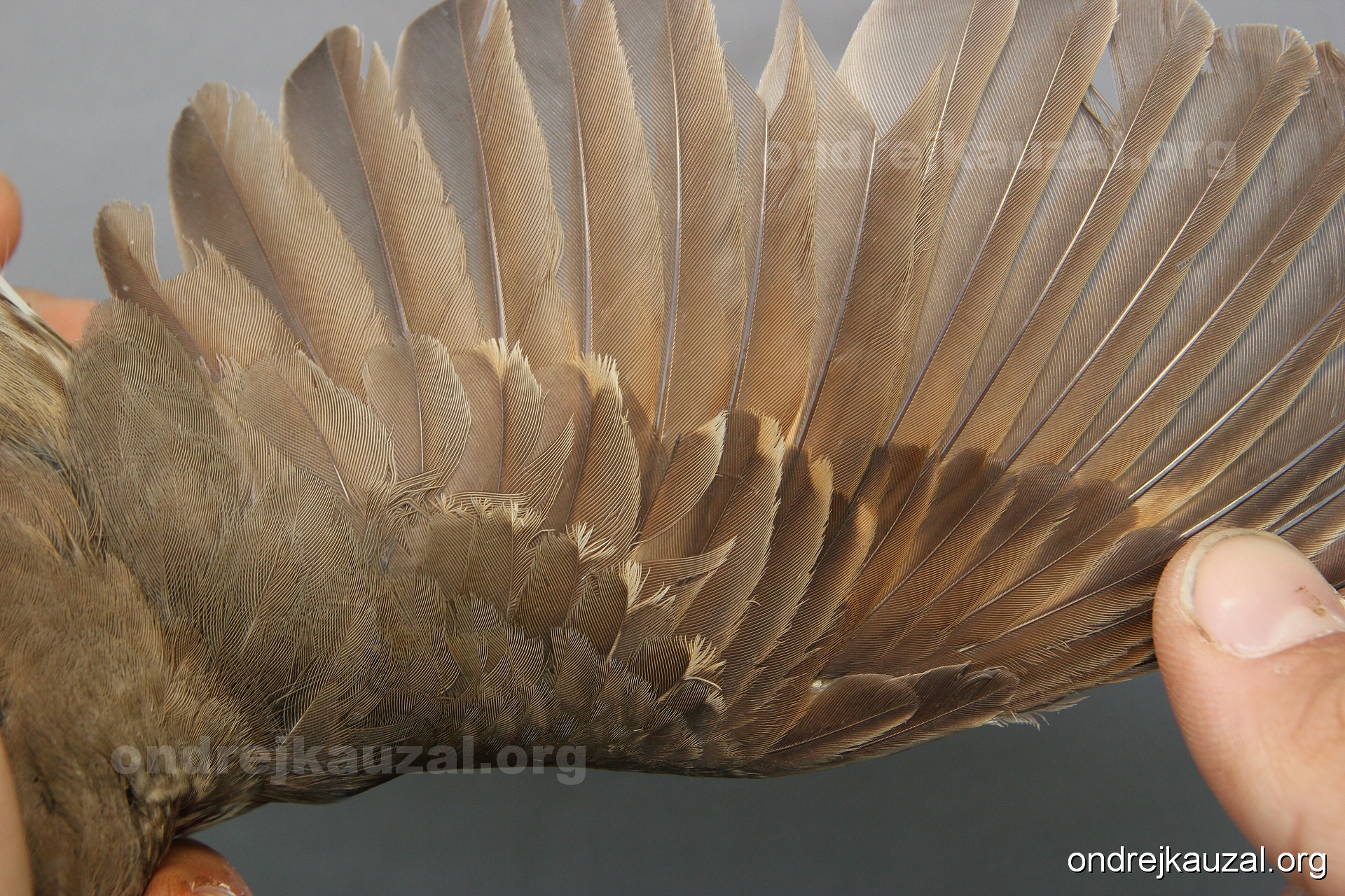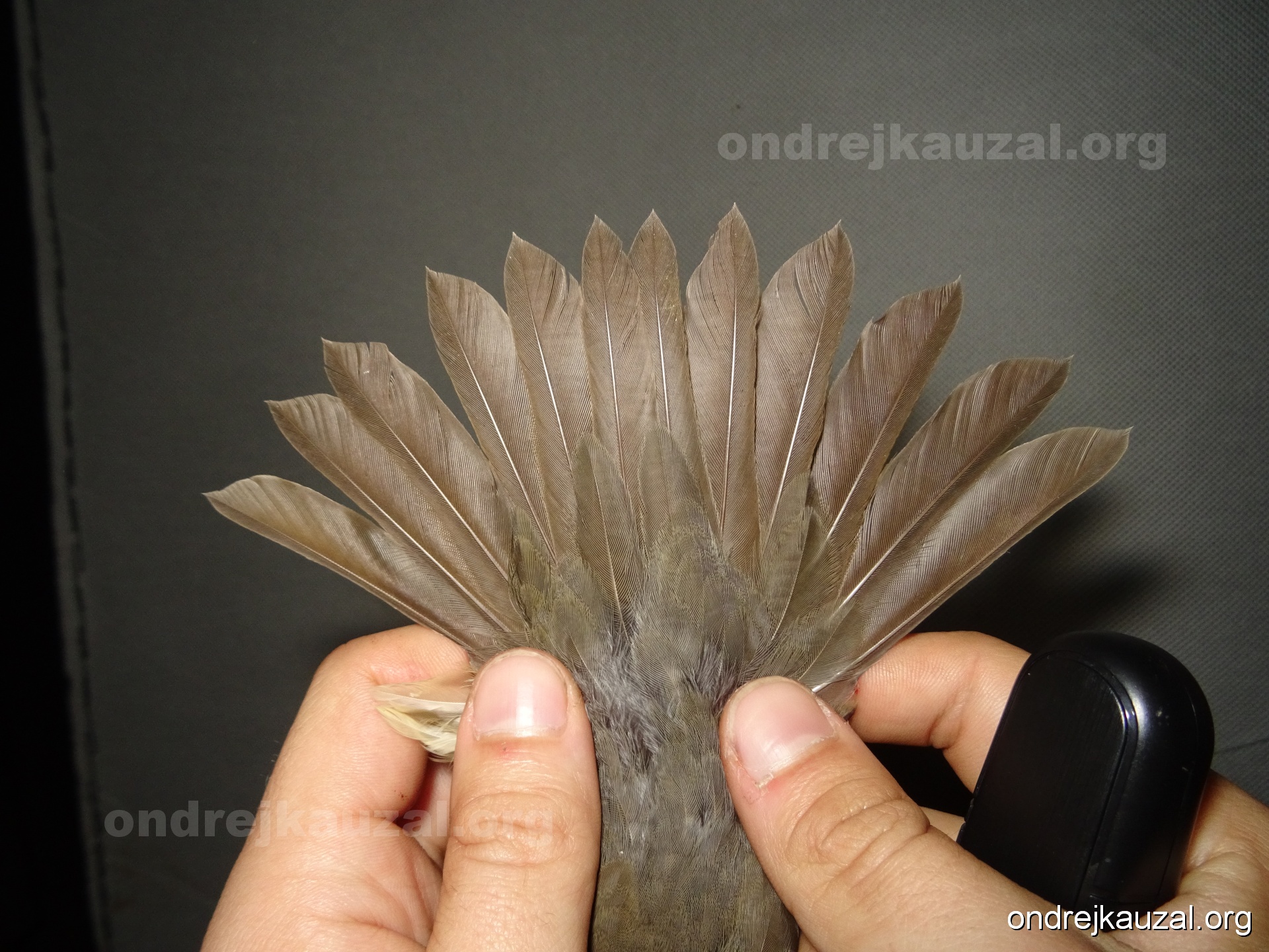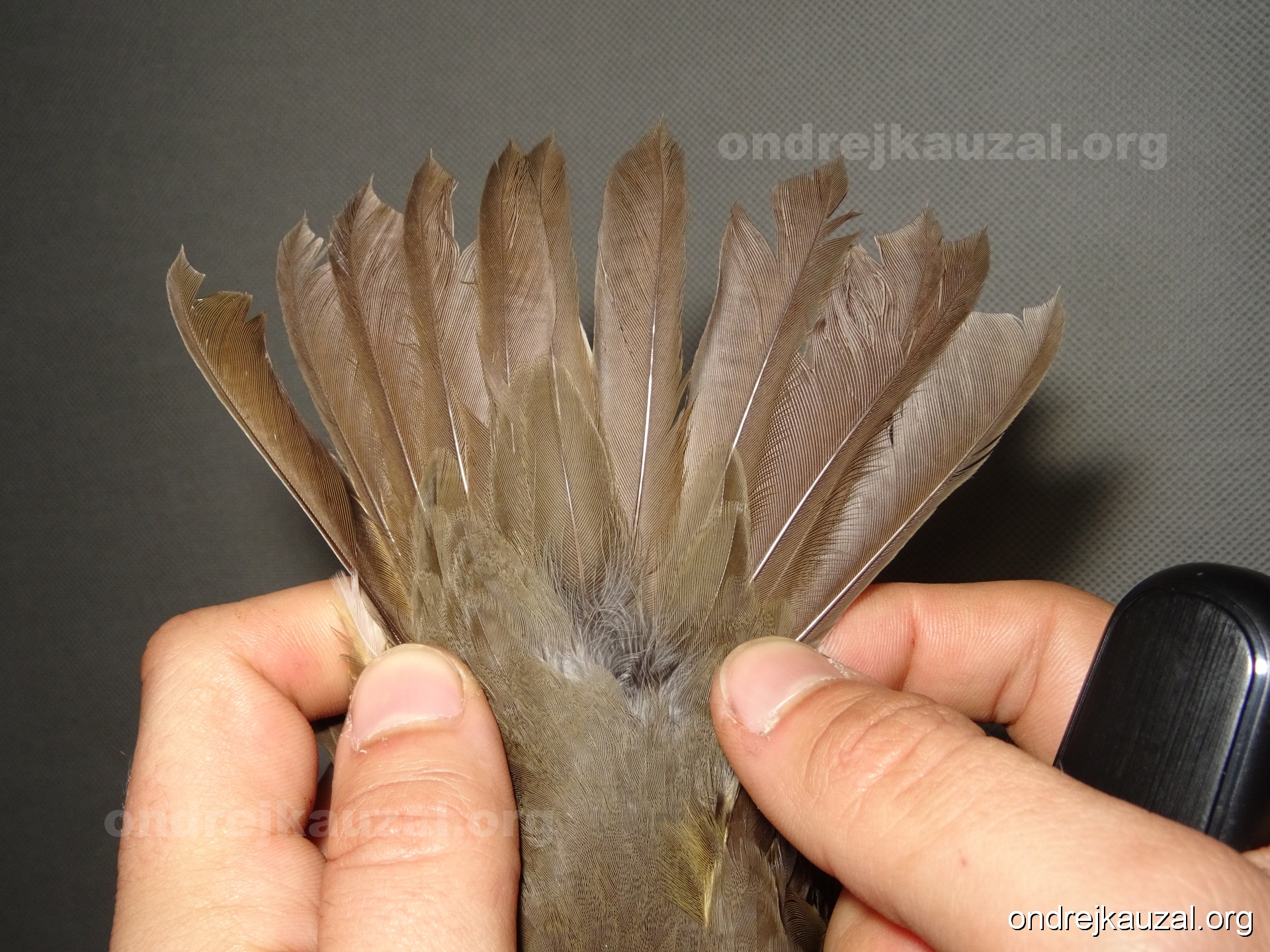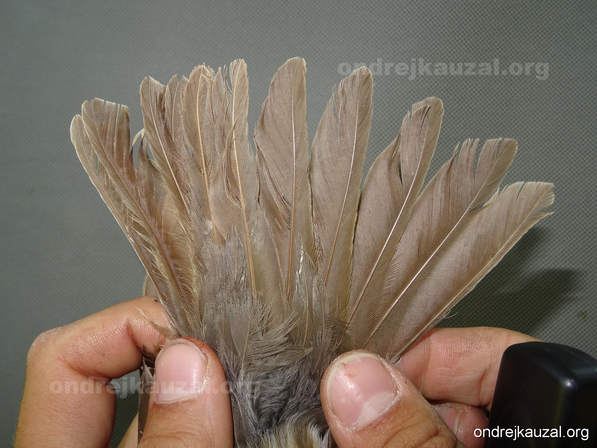 There is a nice fault bar visible in its tail. Its position suggest a simultaneous growth and shape suggest juvenile feathers. The visible moult-limit in the greater coverts furthermore supports ageing as 2CY (euring: 5).