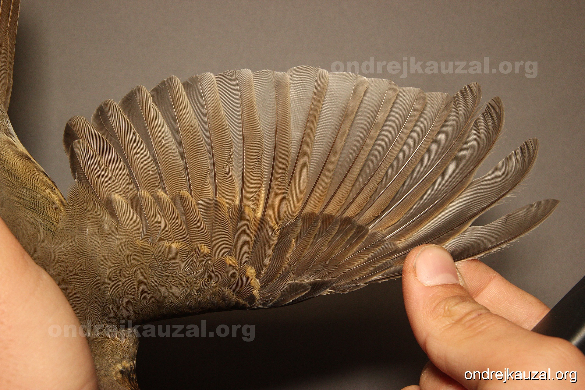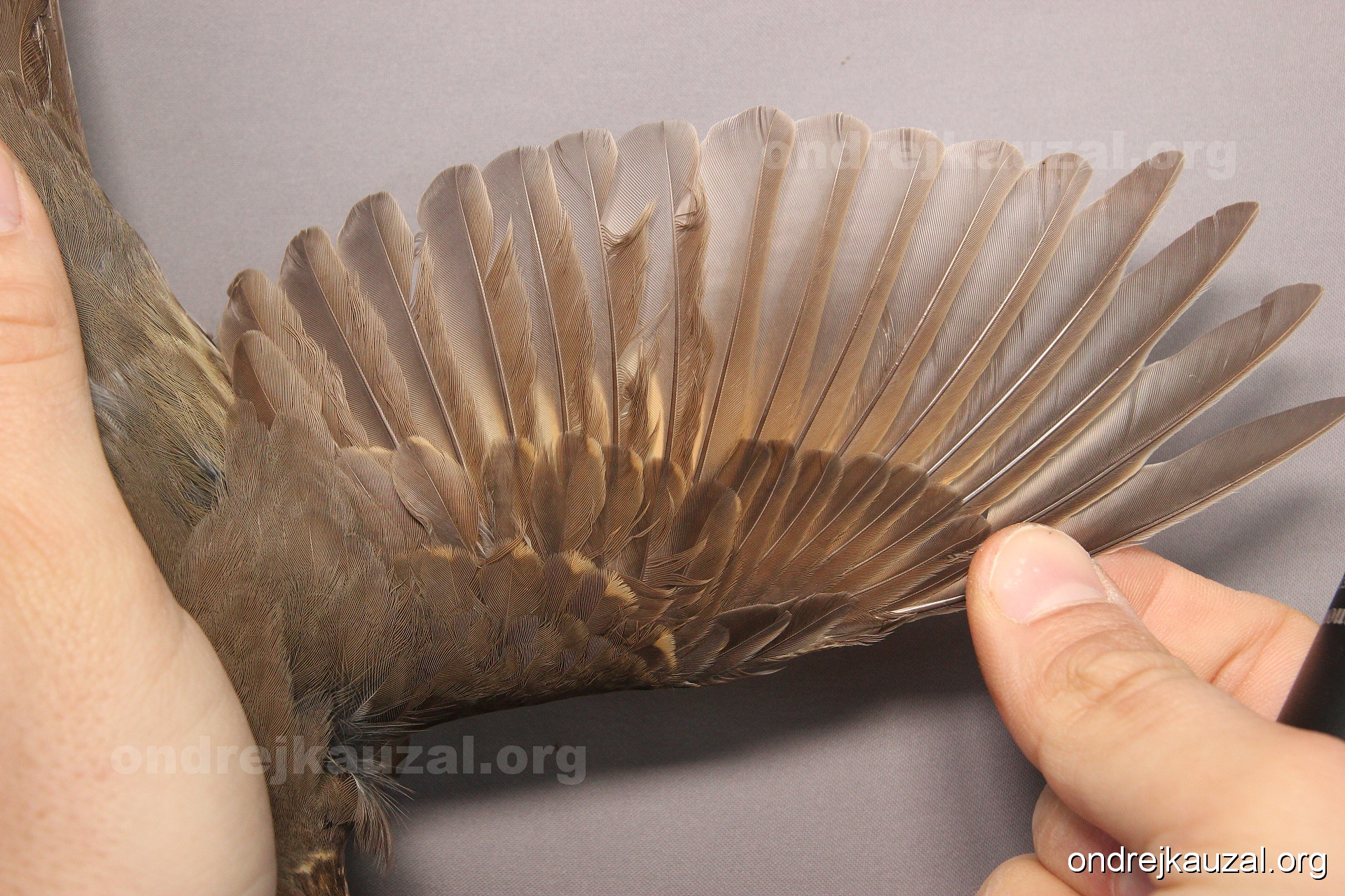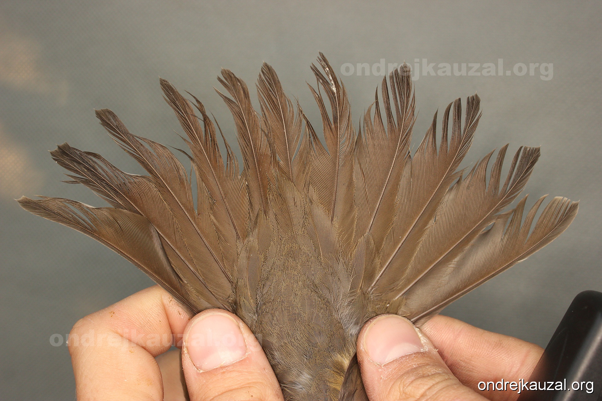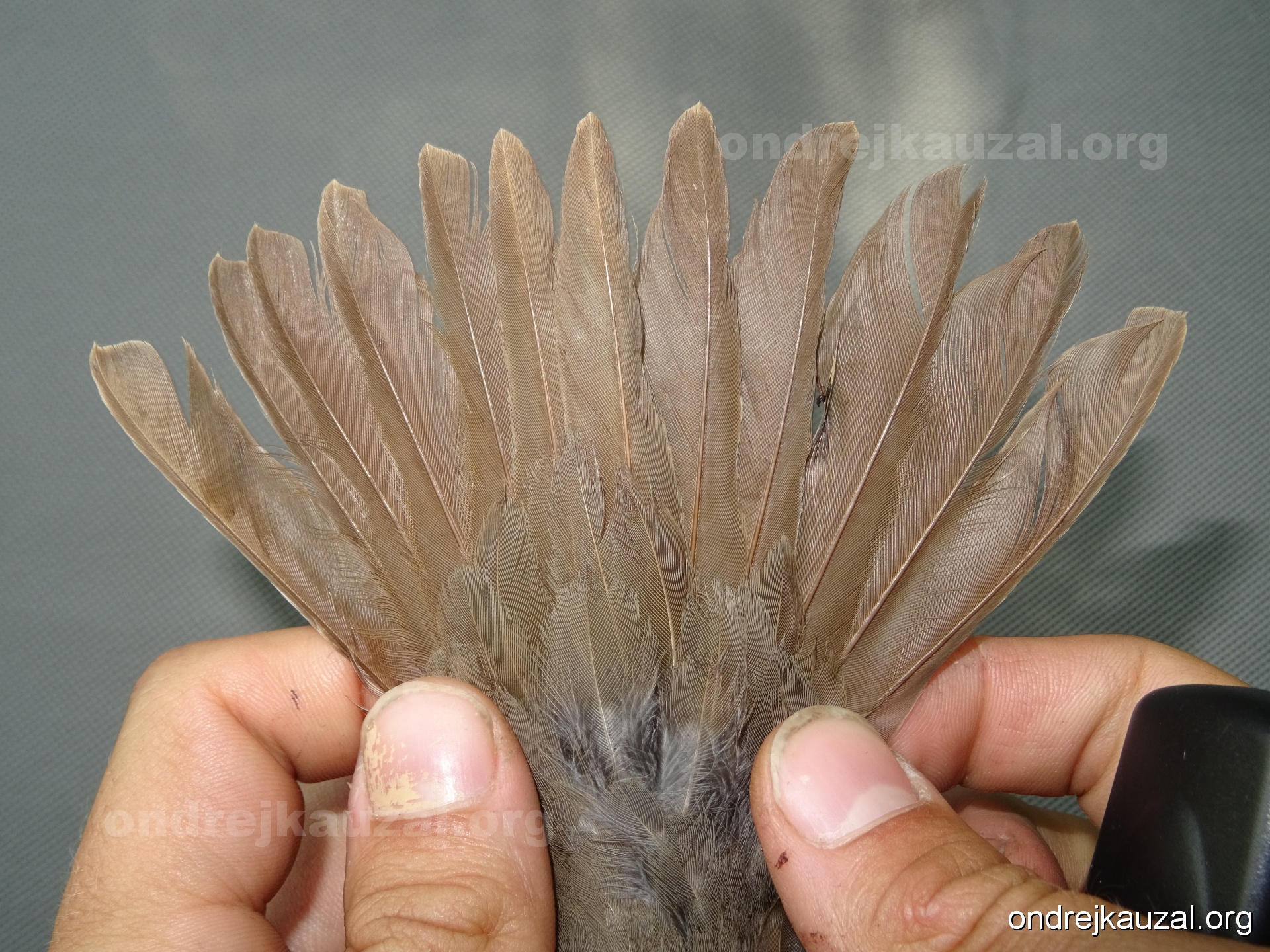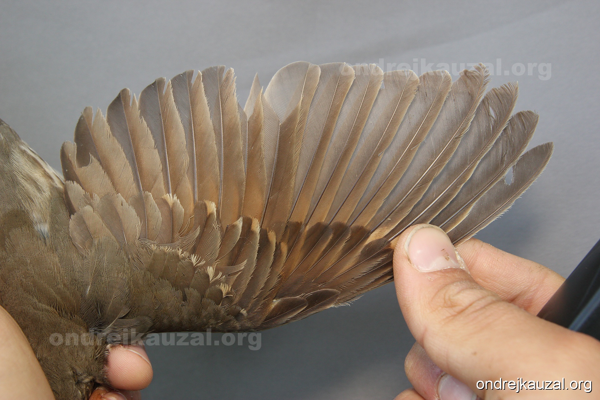 There is a nice fault bar visible in its tail. Its position suggest a simultaneous growth and shape suggest juvenile feathers. The visible moult-limit in the greater coverts furthermore supports ageing as 2CY (euring: 5).