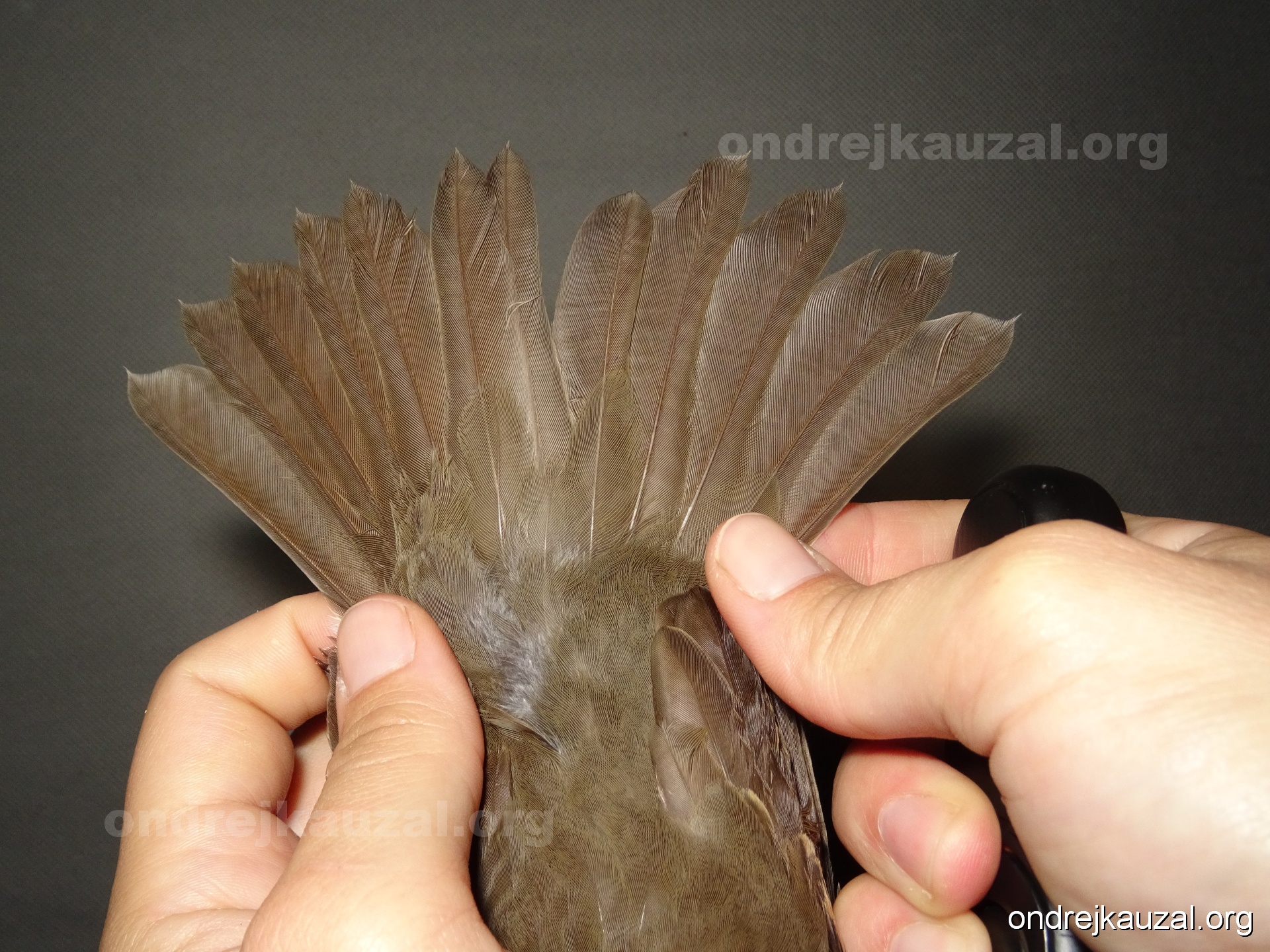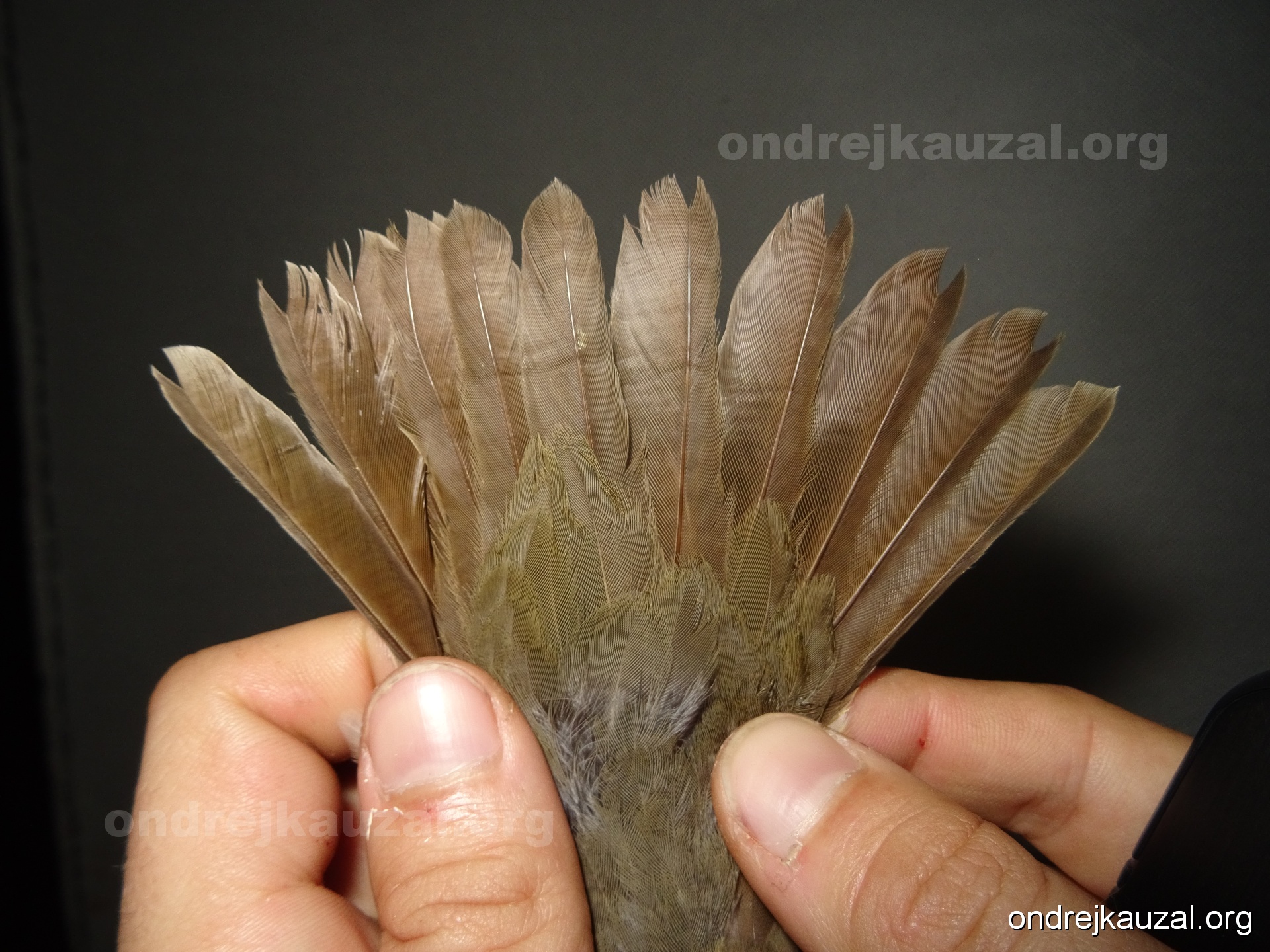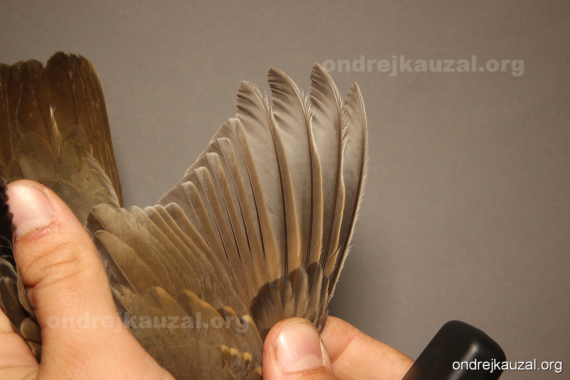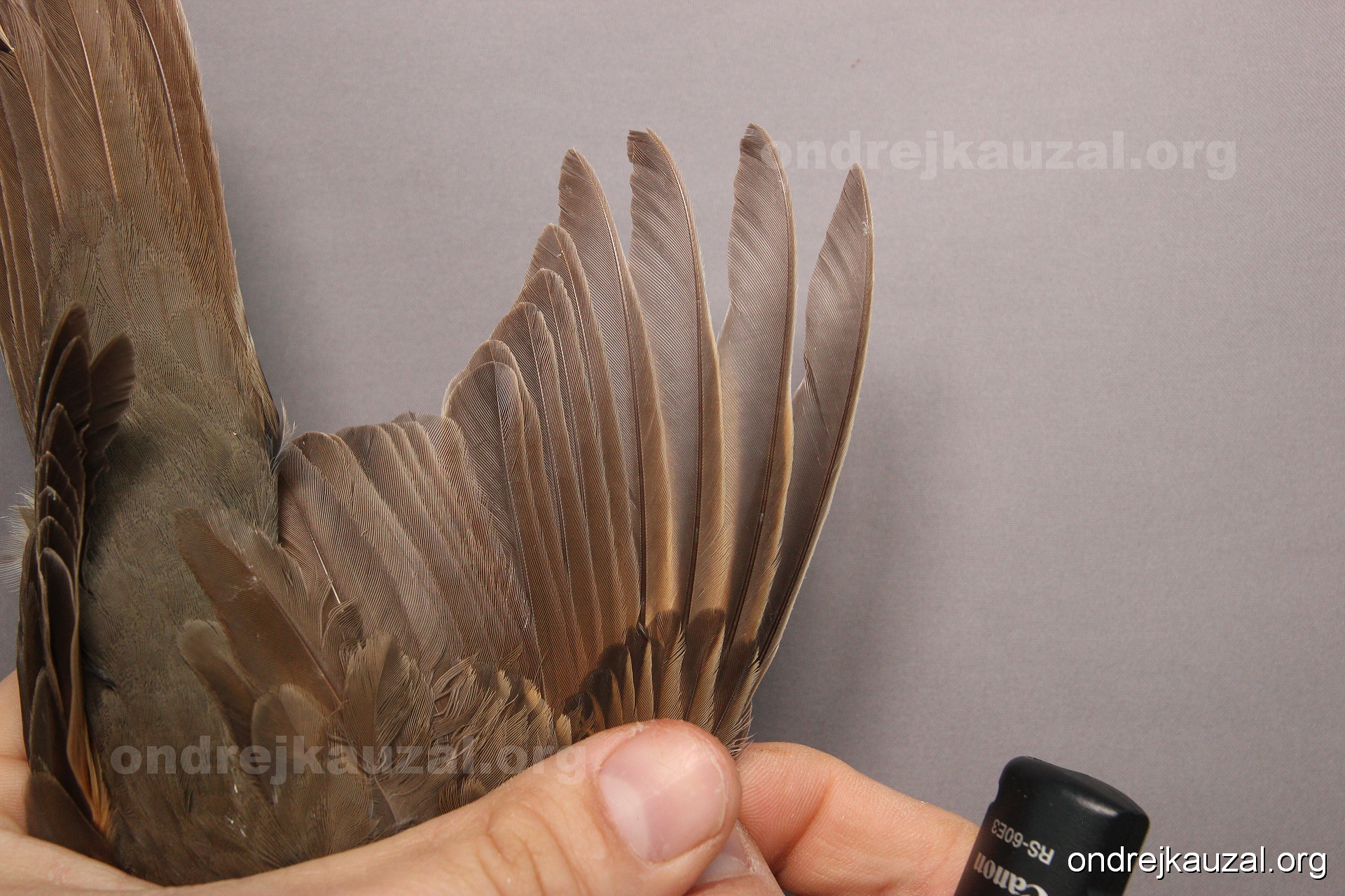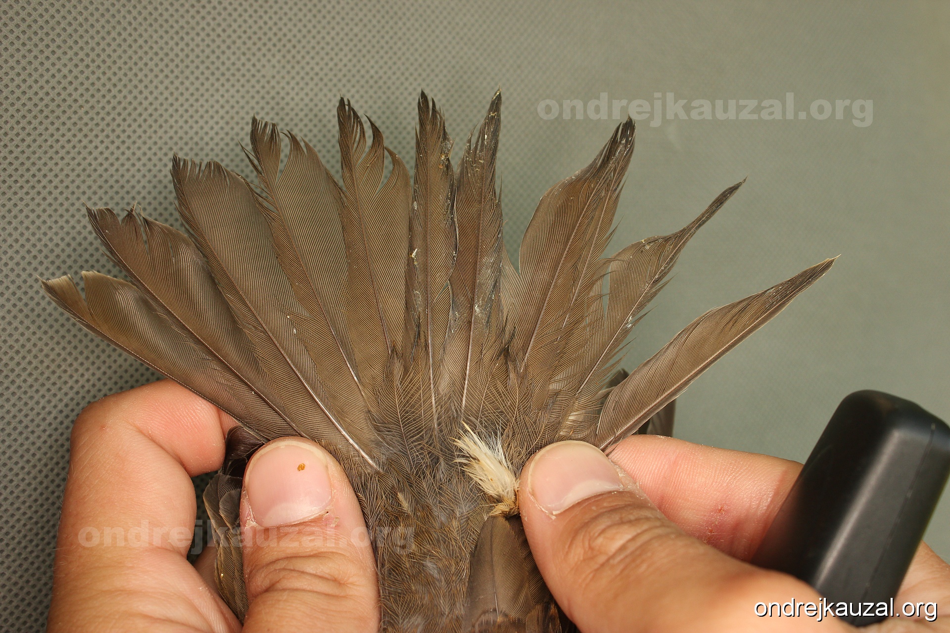 There is a nice fault bar visible in its tail. Its position suggest a simultaneous growth and shape suggest juvenile feathers. The visible moult-limit in the greater coverts furthermore supports ageing as 2CY (euring: 5).