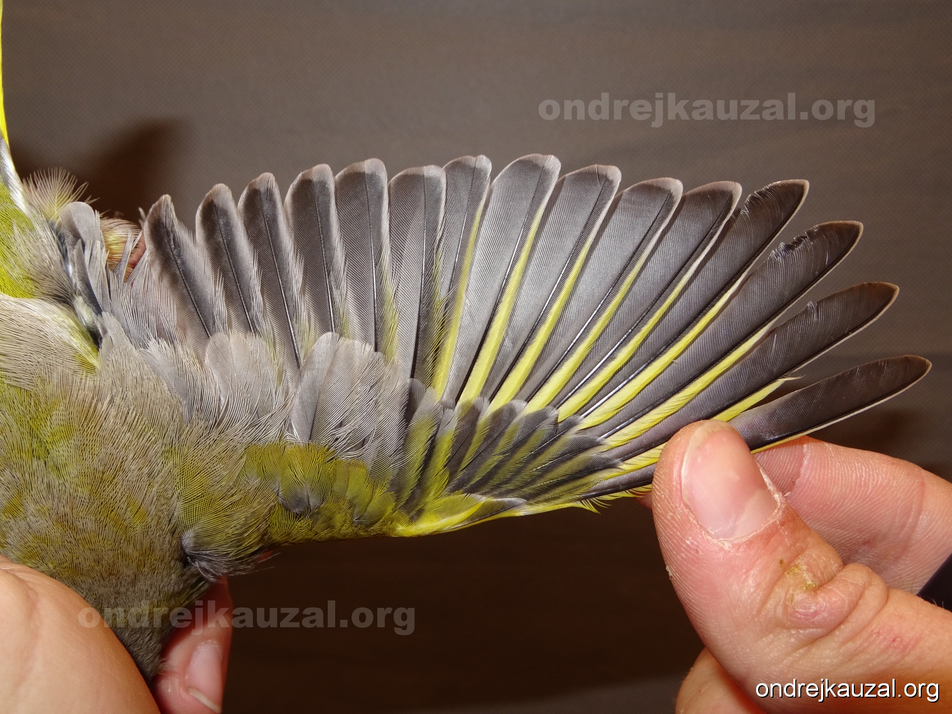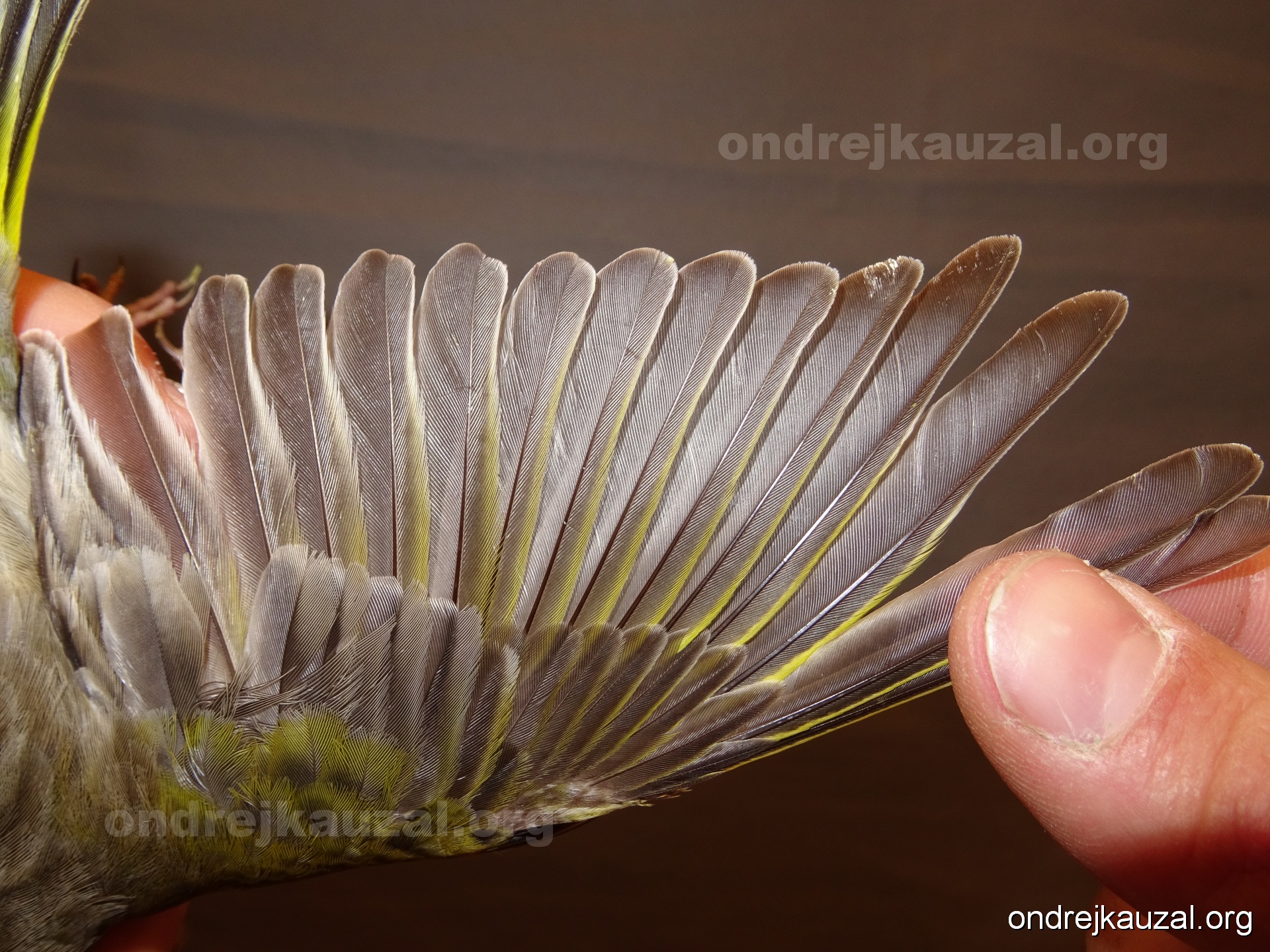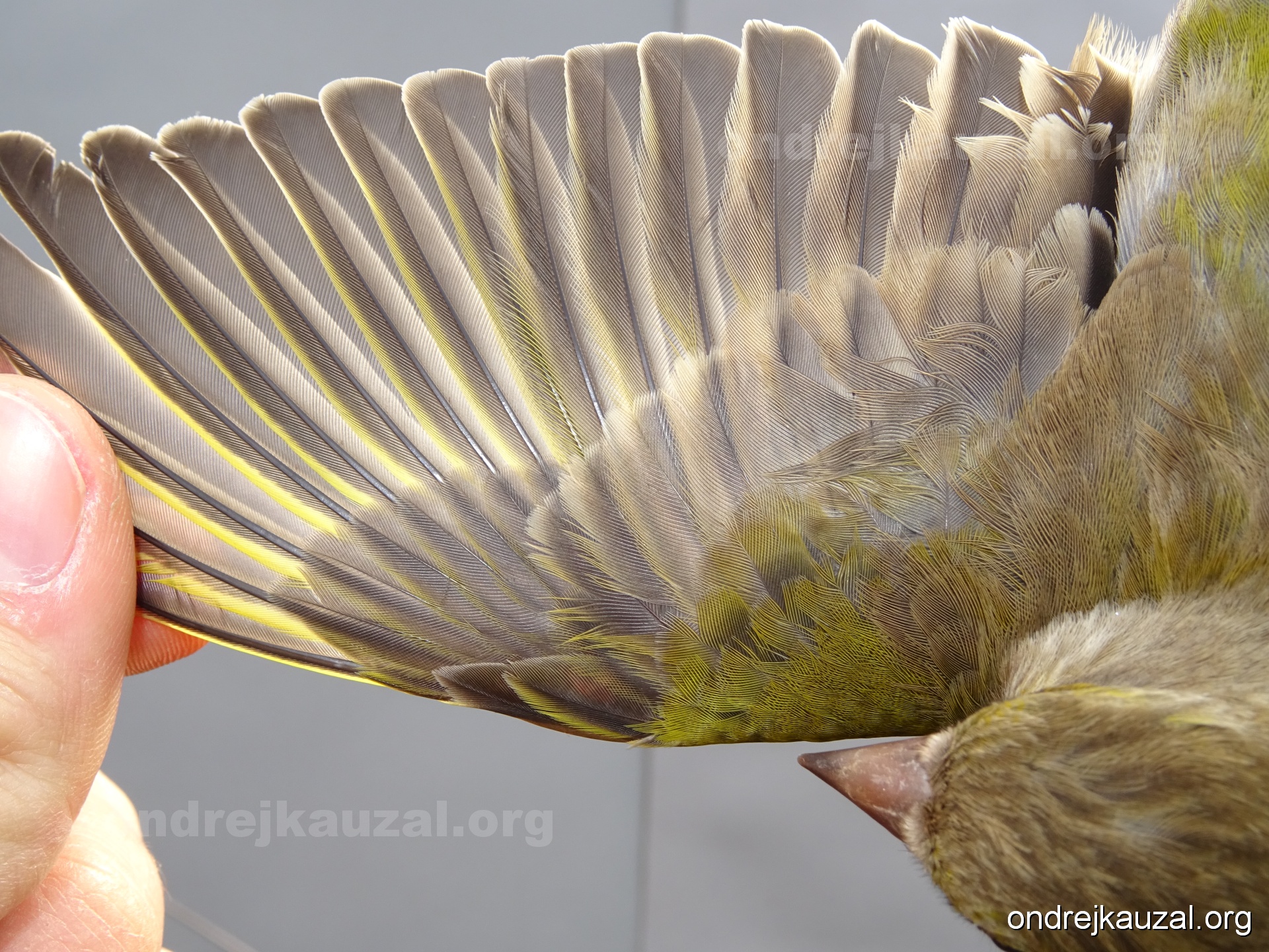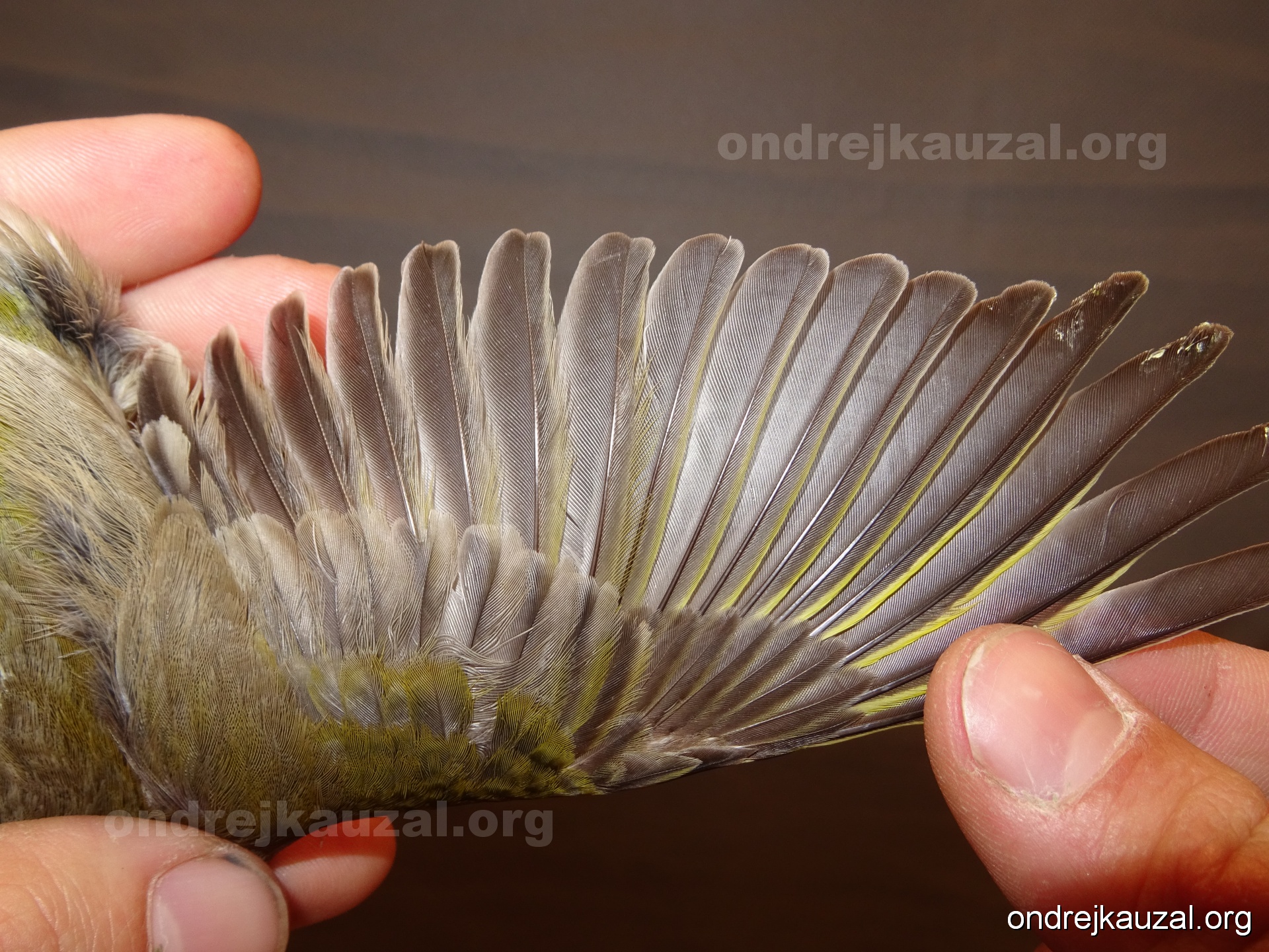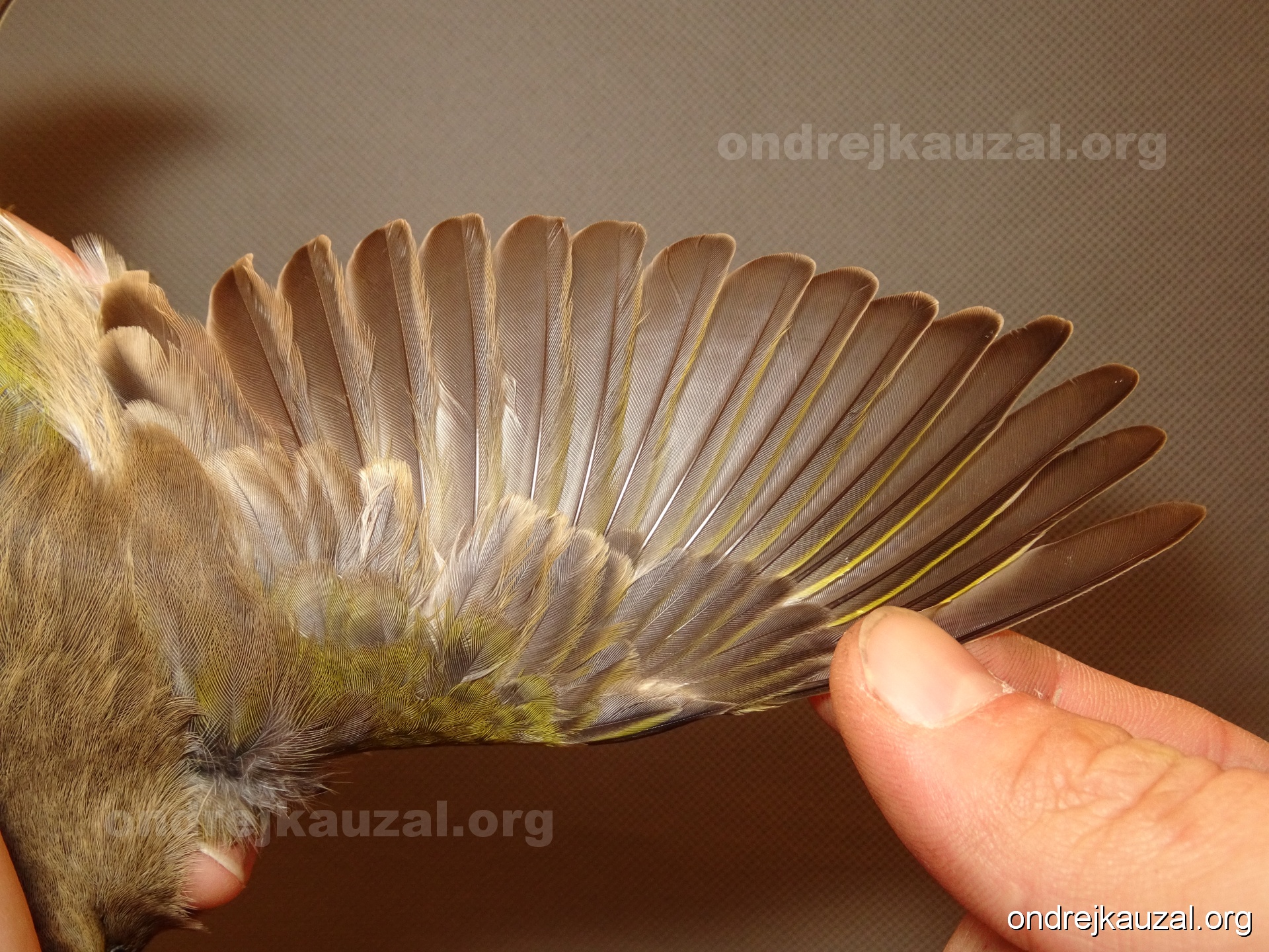 An interesting individual, albeit being in the first year of its life, it has moulted three of its primaries (P5 – P7). Greenfinches occasionally include moult of some primaries during their partial postjuvenile moult.