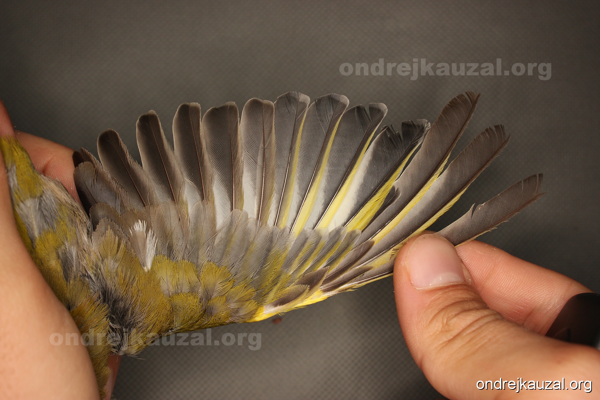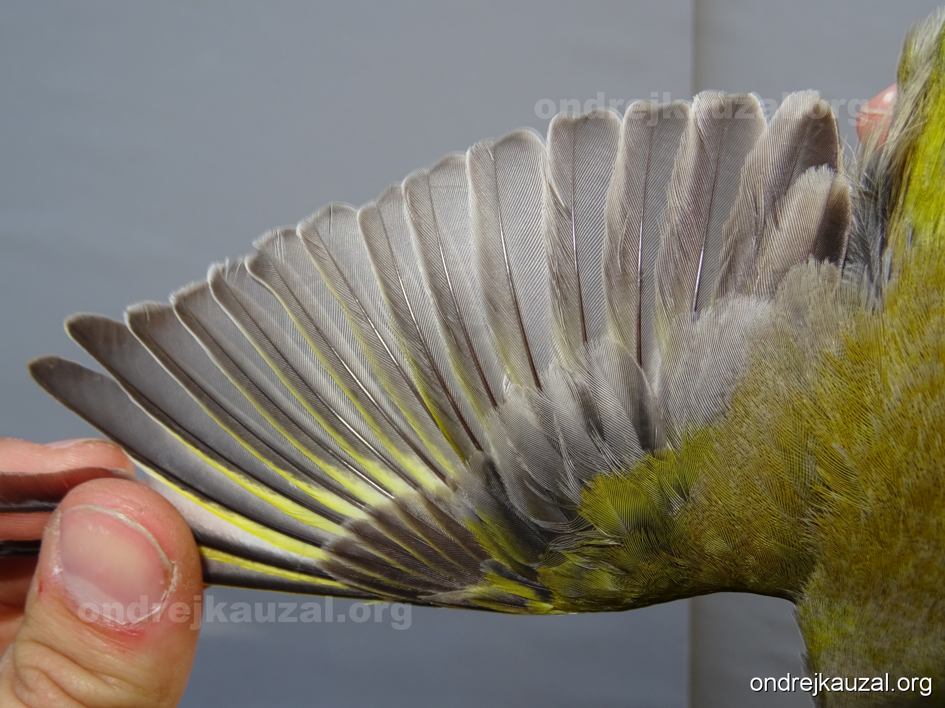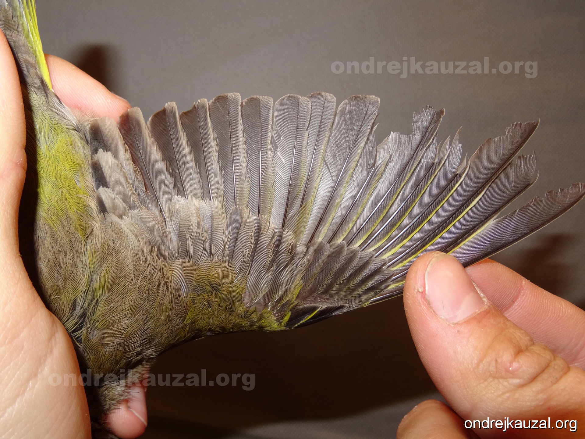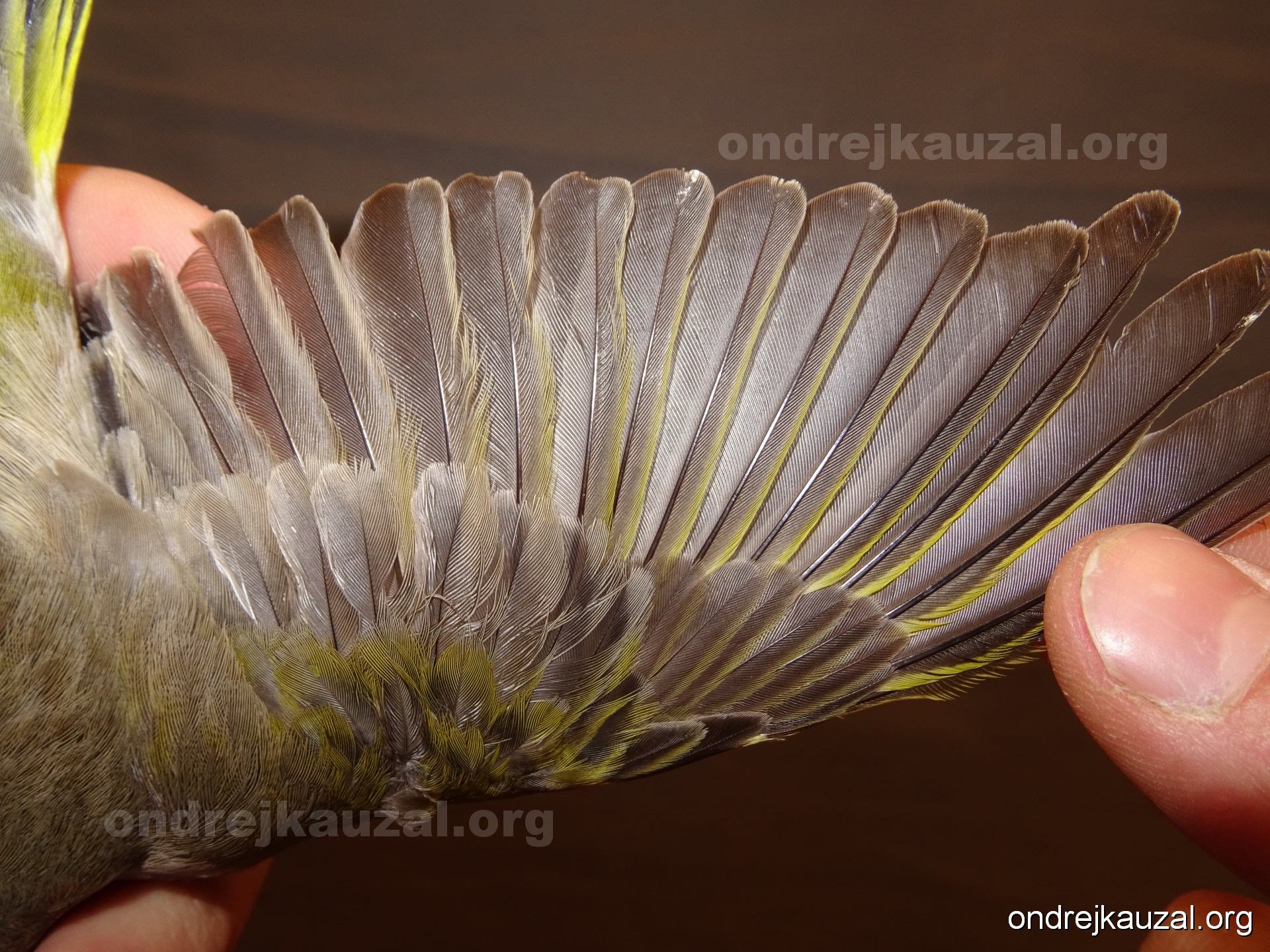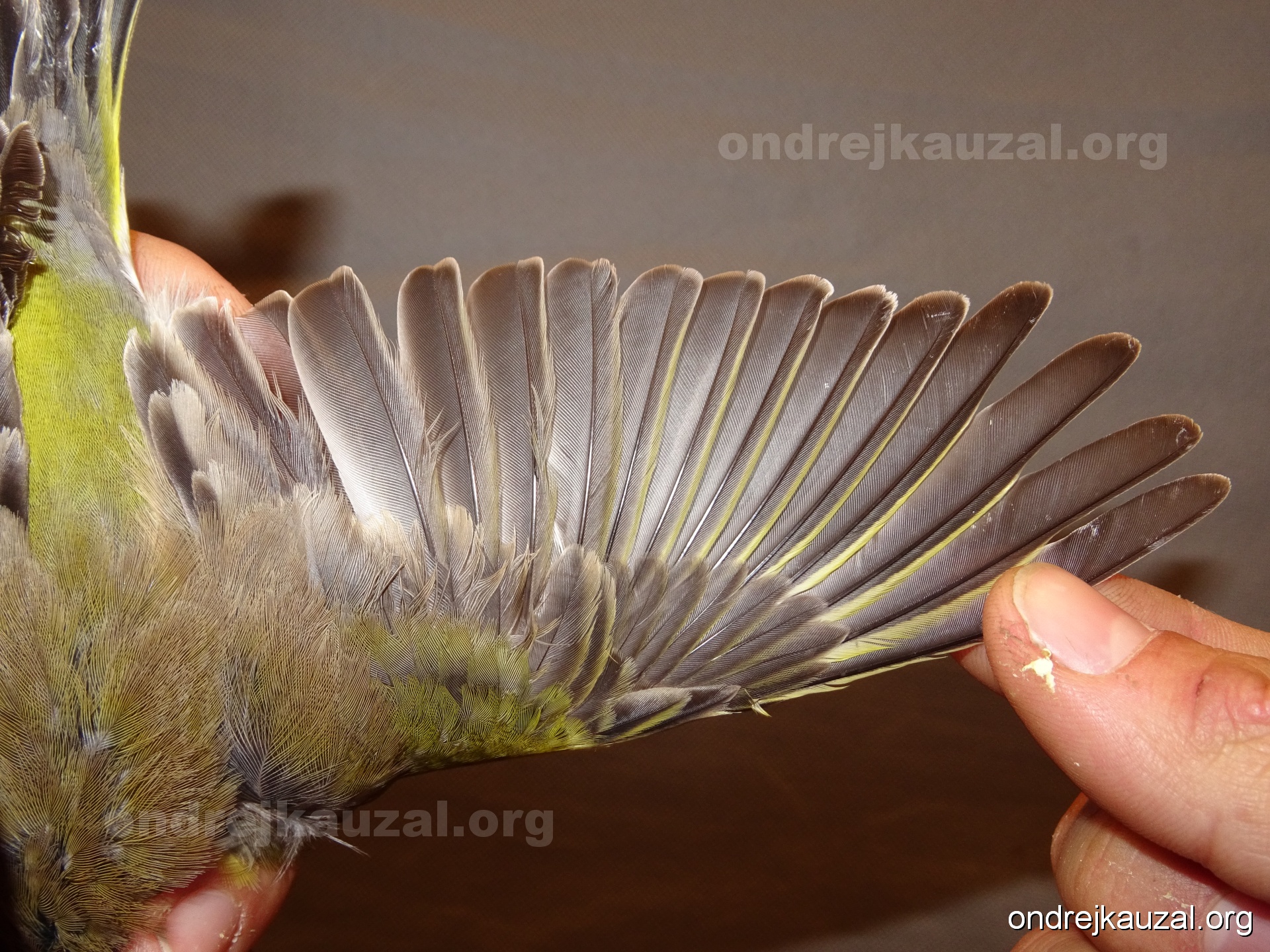 An interesting individual, albeit being in the first year of its life, it has moulted three of its primaries (P5 – P7). Greenfinches occasionally include moult of some primaries during their partial postjuvenile moult.