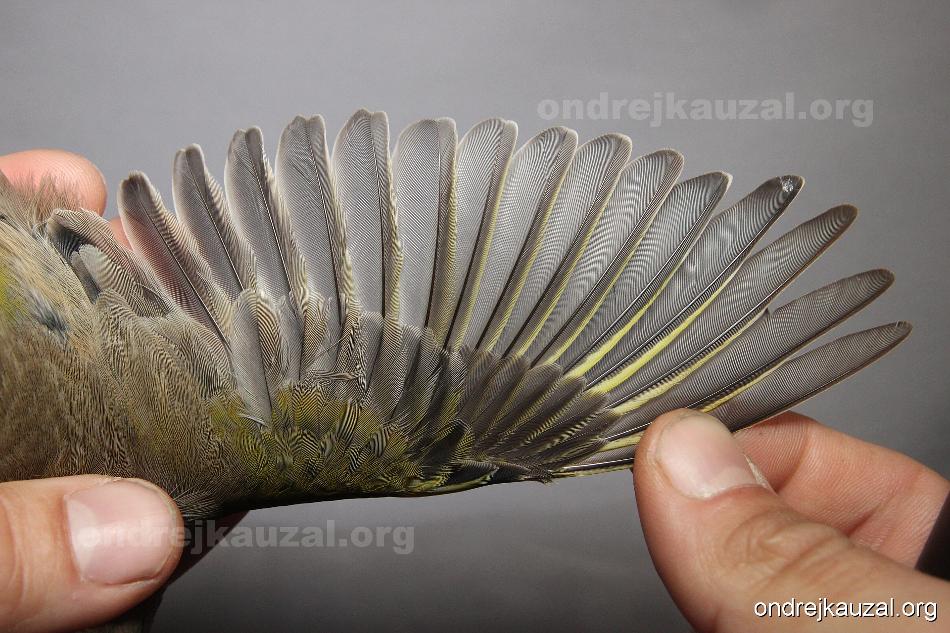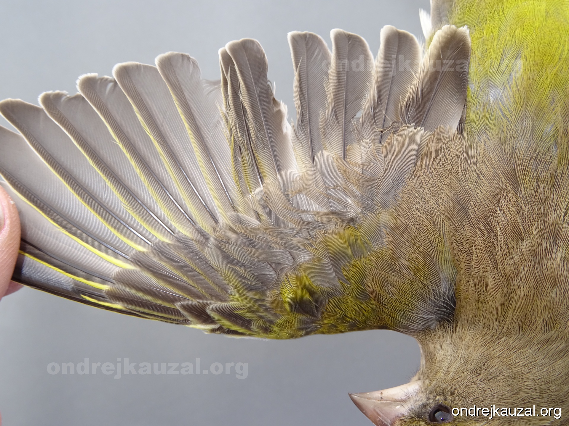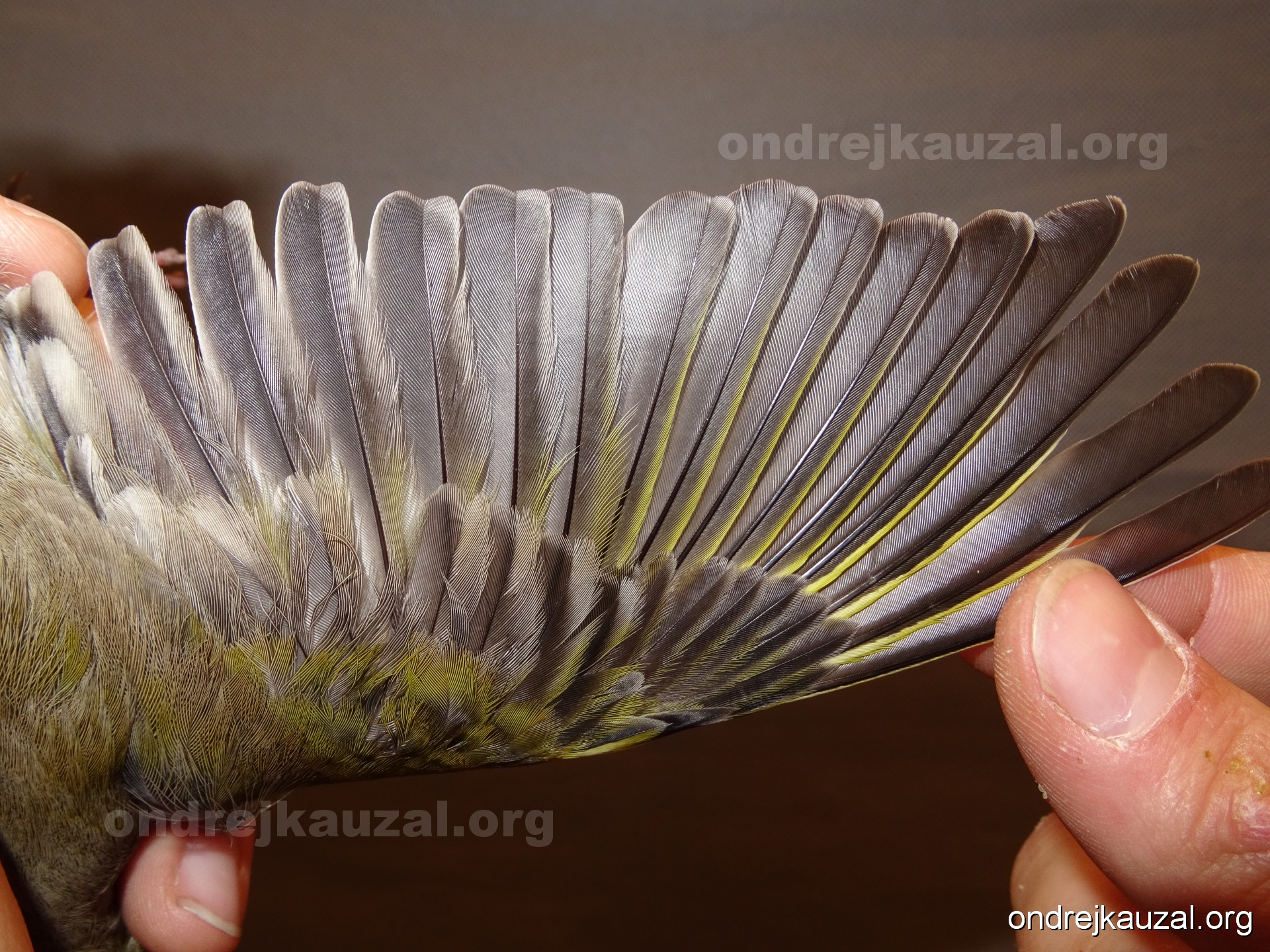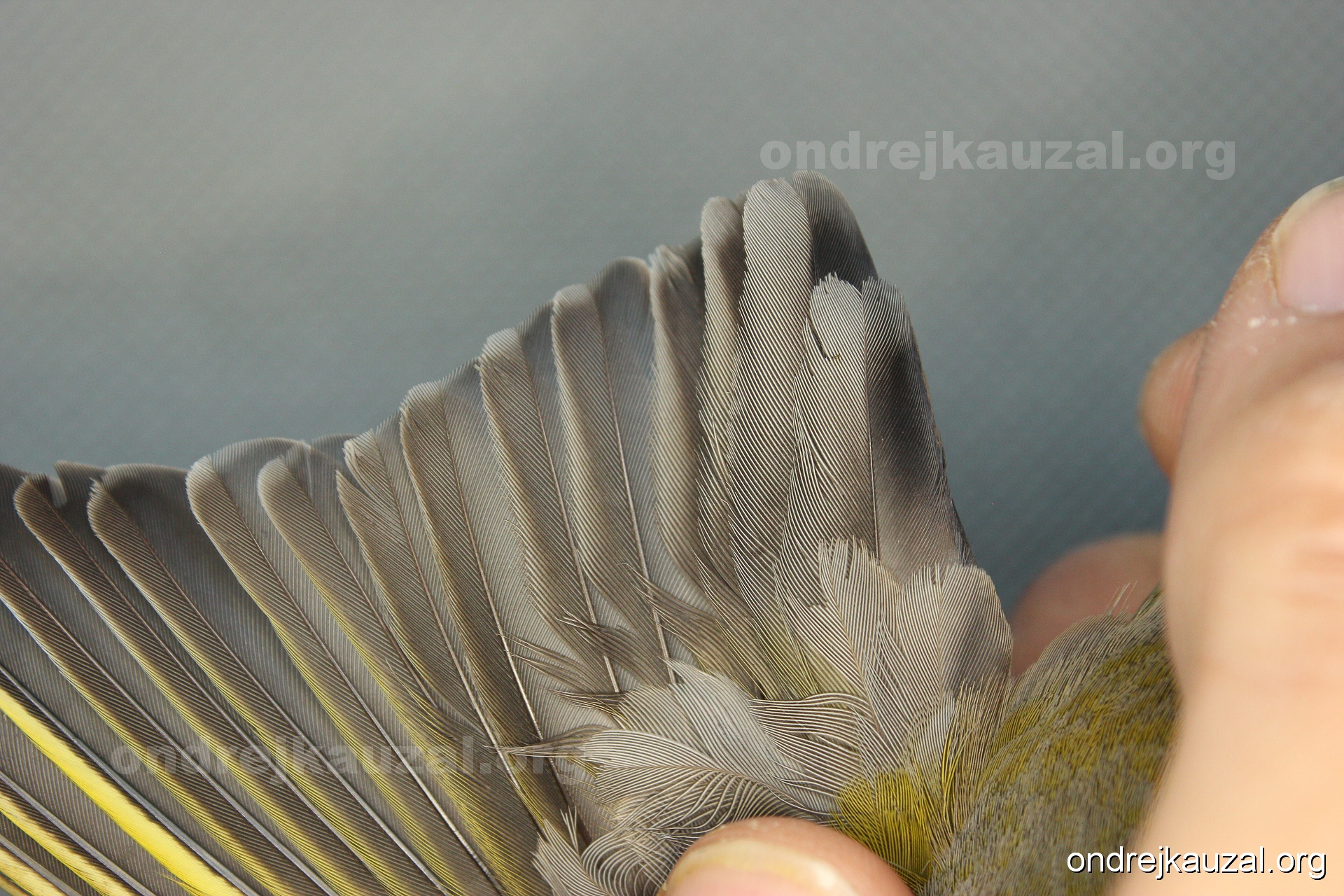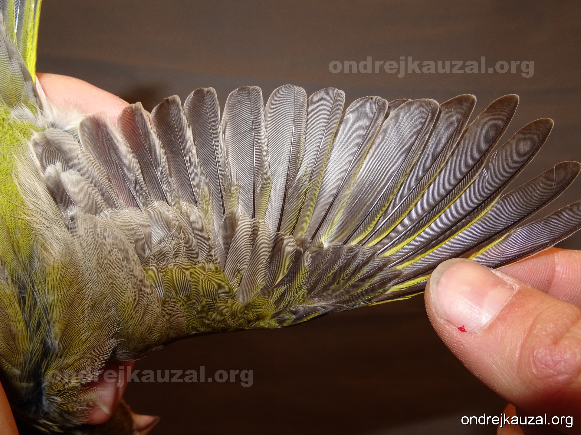 An interesting individual, albeit being in the first year of its life, it has moulted three of its primaries (P5 – P7). Greenfinches occasionally include moult of some primaries during their partial postjuvenile moult.