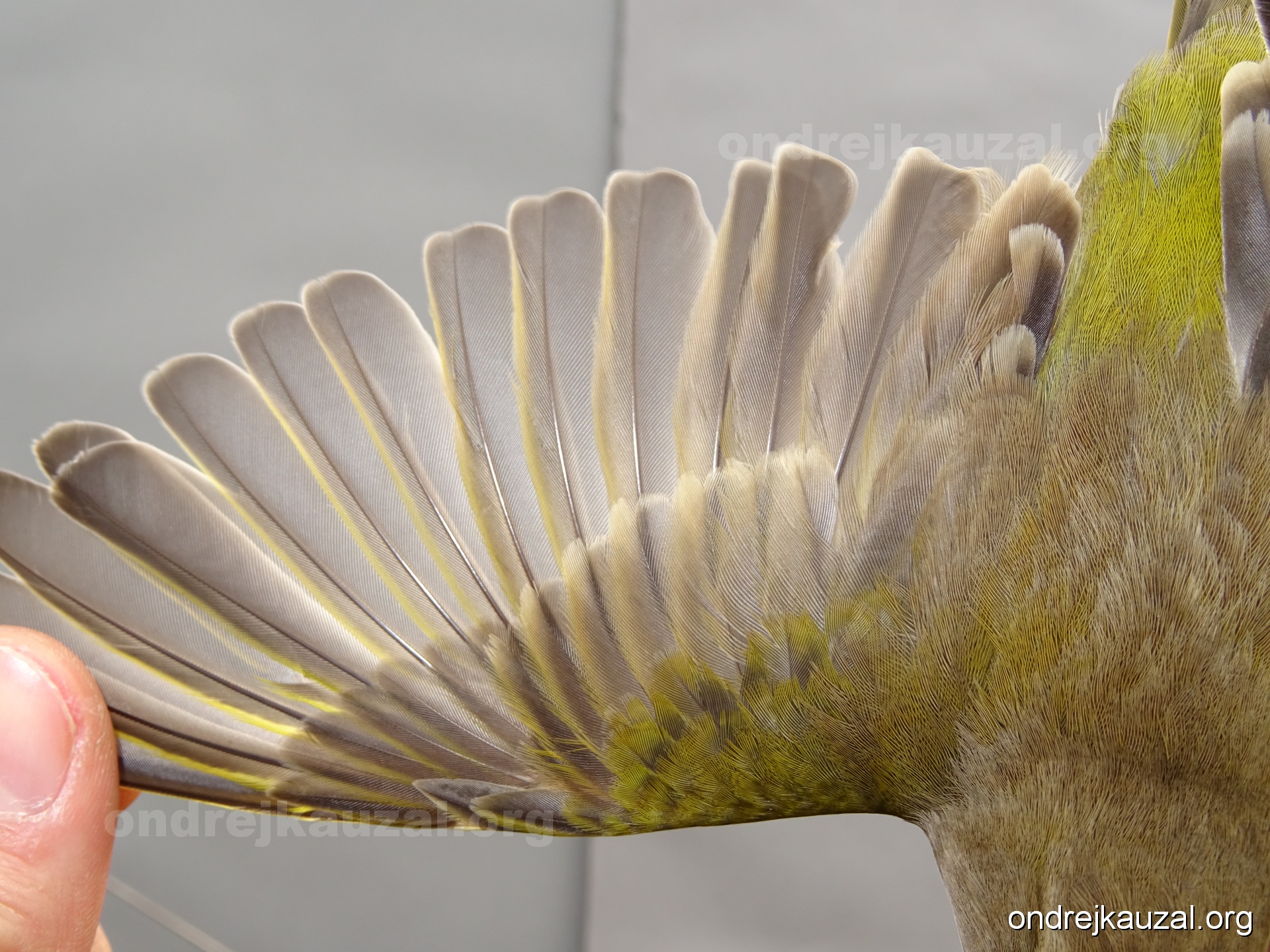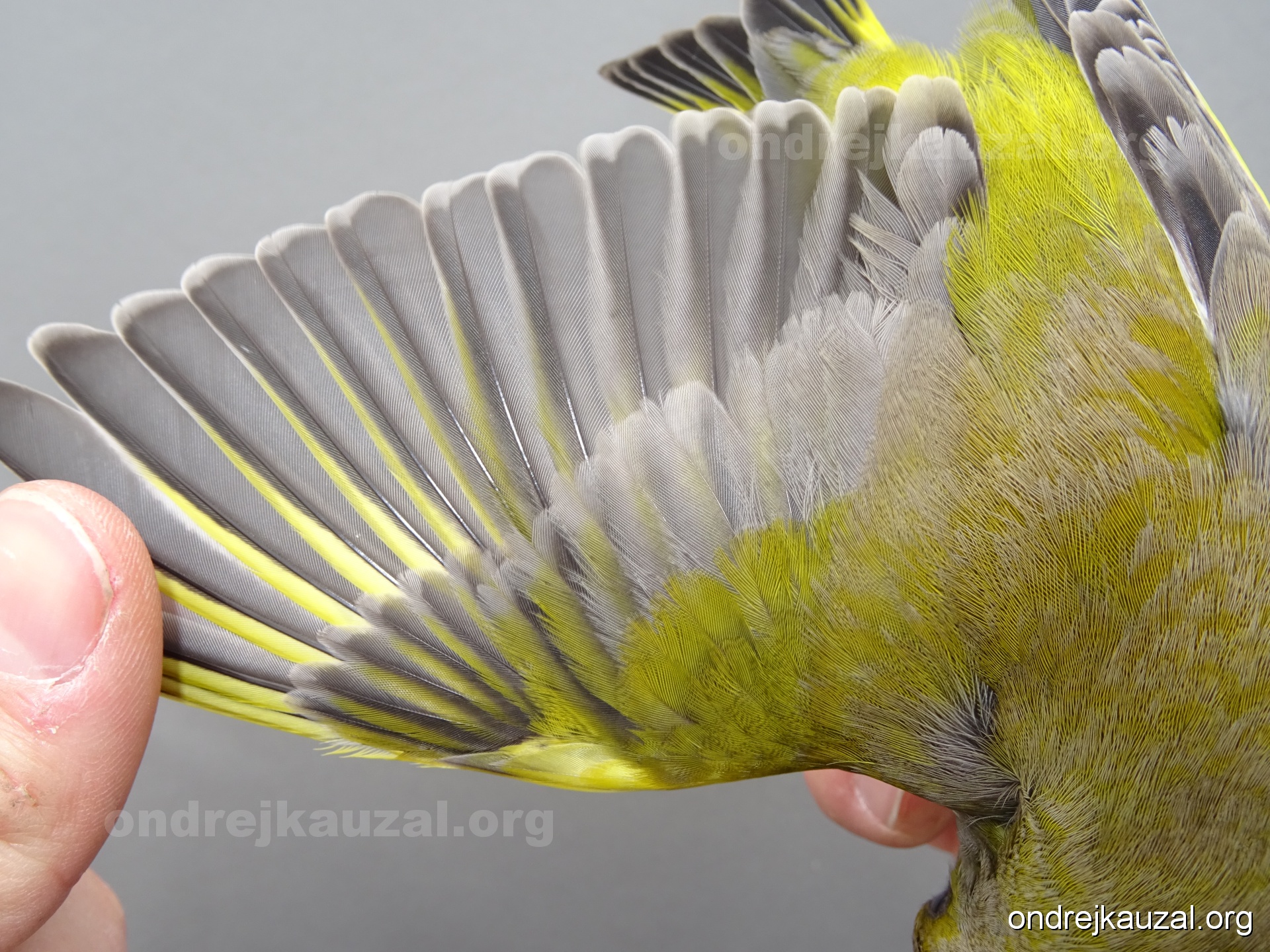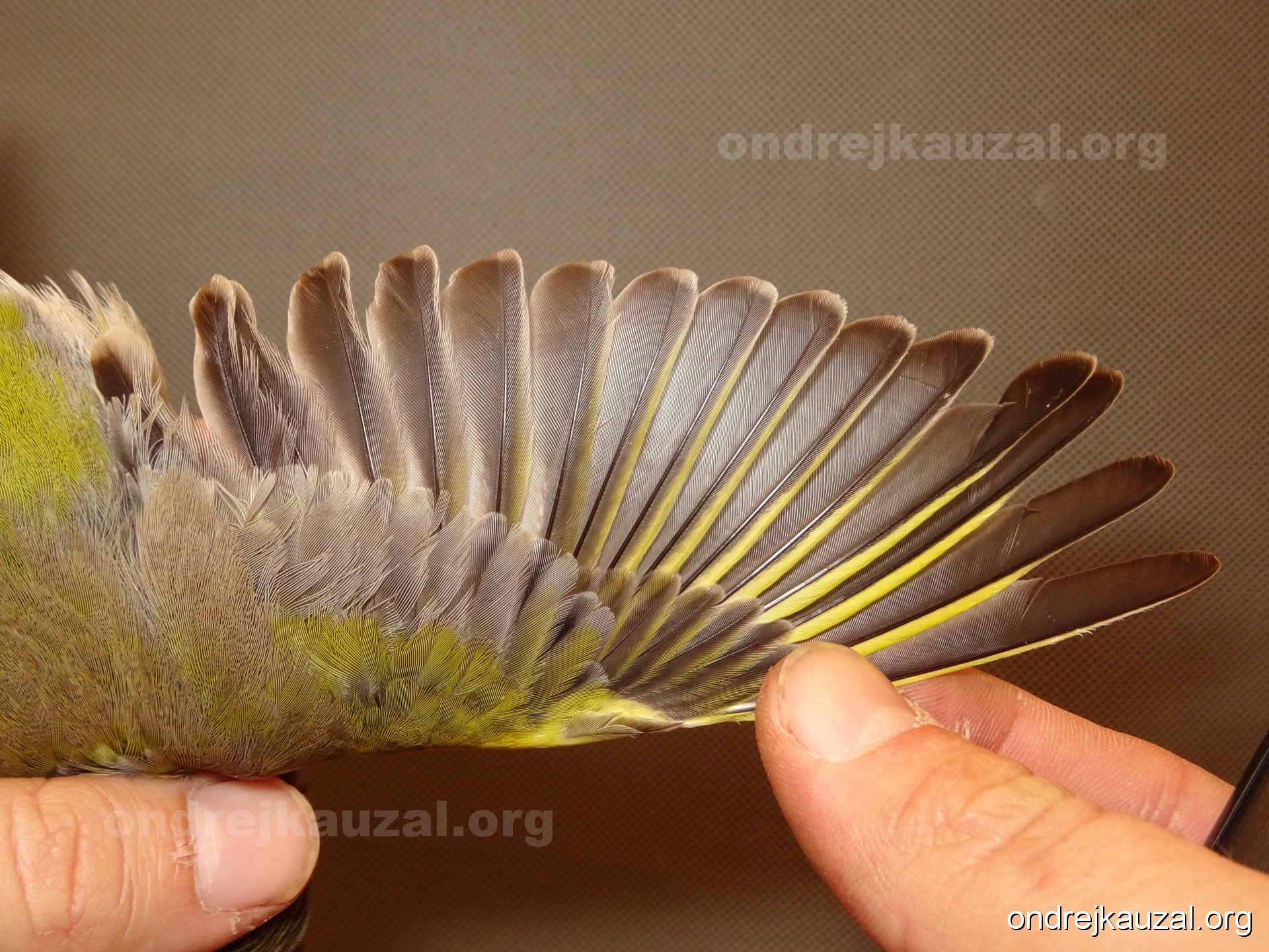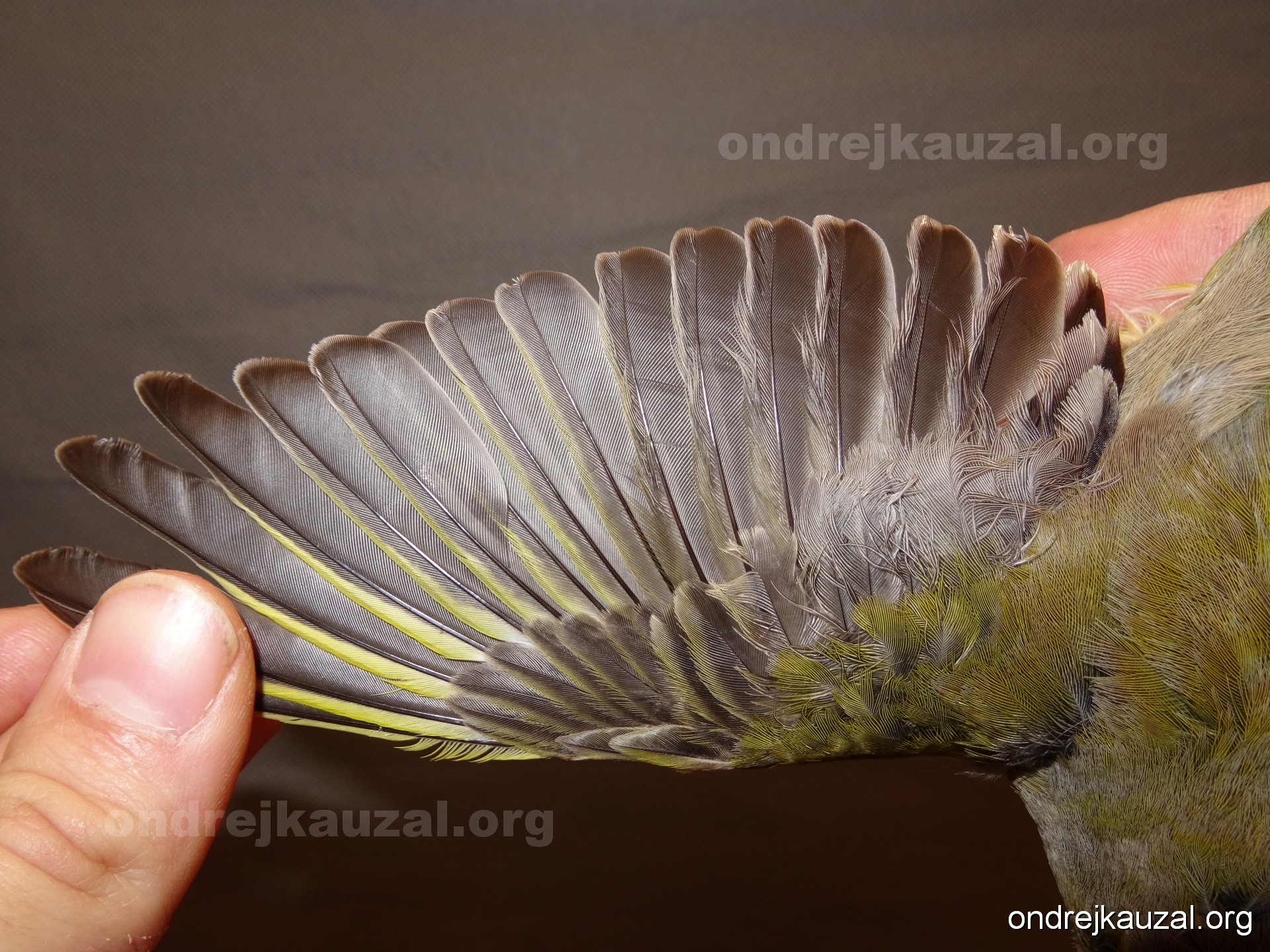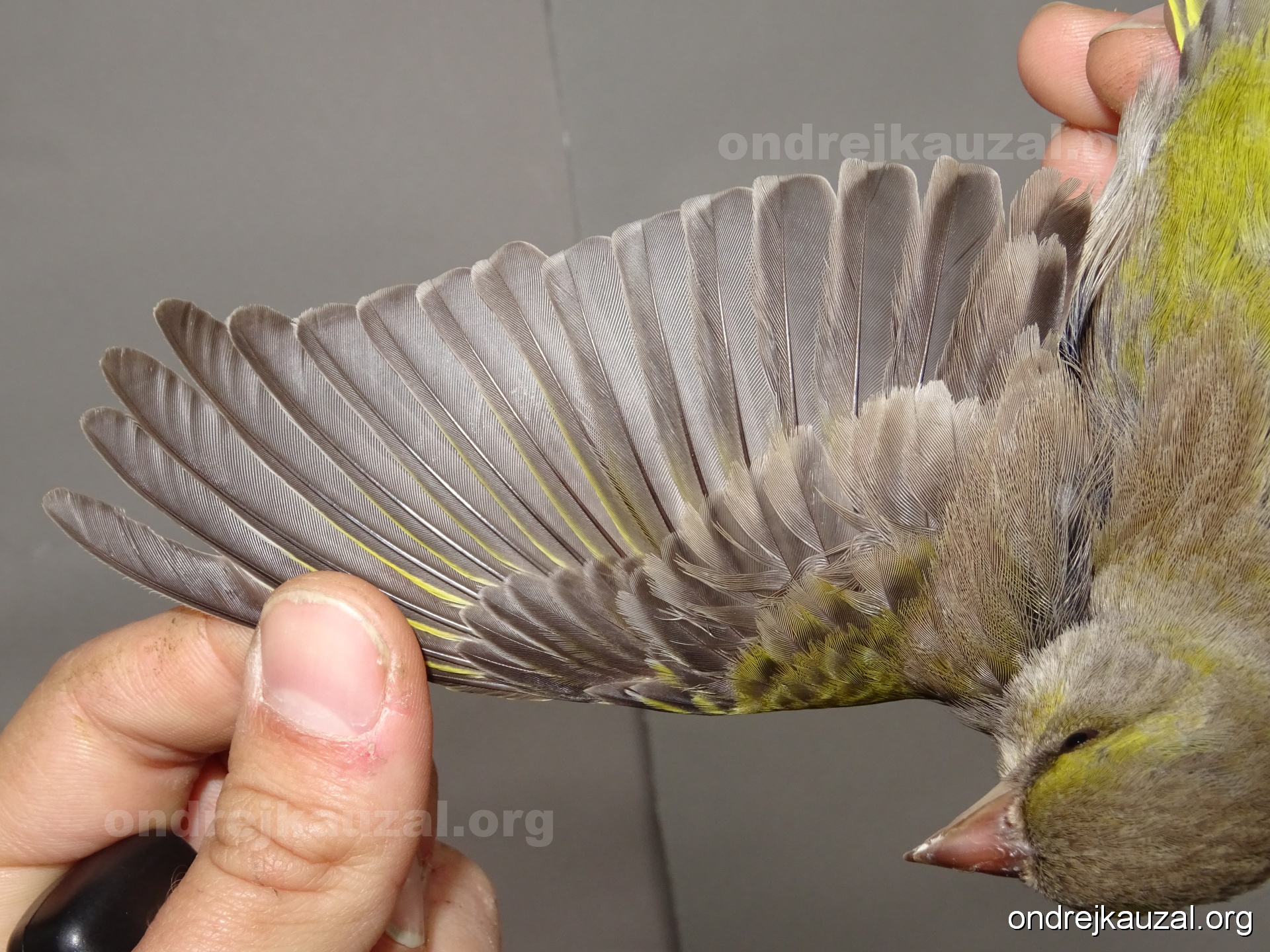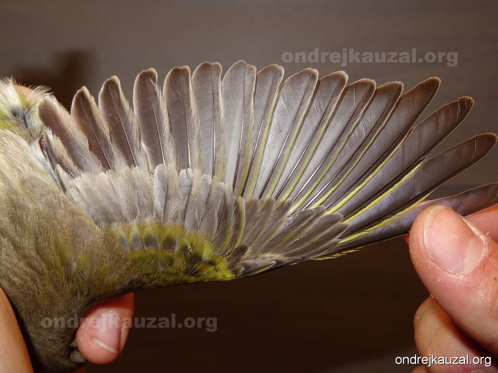An interesting individual, albeit being in the first year of its life, it has moulted three of its primaries (P5 – P7). Greenfinches occasionally include moult of some primaries during their partial postjuvenile moult.