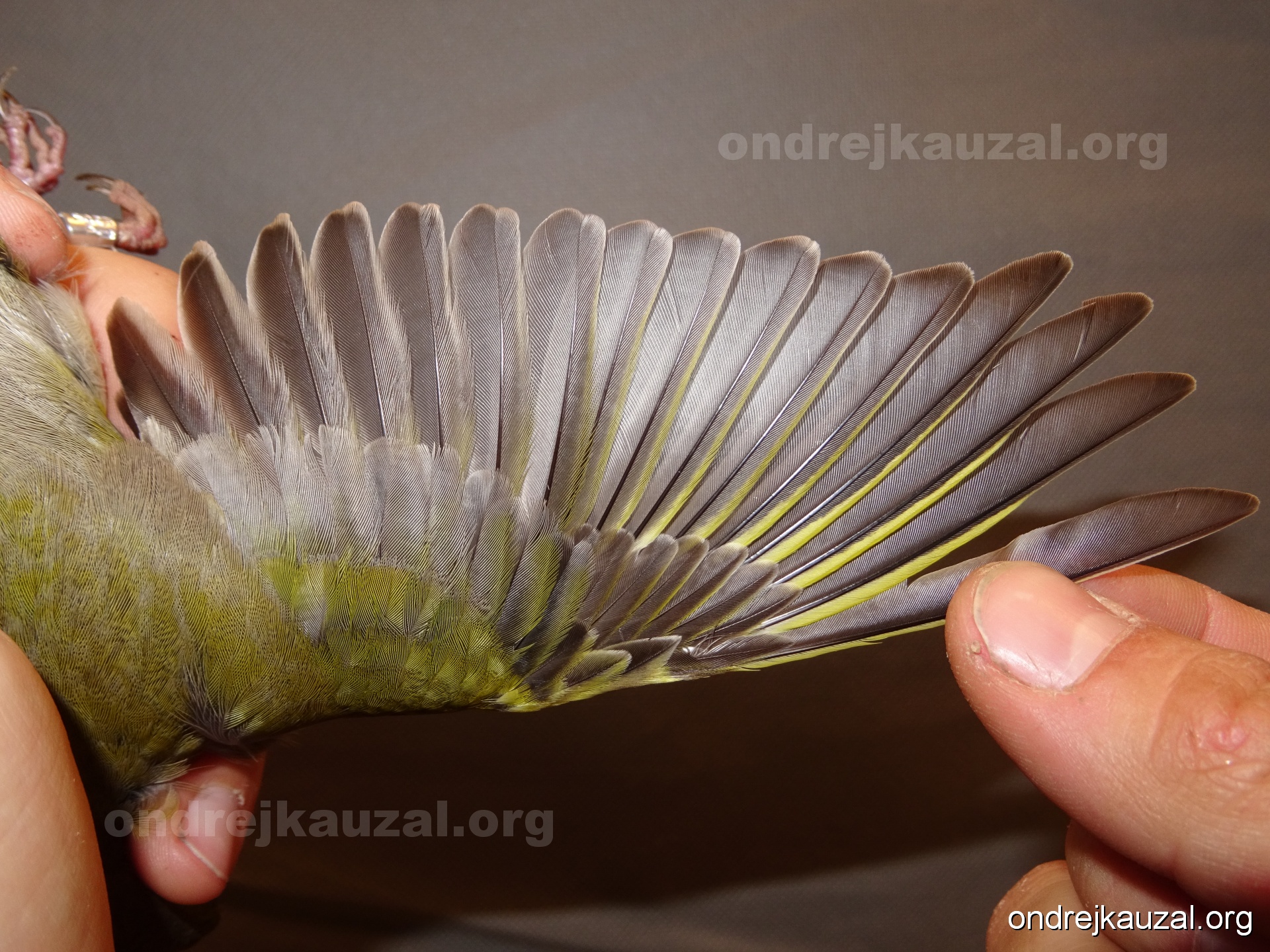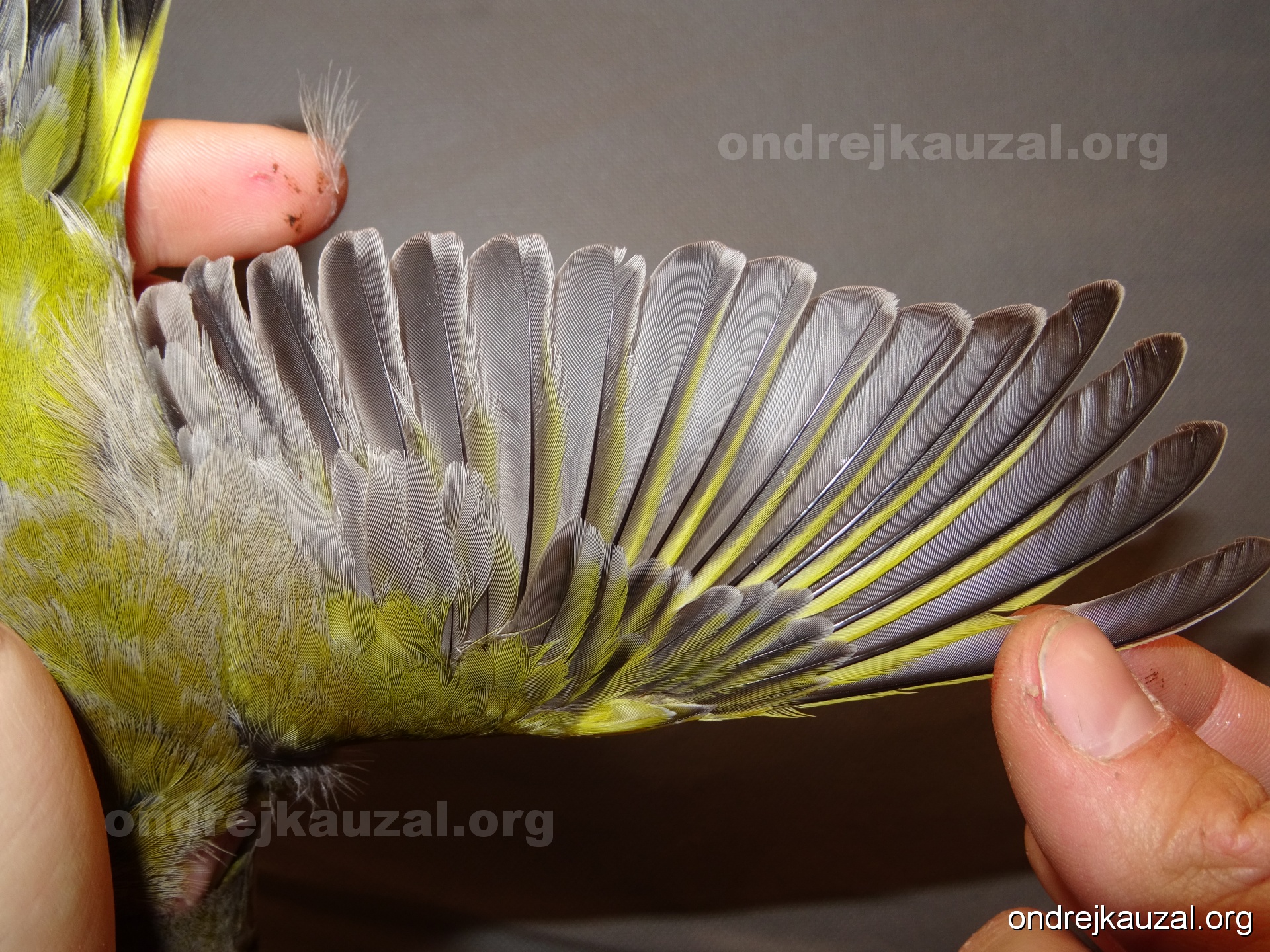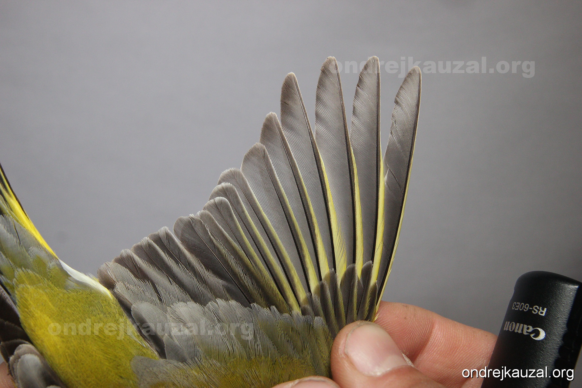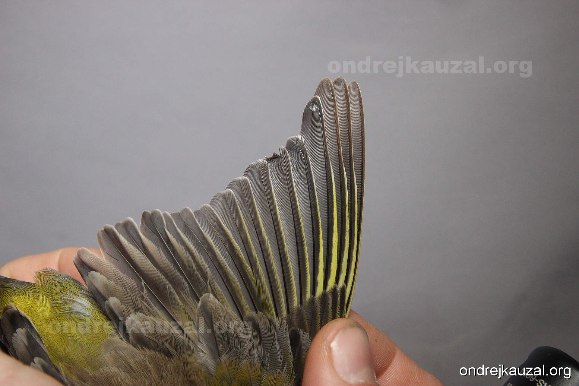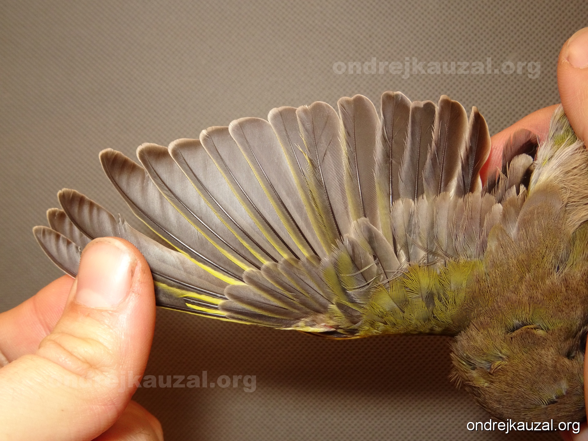 An interesting individual, albeit being in the first year of its life, it has moulted three of its primaries (P5 – P7). Greenfinches occasionally include moult of some primaries during their partial postjuvenile moult.