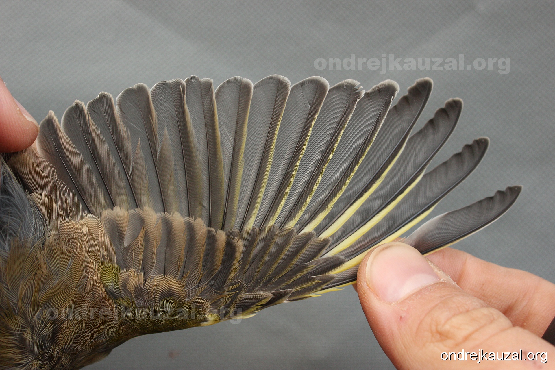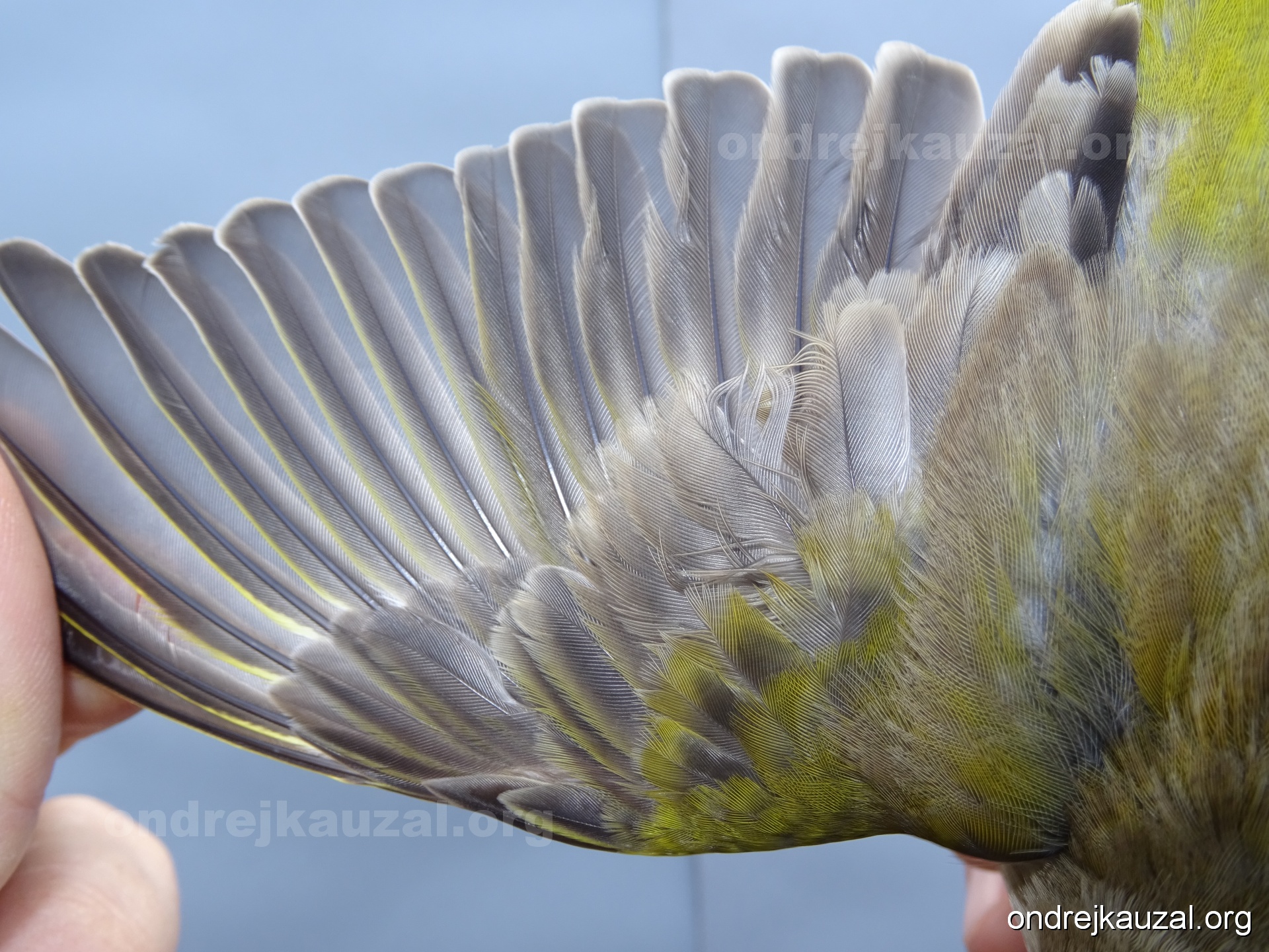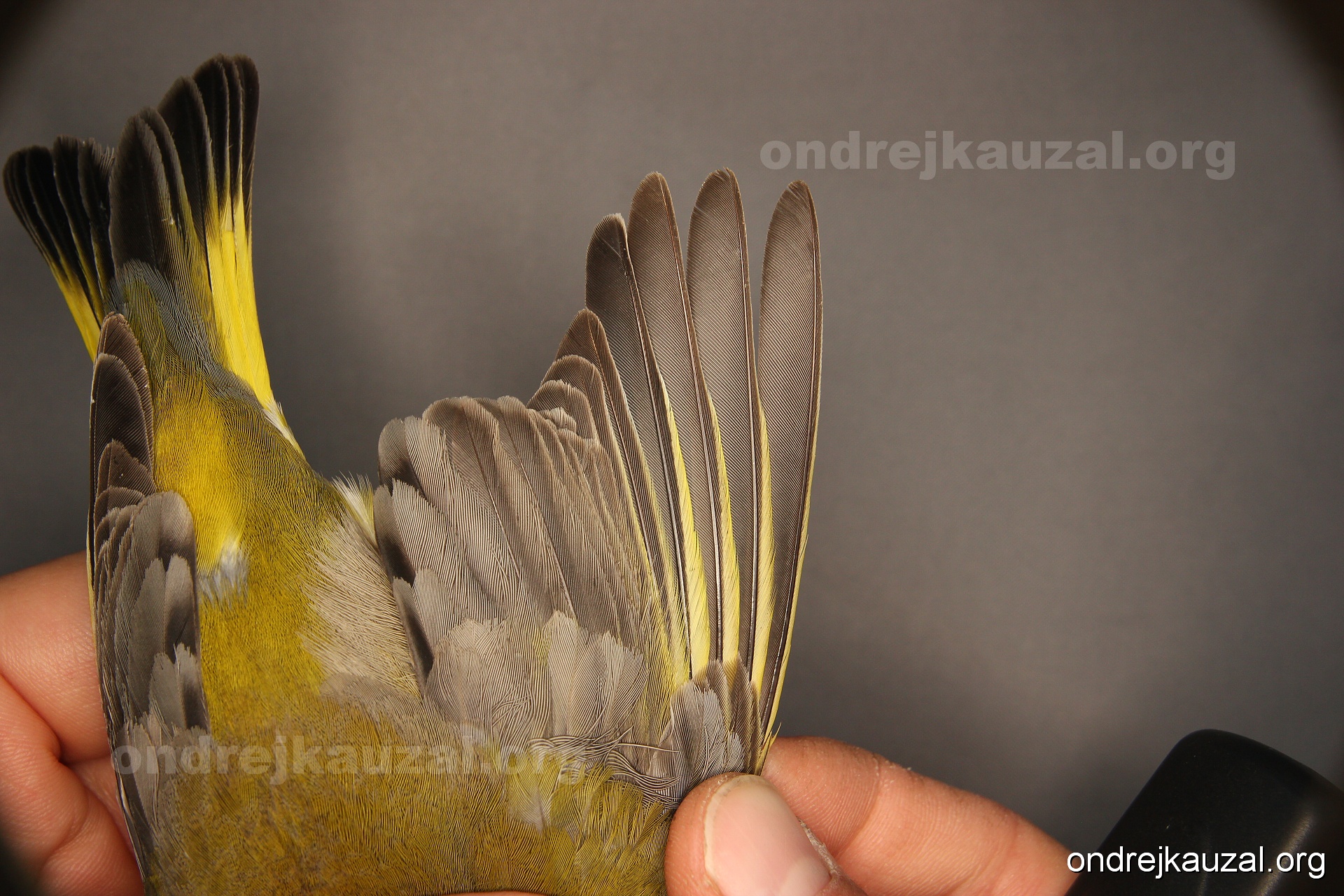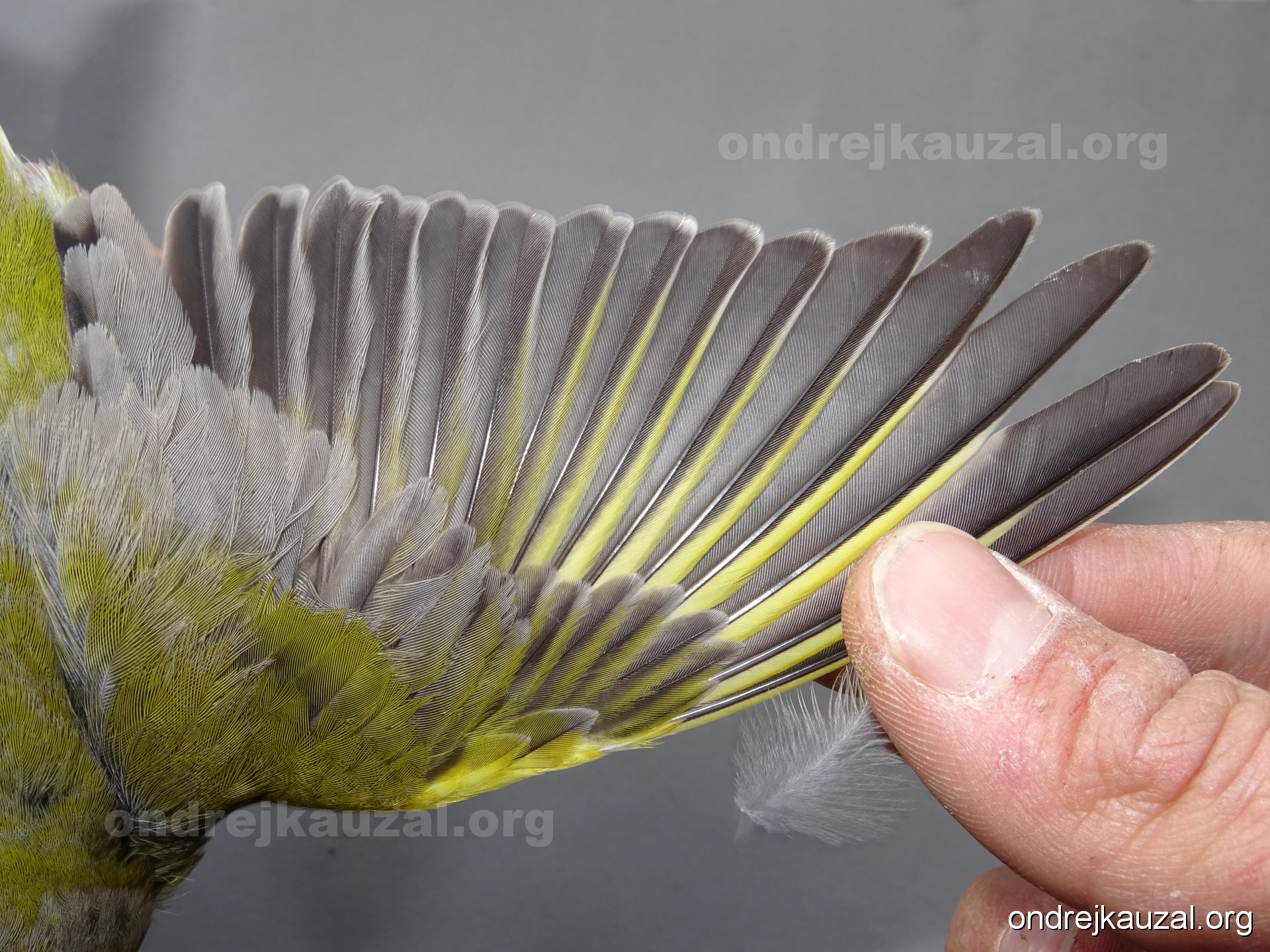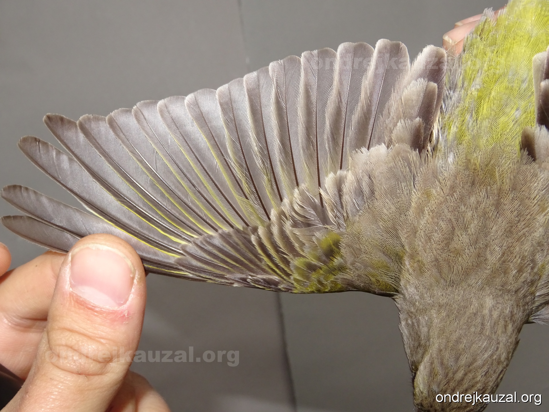 An interesting individual, albeit being in the first year of its life, it has moulted three of its primaries (P5 – P7). Greenfinches occasionally include moult of some primaries during their partial postjuvenile moult.