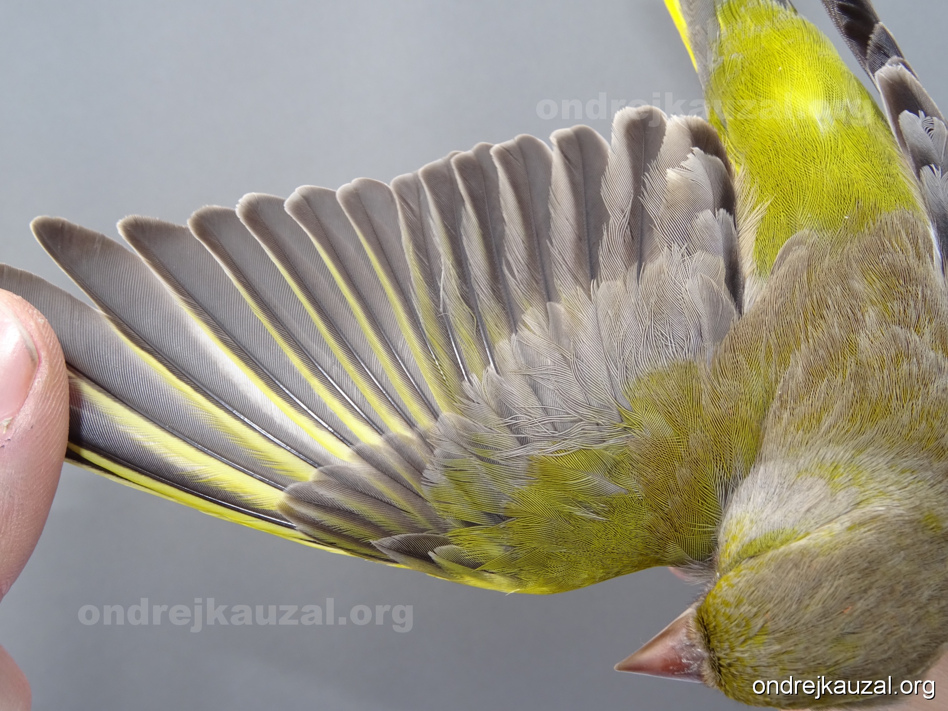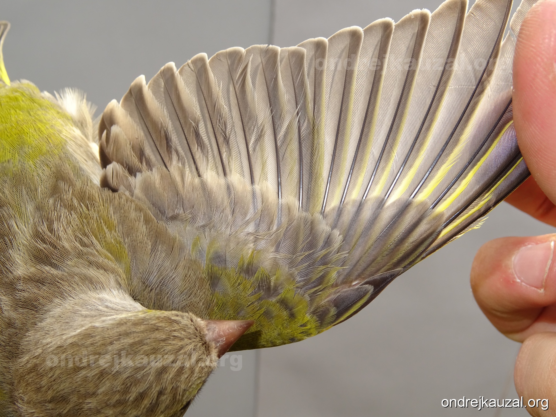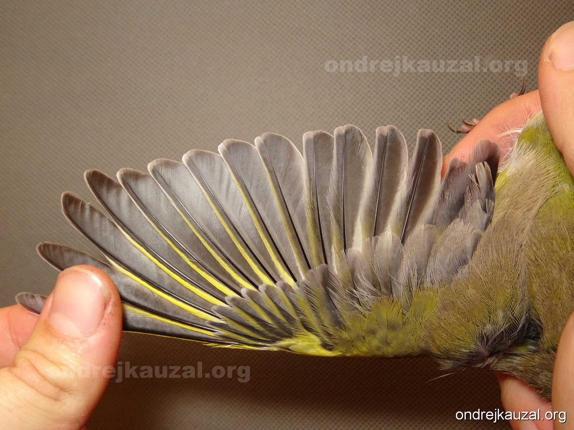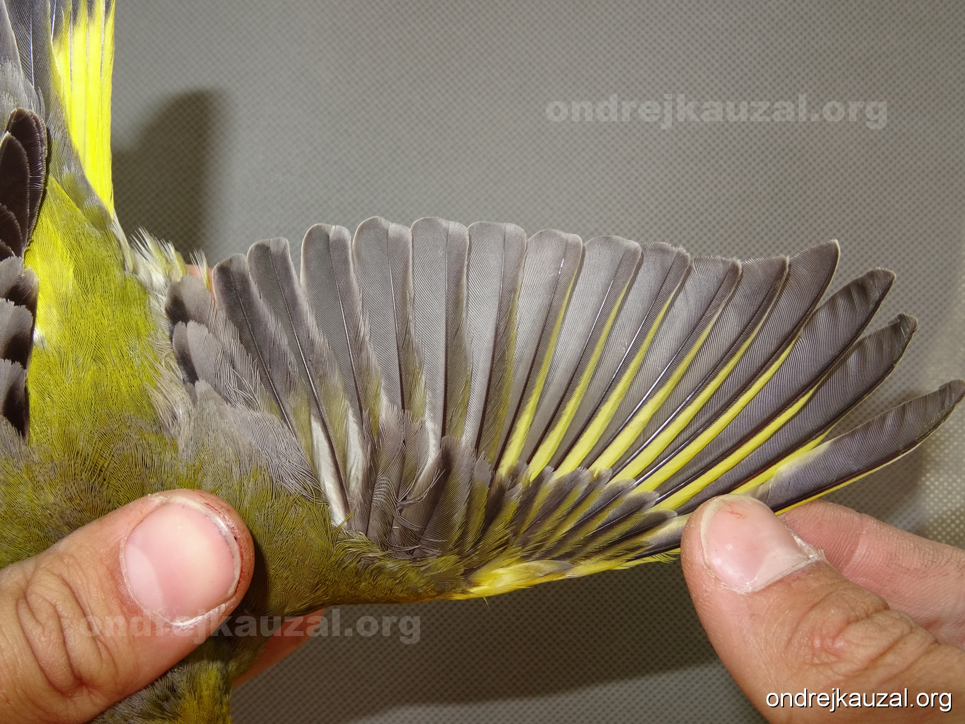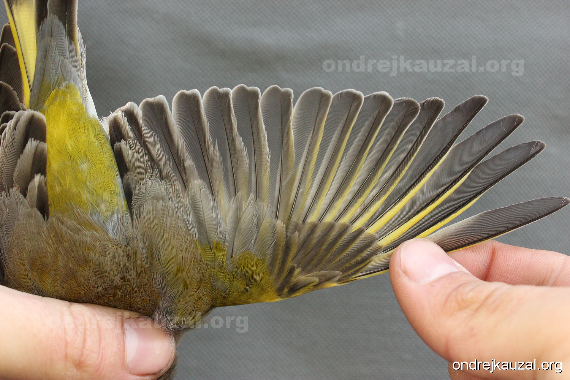 An interesting individual, albeit being in the first year of its life, it has moulted three of its primaries (P5 – P7). Greenfinches occasionally include moult of some primaries during their partial postjuvenile moult.