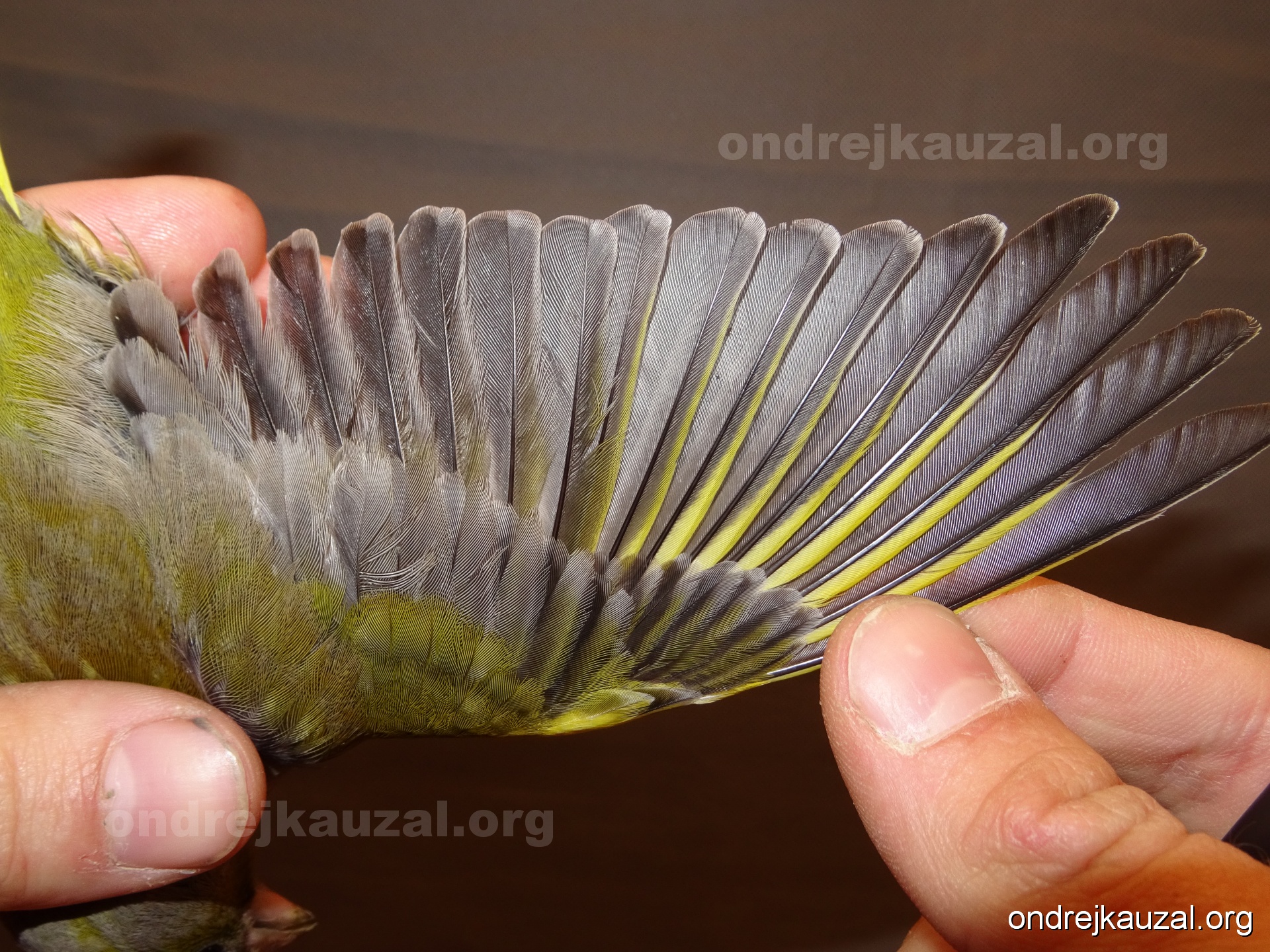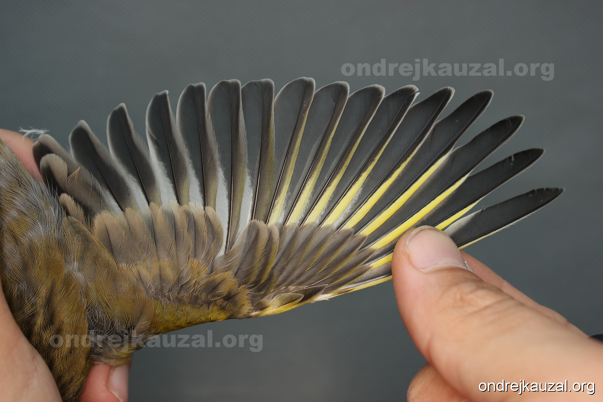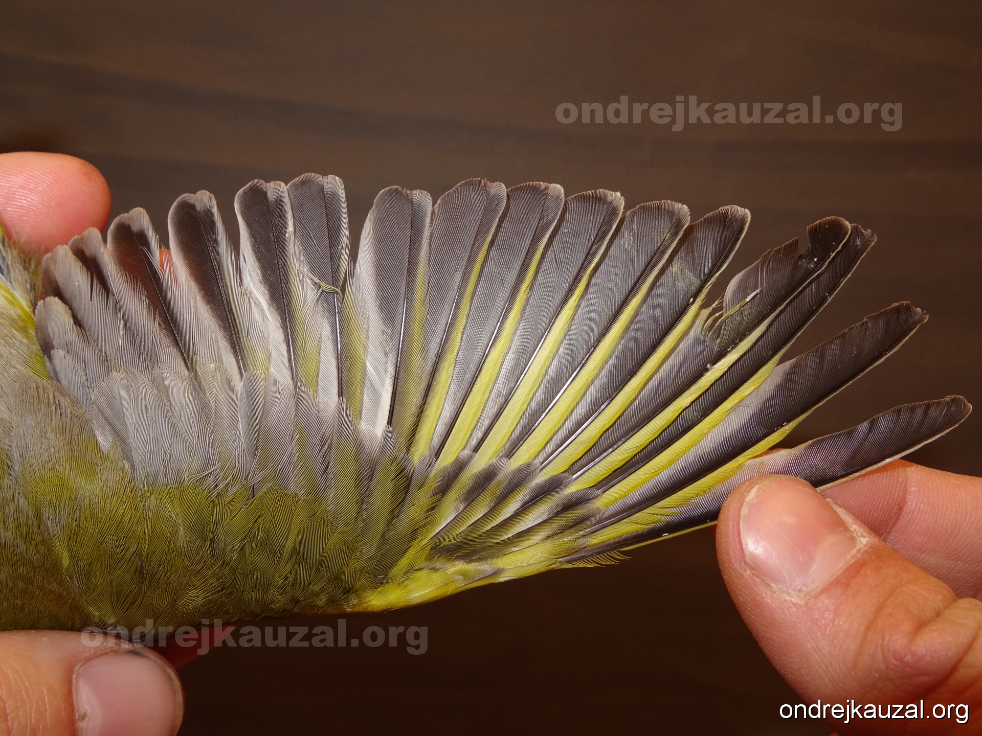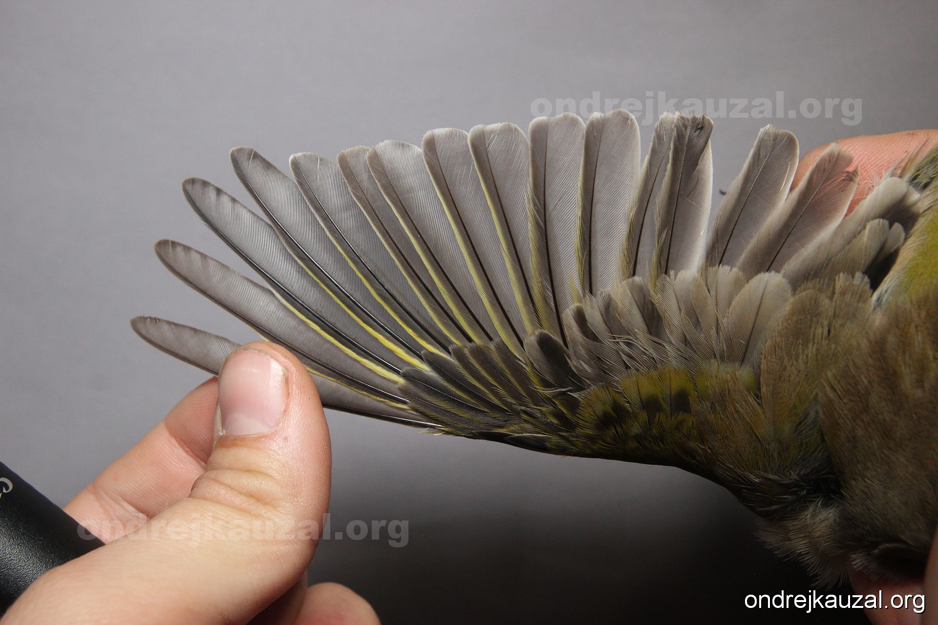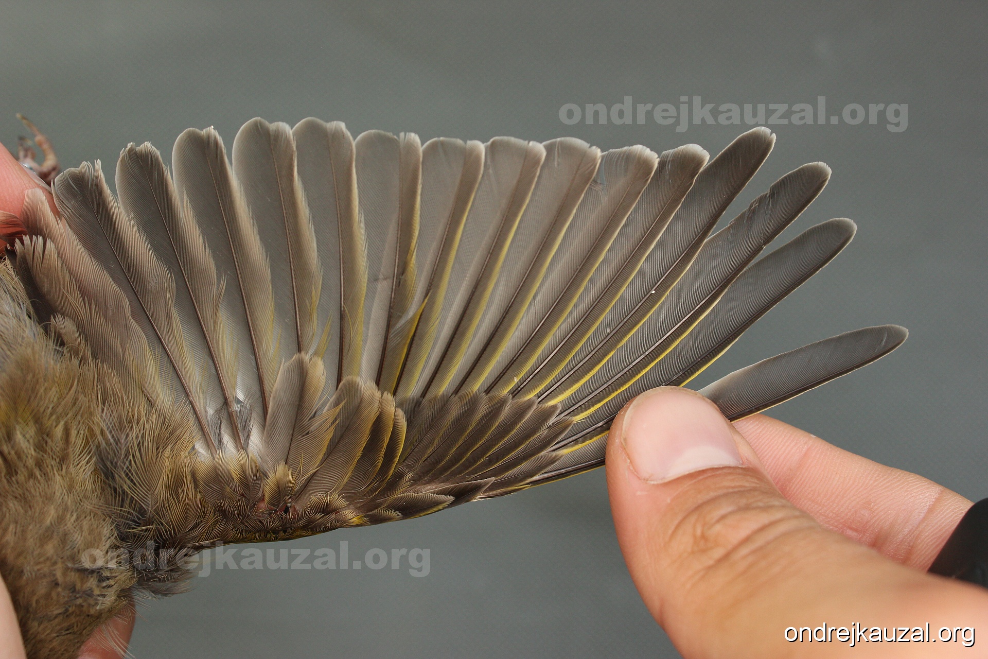 An interesting individual, albeit being in the first year of its life, it has moulted three of its primaries (P5 – P7). Greenfinches occasionally include moult of some primaries during their partial postjuvenile moult.
