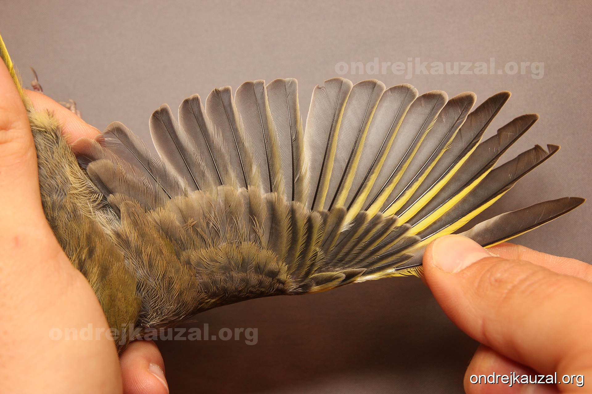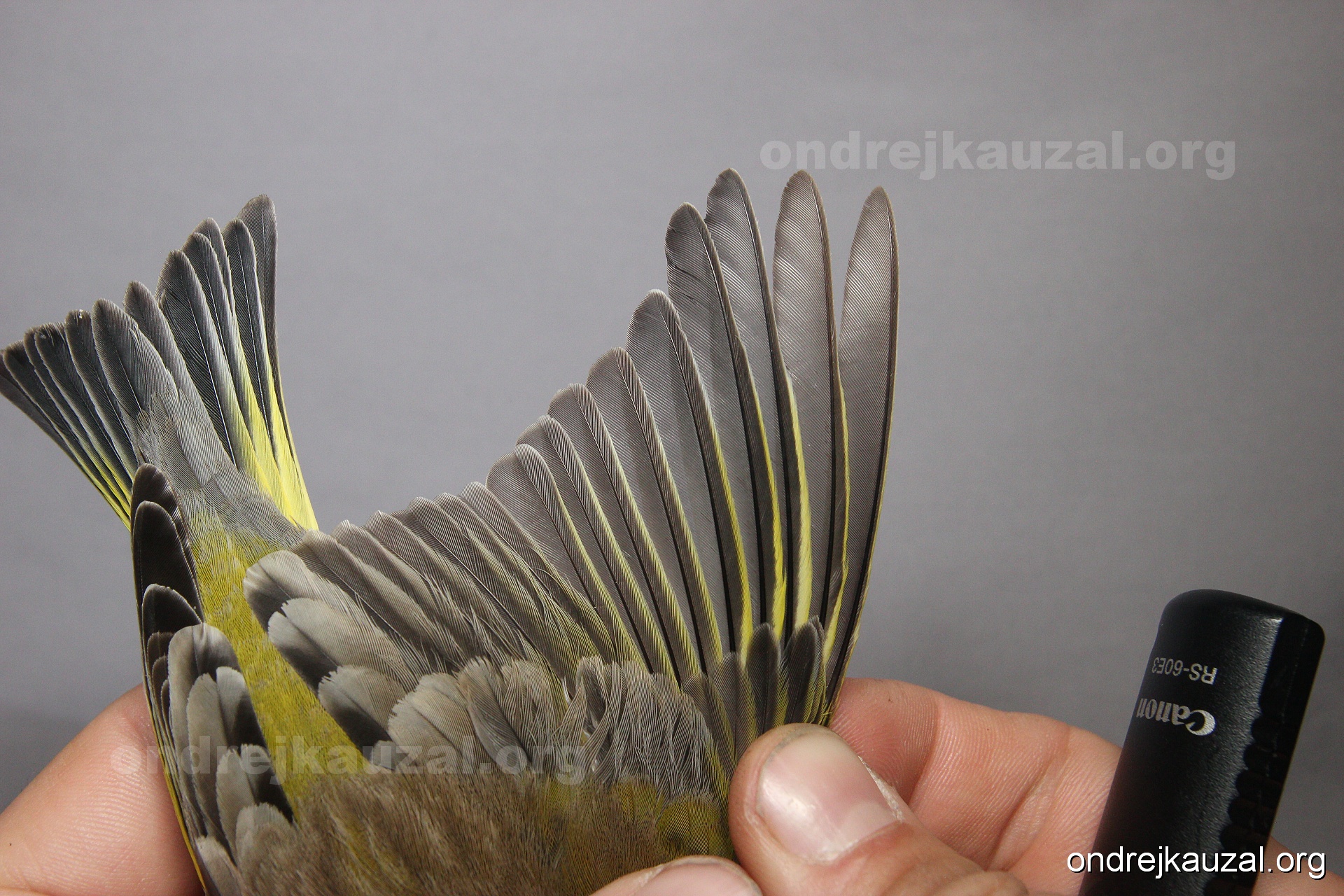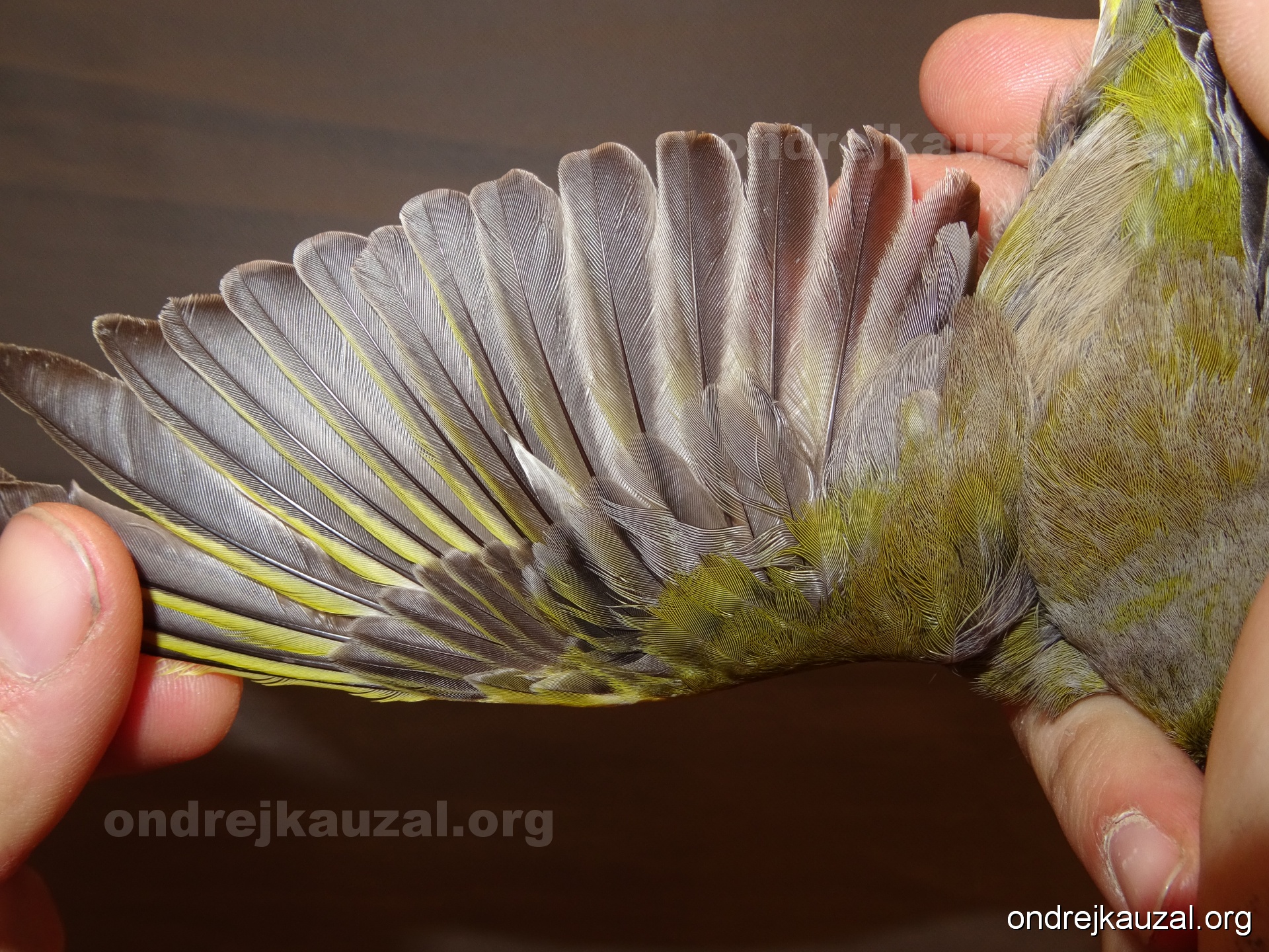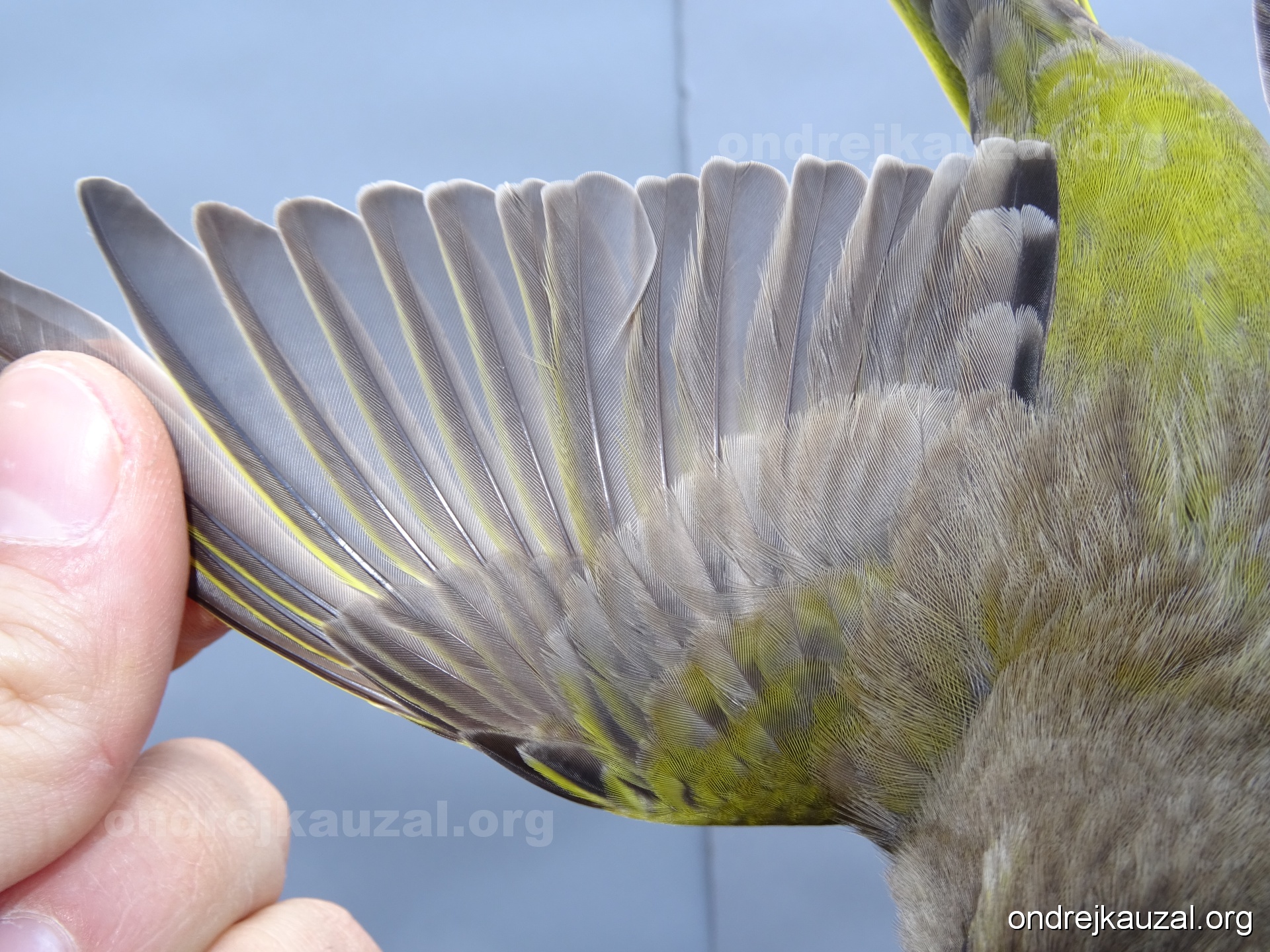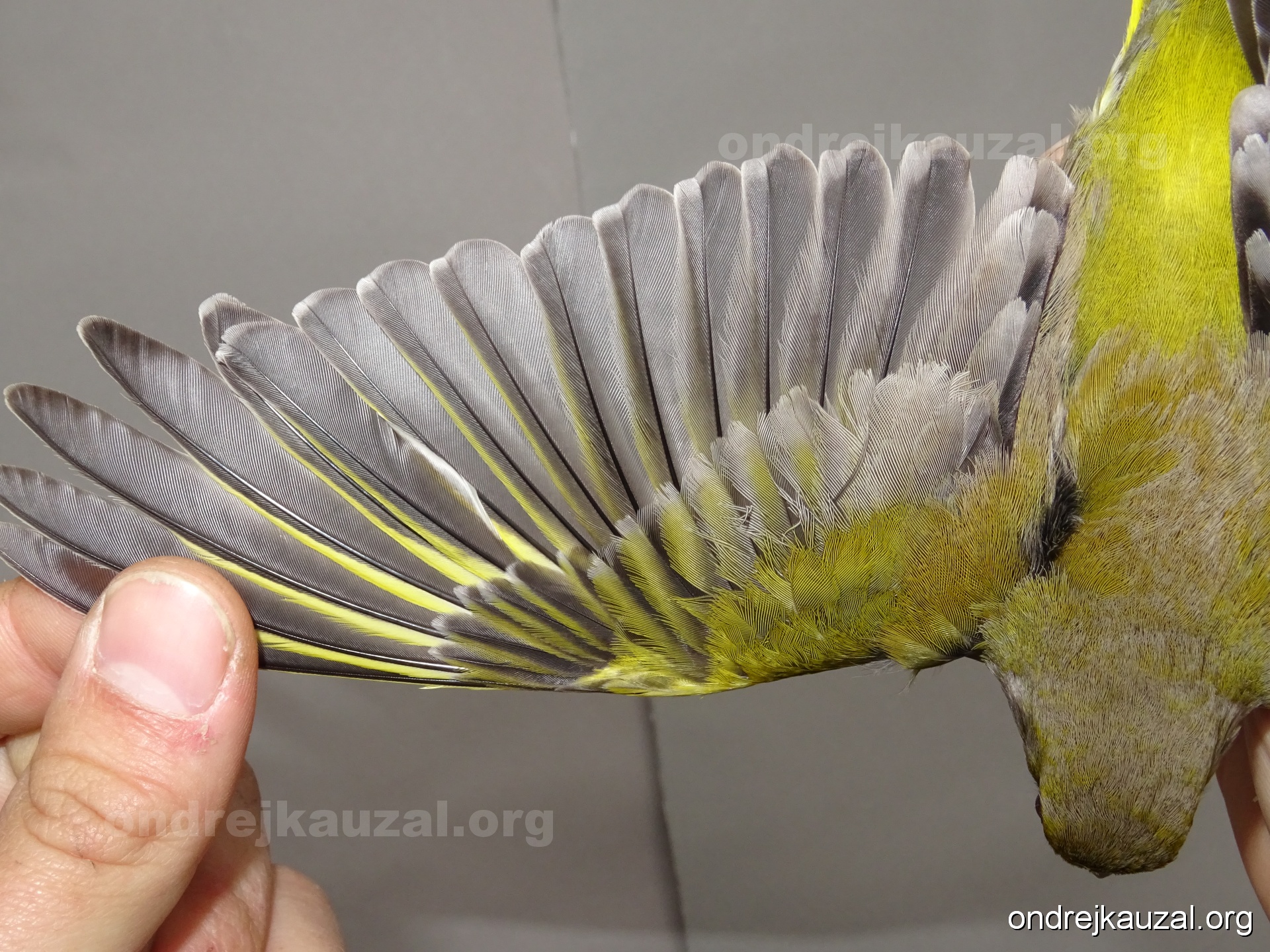 An interesting individual, albeit being in the first year of its life, it has moulted three of its primaries (P5 – P7). Greenfinches occasionally include moult of some primaries during their partial postjuvenile moult.