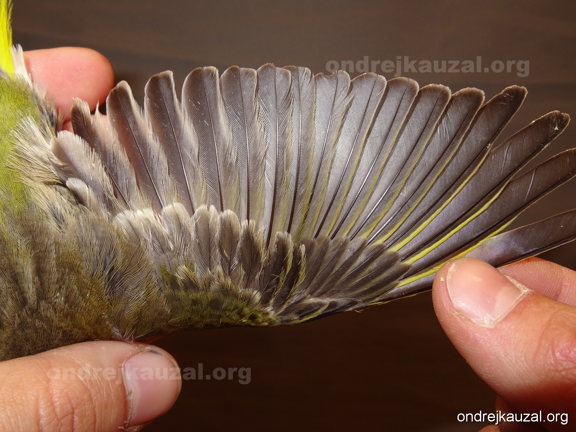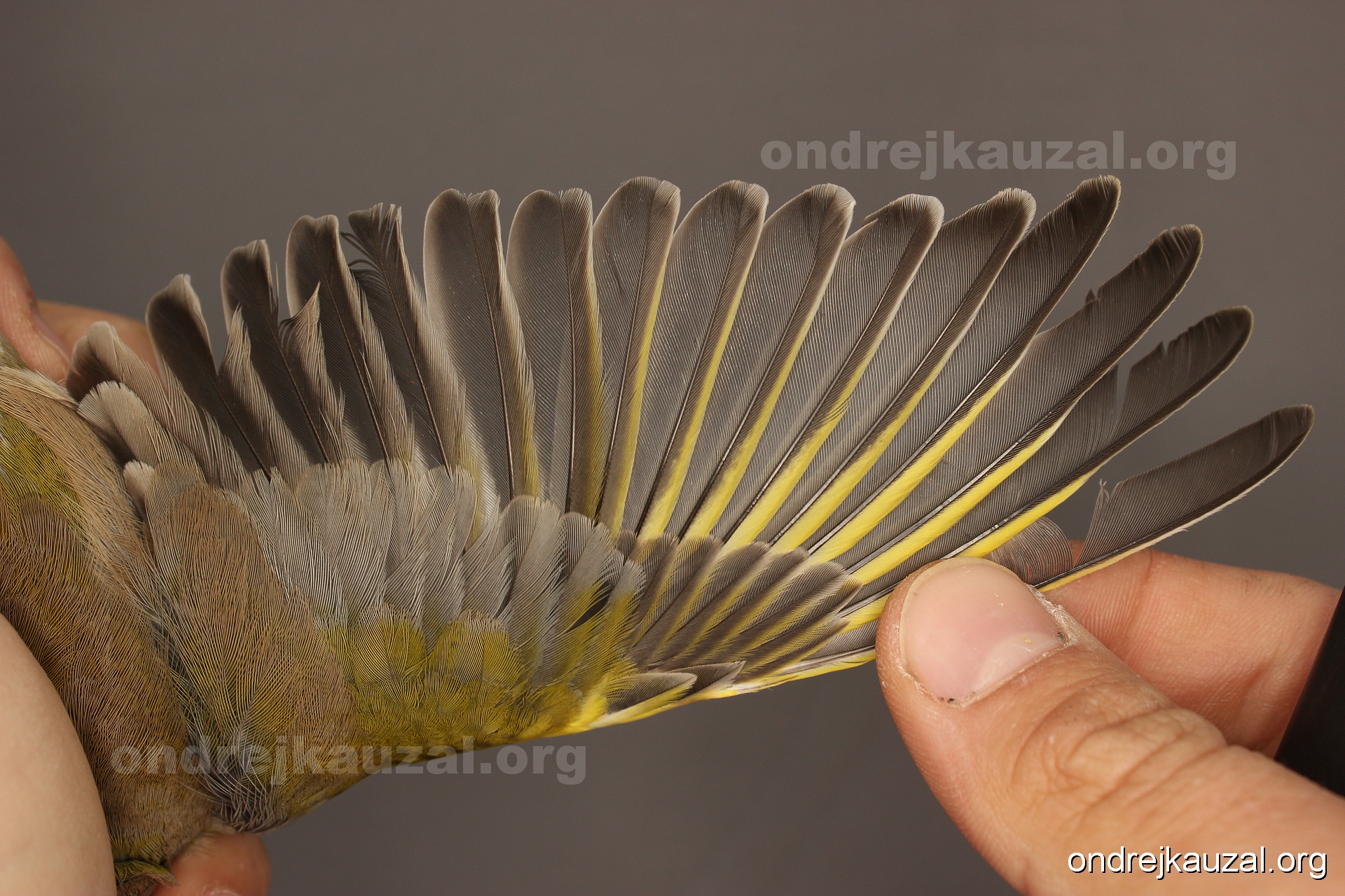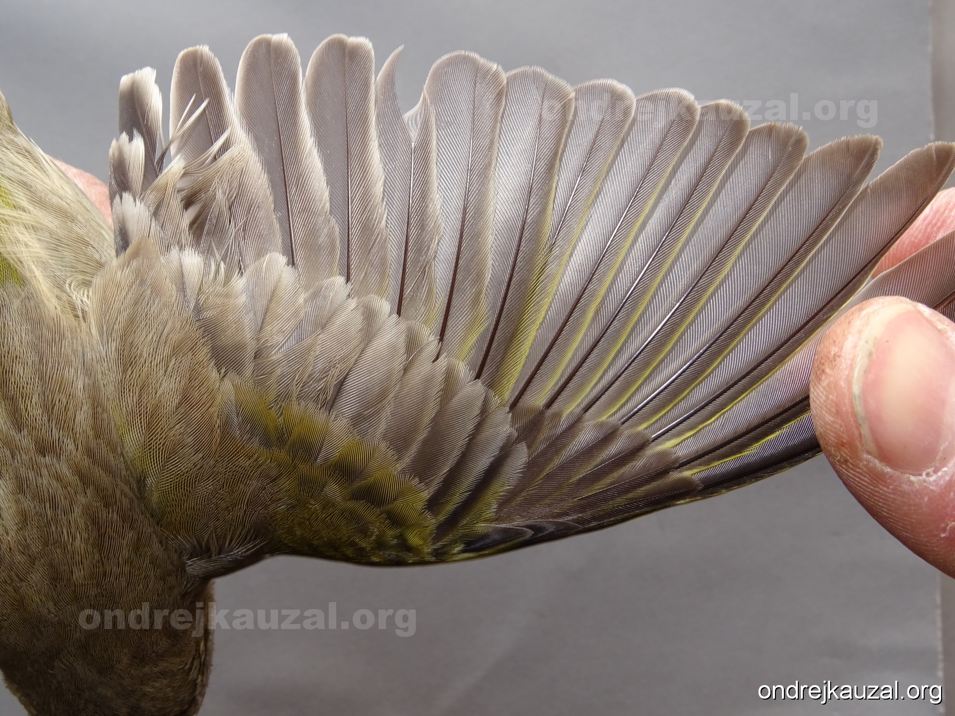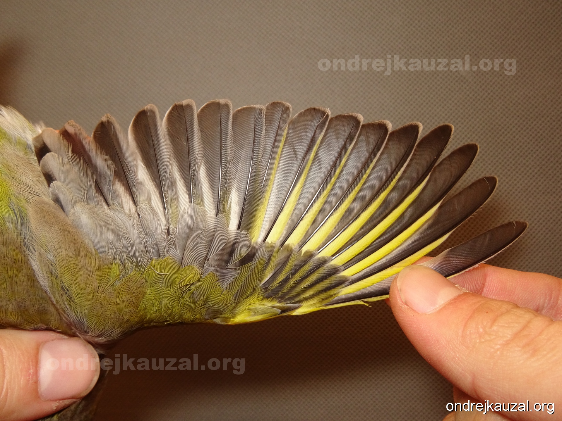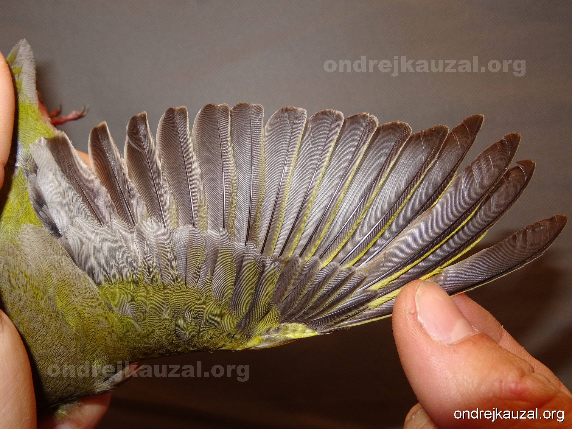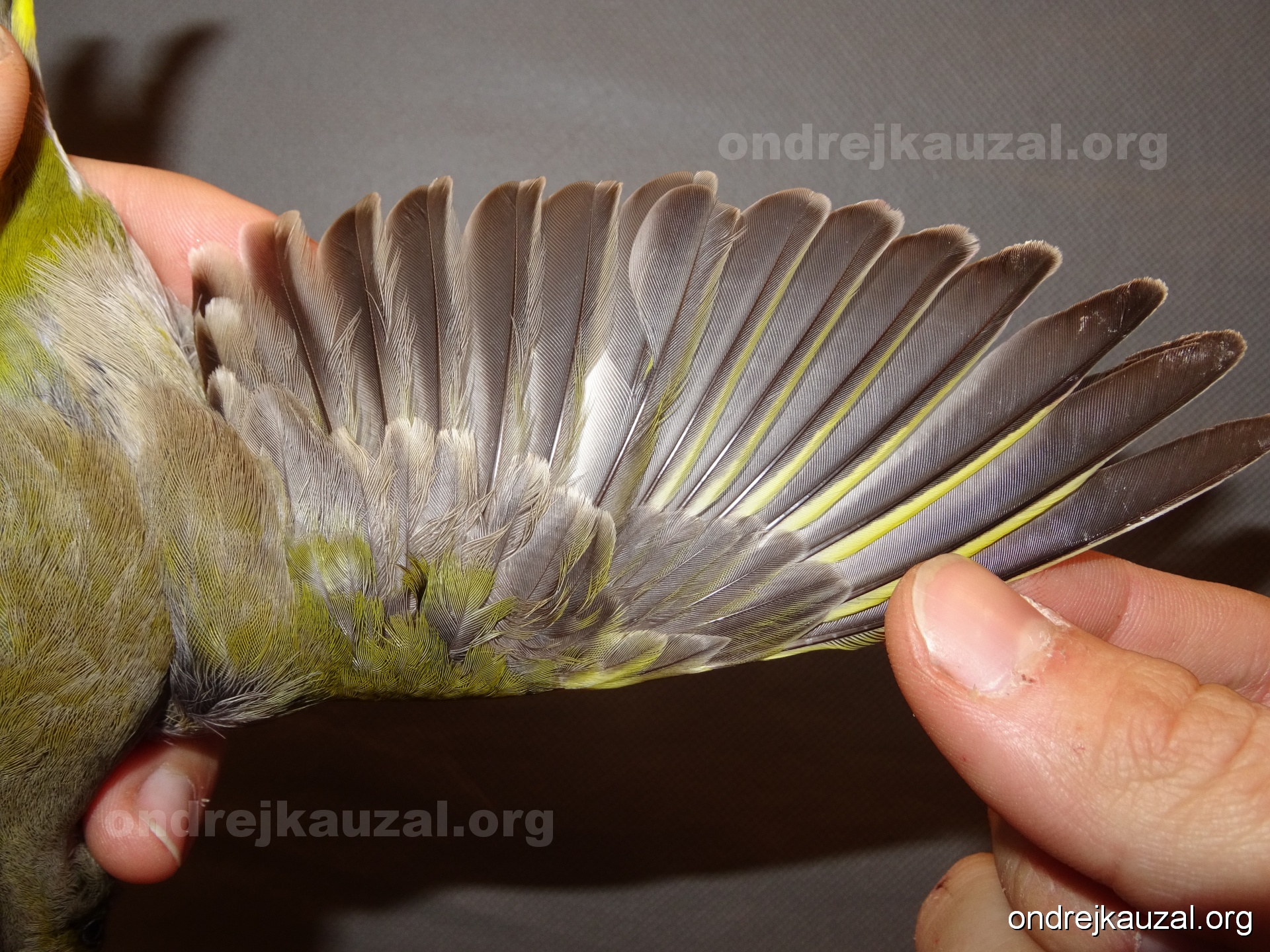 An interesting individual, albeit being in the first year of its life, it has moulted three of its primaries (P5 – P7). Greenfinches occasionally include moult of some primaries during their partial postjuvenile moult.