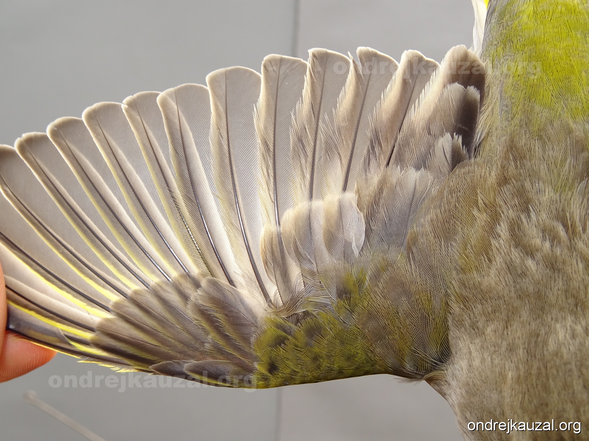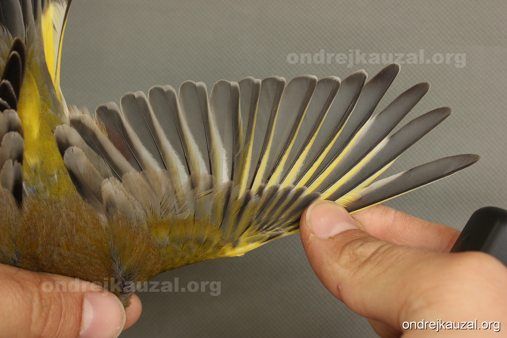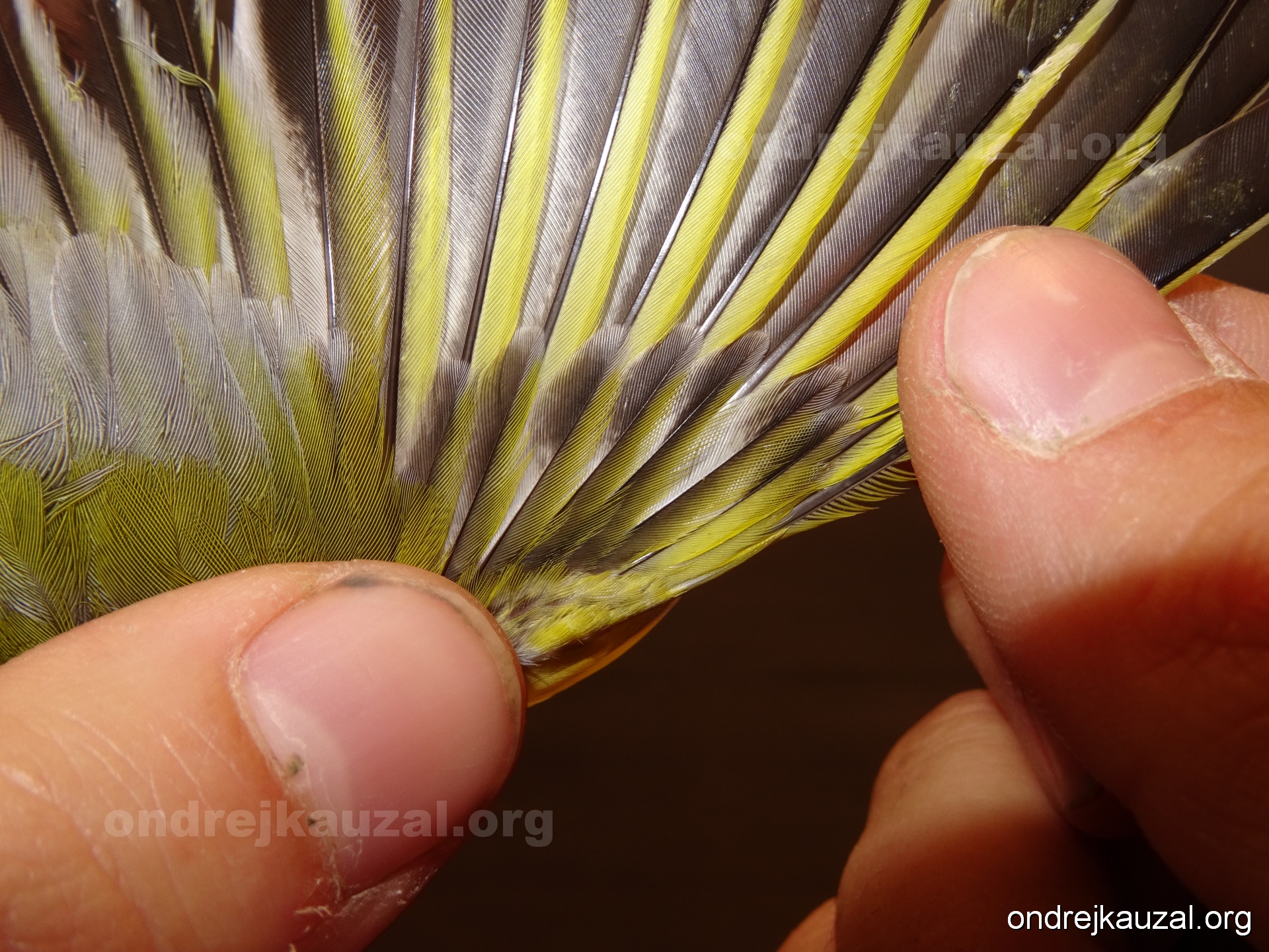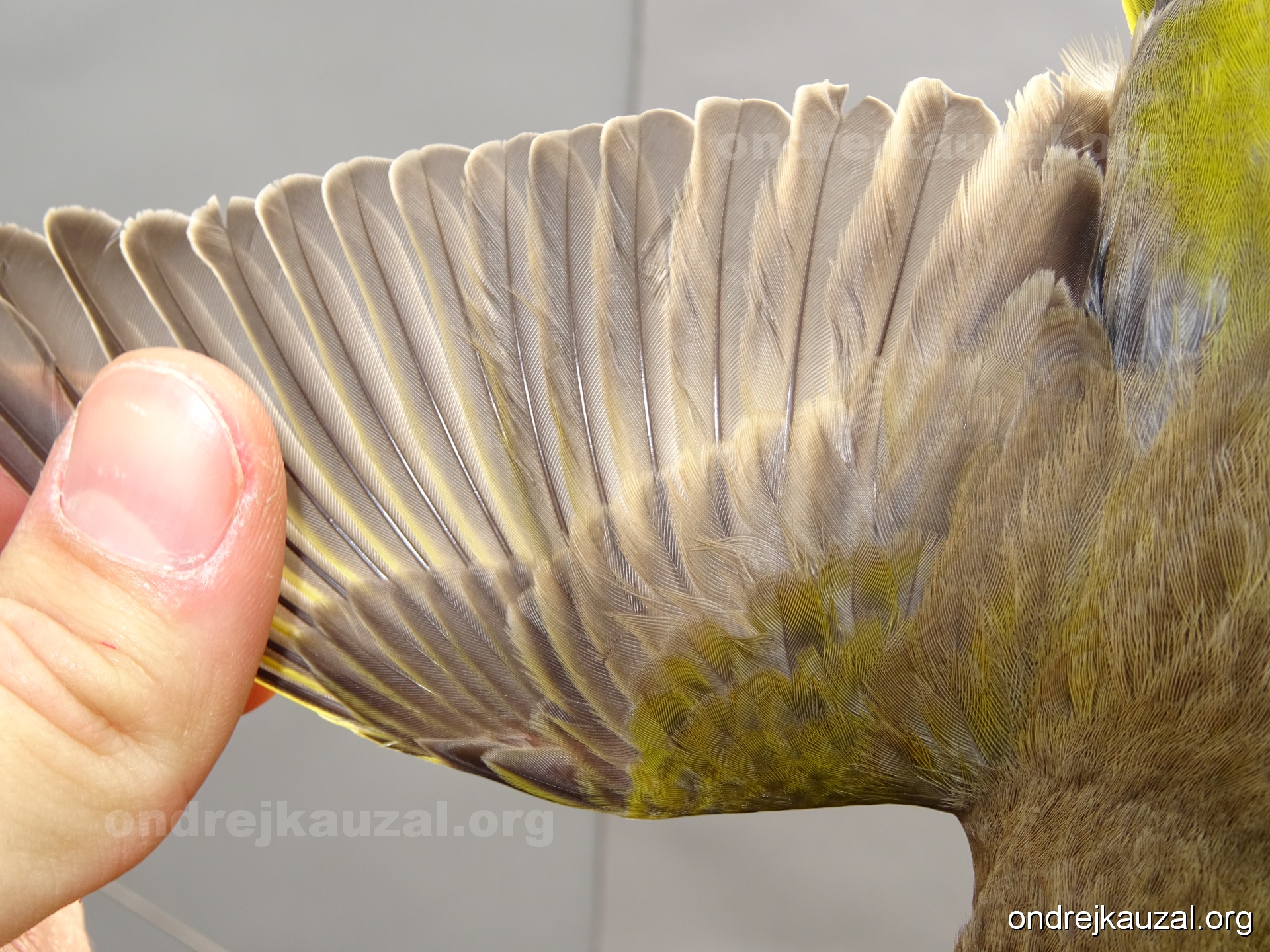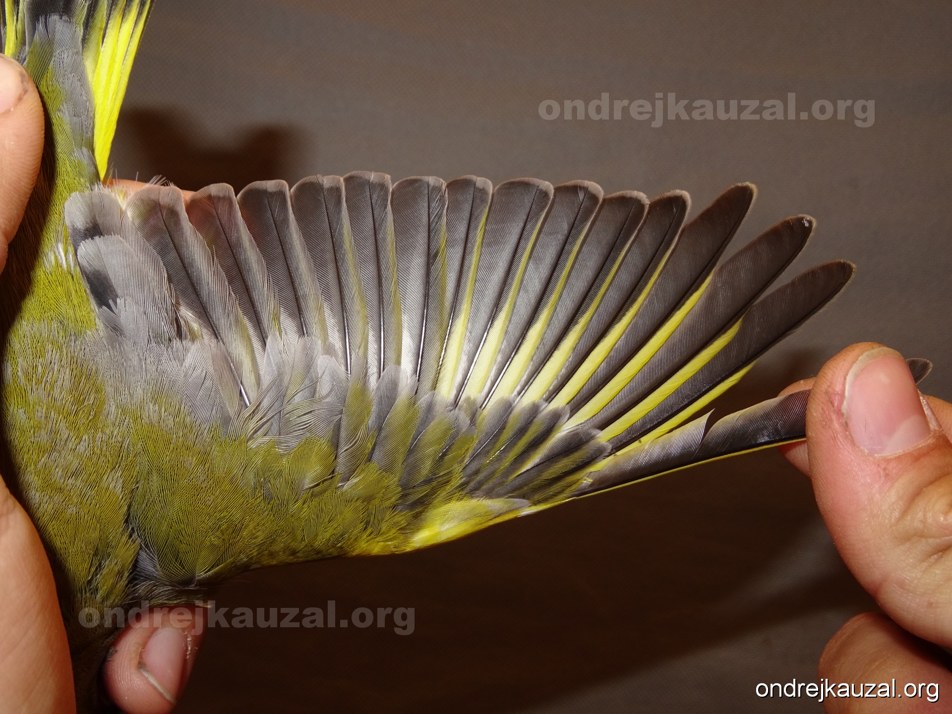 An interesting individual, albeit being in the first year of its life, it has moulted three of its primaries (P5 – P7). Greenfinches occasionally include moult of some primaries during their partial postjuvenile moult.
