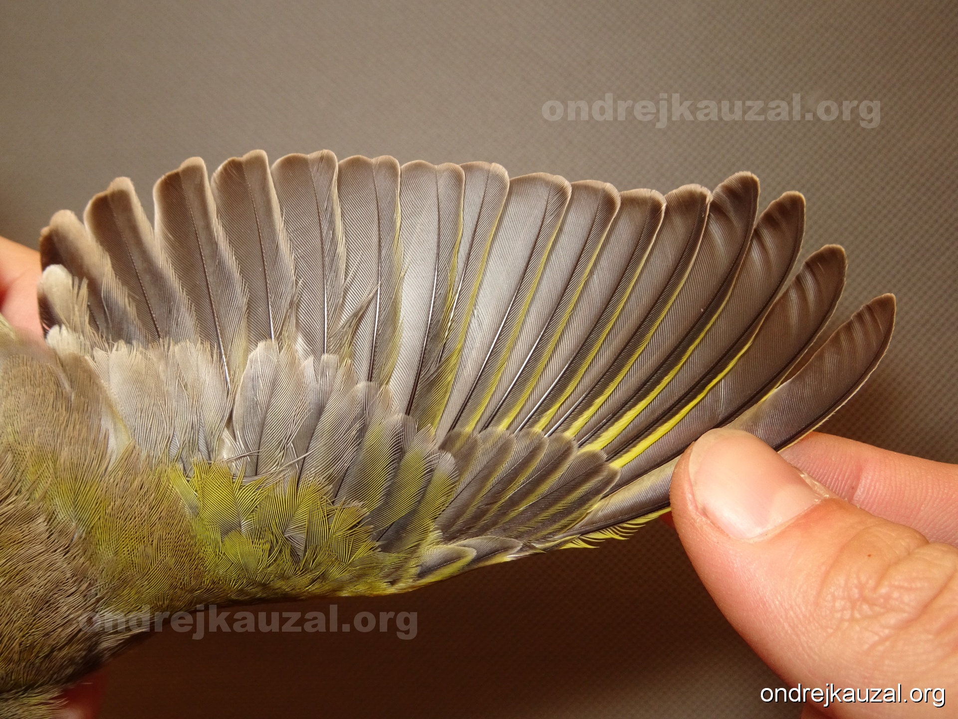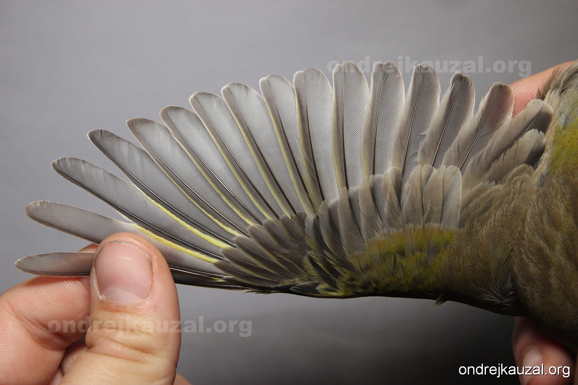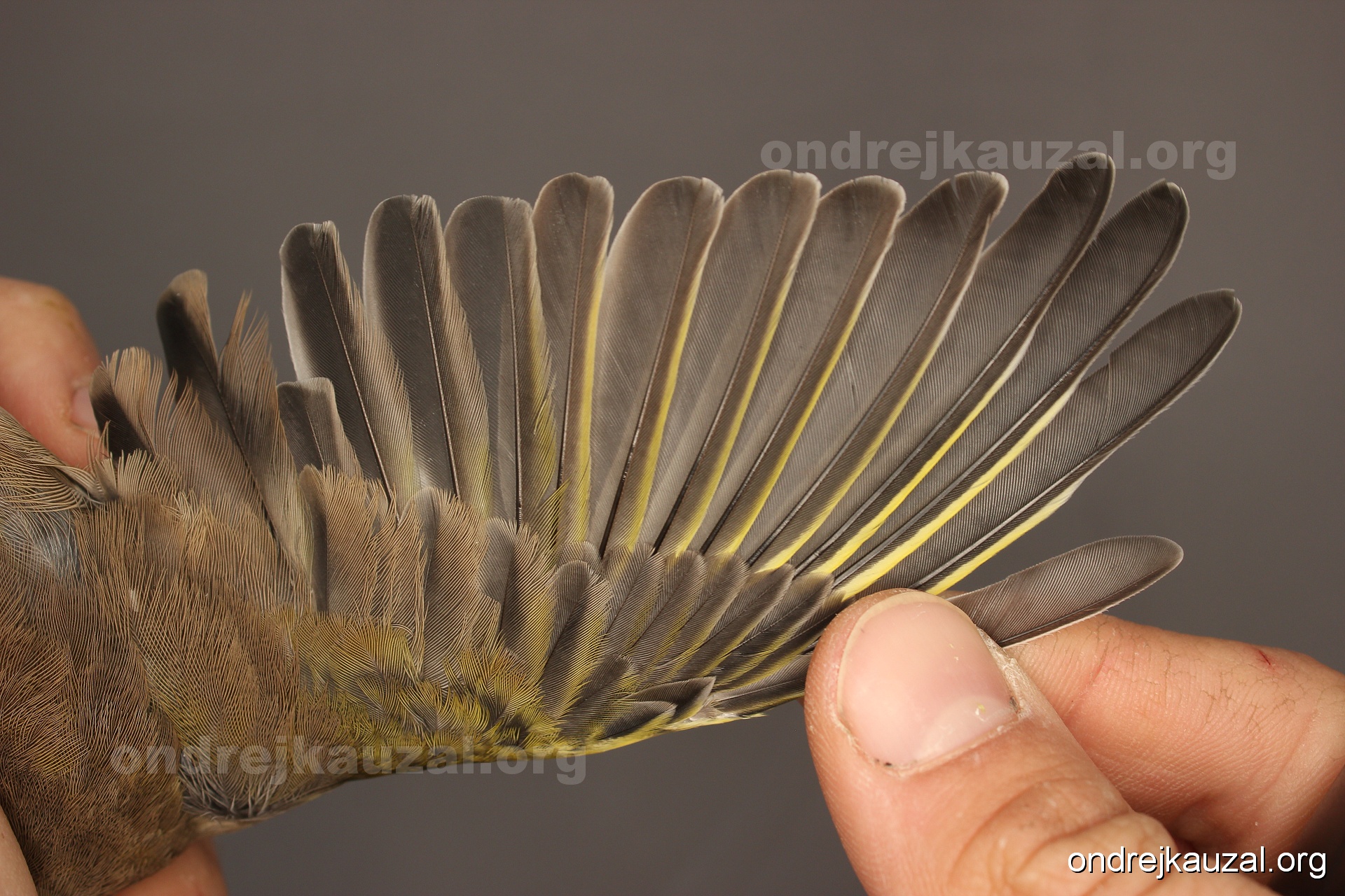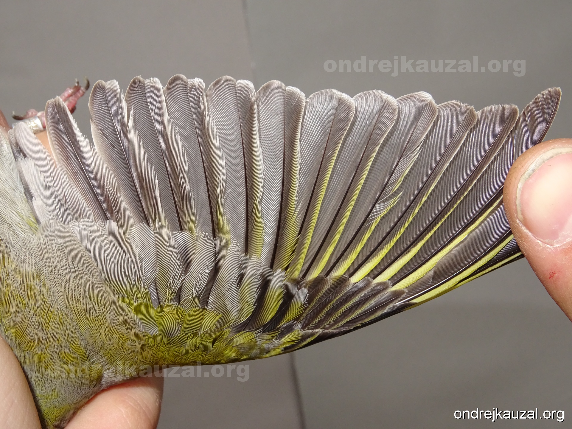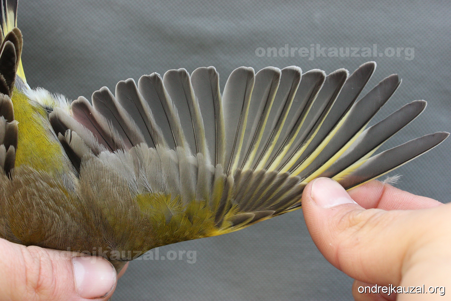 An interesting individual, albeit being in the first year of its life, it has moulted three of its primaries (P5 – P7). Greenfinches occasionally include moult of some primaries during their partial postjuvenile moult.