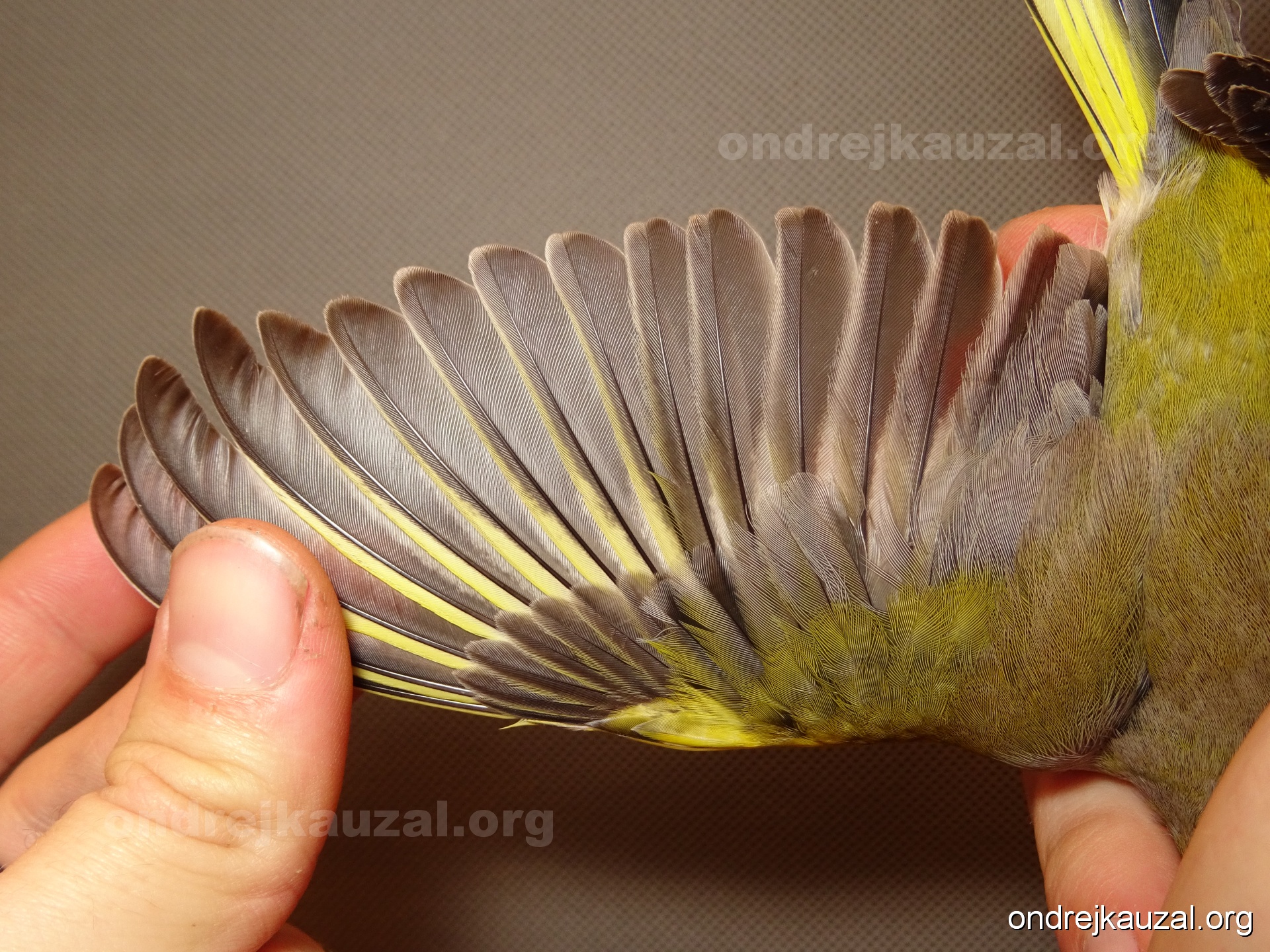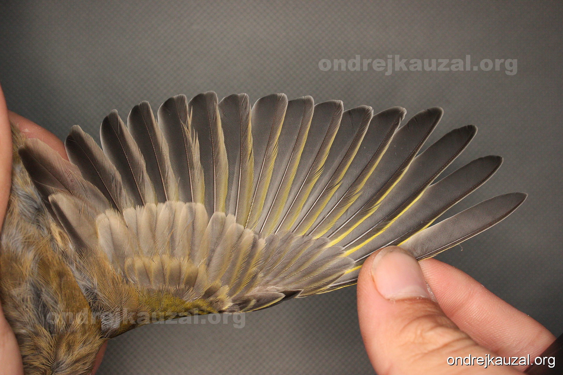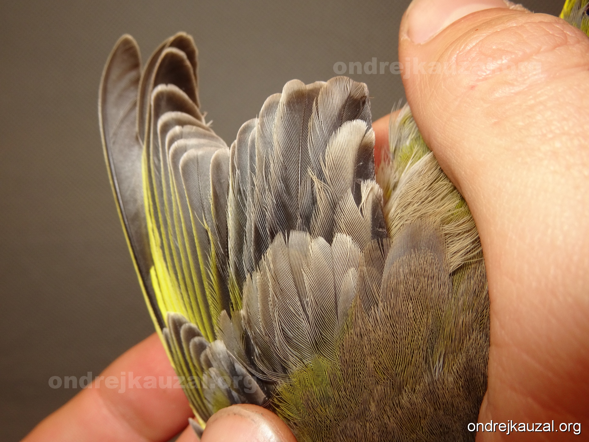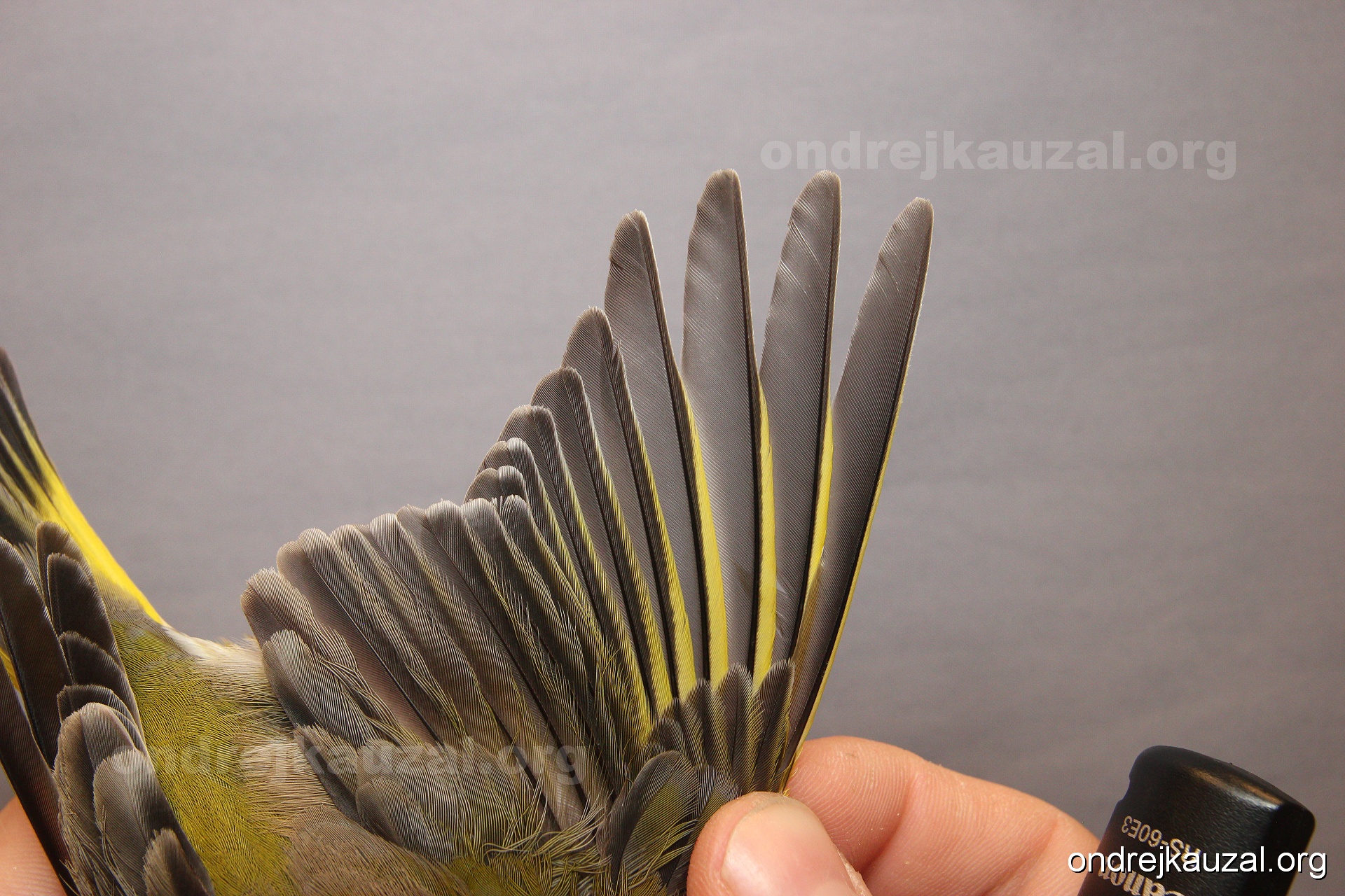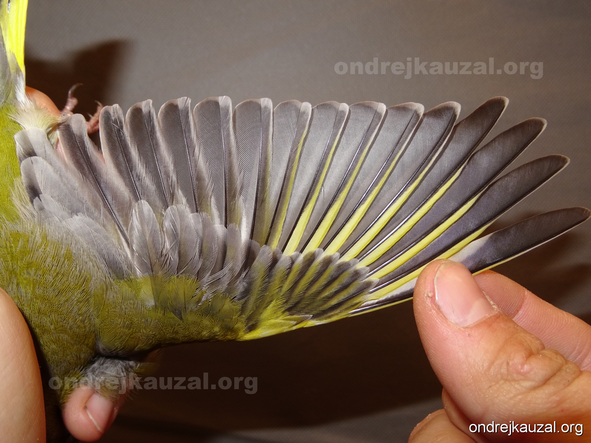 An interesting individual, albeit being in the first year of its life, it has moulted three of its primaries (P5 – P7). Greenfinches occasionally include moult of some primaries during their partial postjuvenile moult.