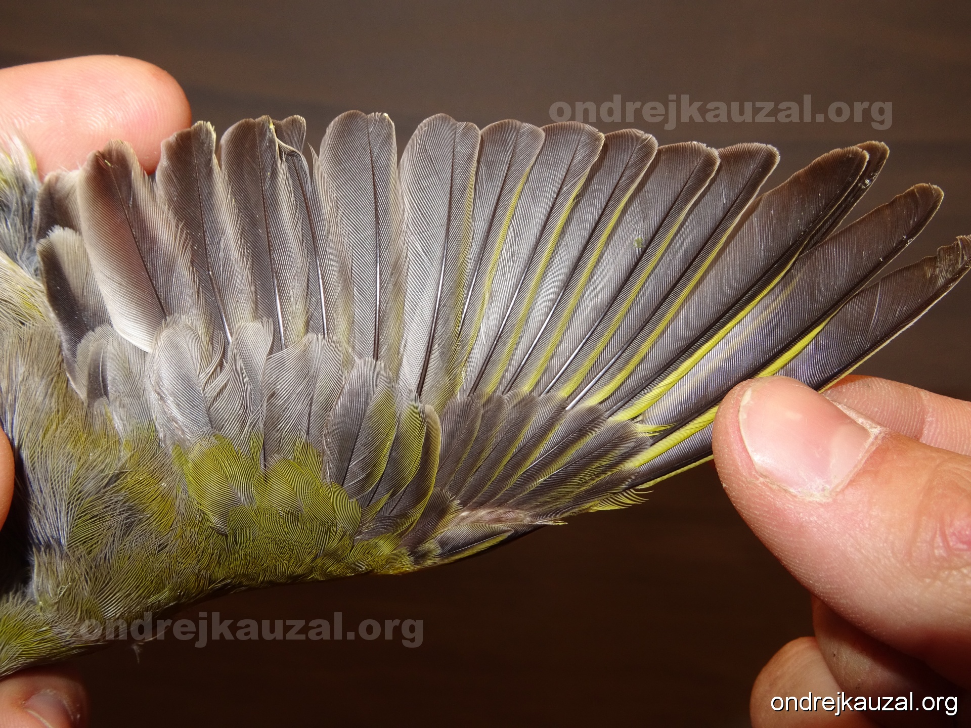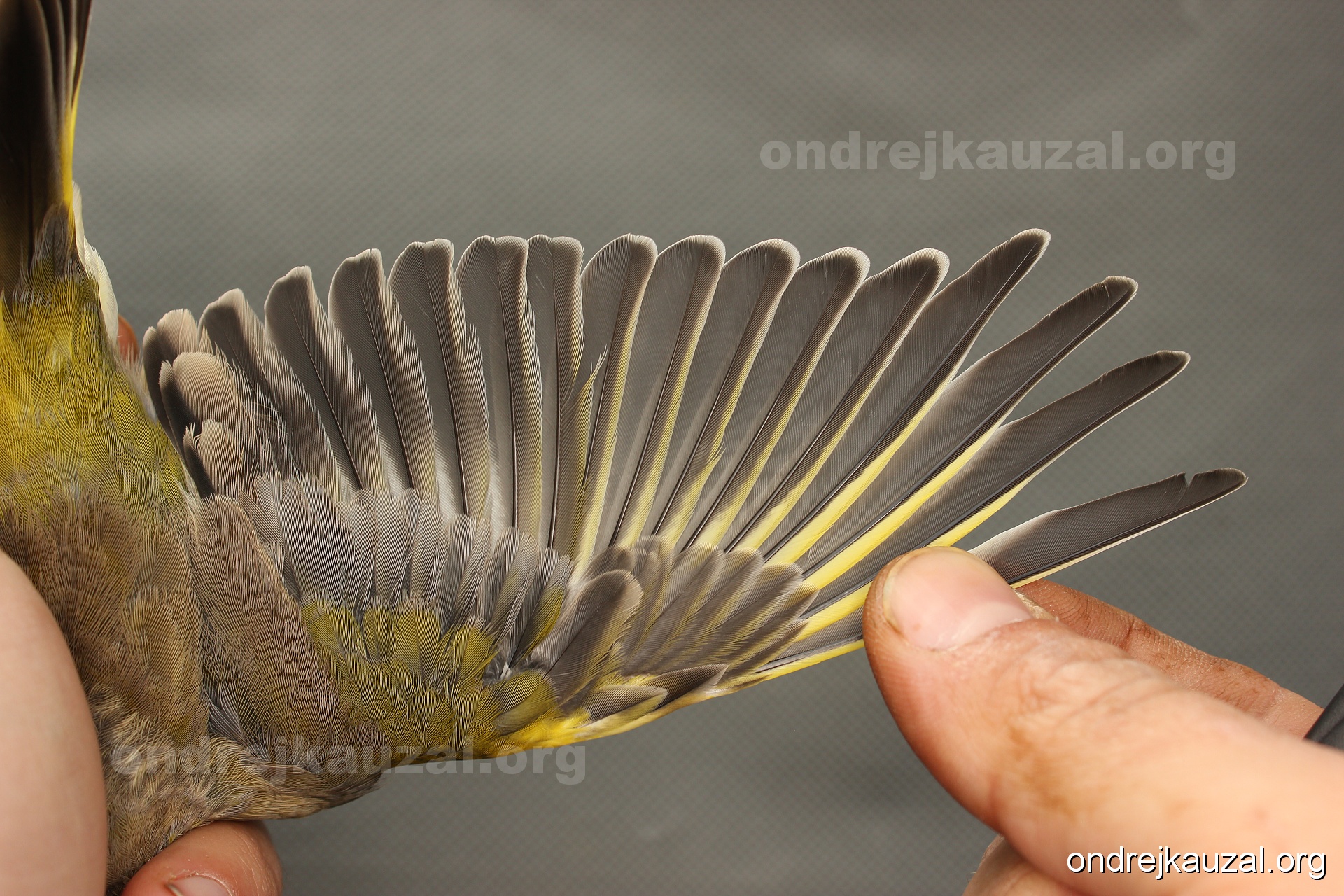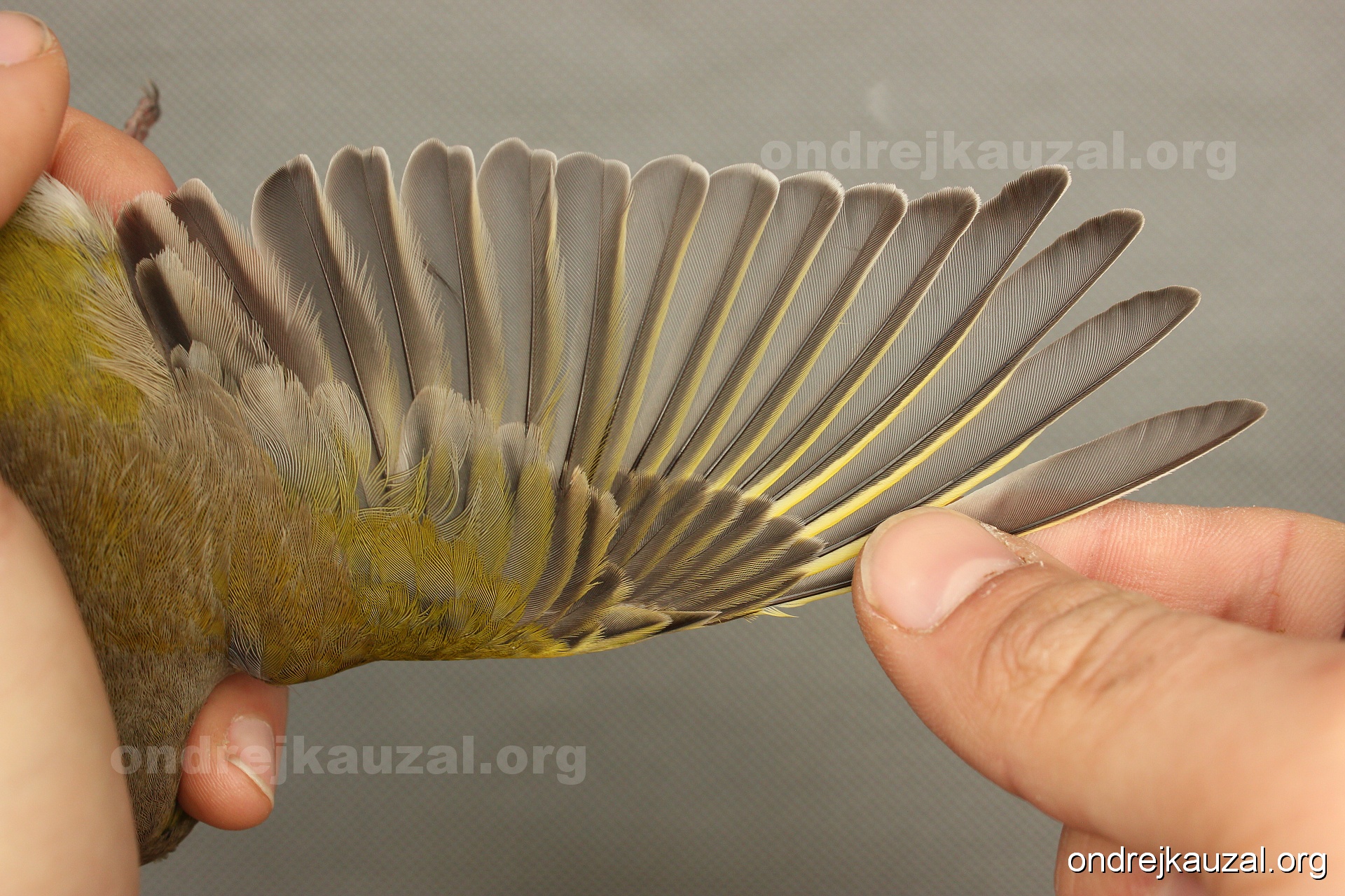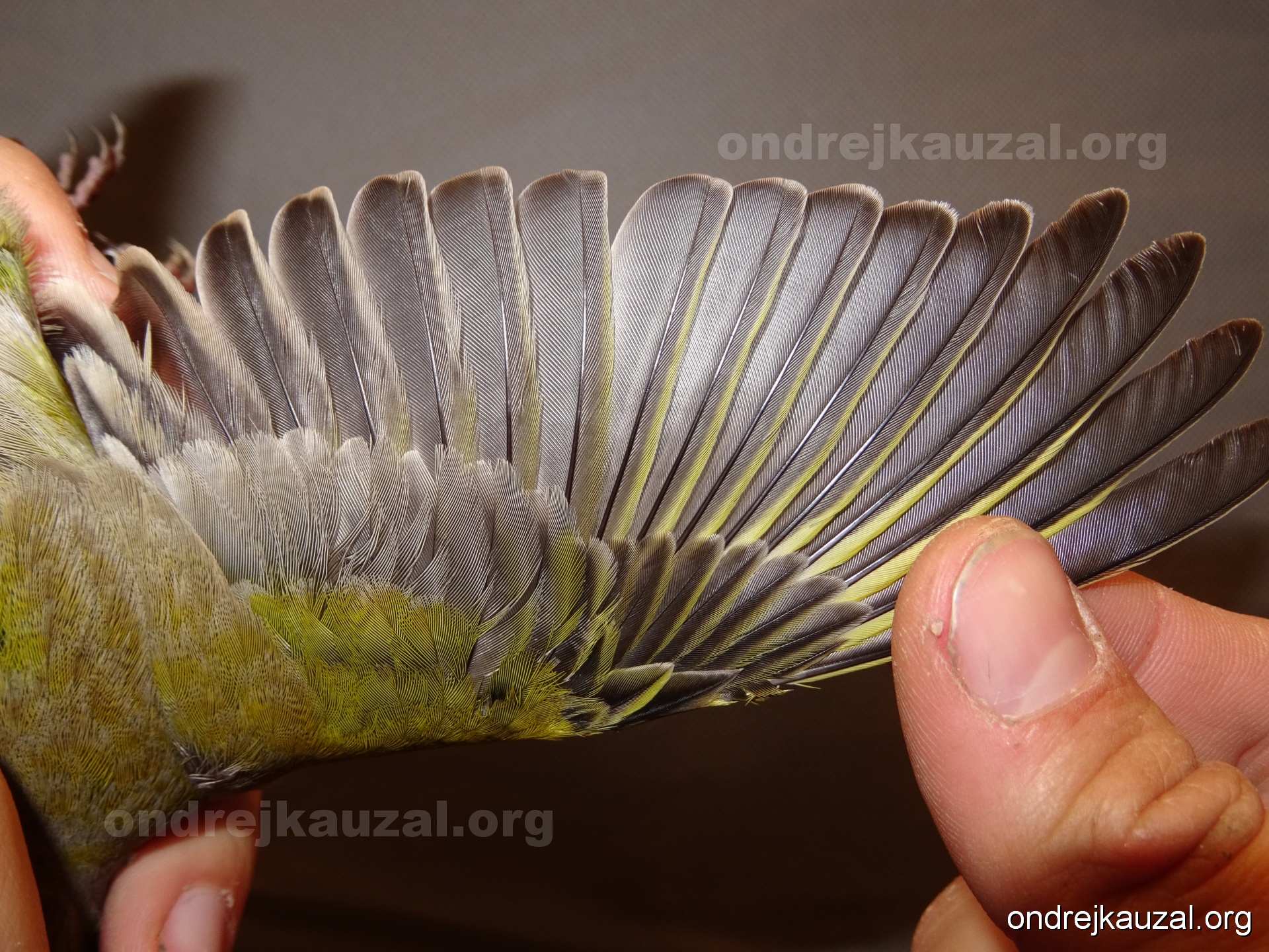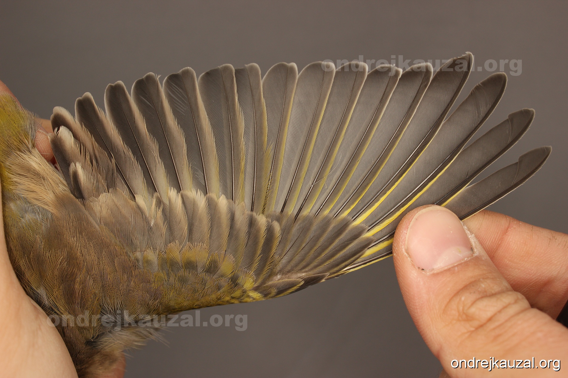 An interesting individual, albeit being in the first year of its life, it has moulted three of its primaries (P5 – P7). Greenfinches occasionally include moult of some primaries during their partial postjuvenile moult.