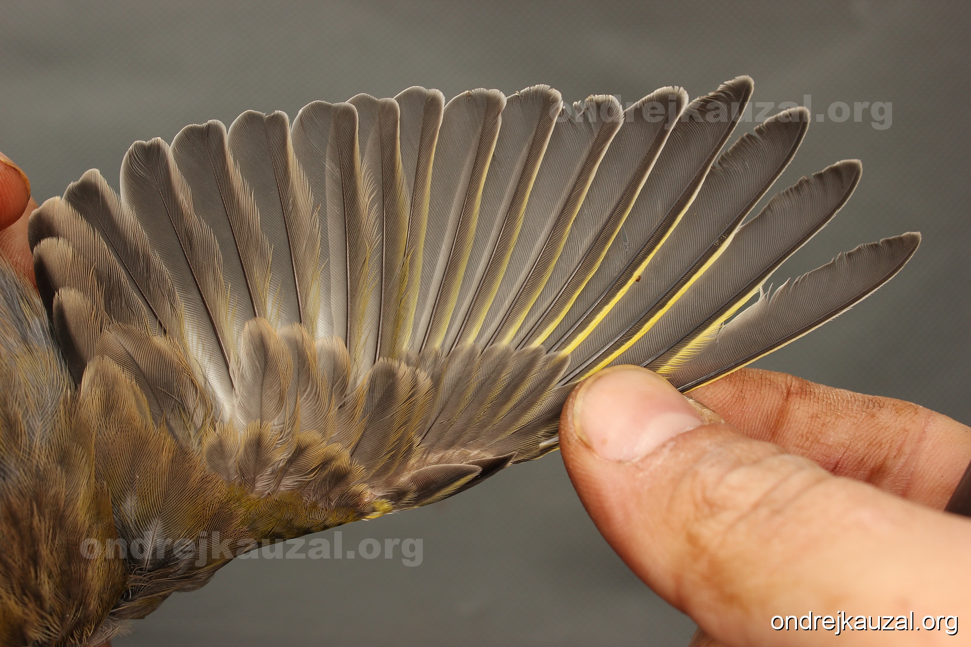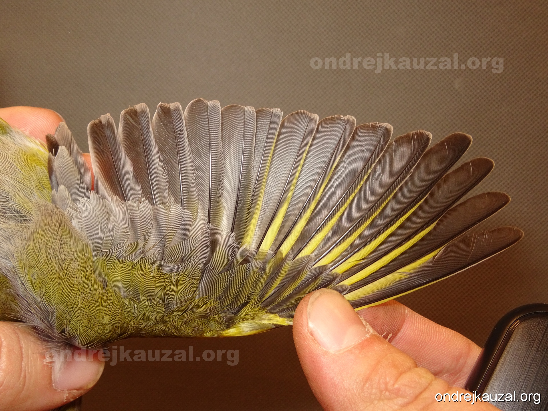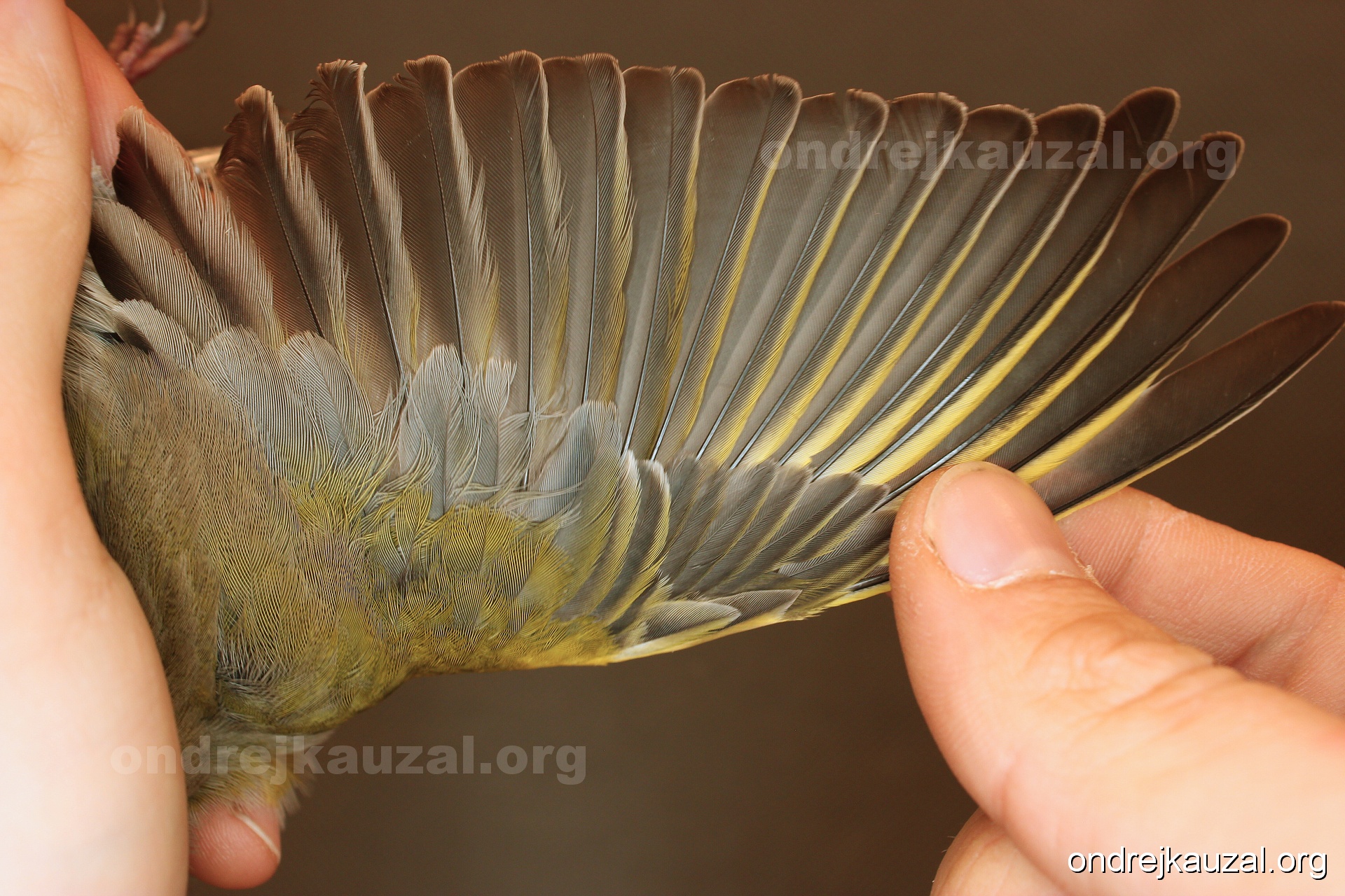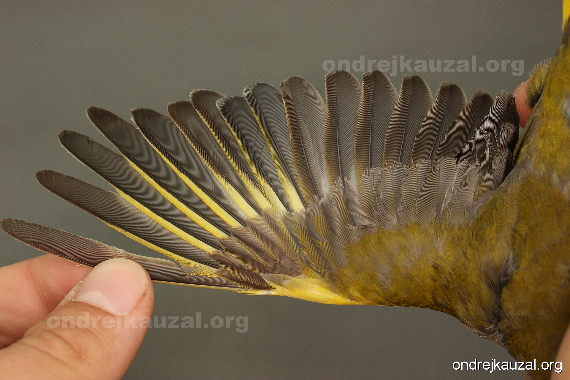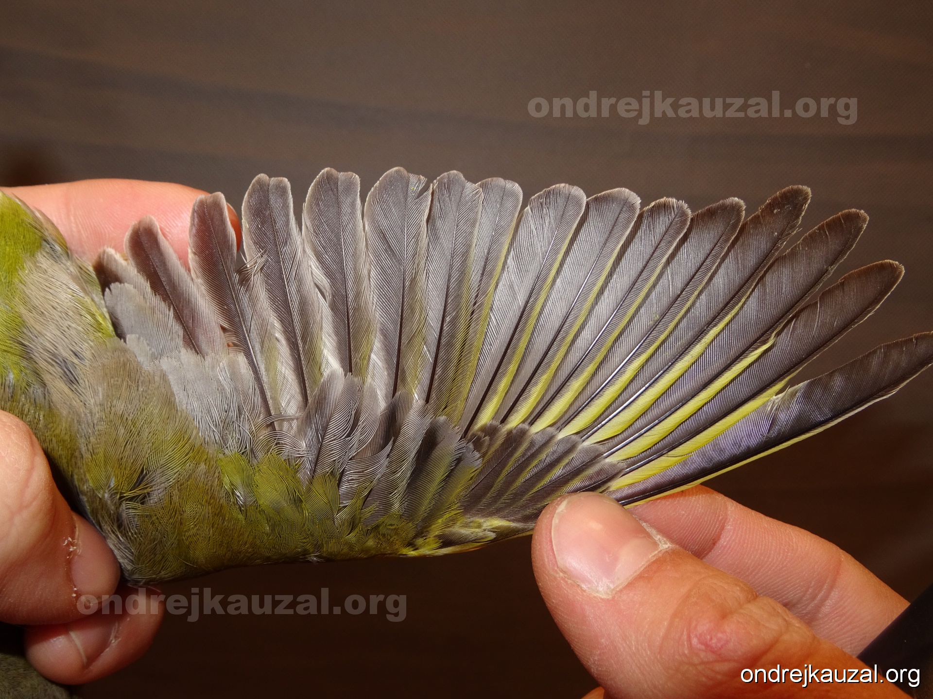 An interesting individual, albeit being in the first year of its life, it has moulted three of its primaries (P5 – P7). Greenfinches occasionally include moult of some primaries during their partial postjuvenile moult.