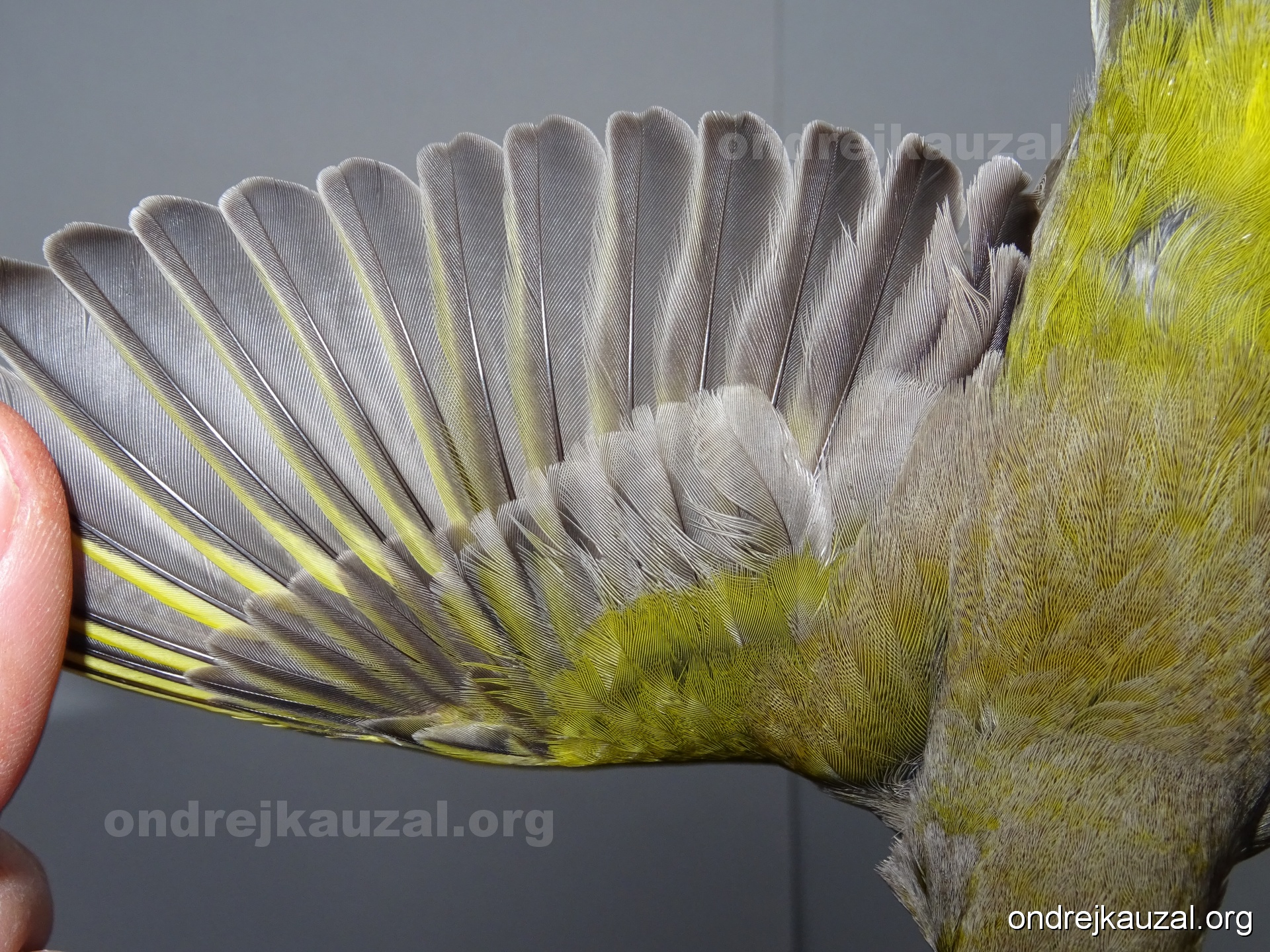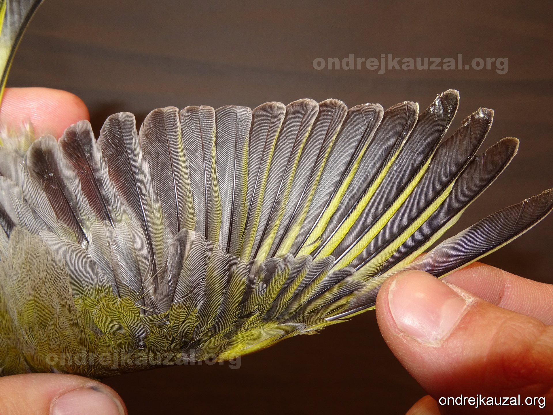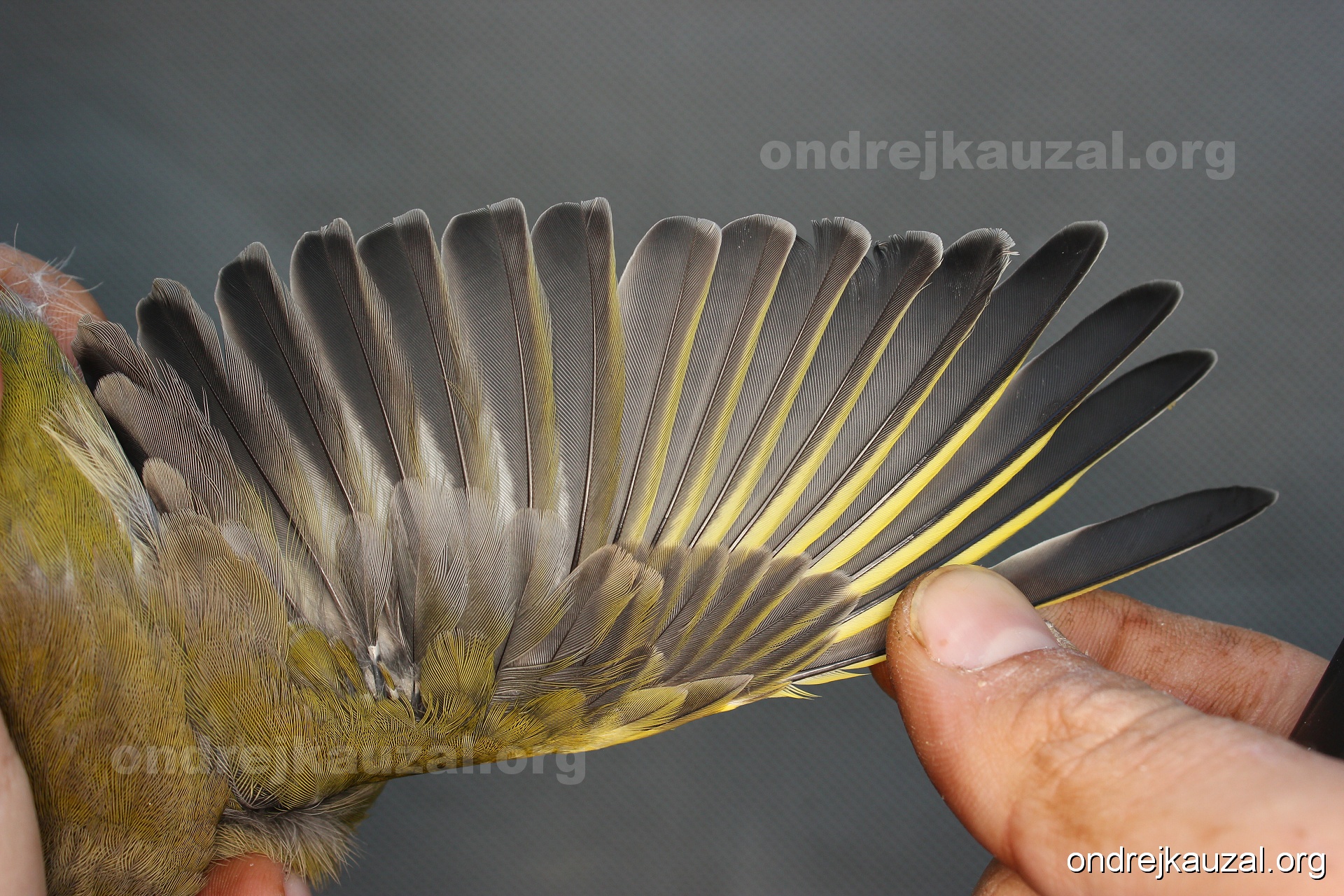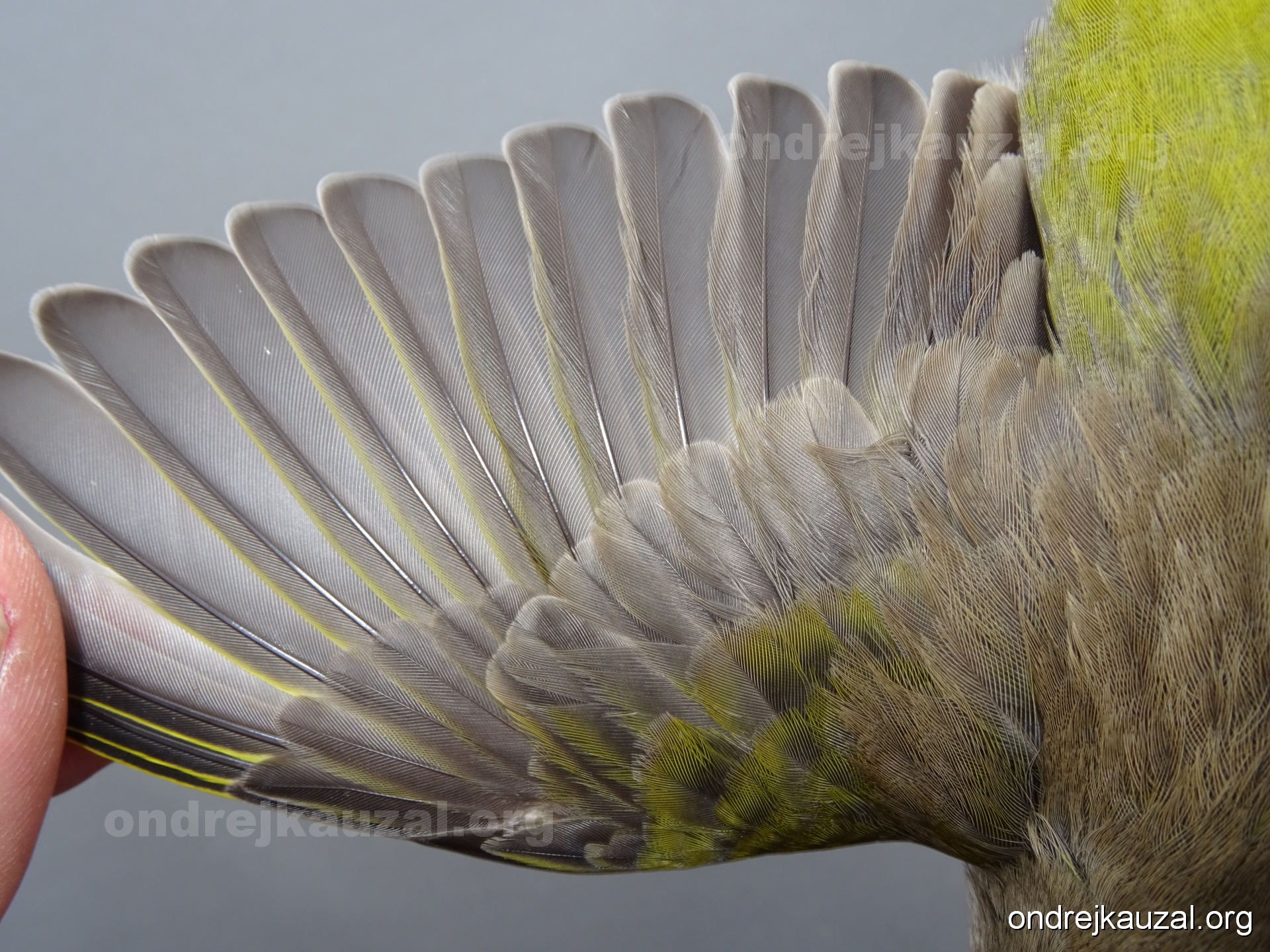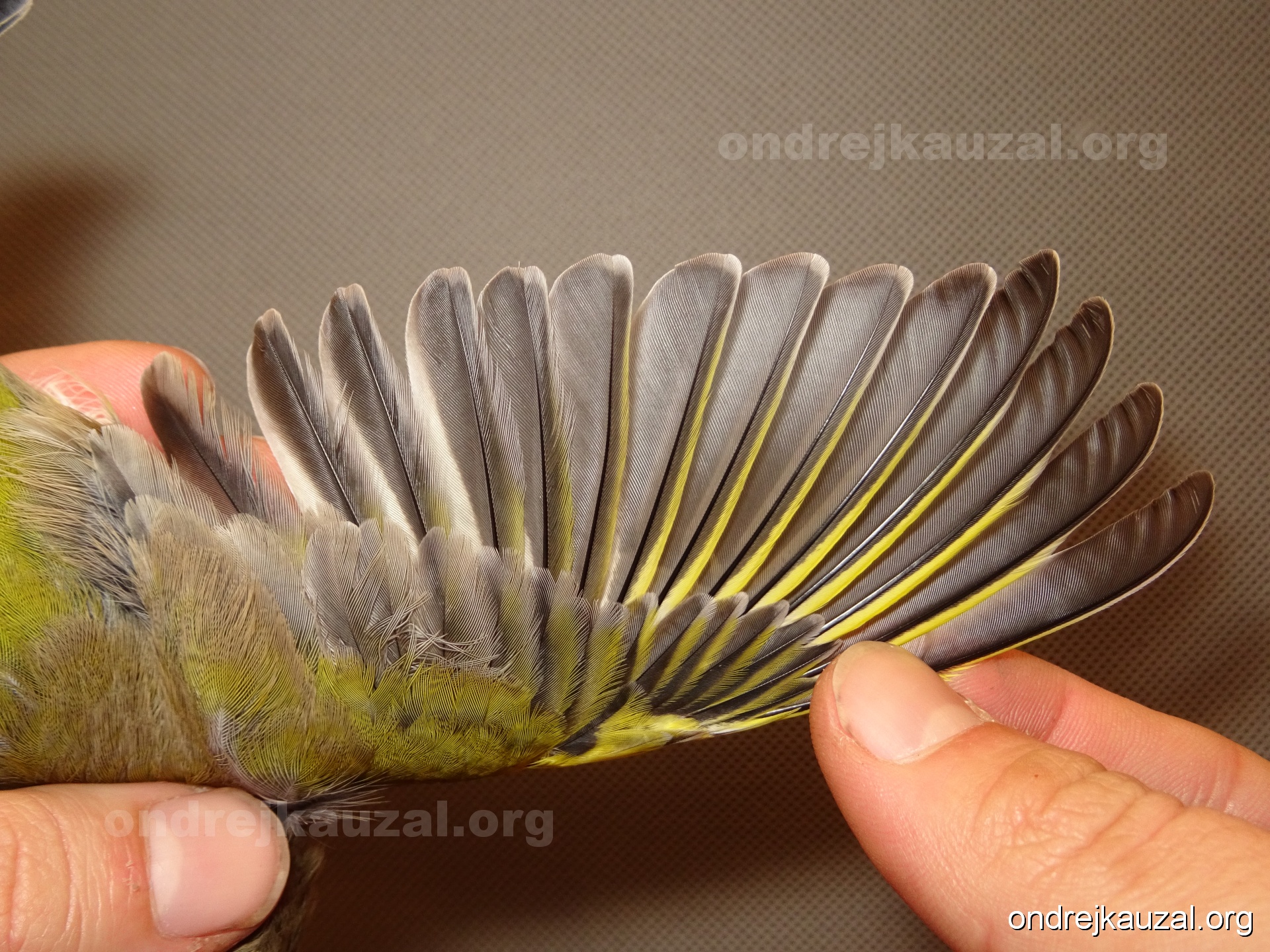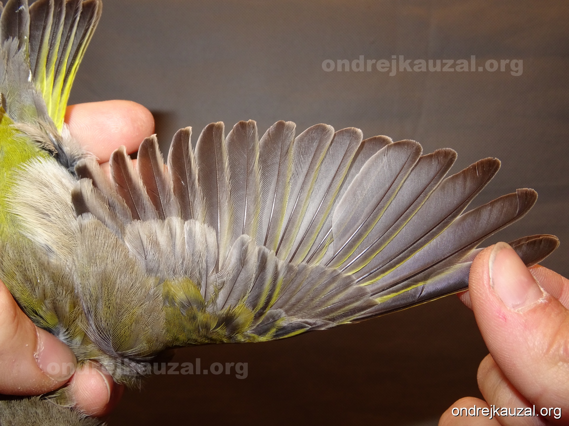An interesting individual, albeit being in the first year of its life, it has moulted three of its primaries (P5 – P7). Greenfinches occasionally include moult of some primaries during their partial postjuvenile moult.