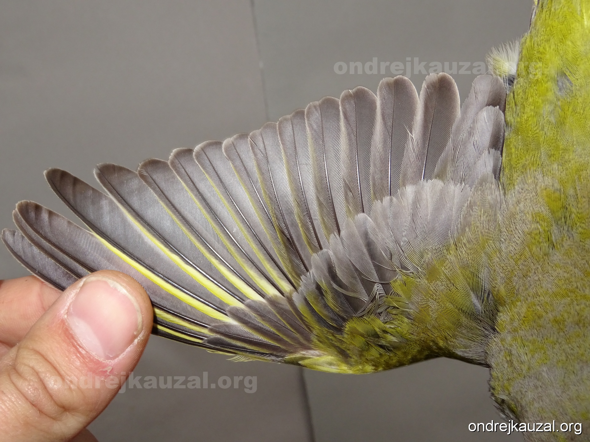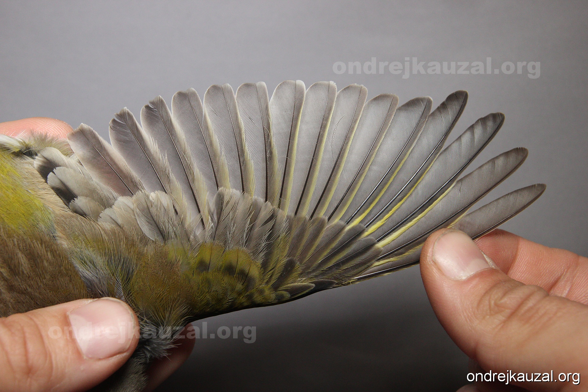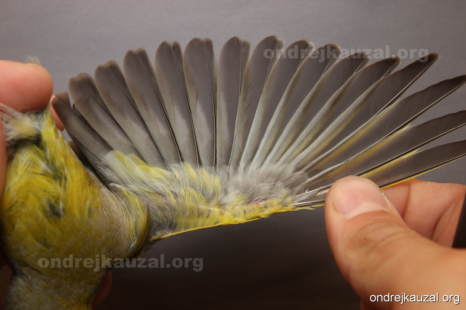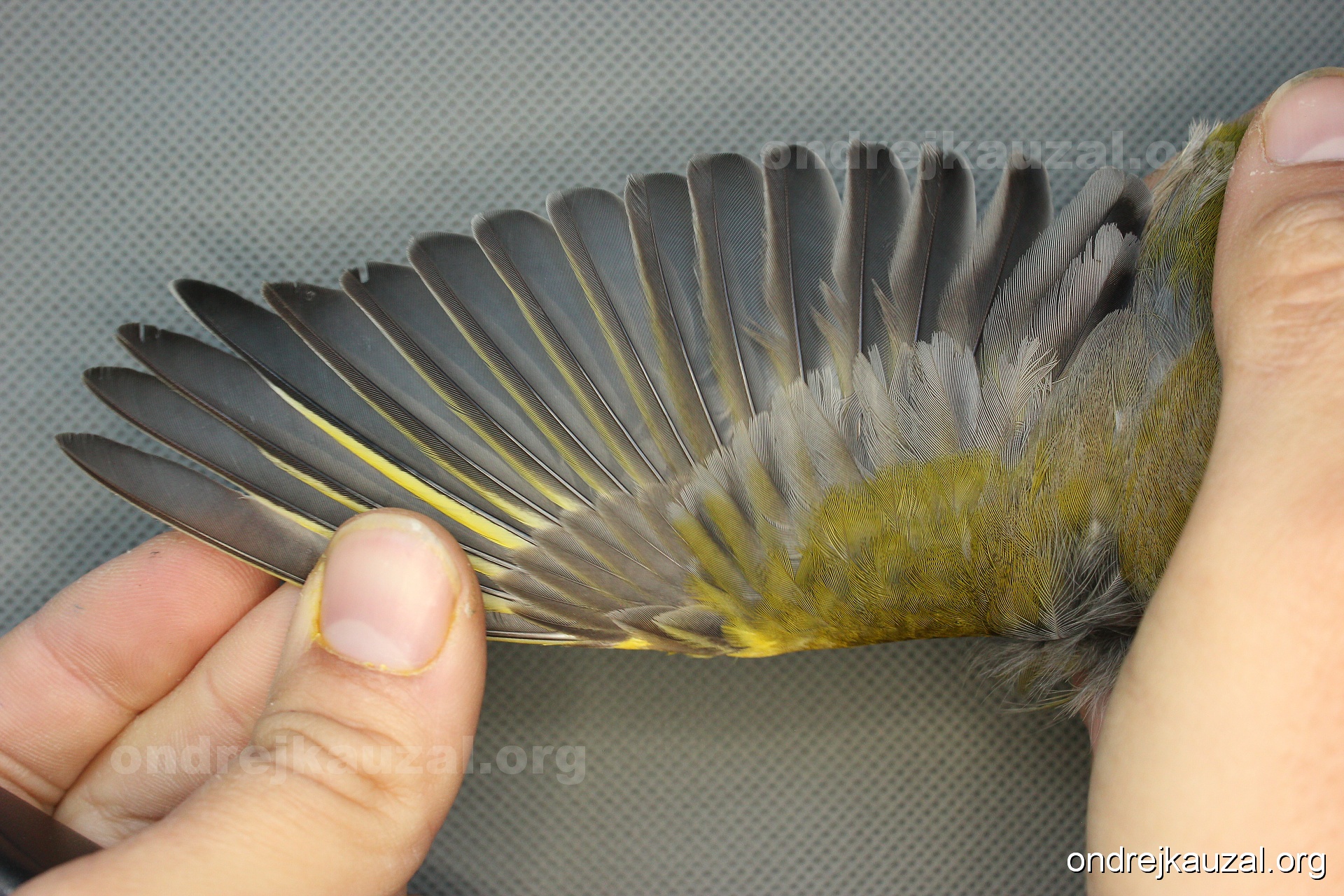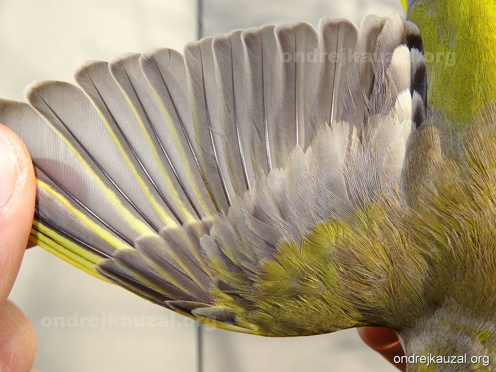 An interesting individual, albeit being in the first year of its life, it has moulted three of its primaries (P5 – P7). Greenfinches occasionally include moult of some primaries during their partial postjuvenile moult.