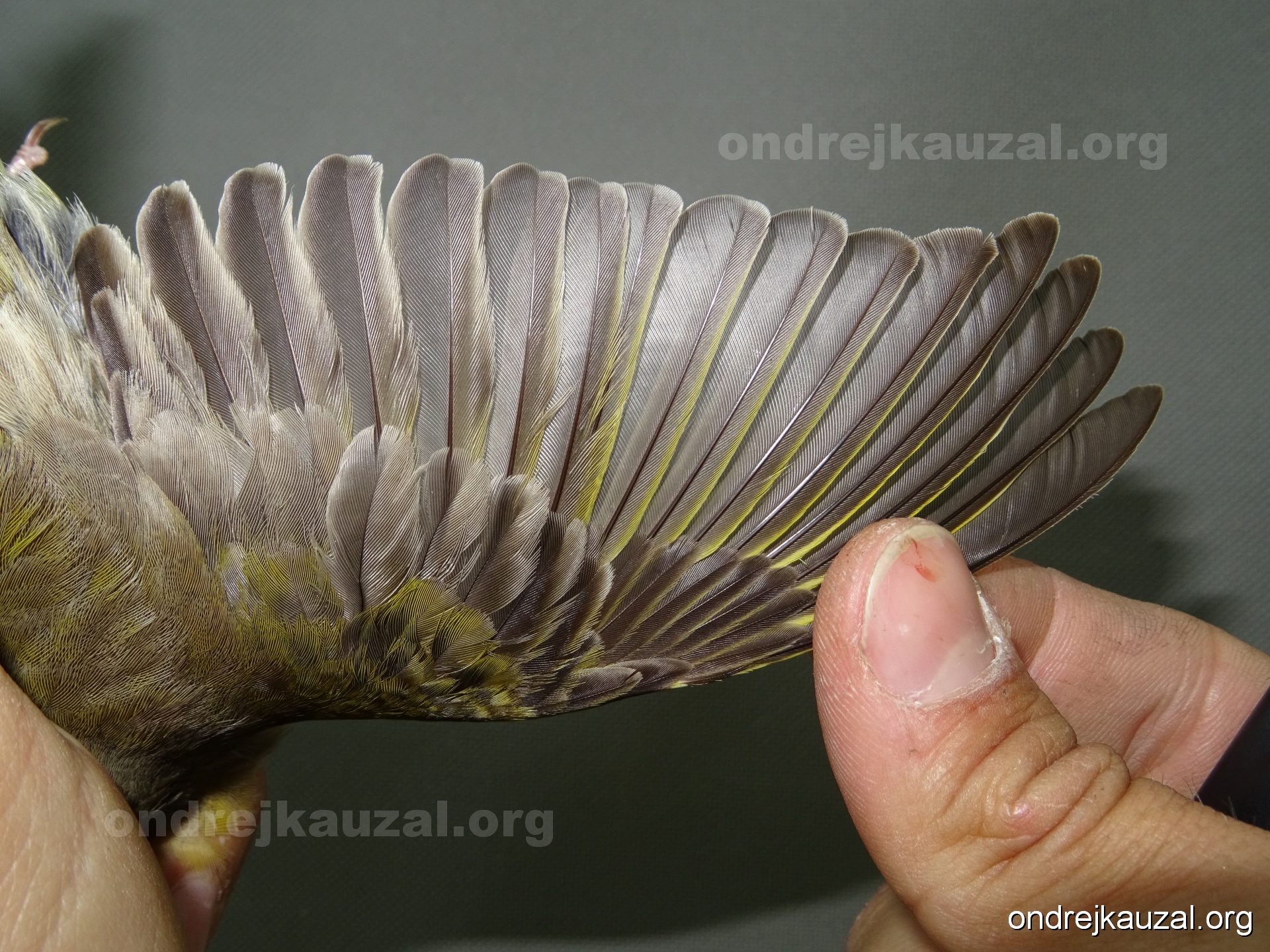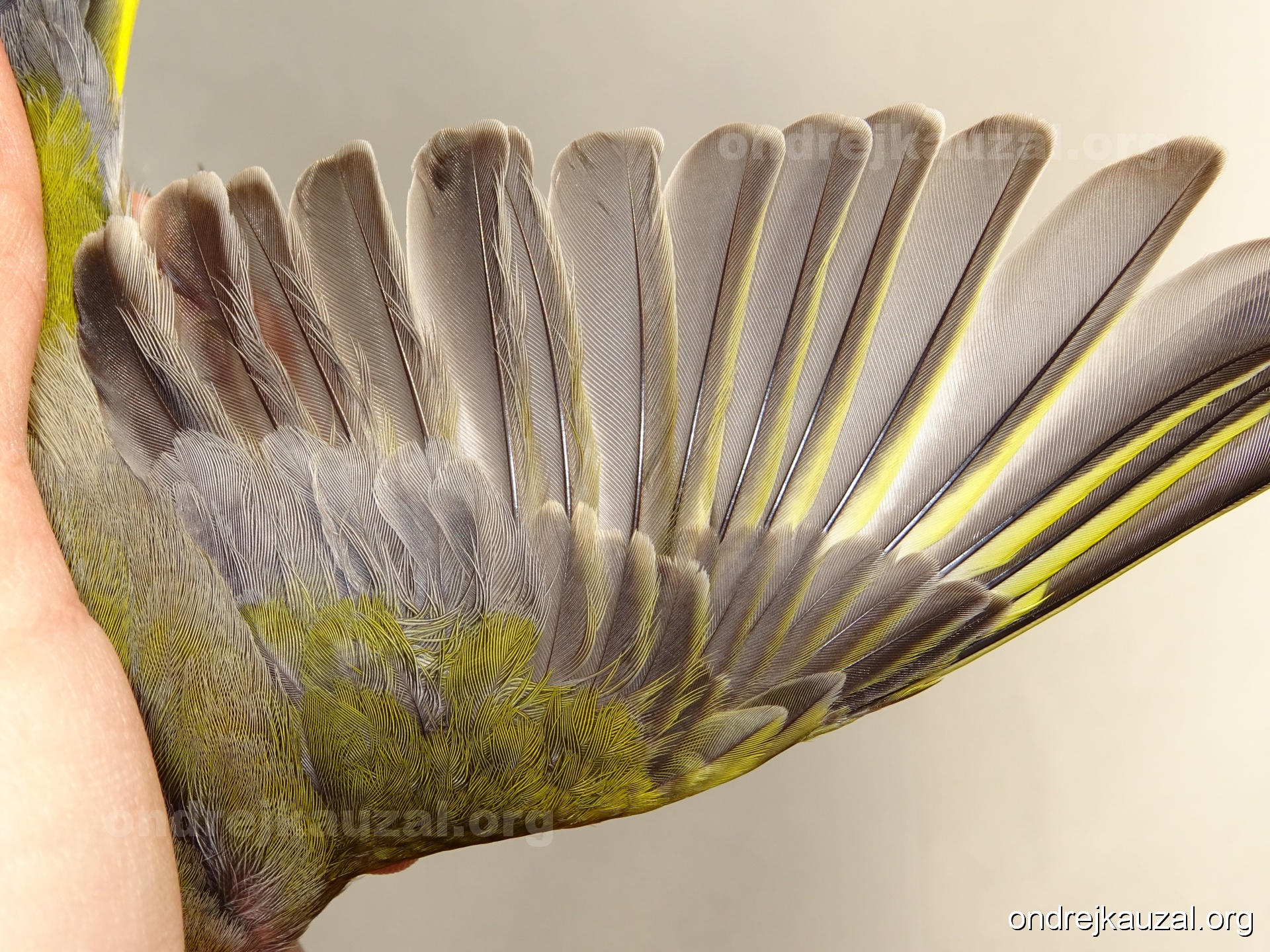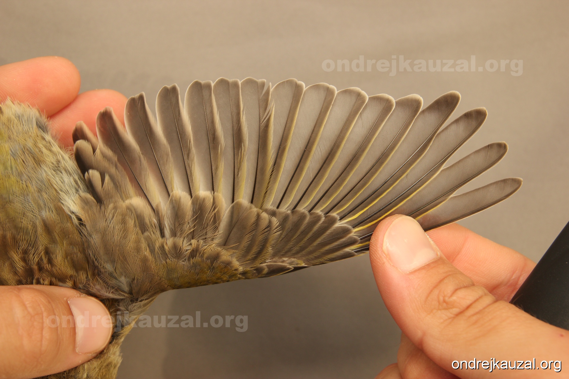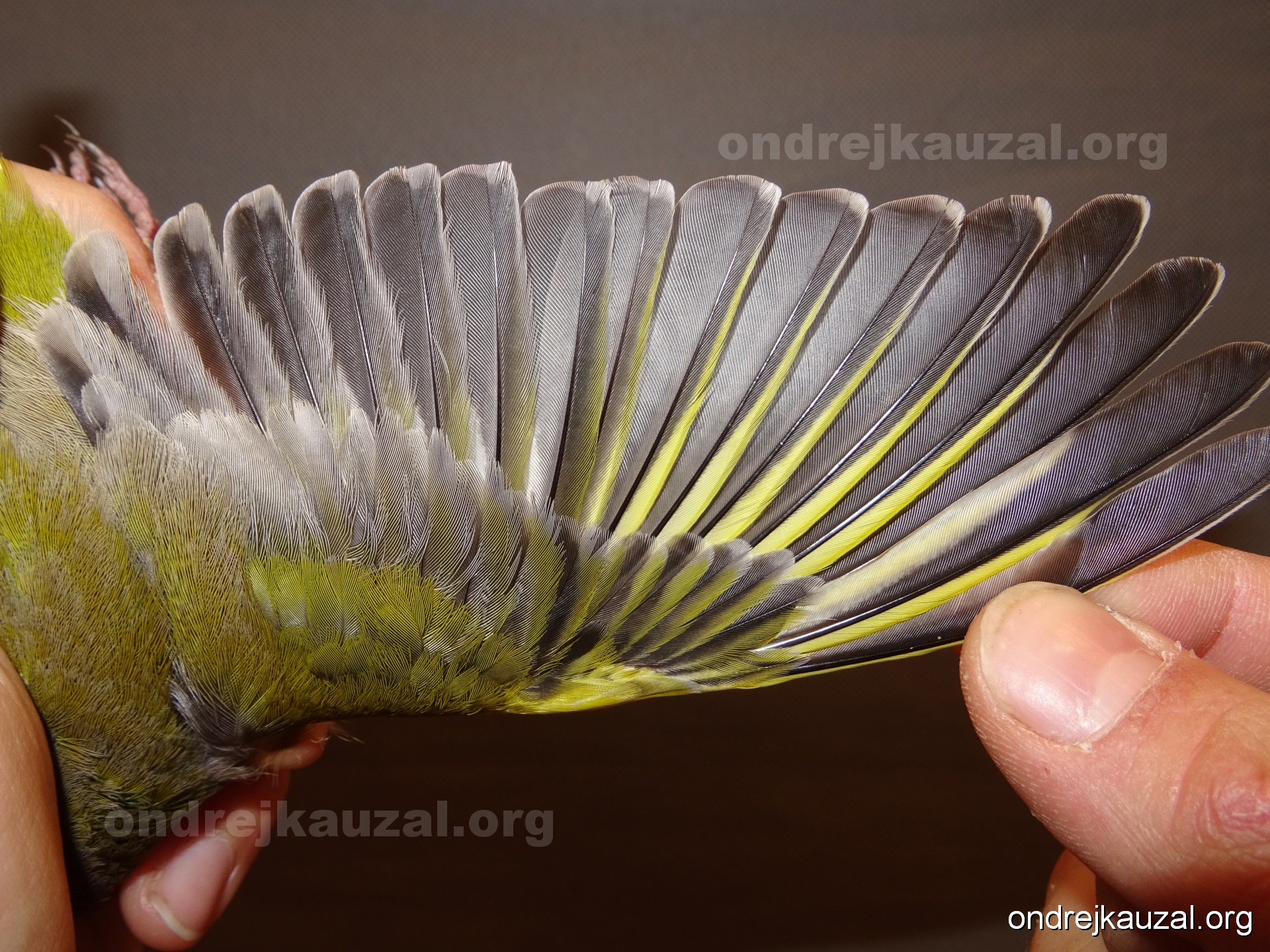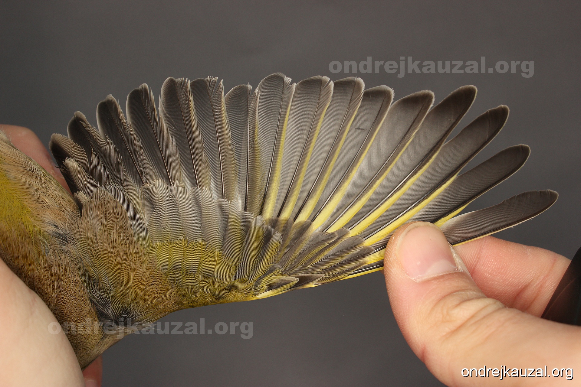 An interesting individual, albeit being in the first year of its life, it has moulted three of its primaries (P5 – P7). Greenfinches occasionally include moult of some primaries during their partial postjuvenile moult.