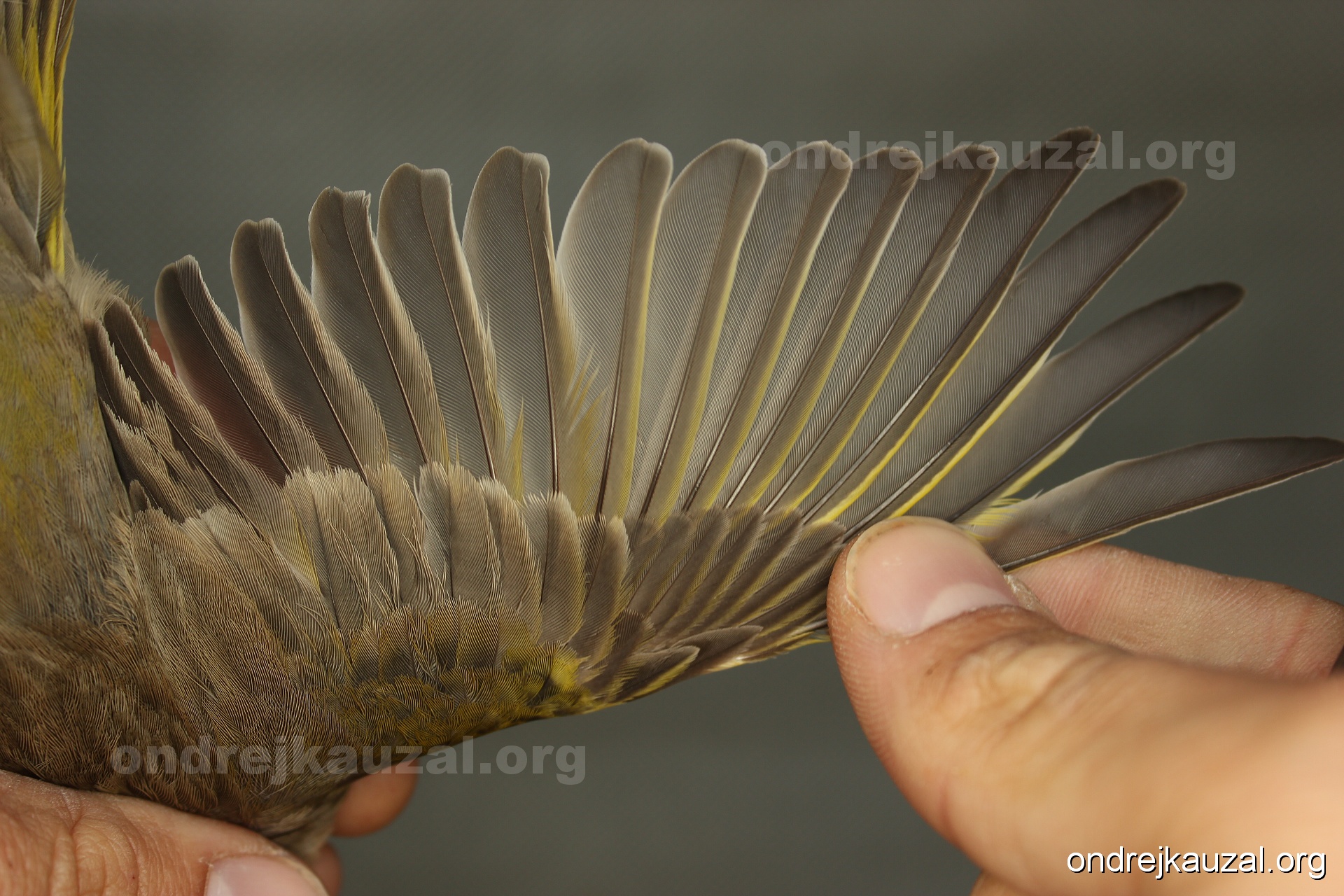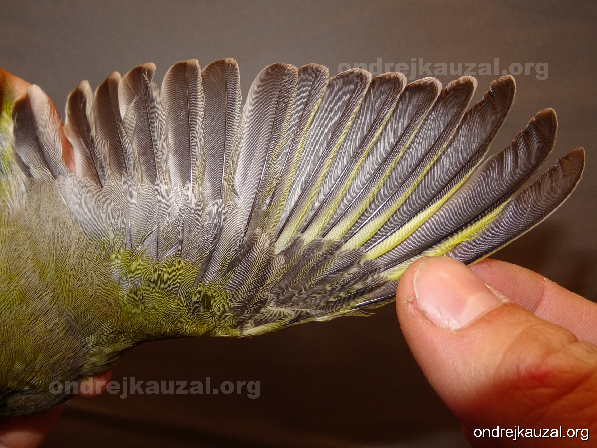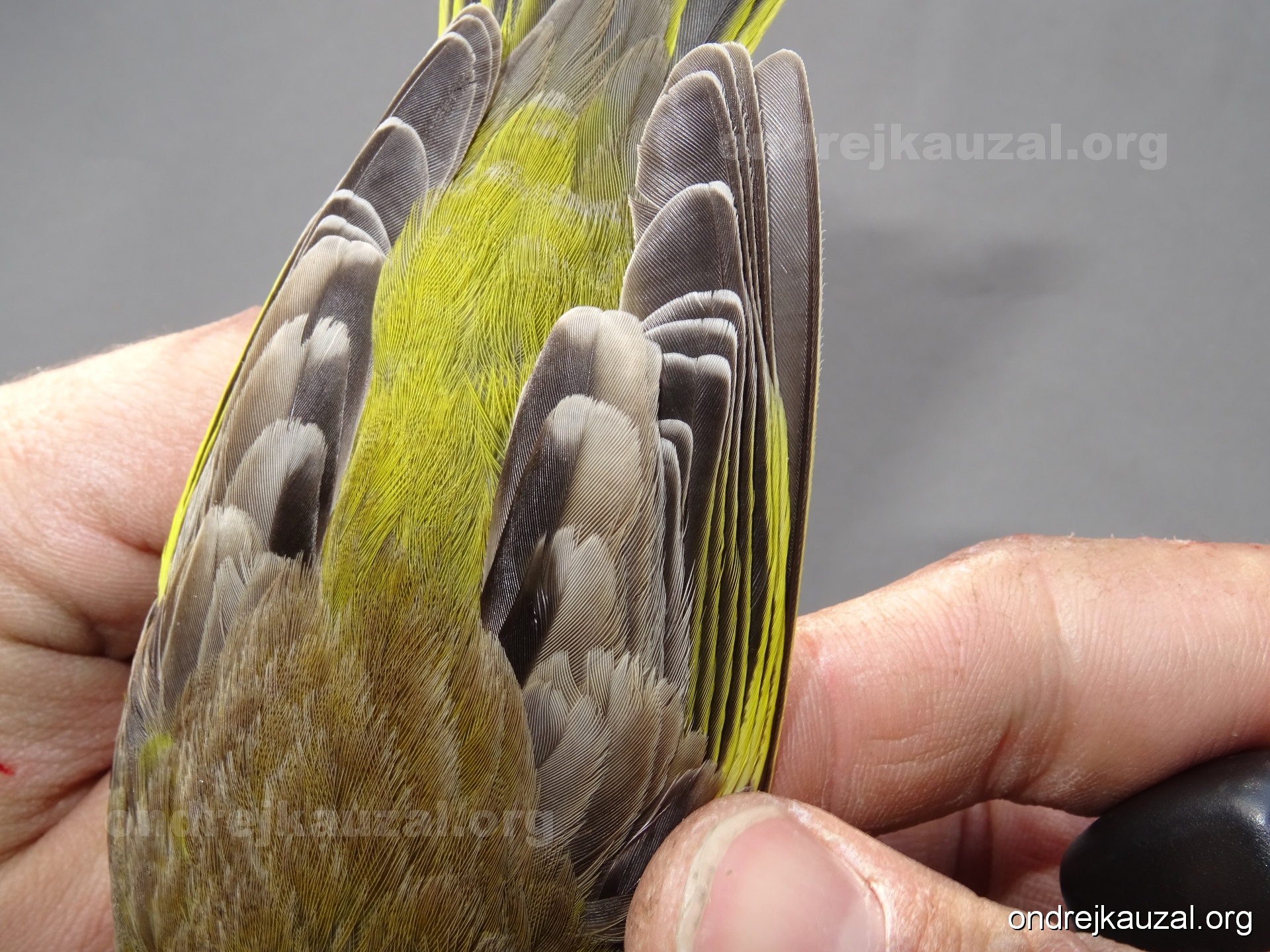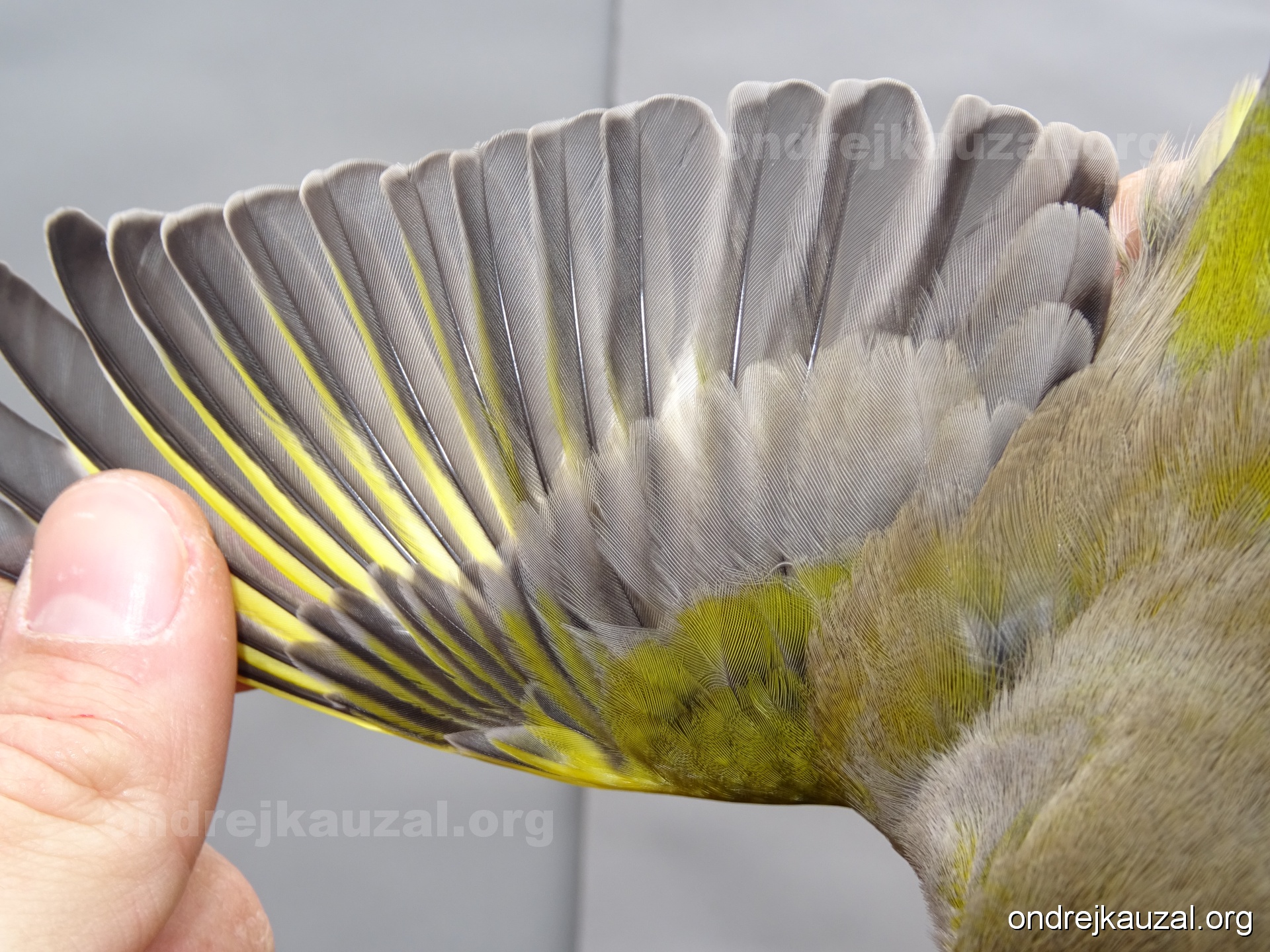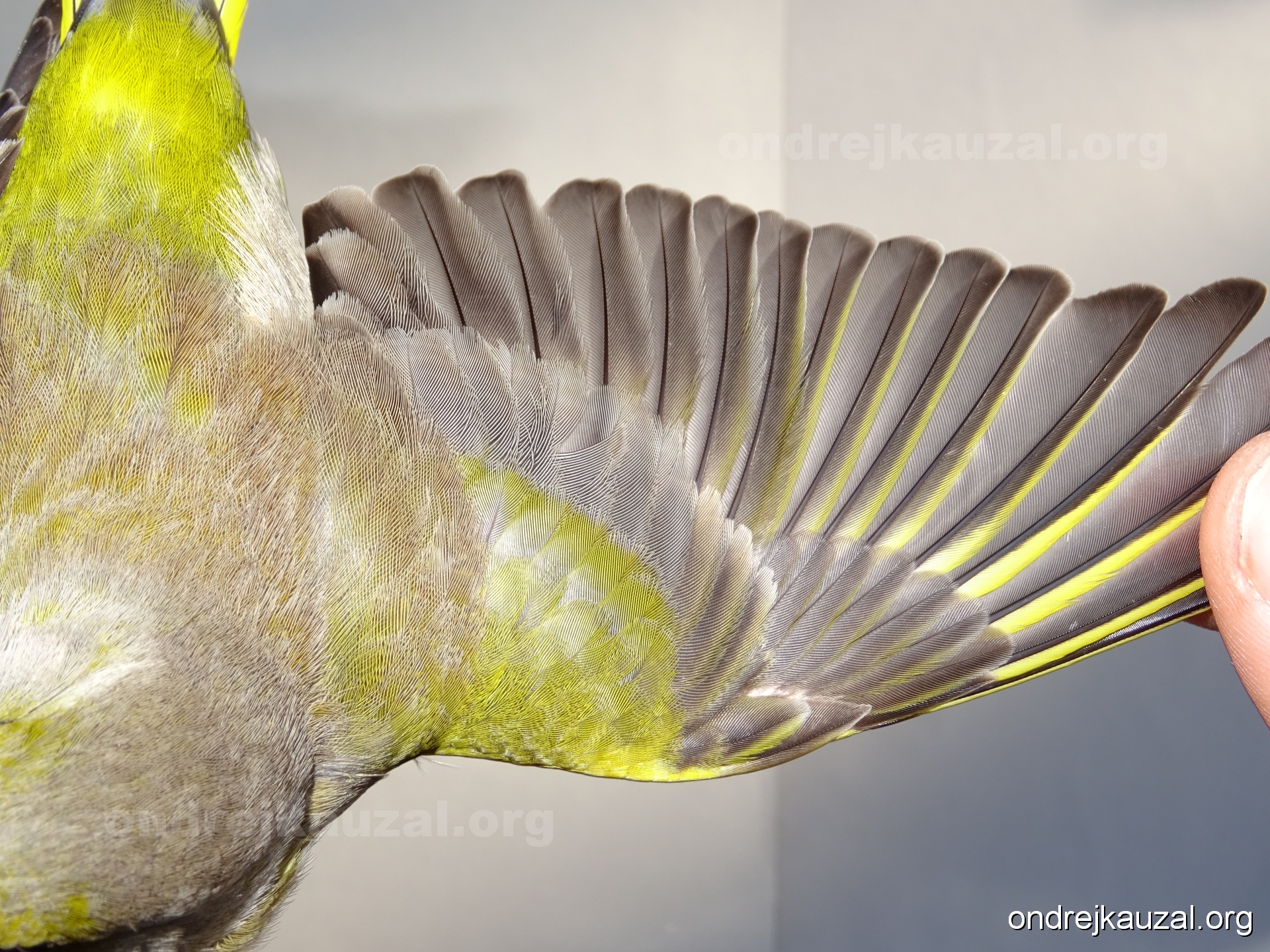 An interesting individual, albeit being in the first year of its life, it has moulted three of its primaries (P5 – P7). Greenfinches occasionally include moult of some primaries during their partial postjuvenile moult.