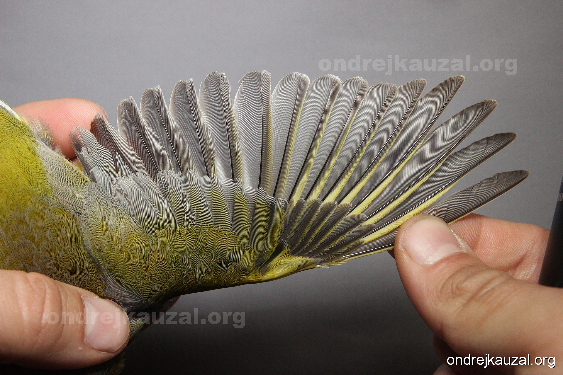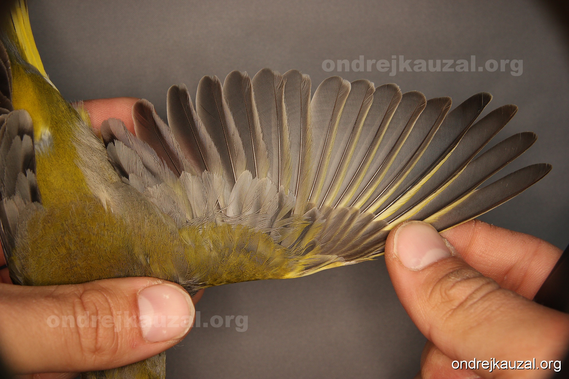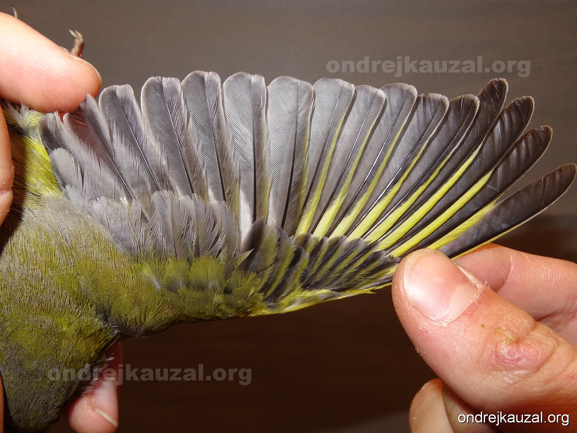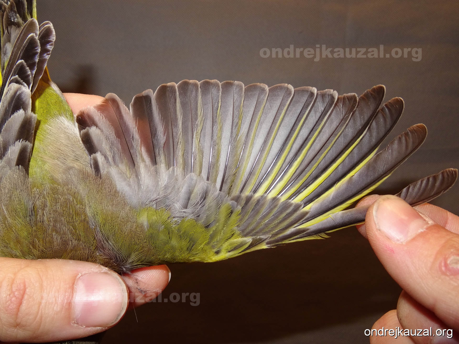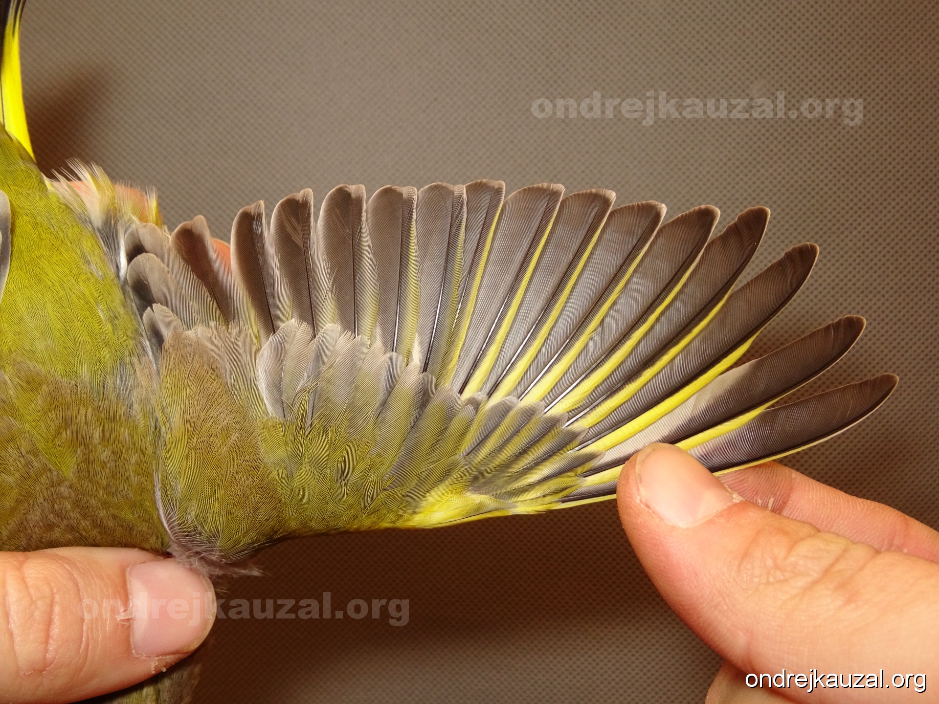 An interesting individual, albeit being in the first year of its life, it has moulted three of its primaries (P5 – P7). Greenfinches occasionally include moult of some primaries during their partial postjuvenile moult.