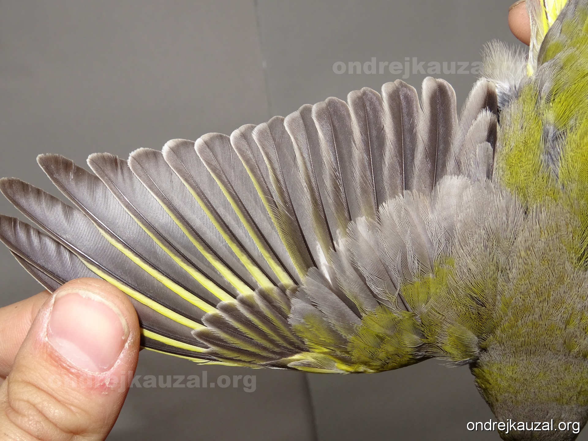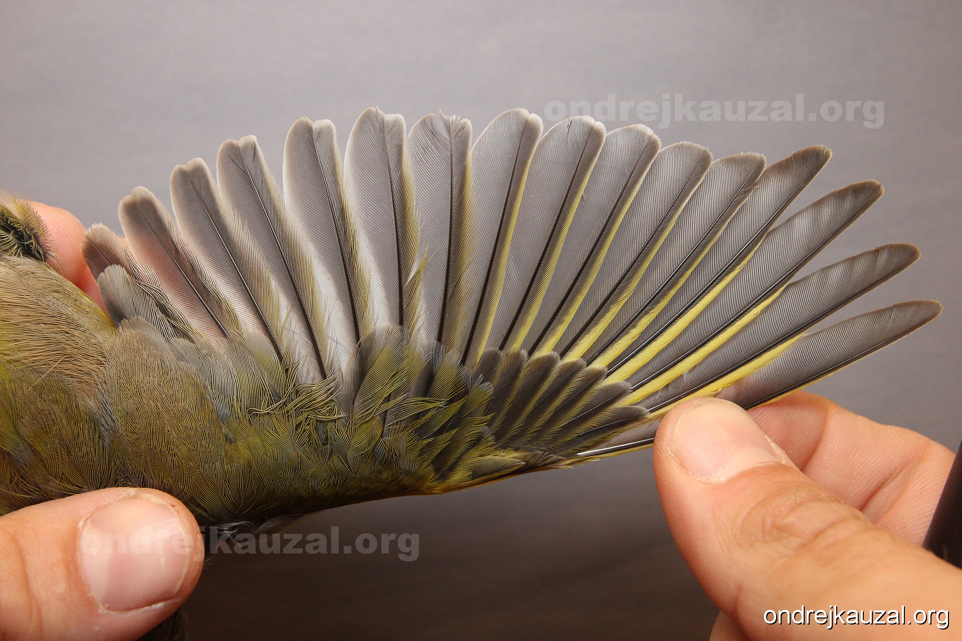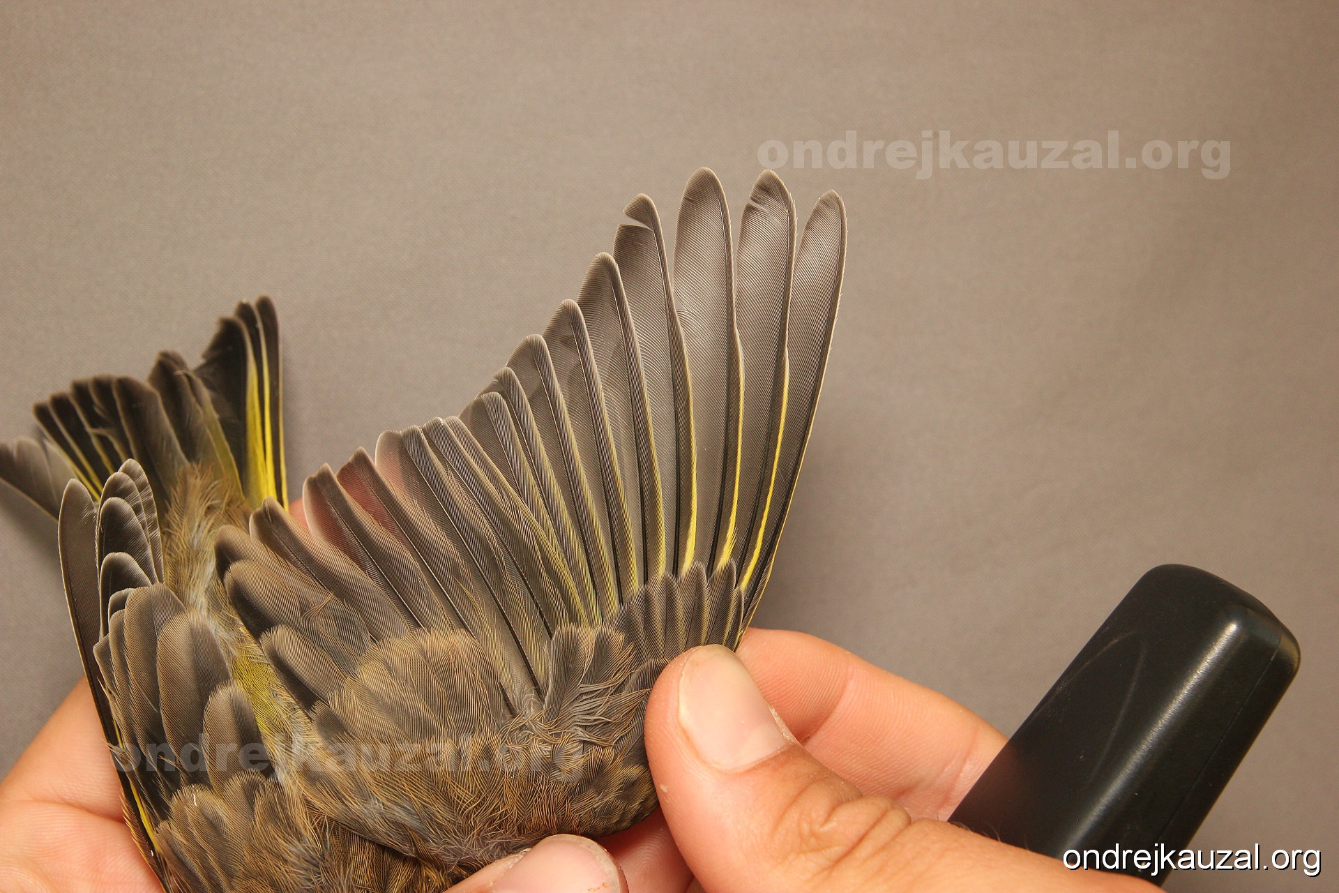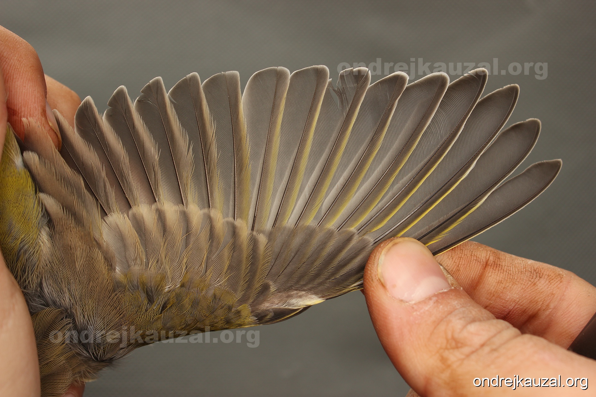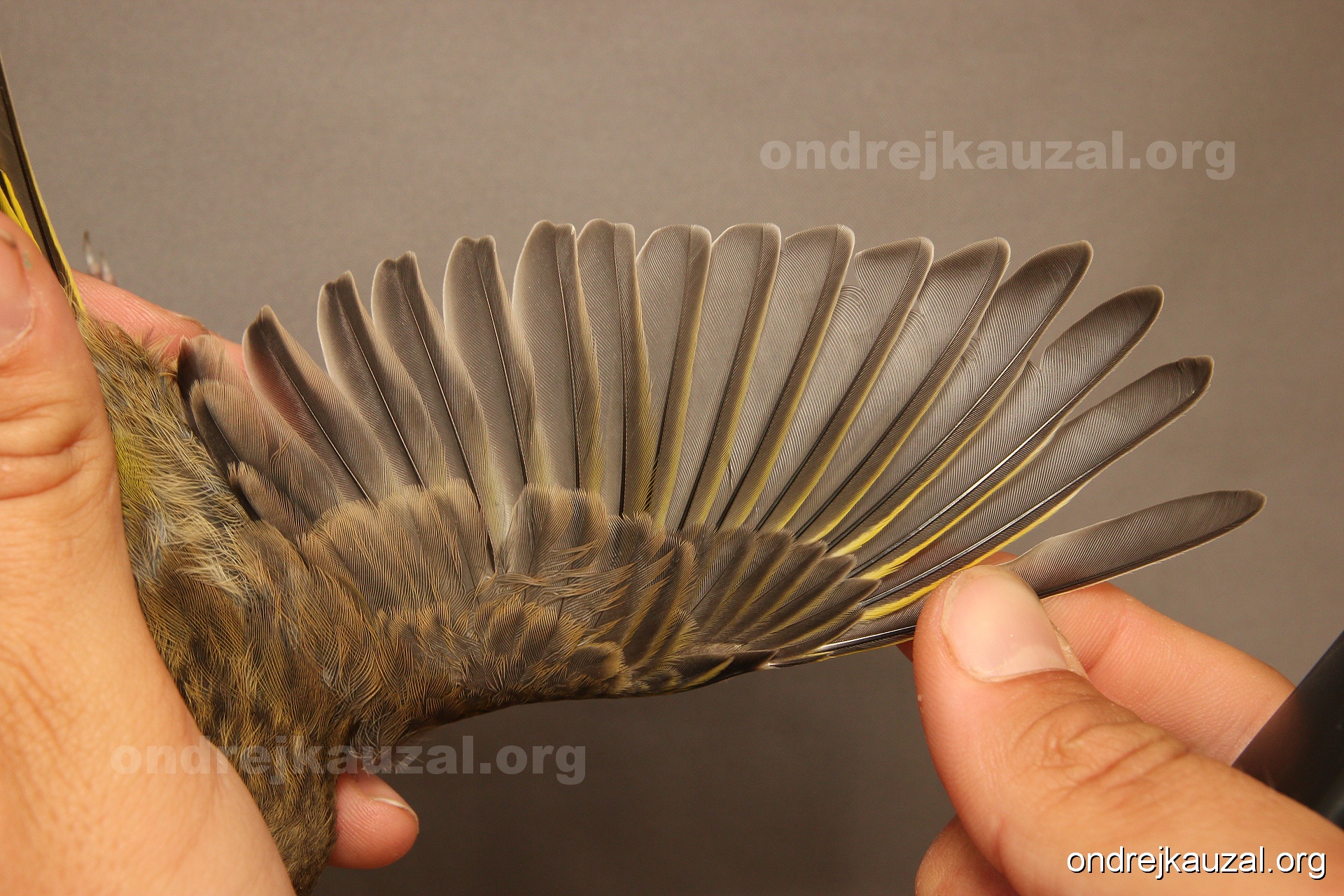 An interesting individual, albeit being in the first year of its life, it has moulted three of its primaries (P5 – P7). Greenfinches occasionally include moult of some primaries during their partial postjuvenile moult.
