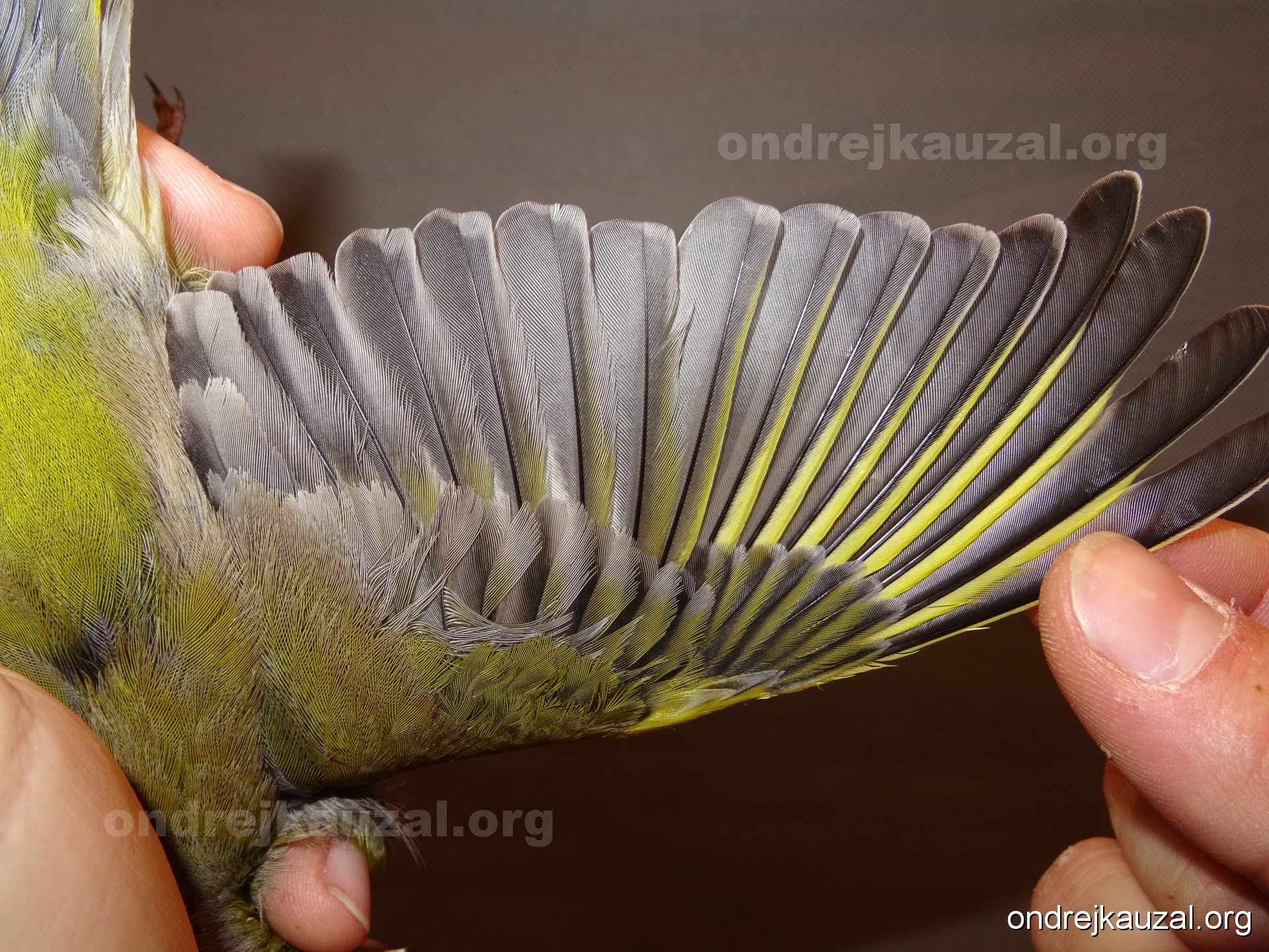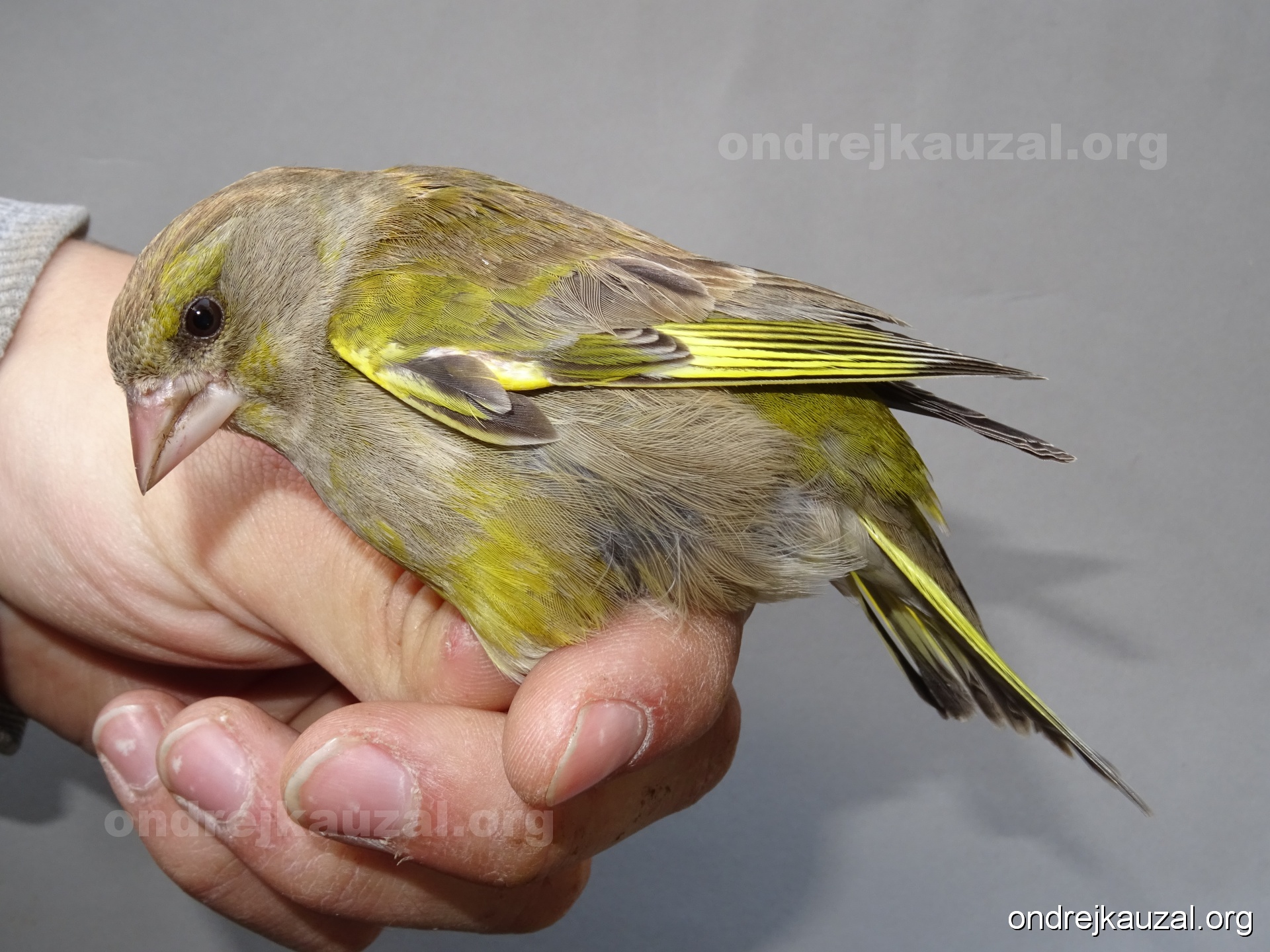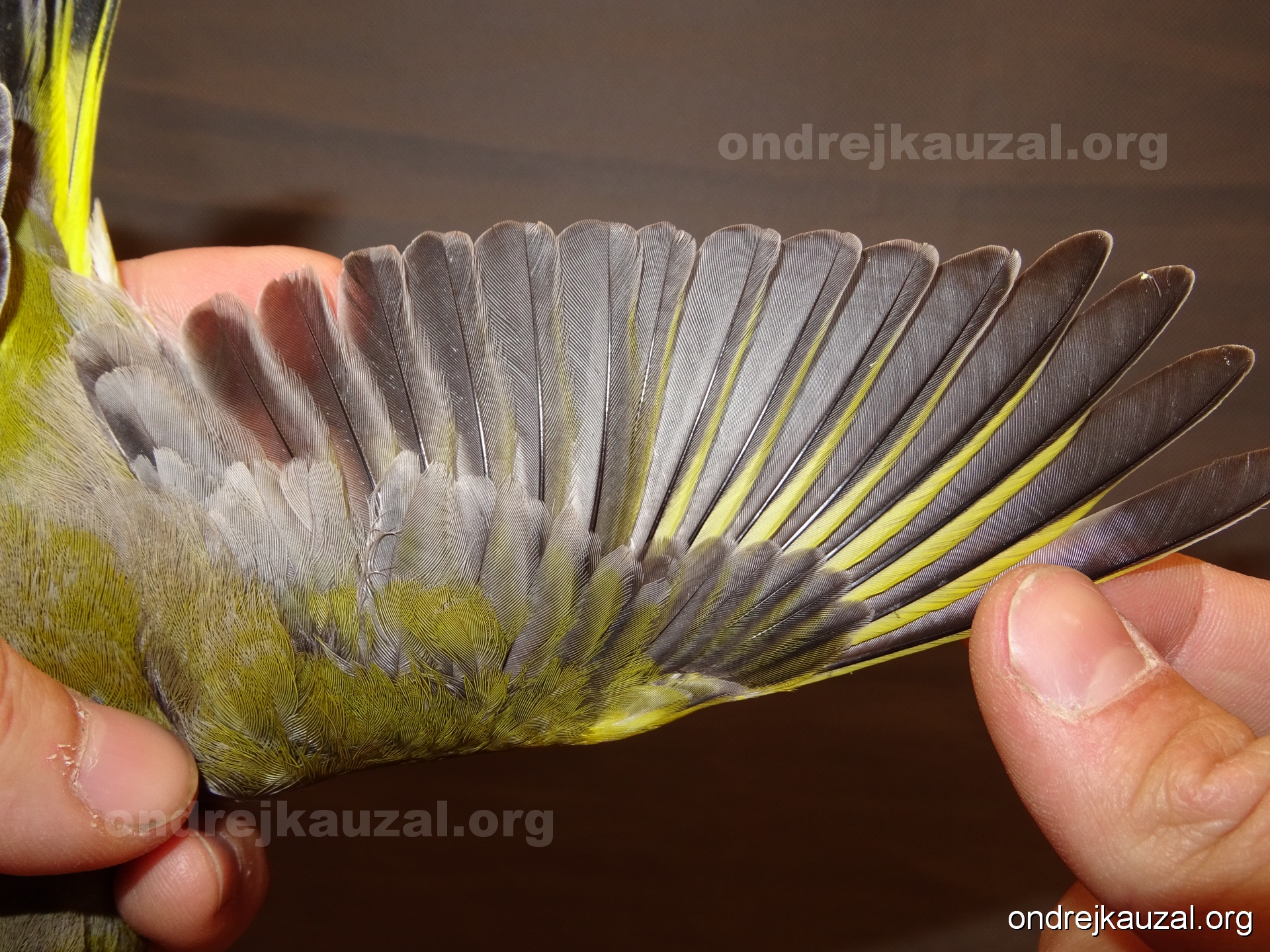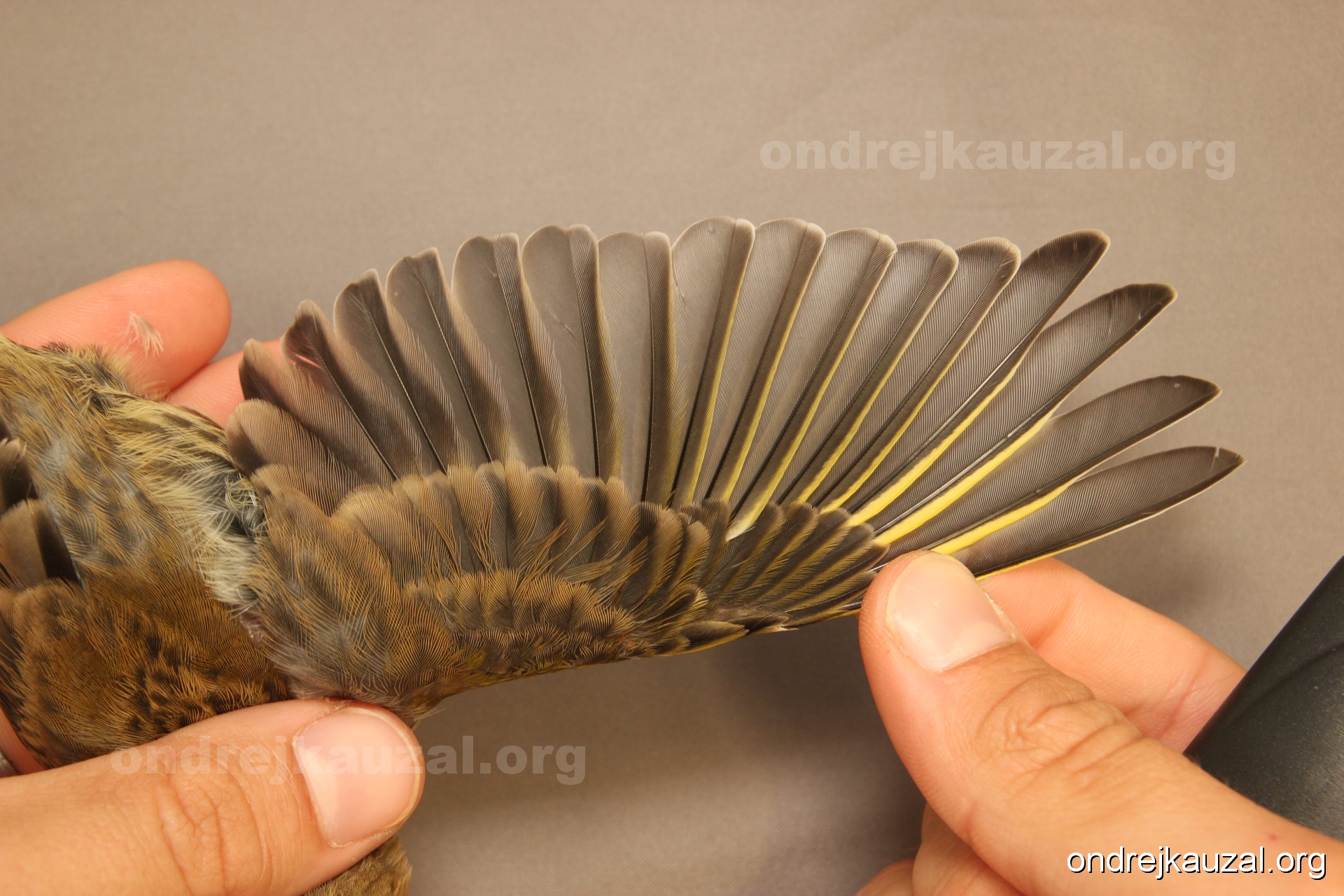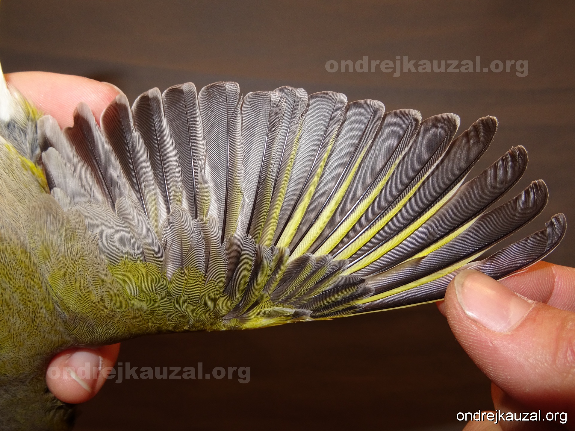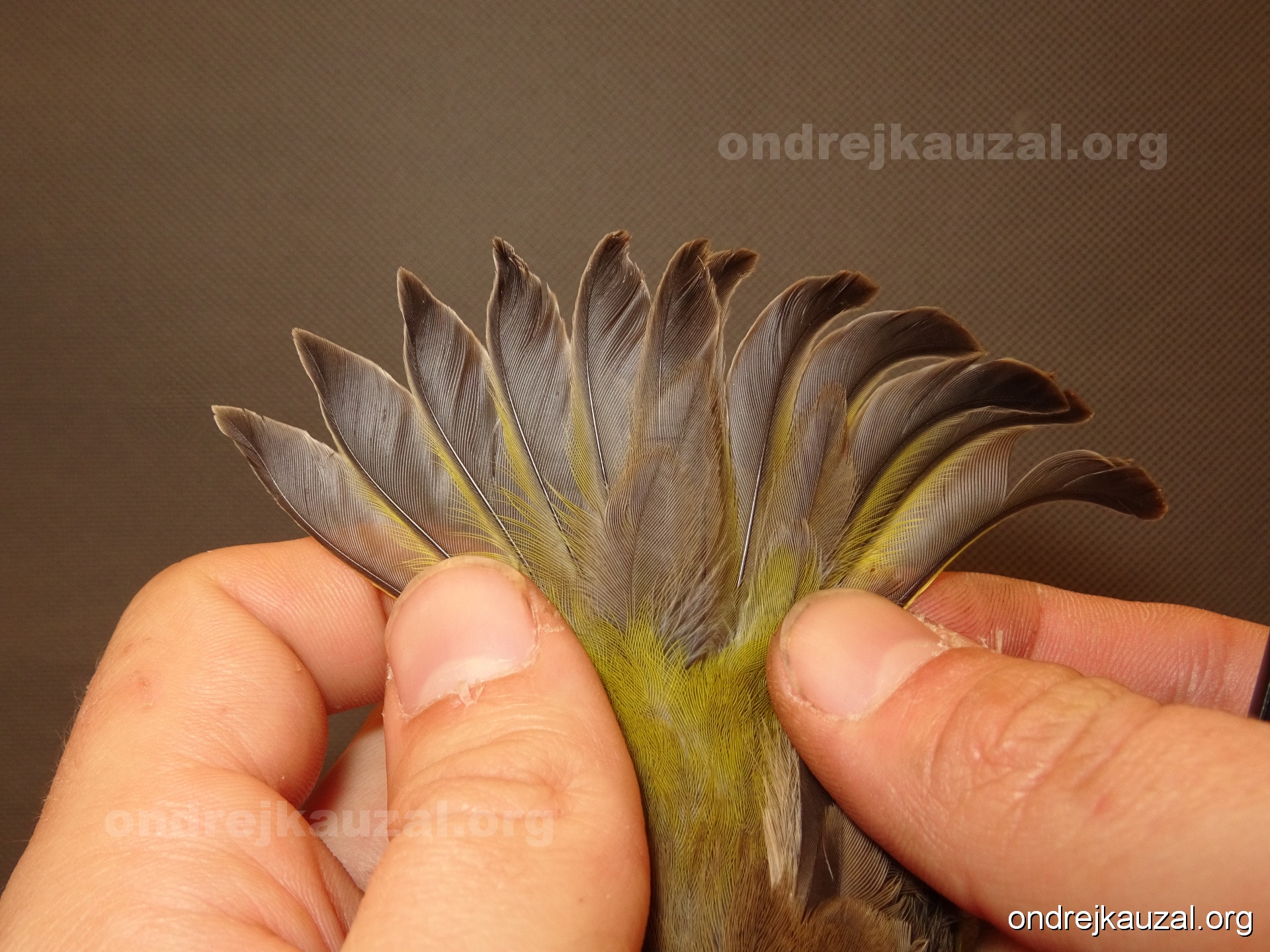 An interesting individual, albeit being in the first year of its life, it has moulted three of its primaries (P5 – P7). Greenfinches occasionally include moult of some primaries during their partial postjuvenile moult.