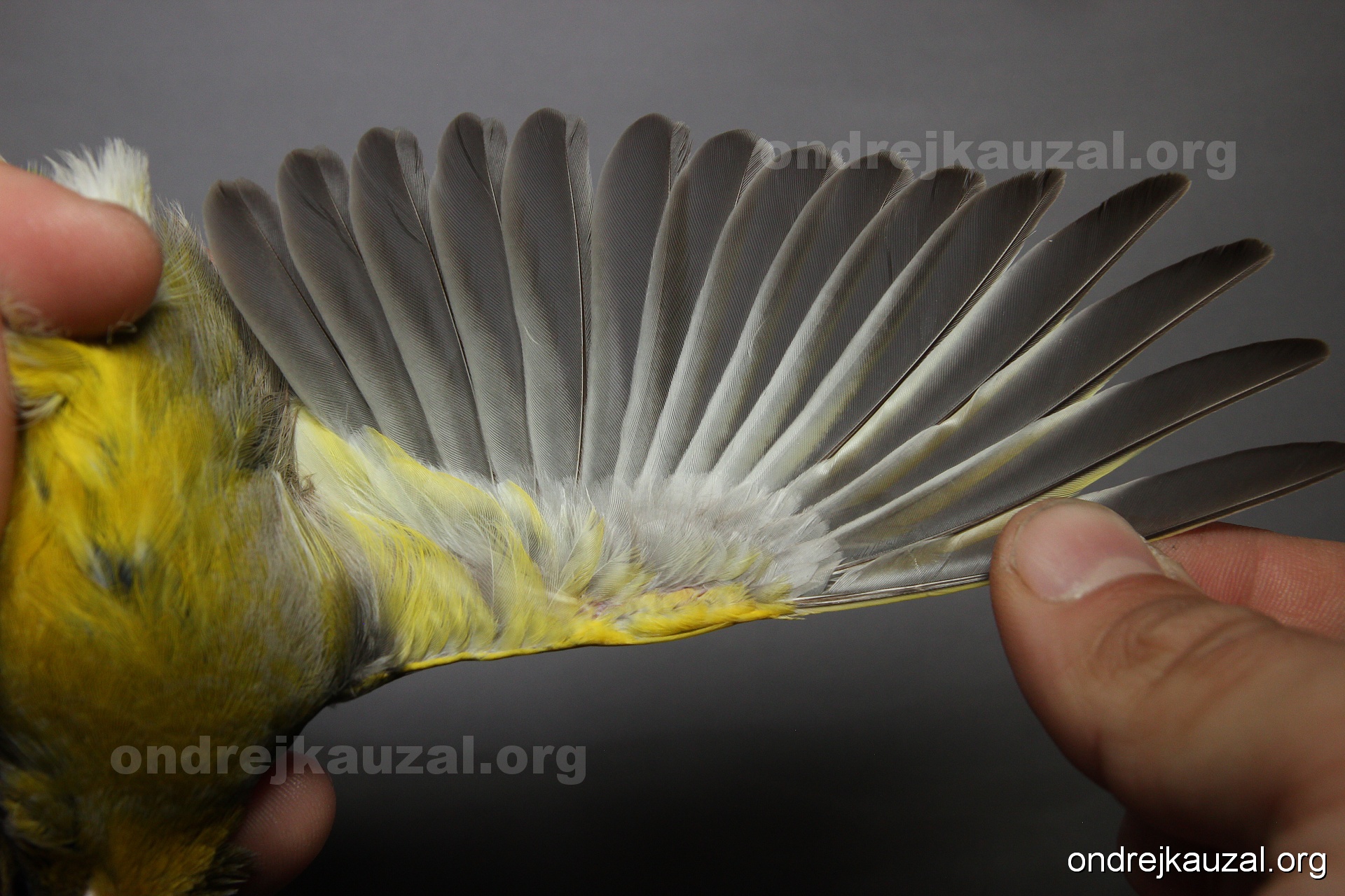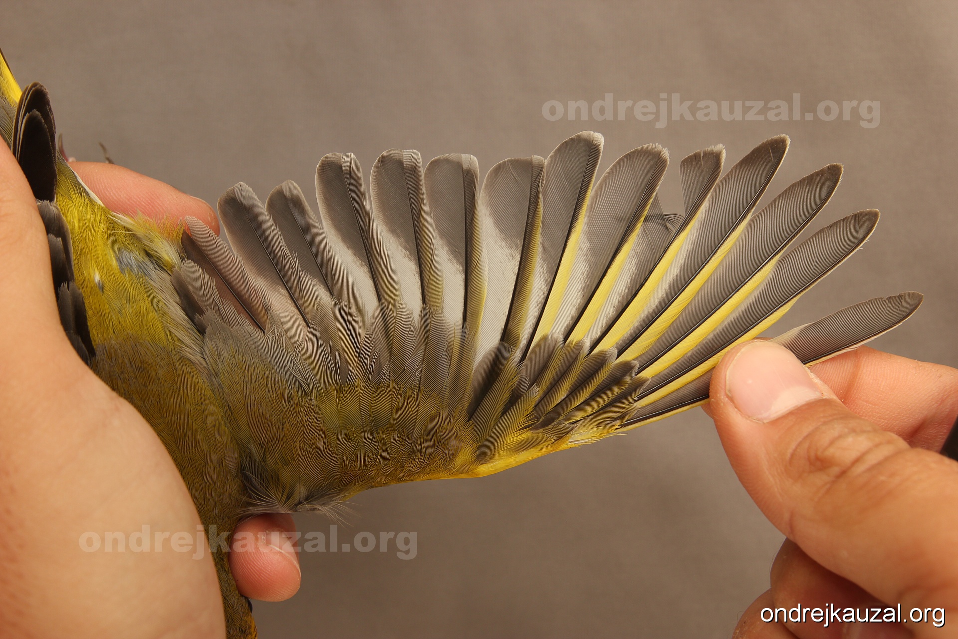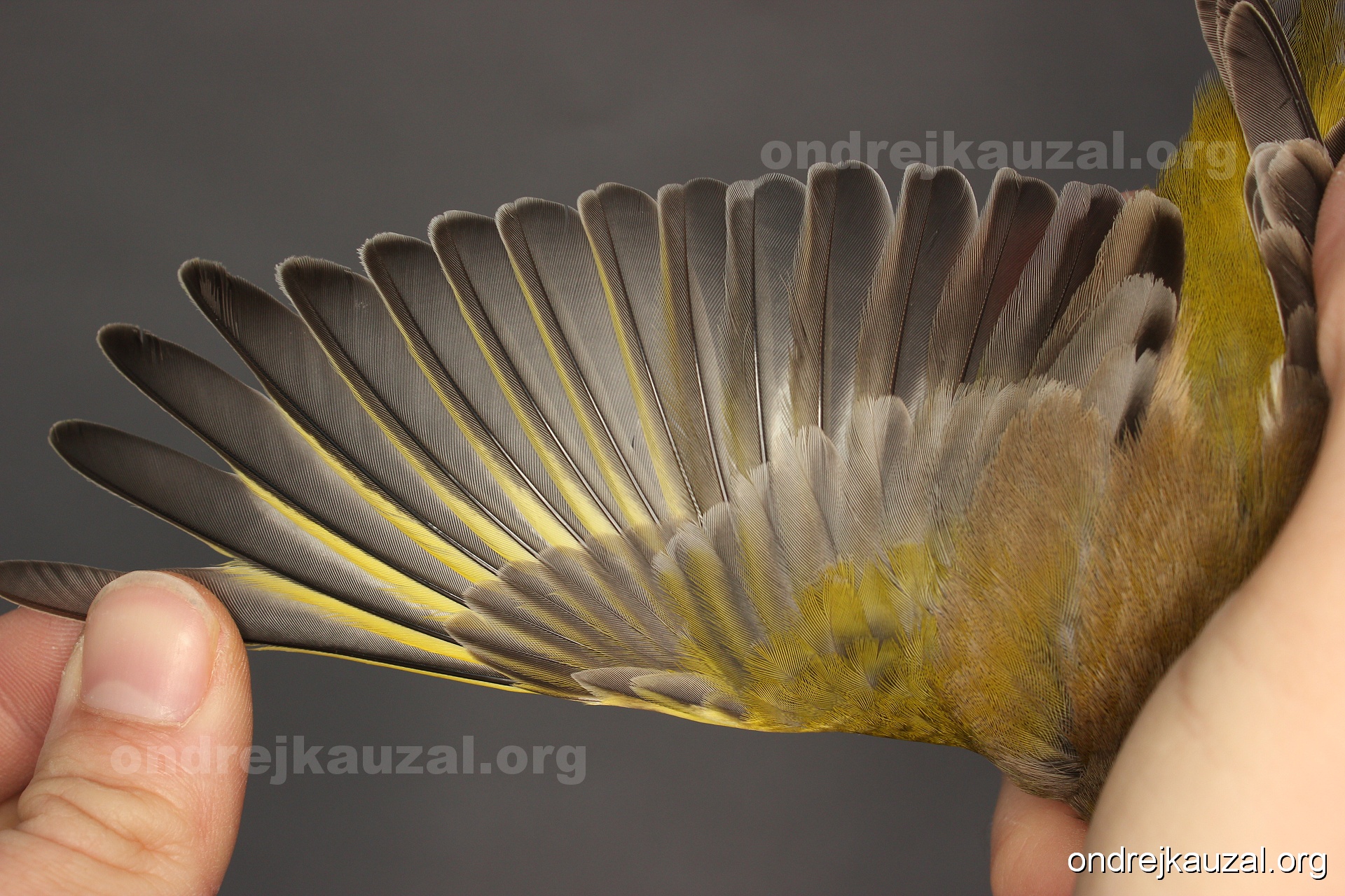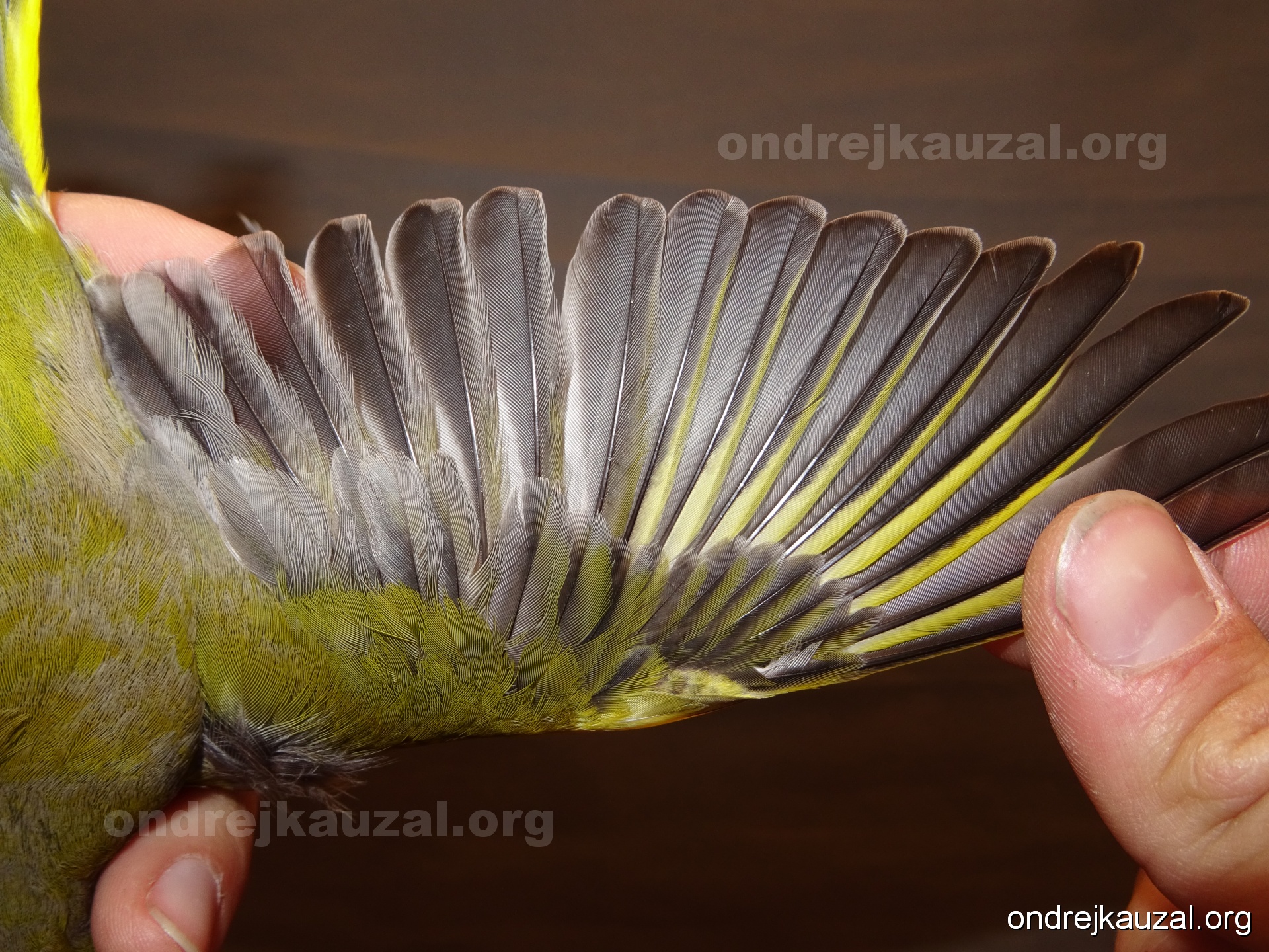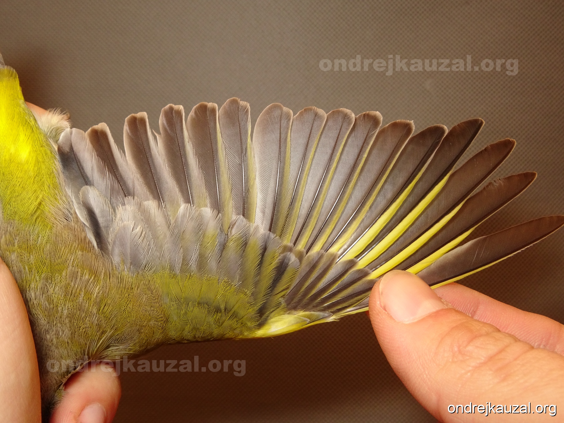 An interesting individual, albeit being in the first year of its life, it has moulted three of its primaries (P5 – P7). Greenfinches occasionally include moult of some primaries during their partial postjuvenile moult.