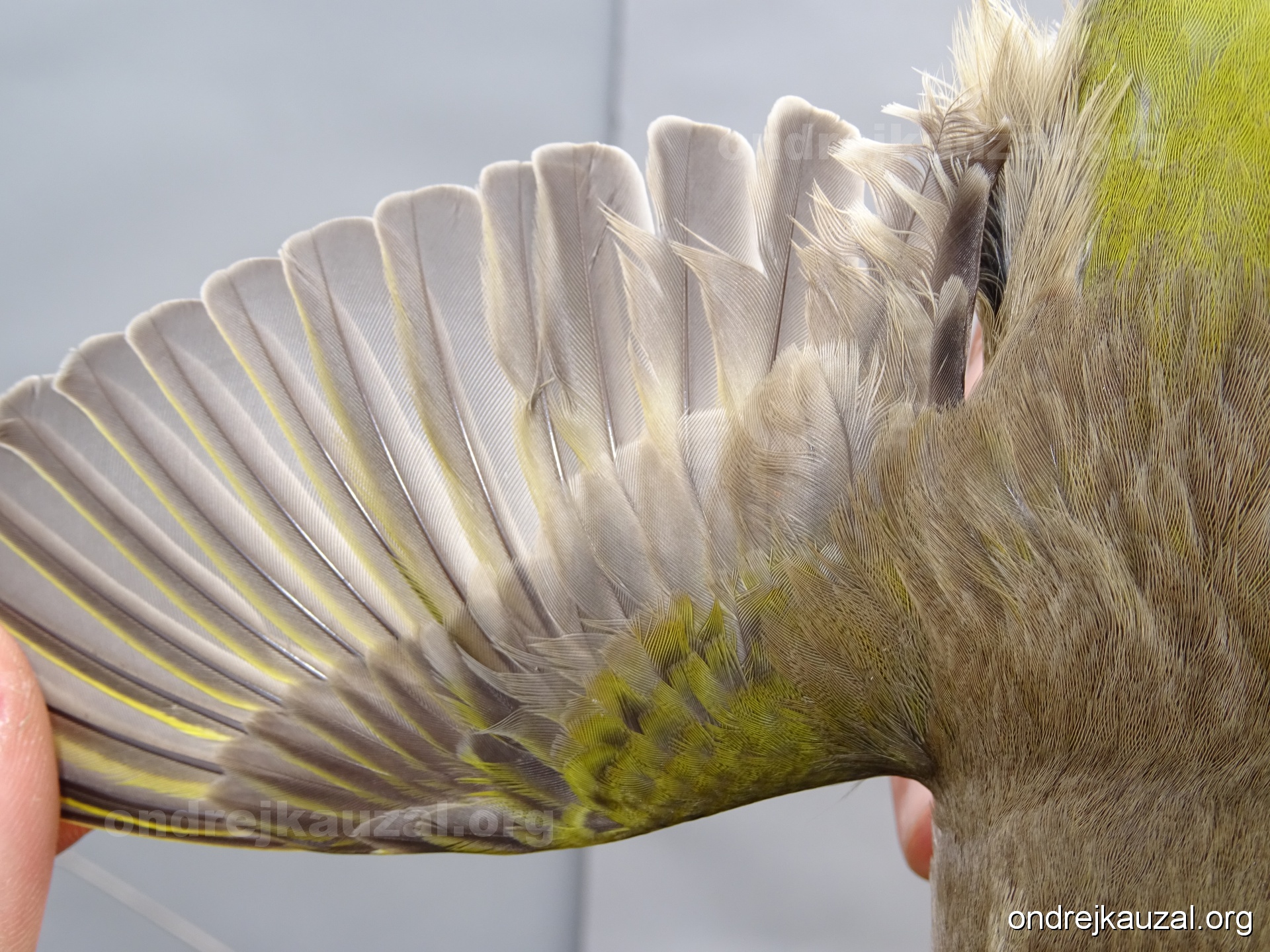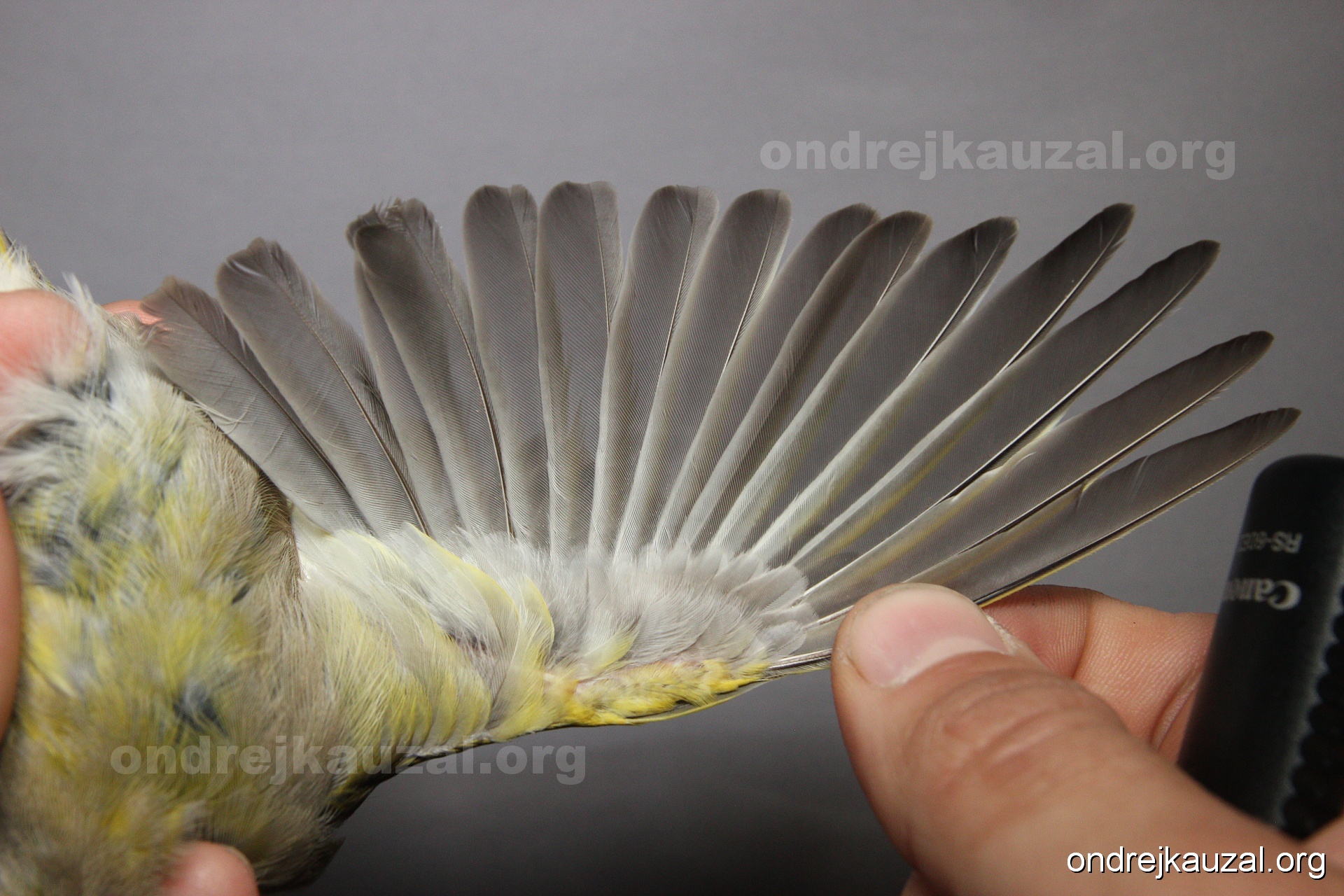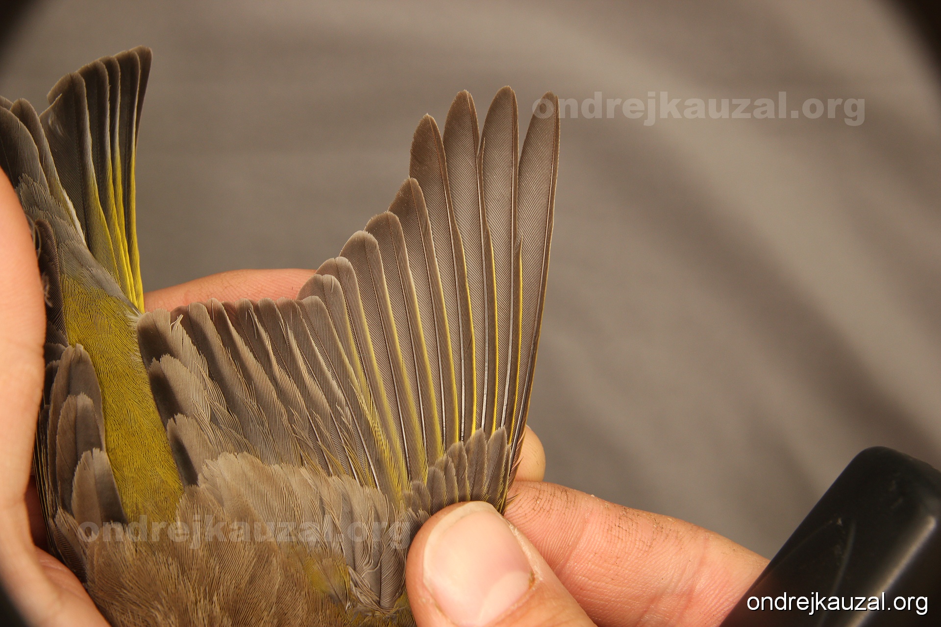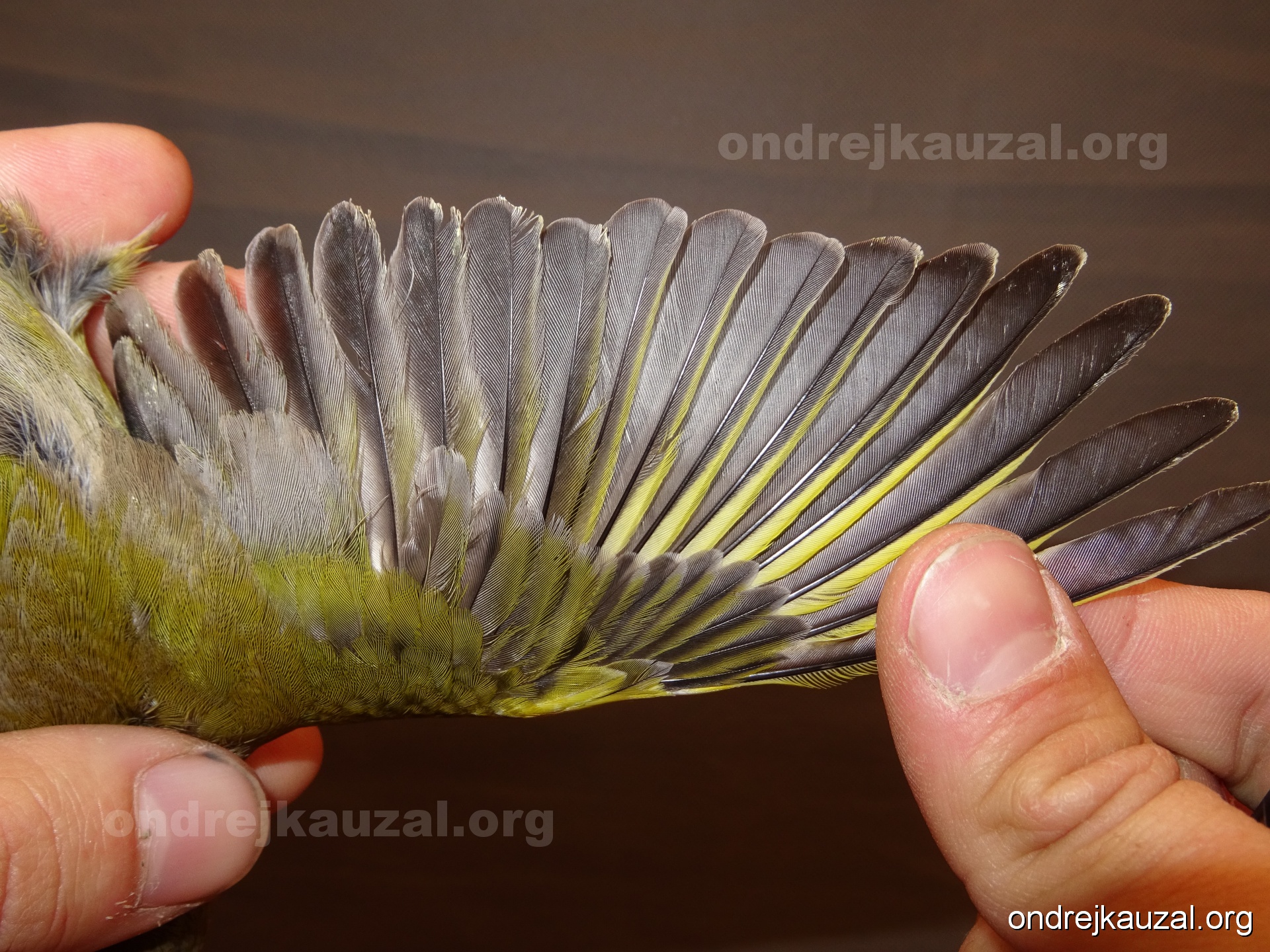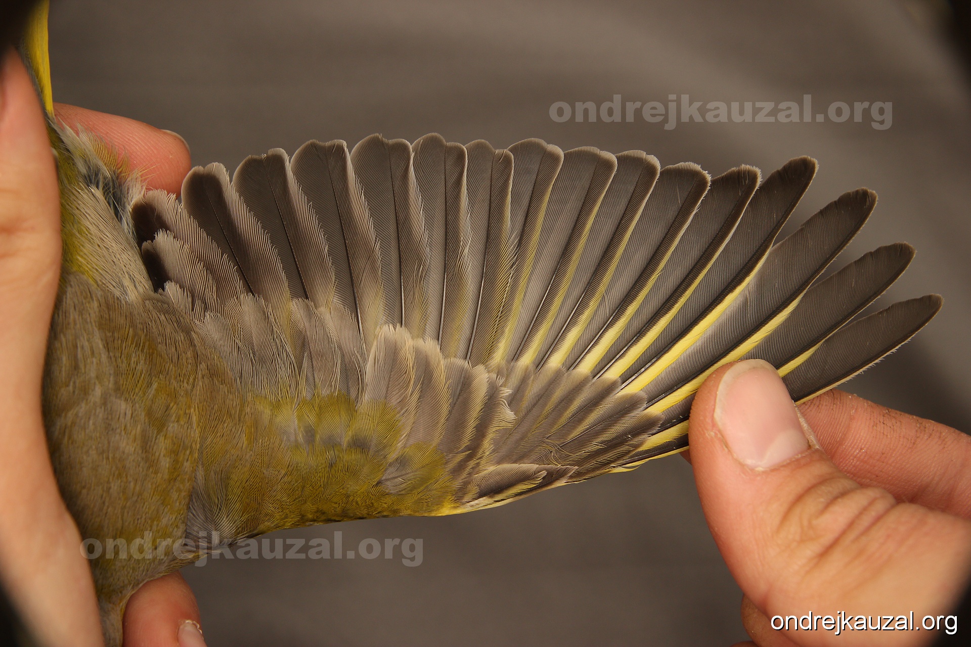 An interesting individual, albeit being in the first year of its life, it has moulted three of its primaries (P5 – P7). Greenfinches occasionally include moult of some primaries during their partial postjuvenile moult.