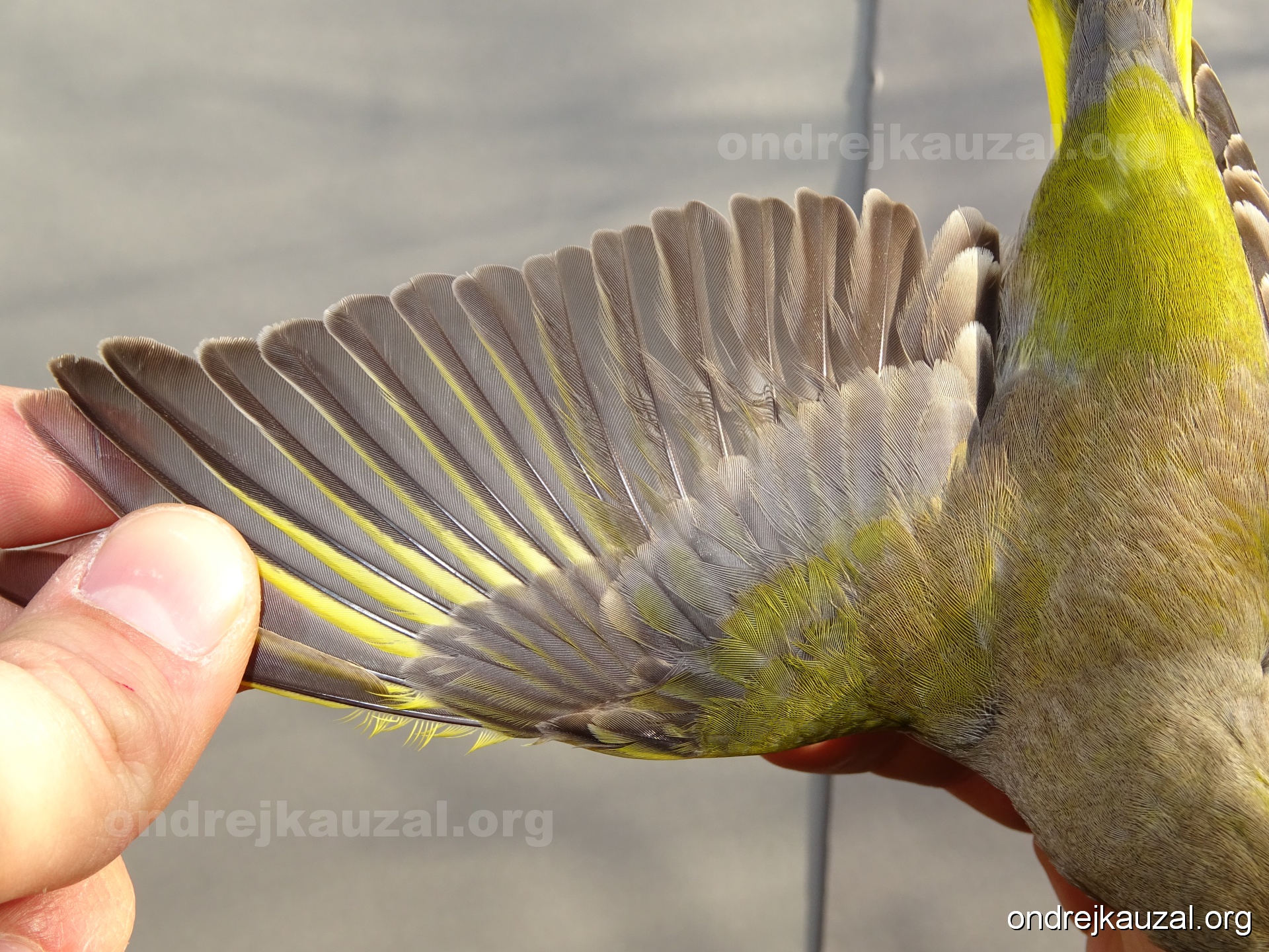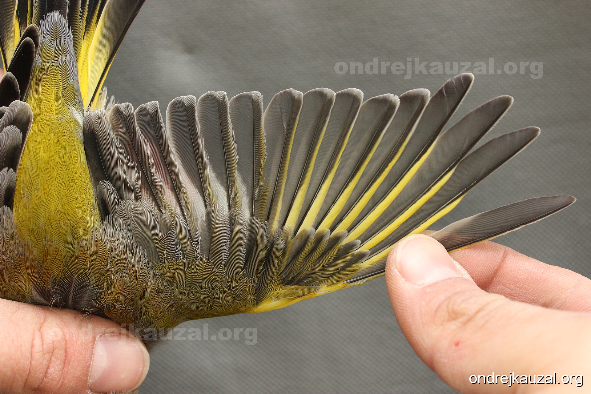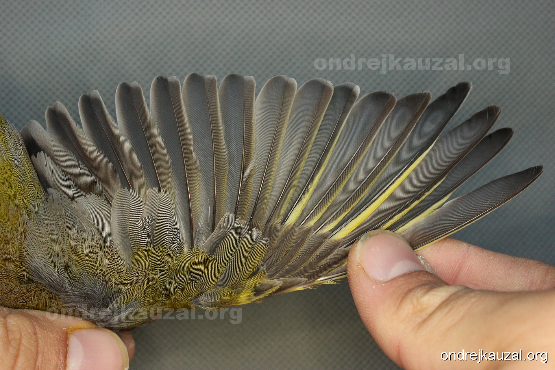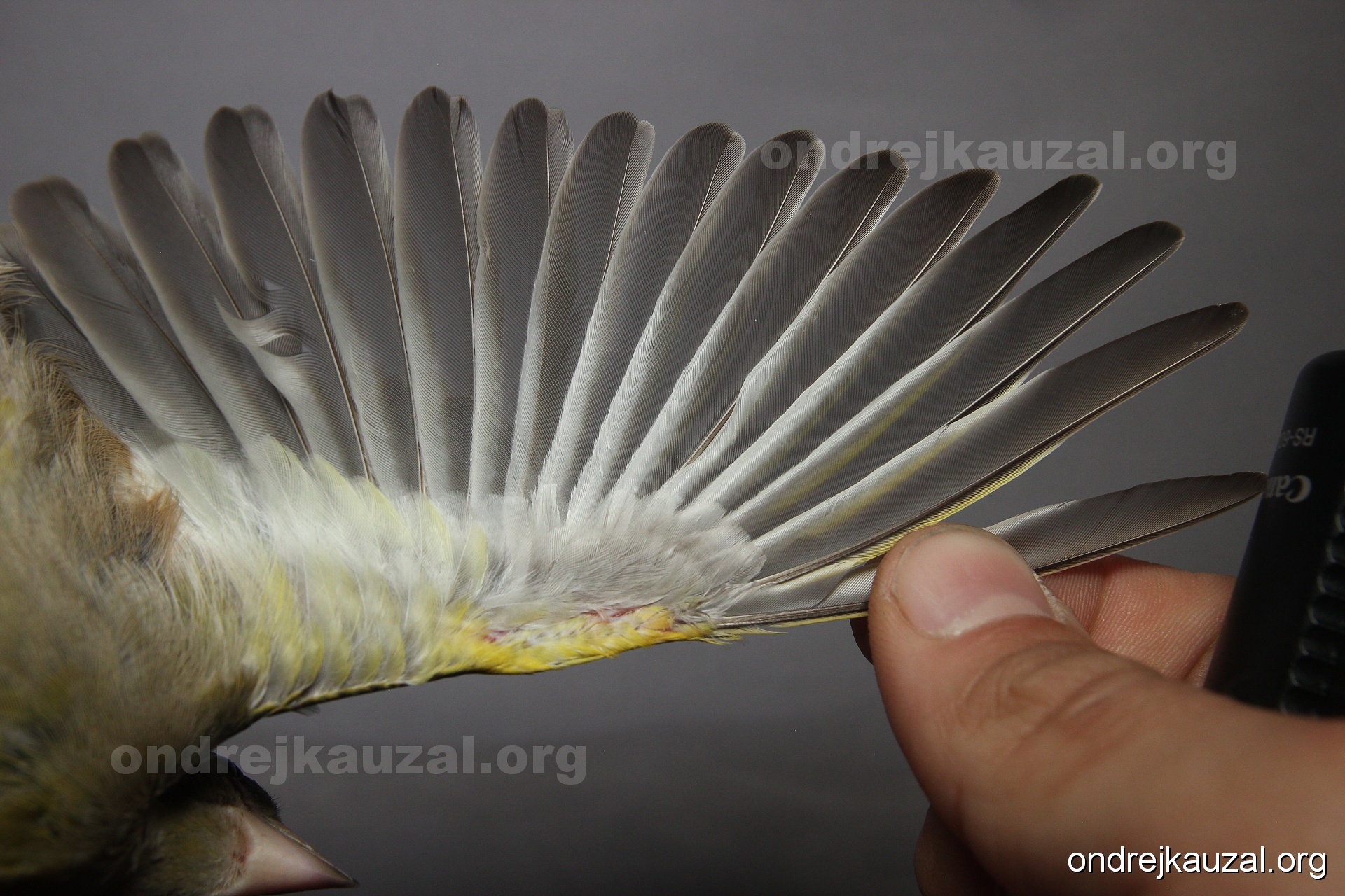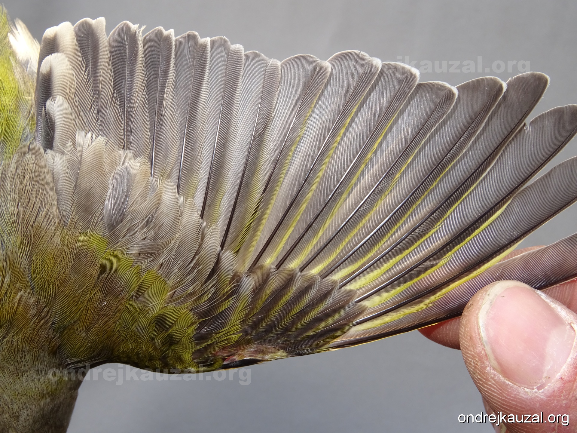 An interesting individual, albeit being in the first year of its life, it has moulted three of its primaries (P5 – P7). Greenfinches occasionally include moult of some primaries during their partial postjuvenile moult.