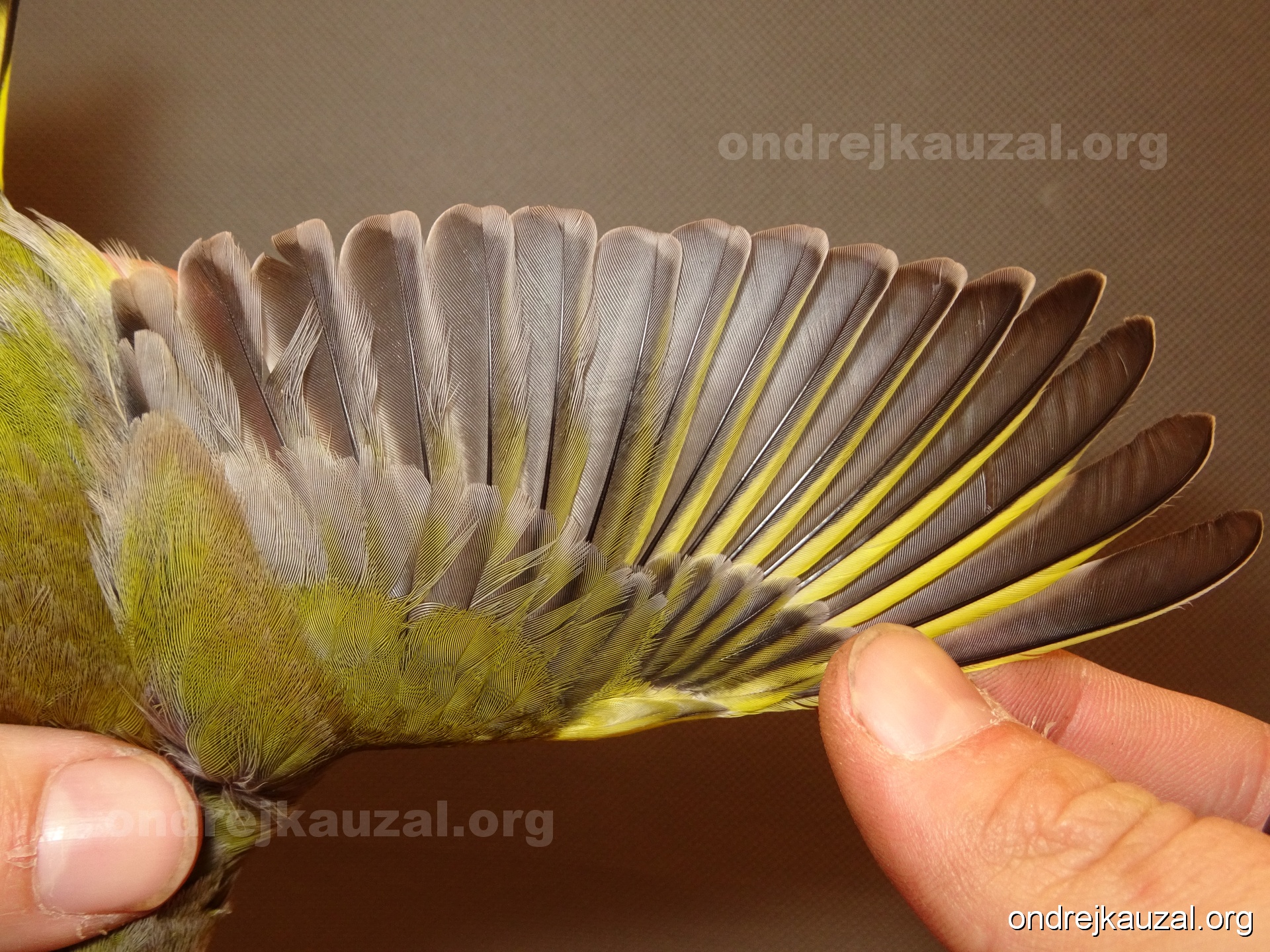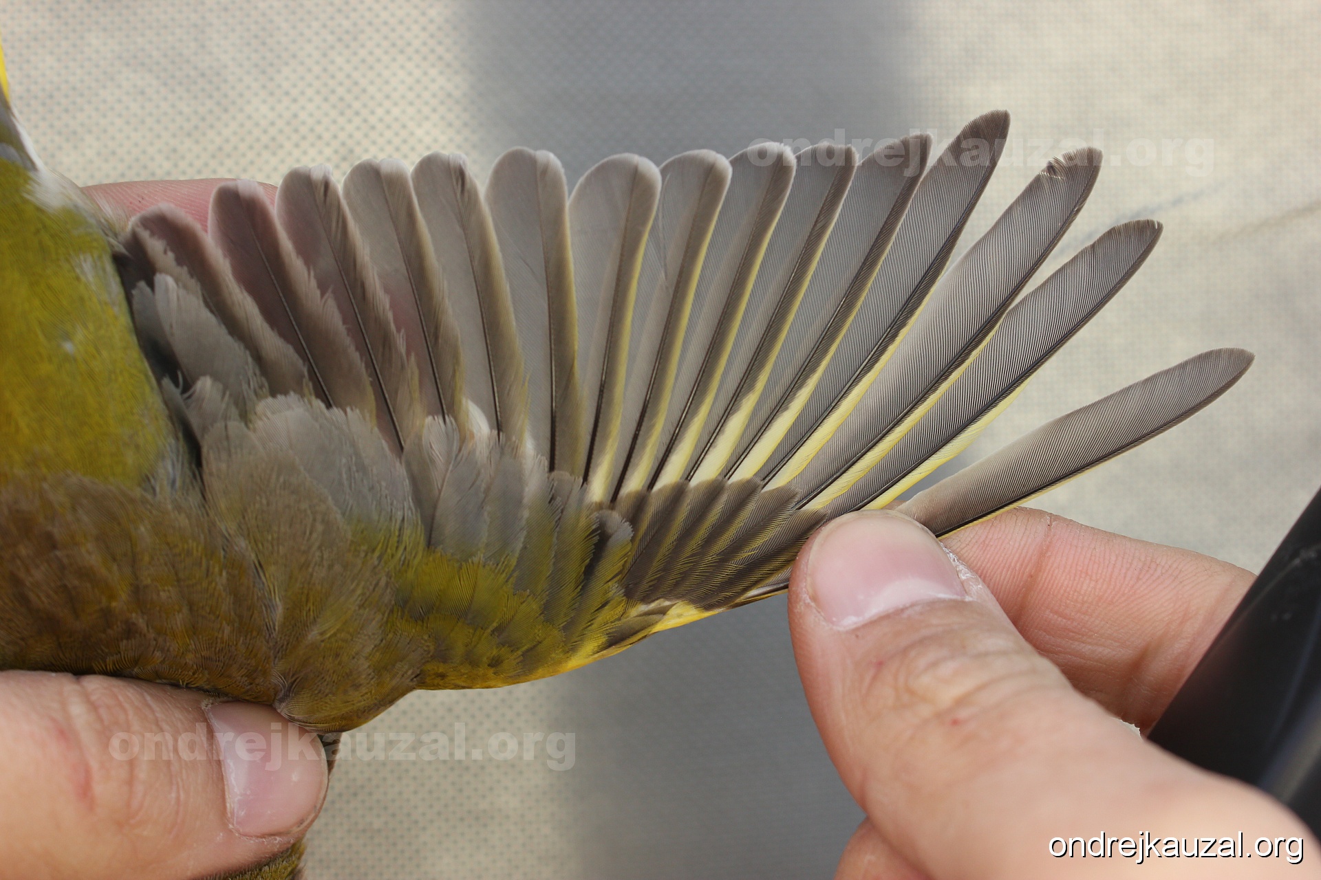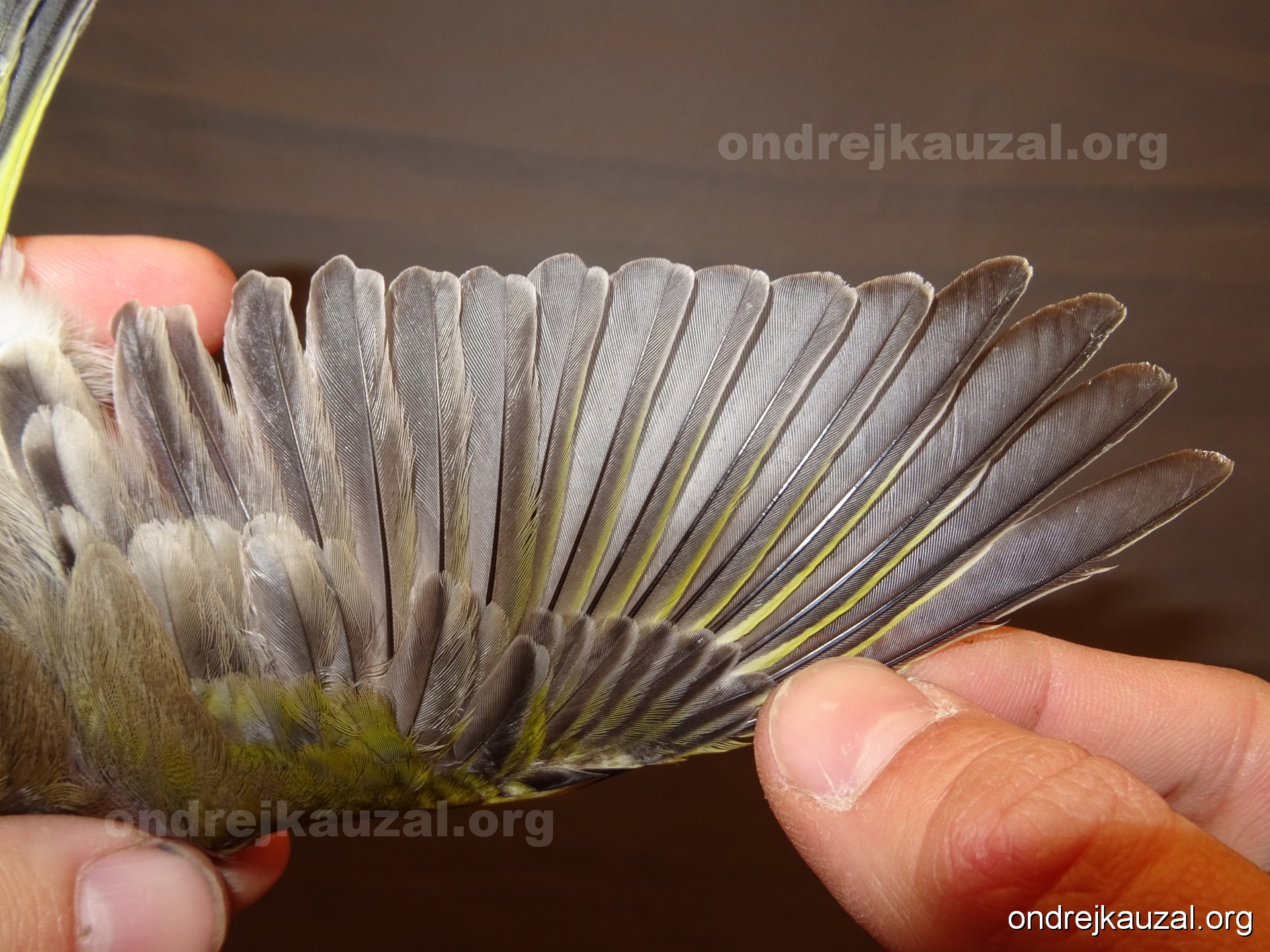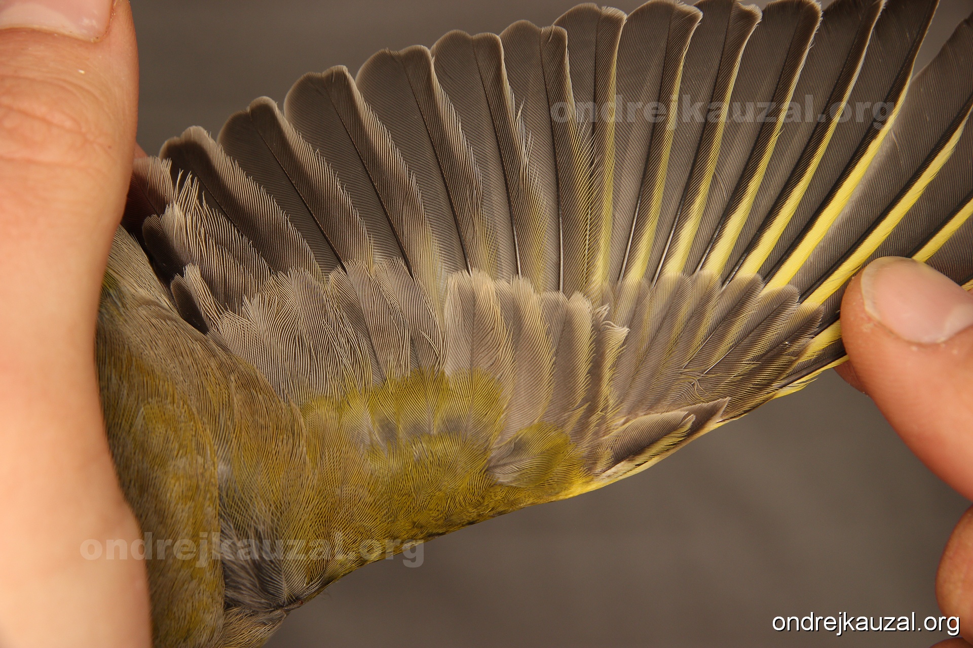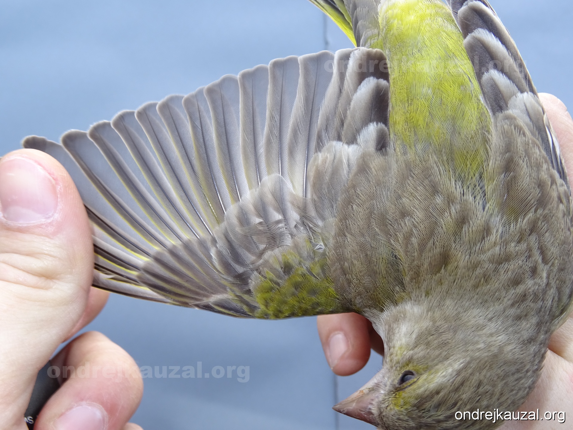 An interesting individual, albeit being in the first year of its life, it has moulted three of its primaries (P5 – P7). Greenfinches occasionally include moult of some primaries during their partial postjuvenile moult.