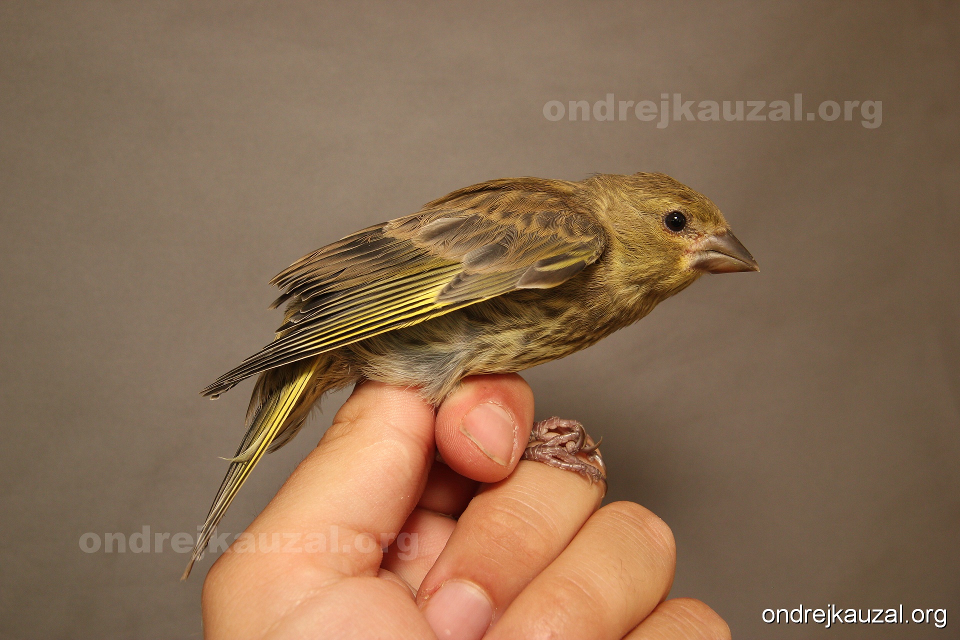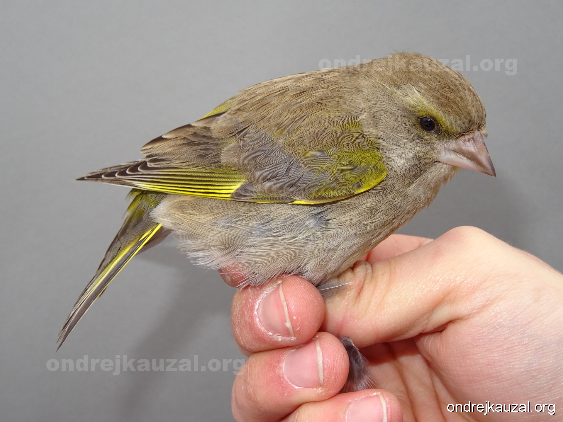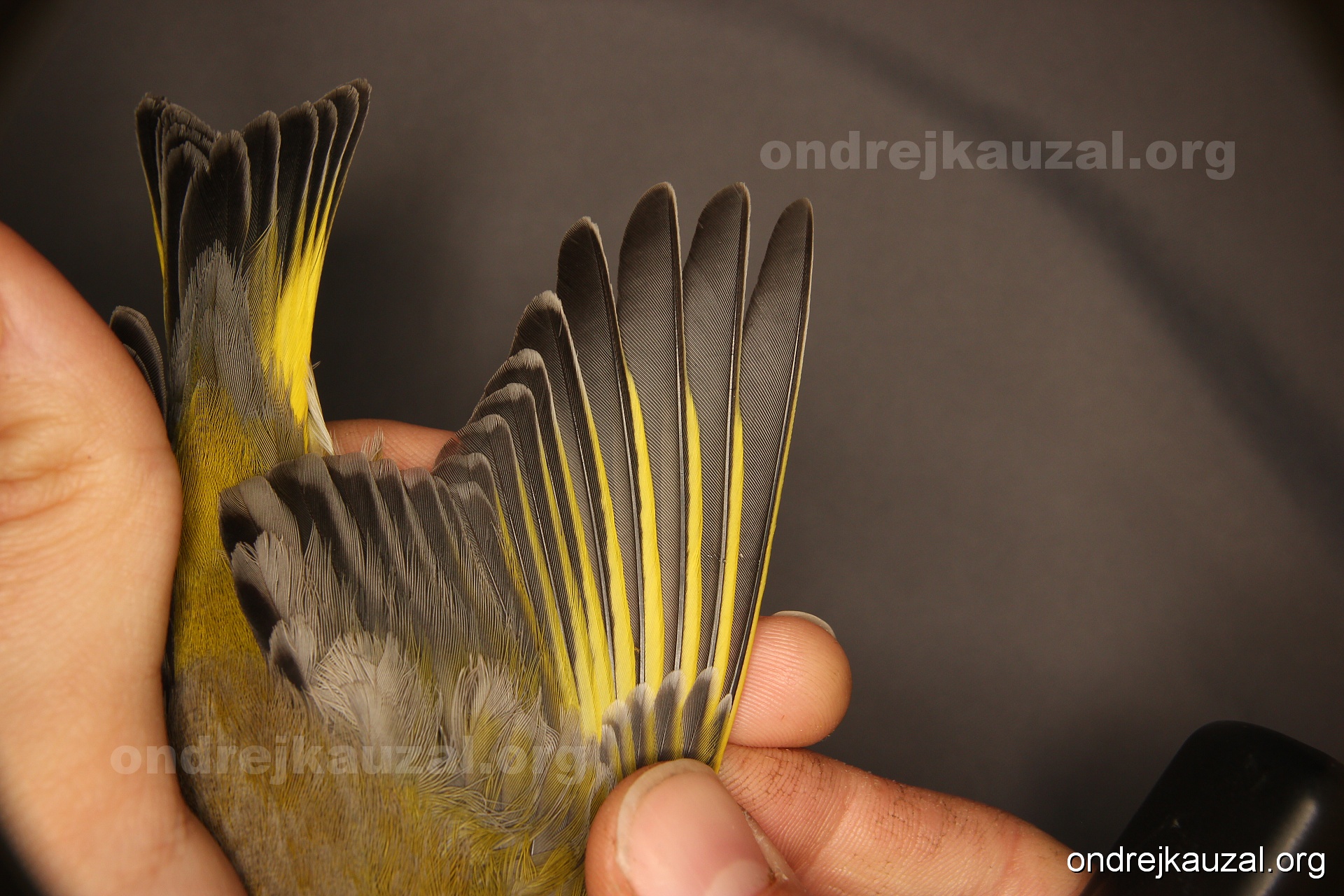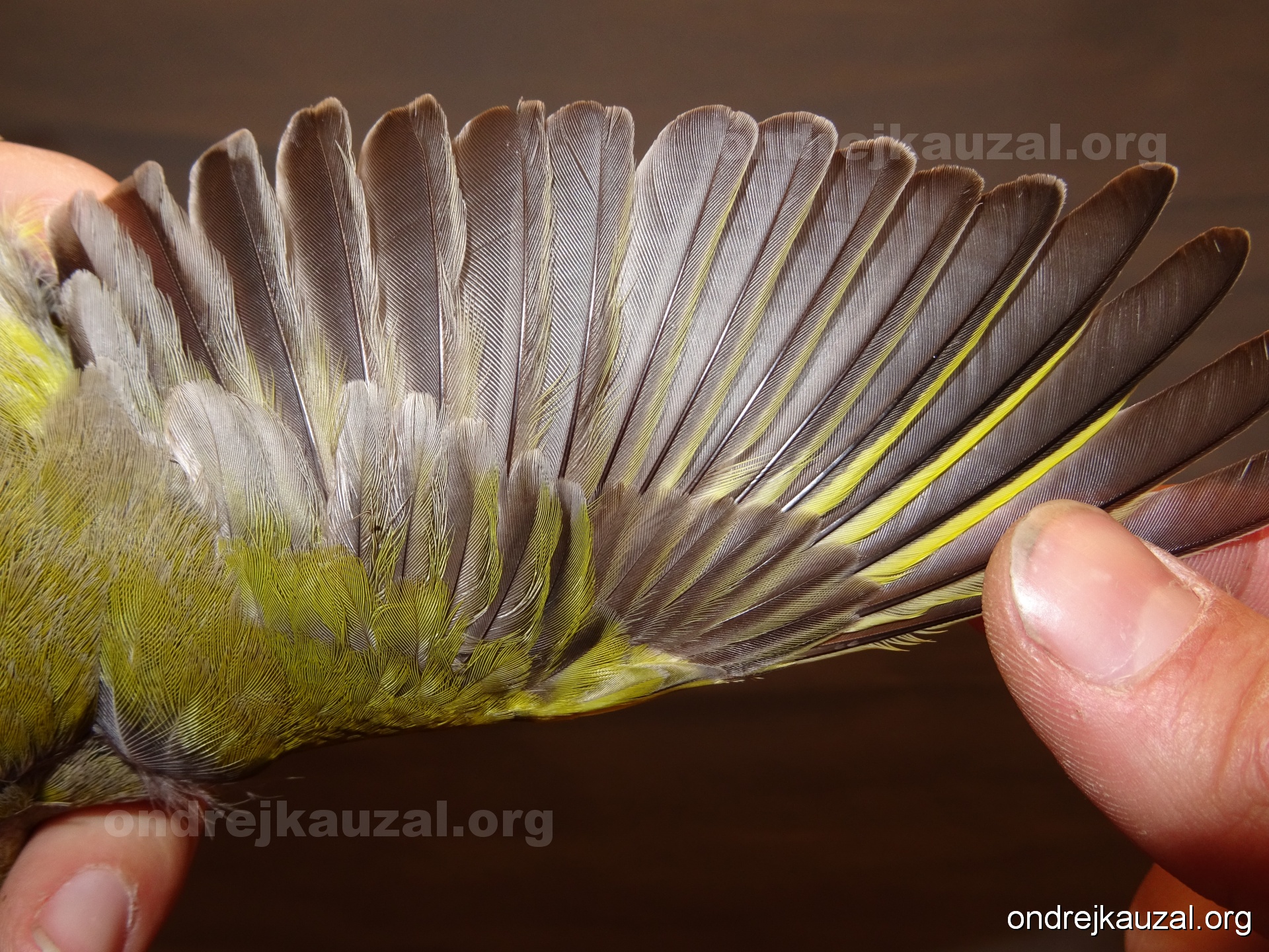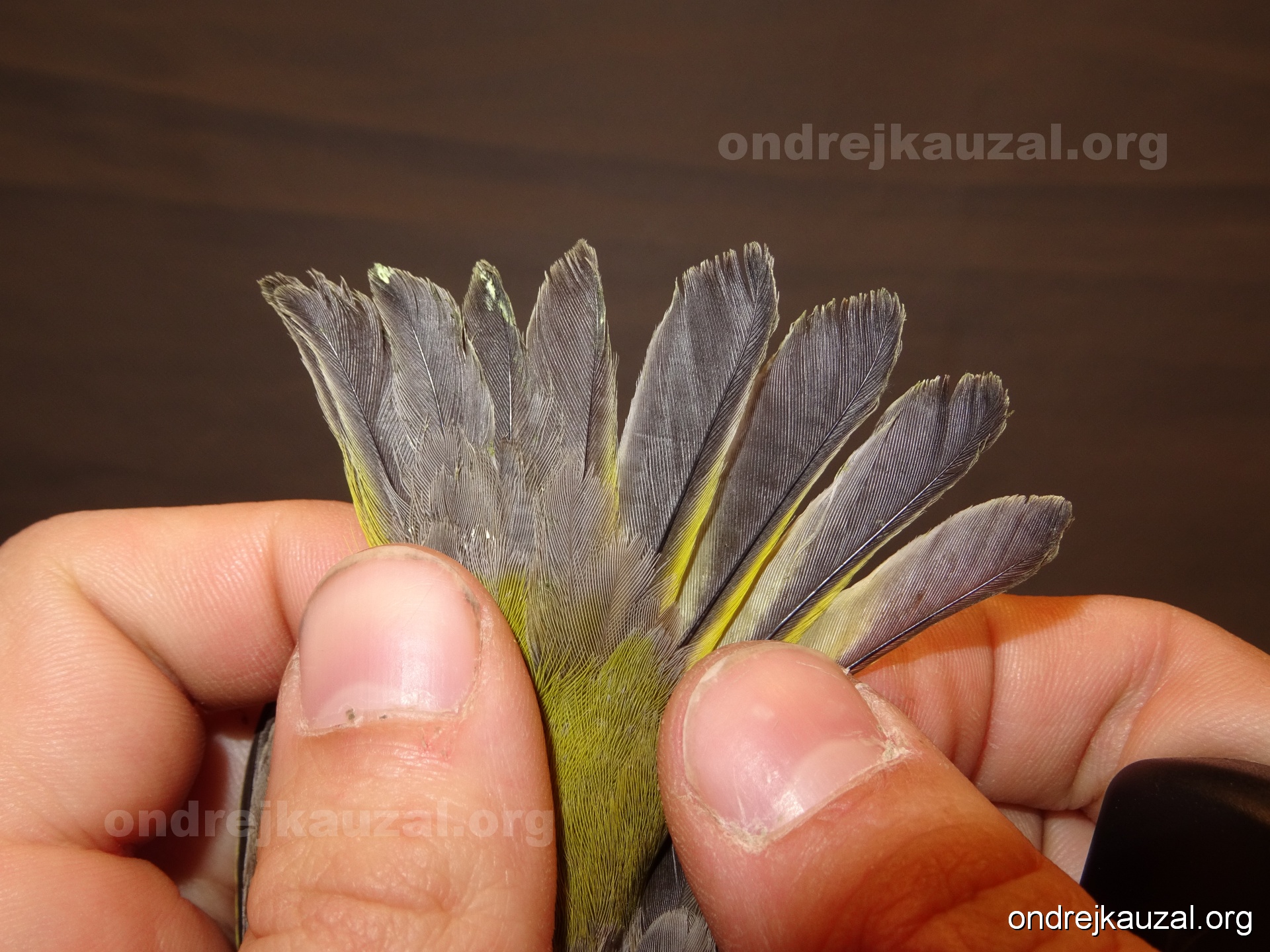 An interesting individual, albeit being in the first year of its life, it has moulted three of its primaries (P5 – P7). Greenfinches occasionally include moult of some primaries during their partial postjuvenile moult.