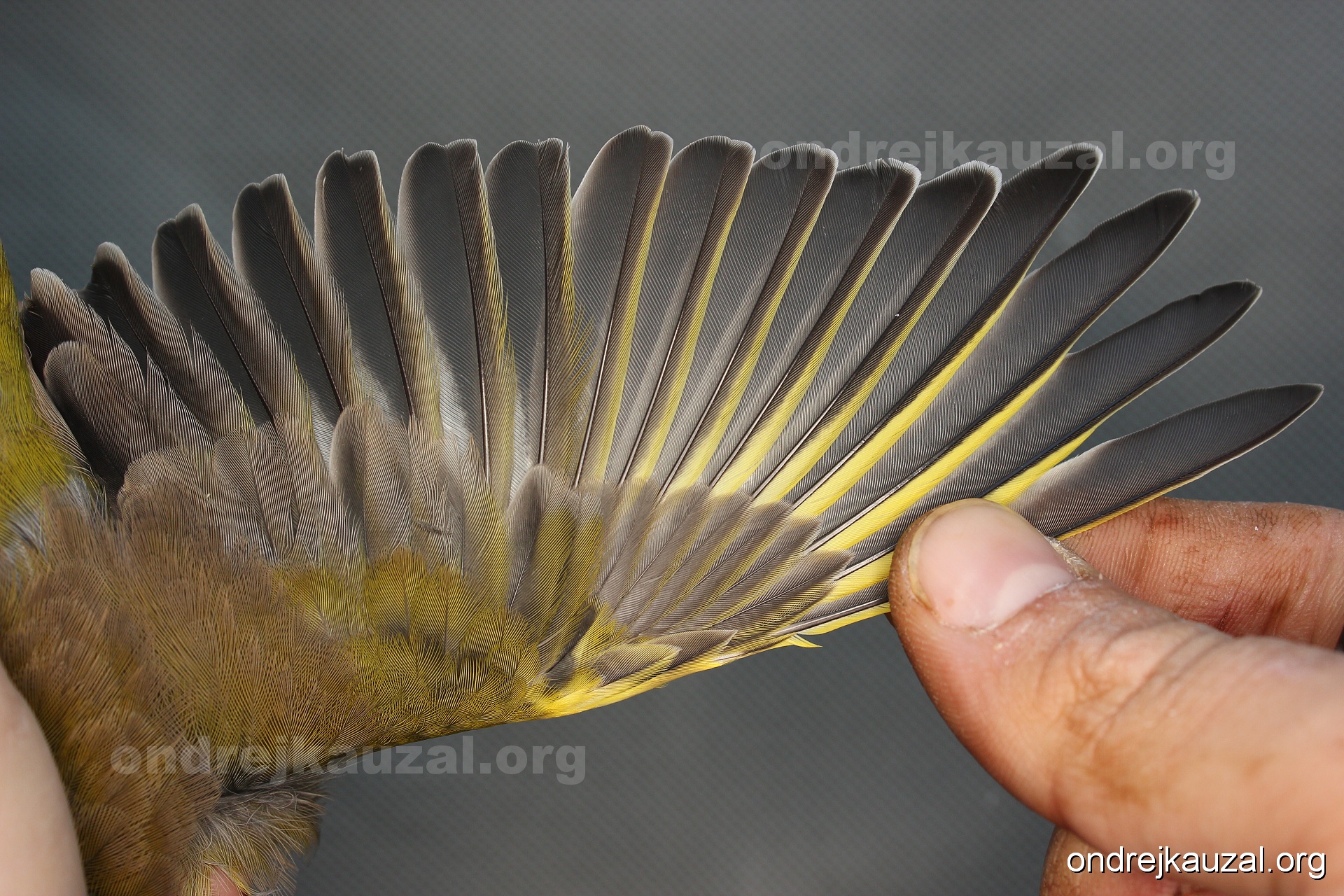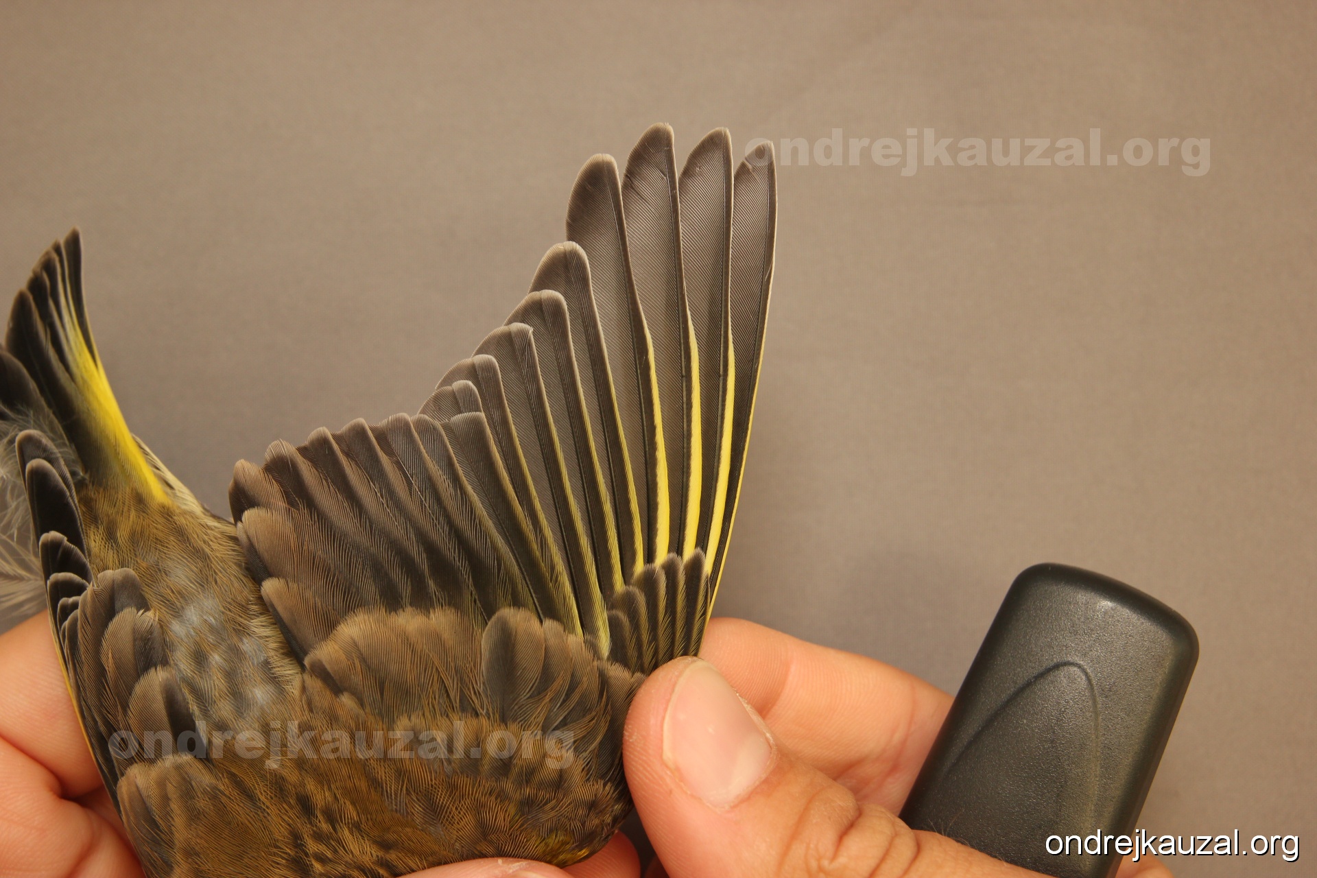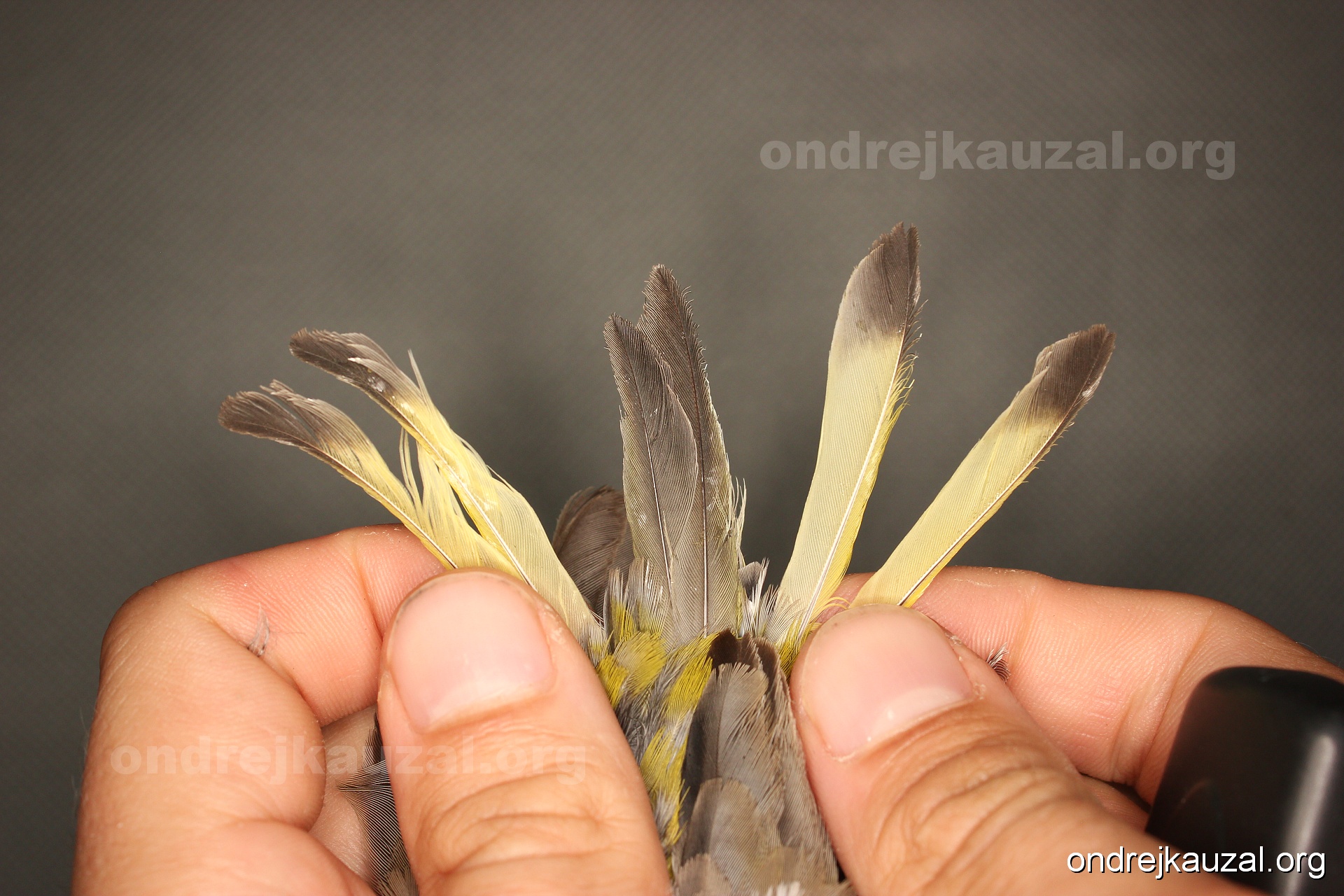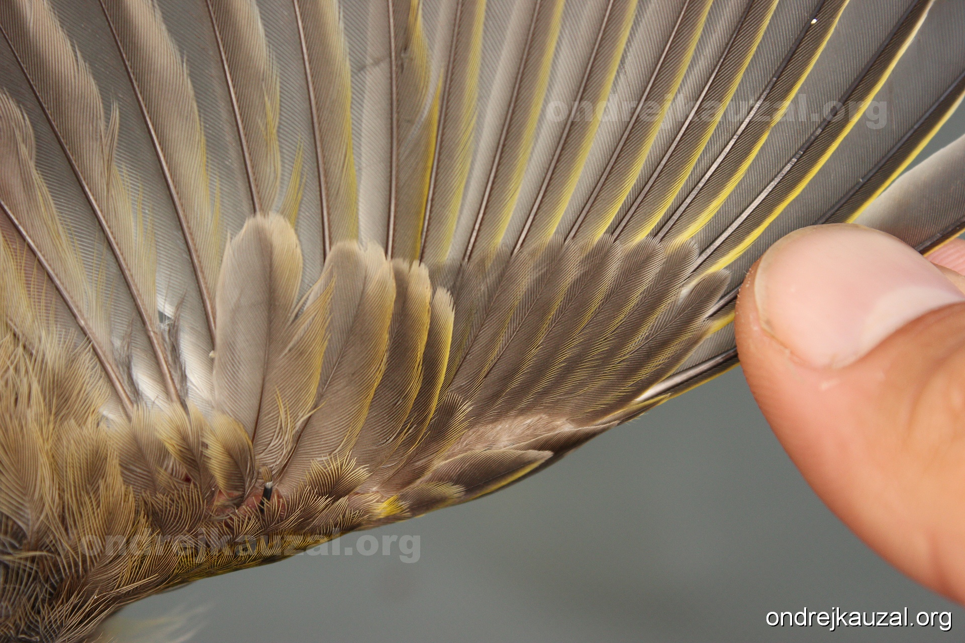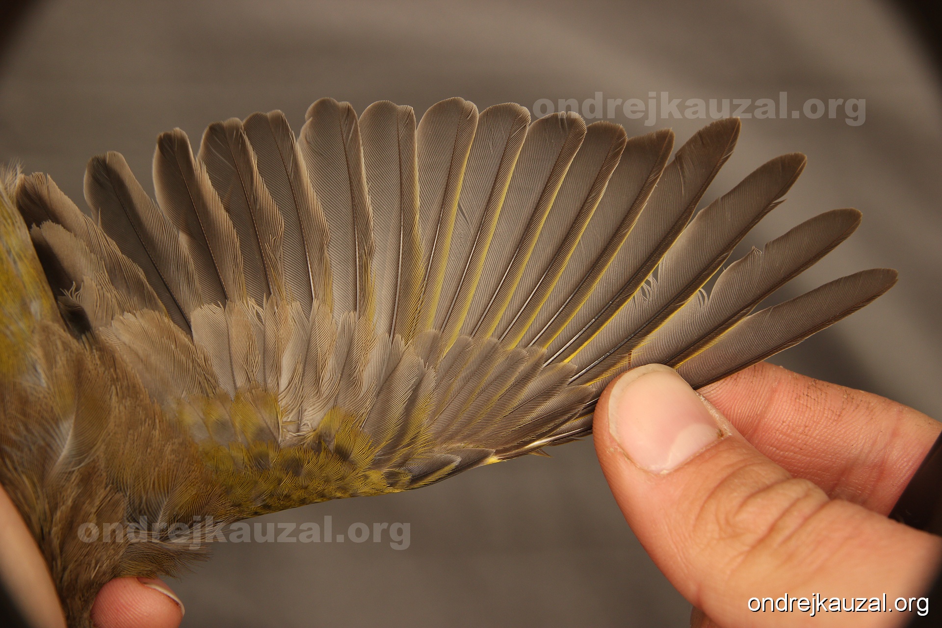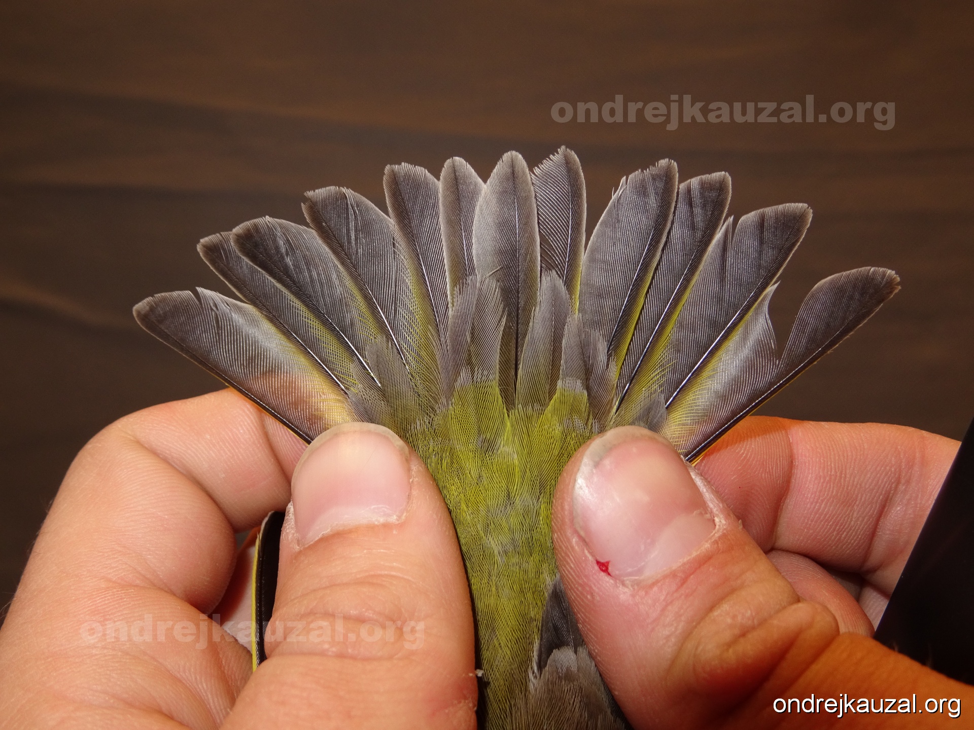 An interesting individual, albeit being in the first year of its life, it has moulted three of its primaries (P5 – P7). Greenfinches occasionally include moult of some primaries during their partial postjuvenile moult.