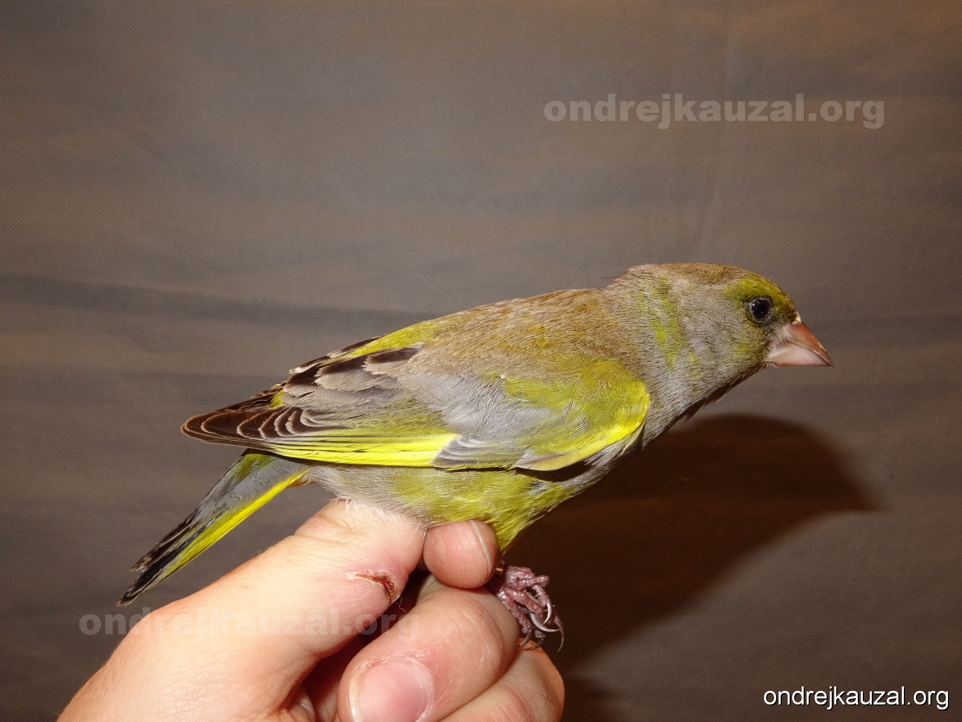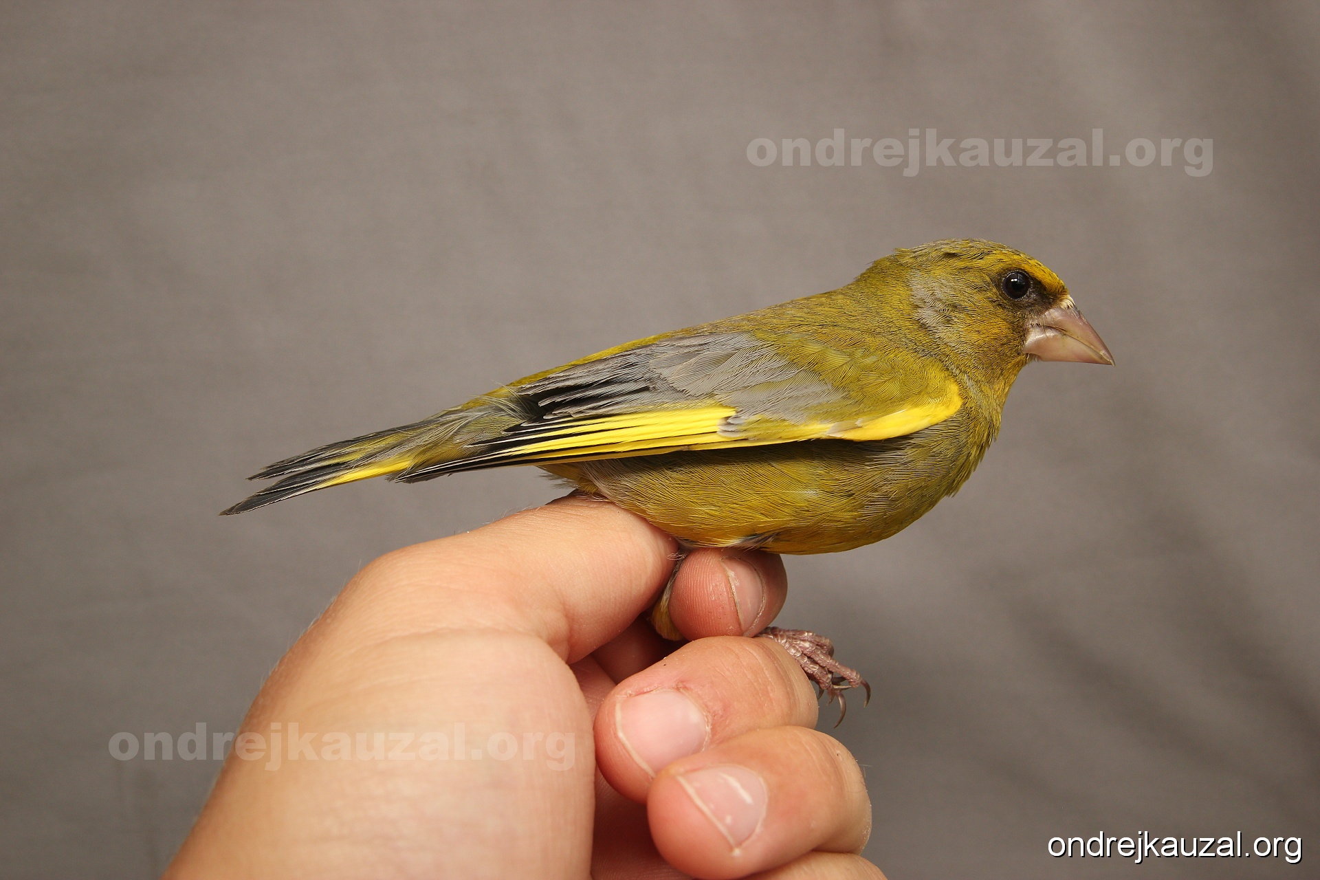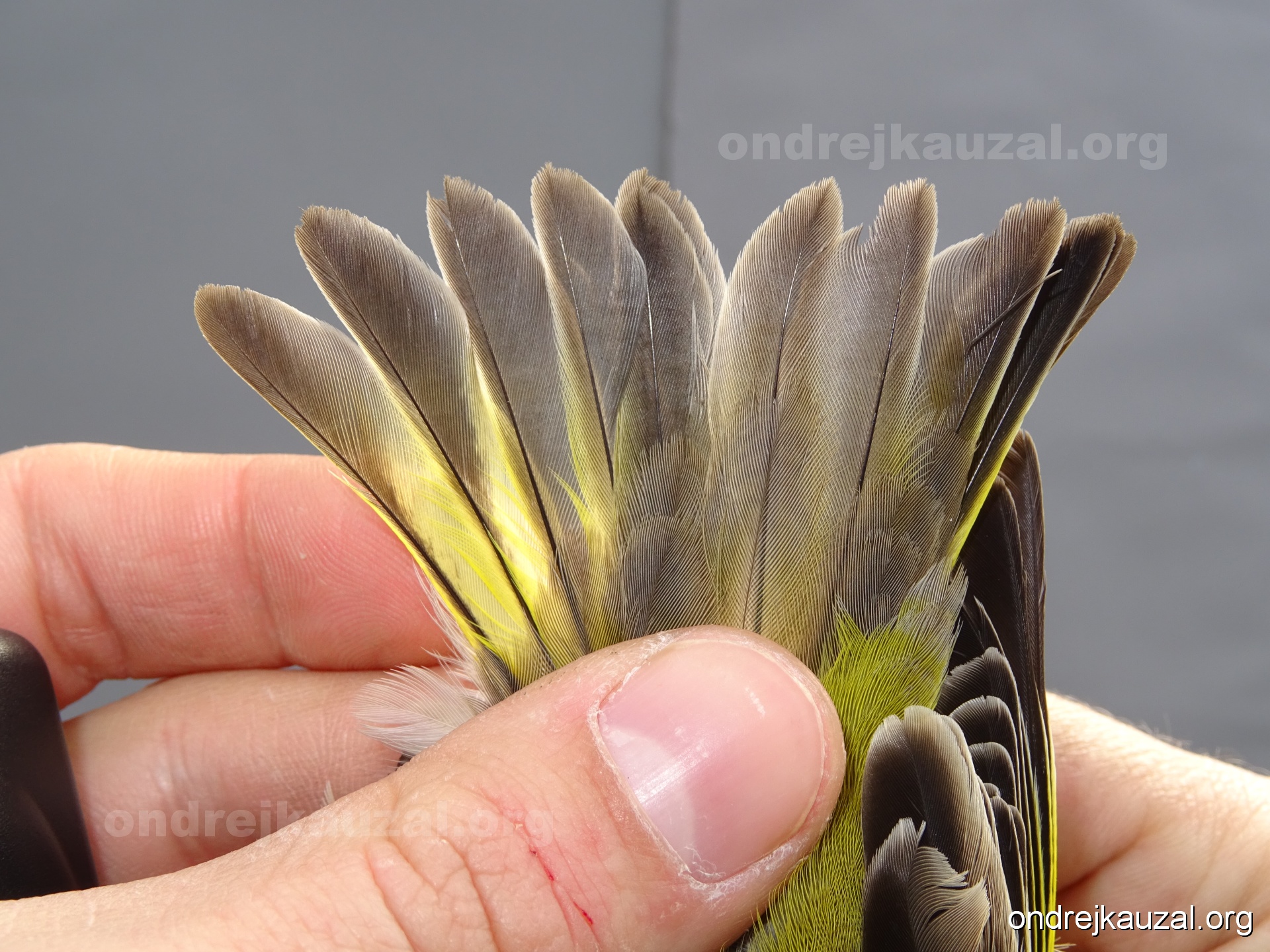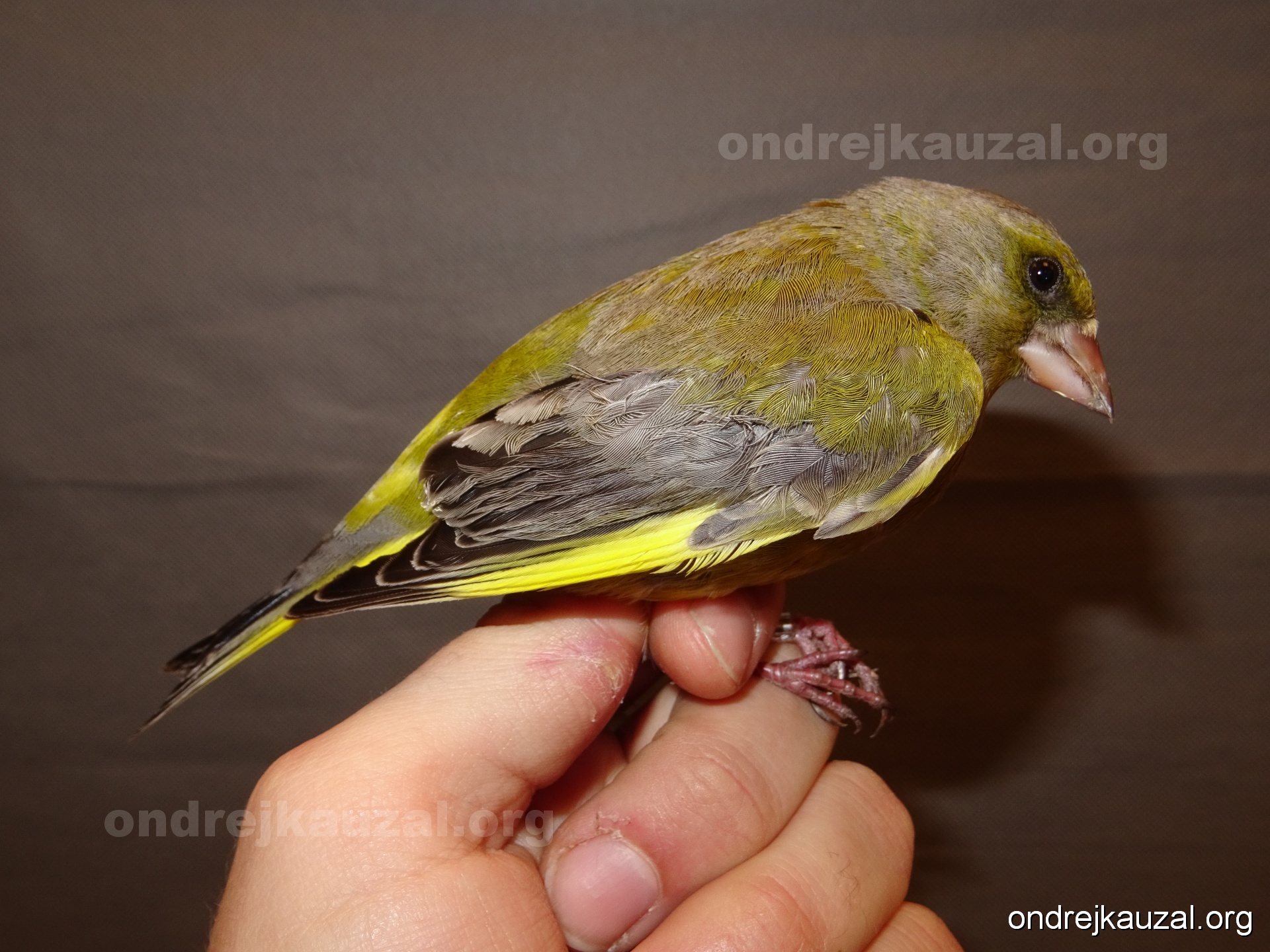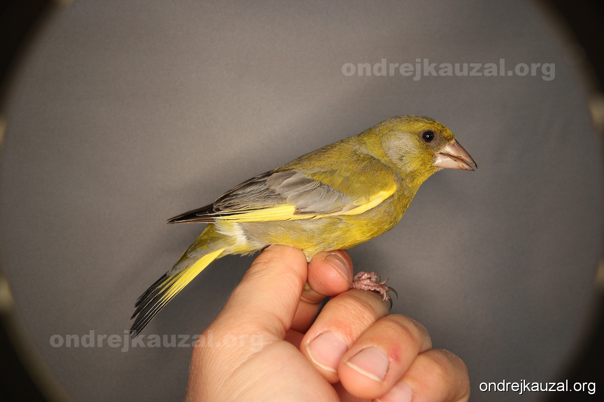 An interesting individual, albeit being in the first year of its life, it has moulted three of its primaries (P5 – P7). Greenfinches occasionally include moult of some primaries during their partial postjuvenile moult.
