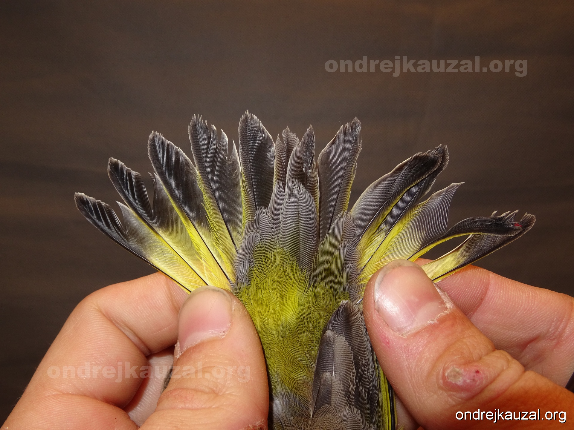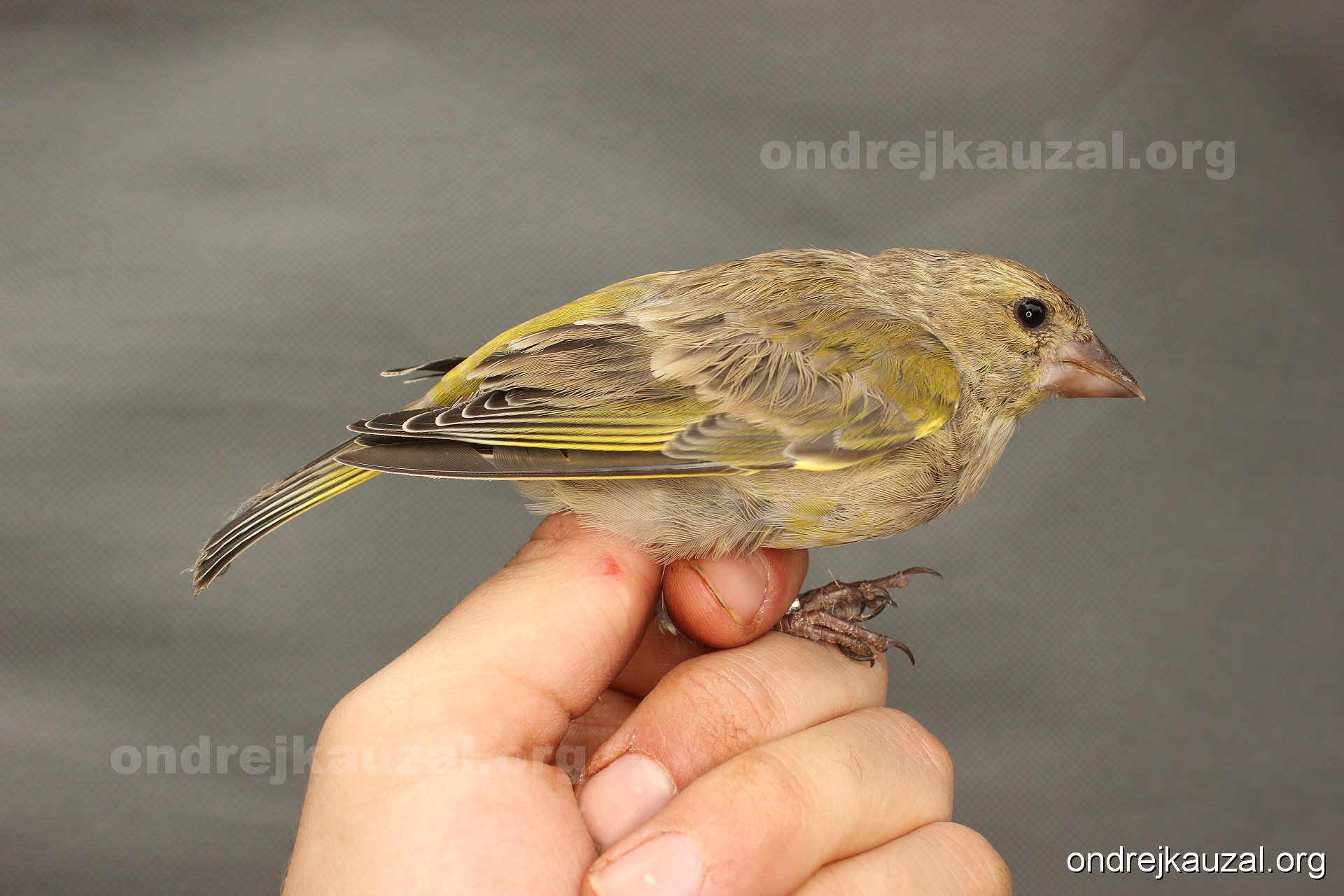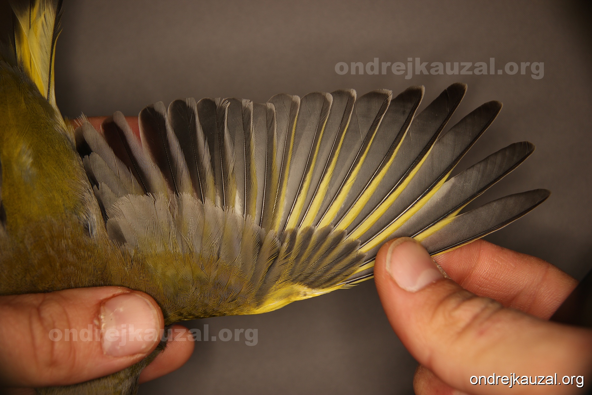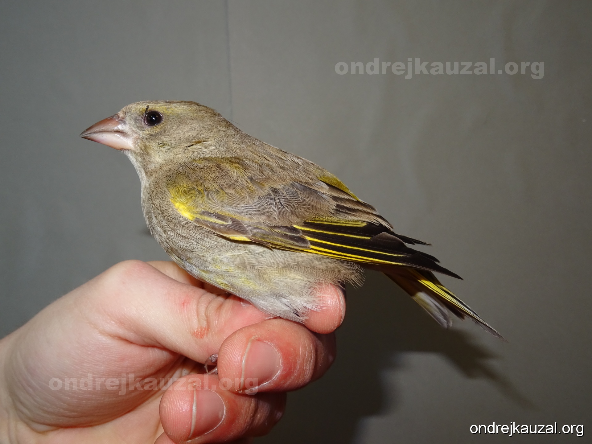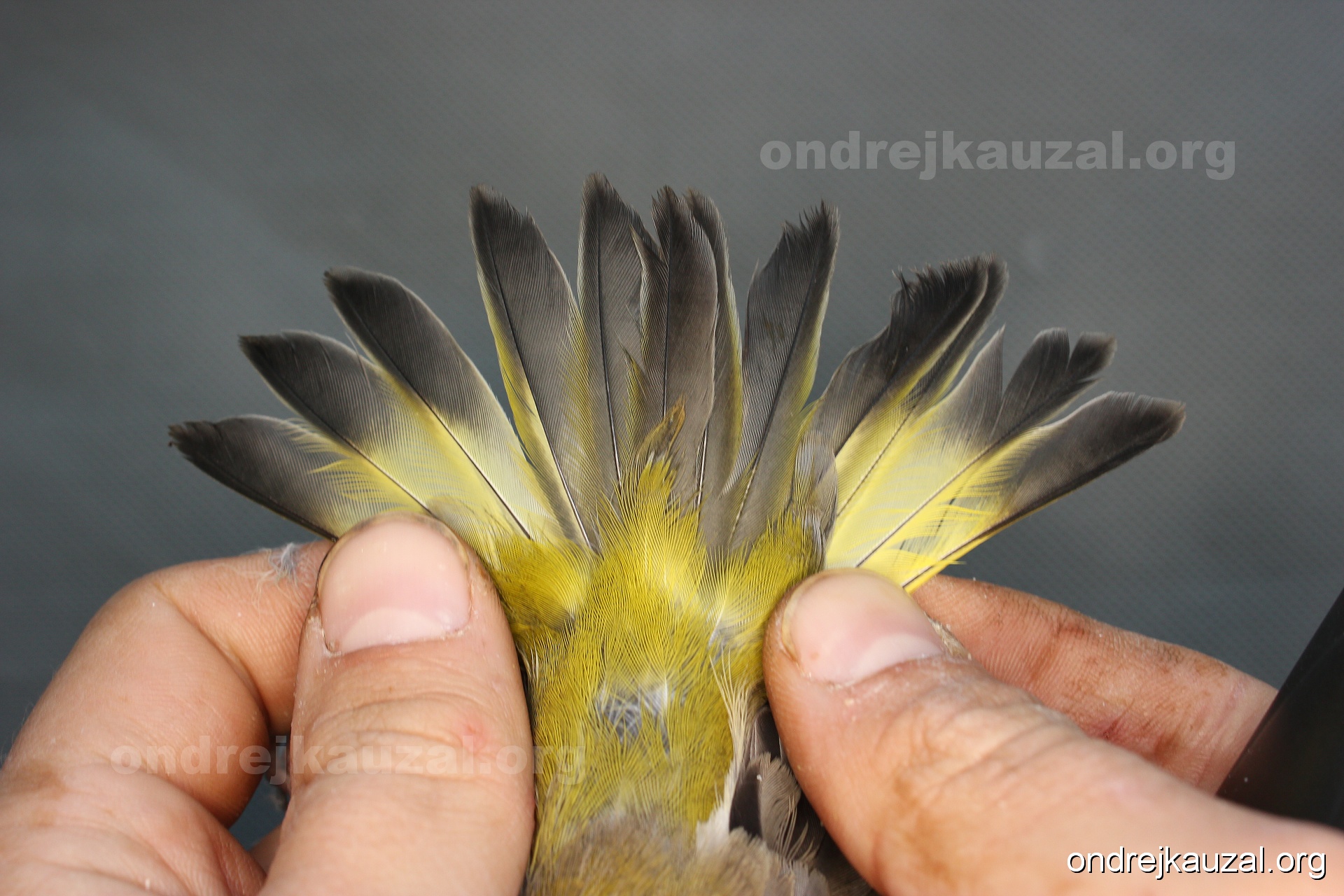 An interesting individual, albeit being in the first year of its life, it has moulted three of its primaries (P5 – P7). Greenfinches occasionally include moult of some primaries during their partial postjuvenile moult.