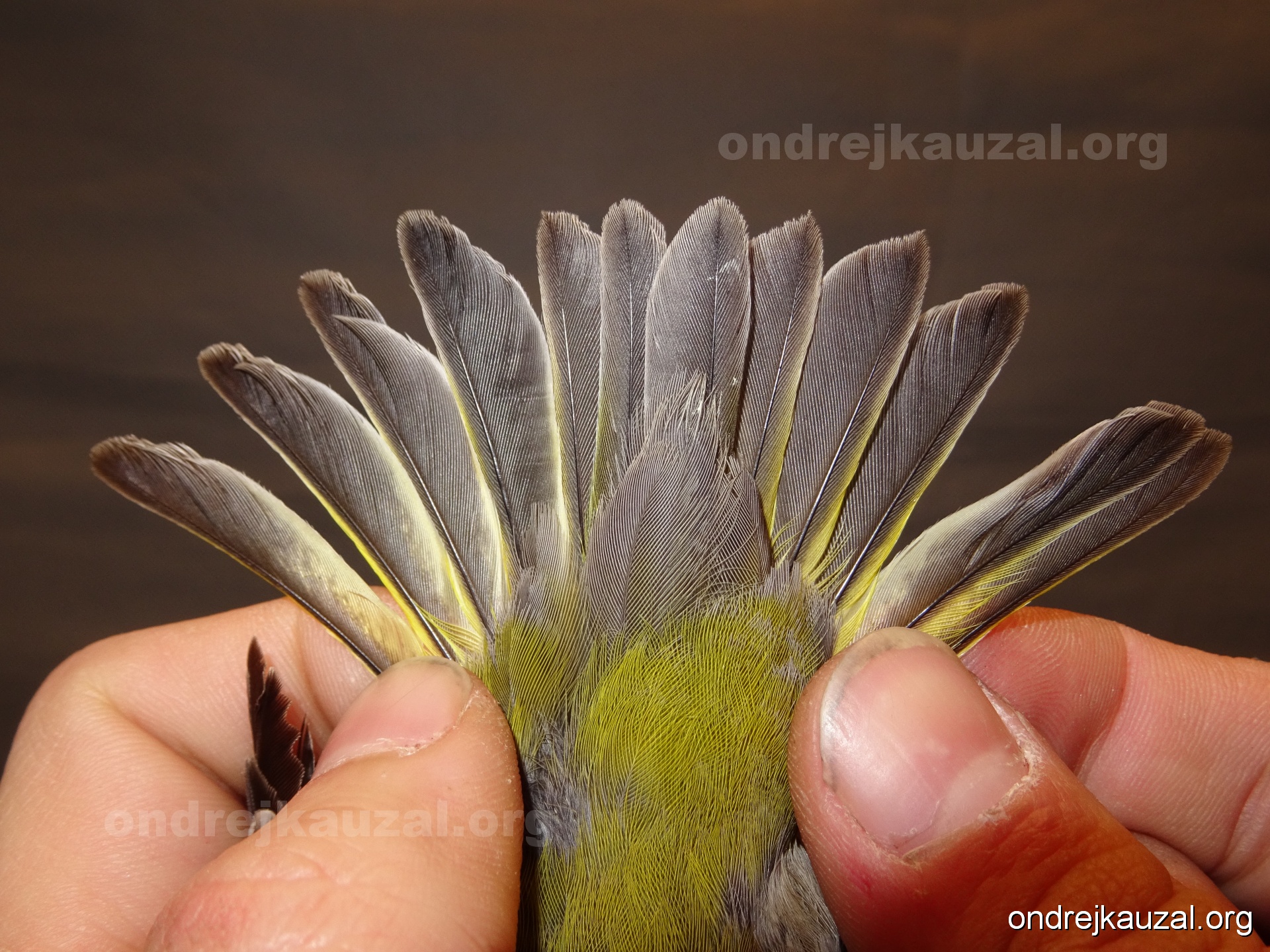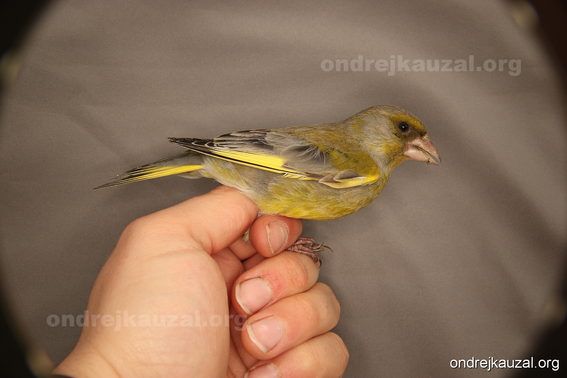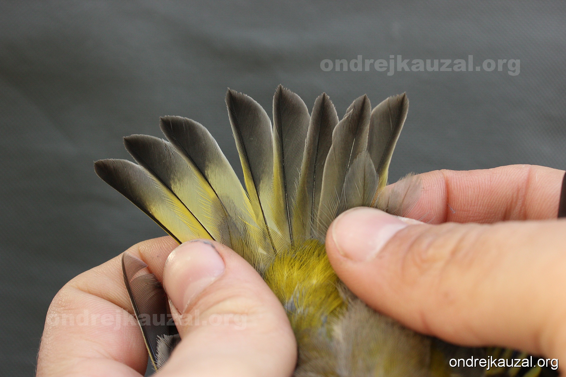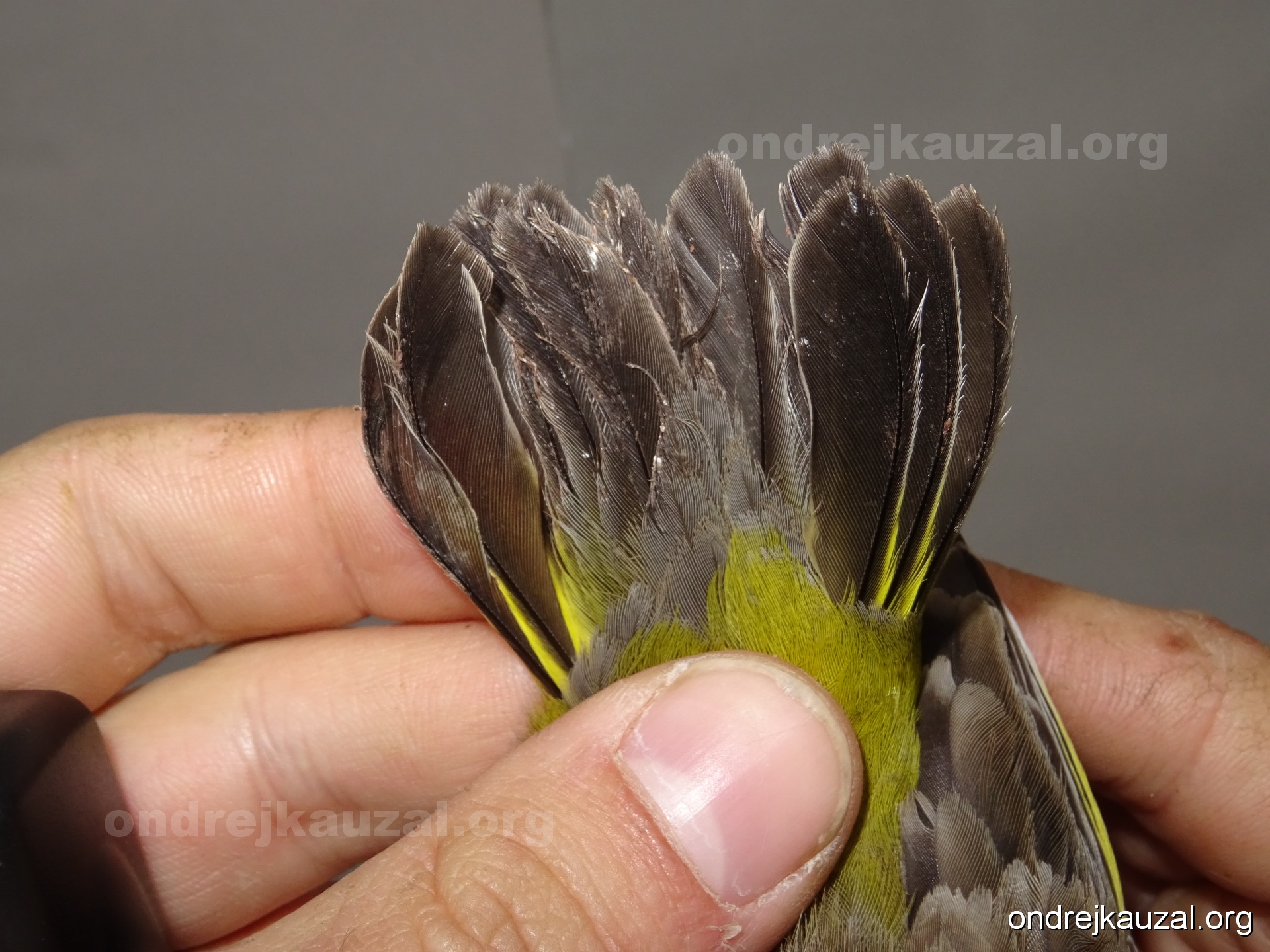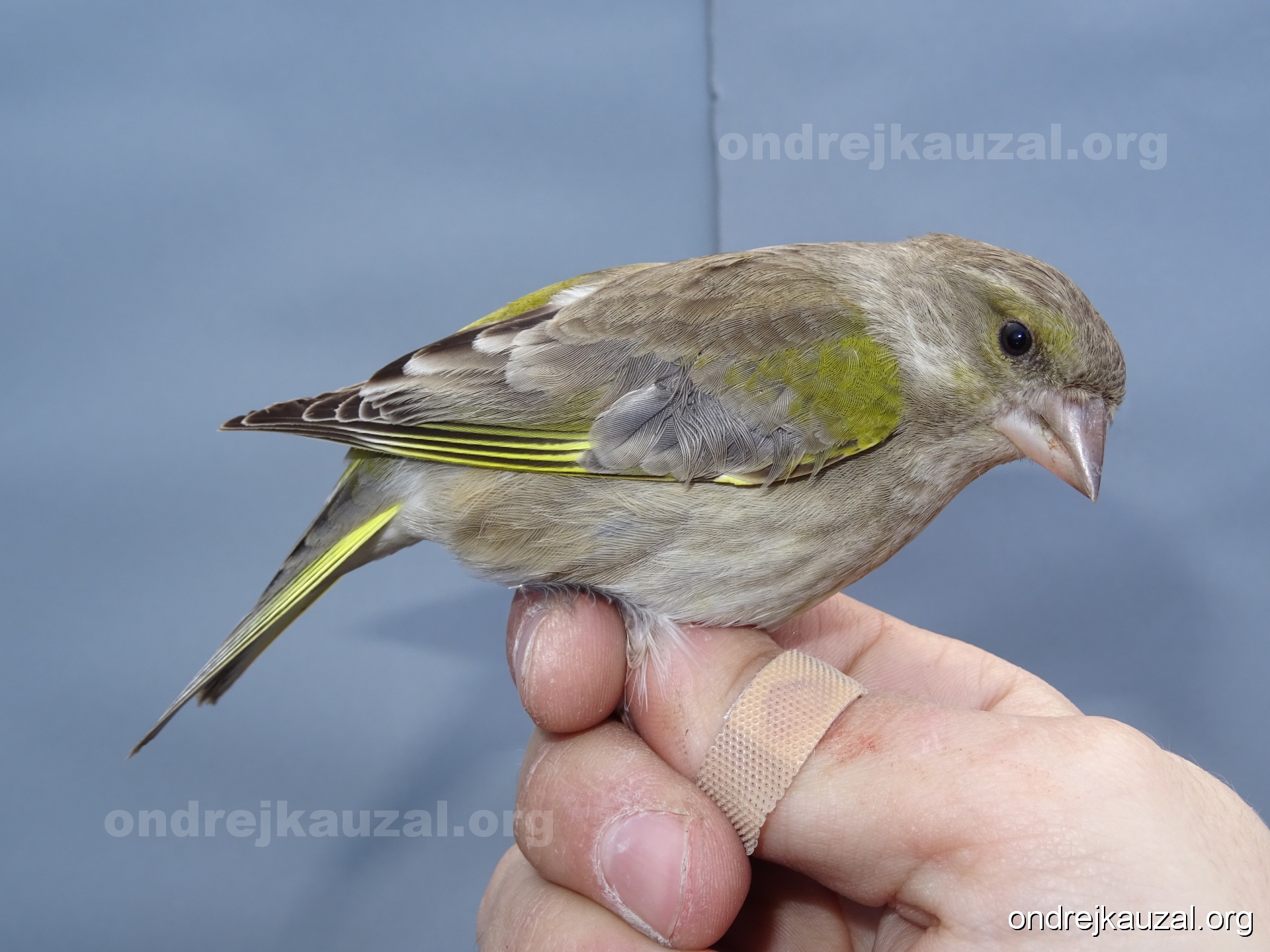 An interesting individual, albeit being in the first year of its life, it has moulted three of its primaries (P5 – P7). Greenfinches occasionally include moult of some primaries during their partial postjuvenile moult.