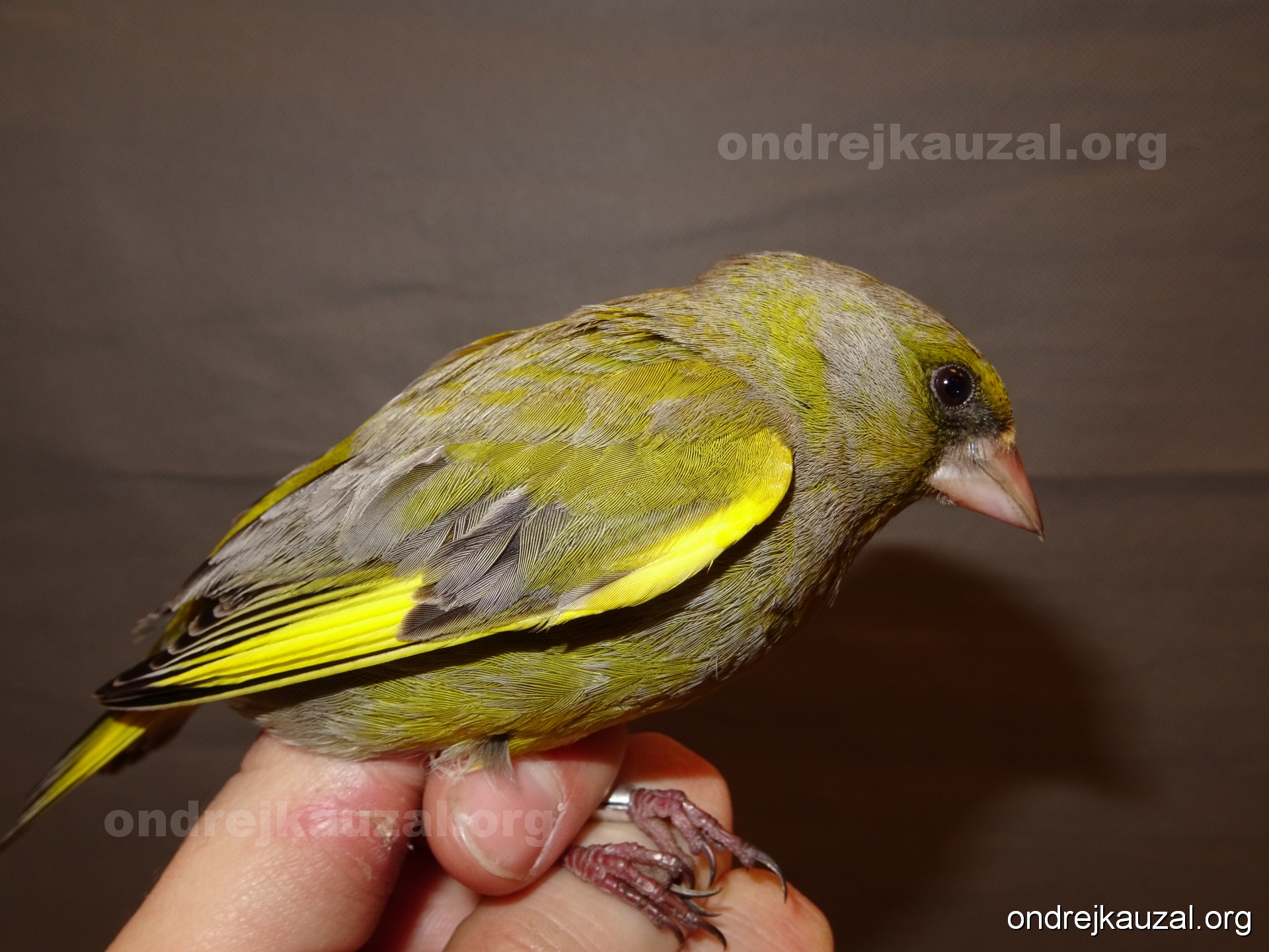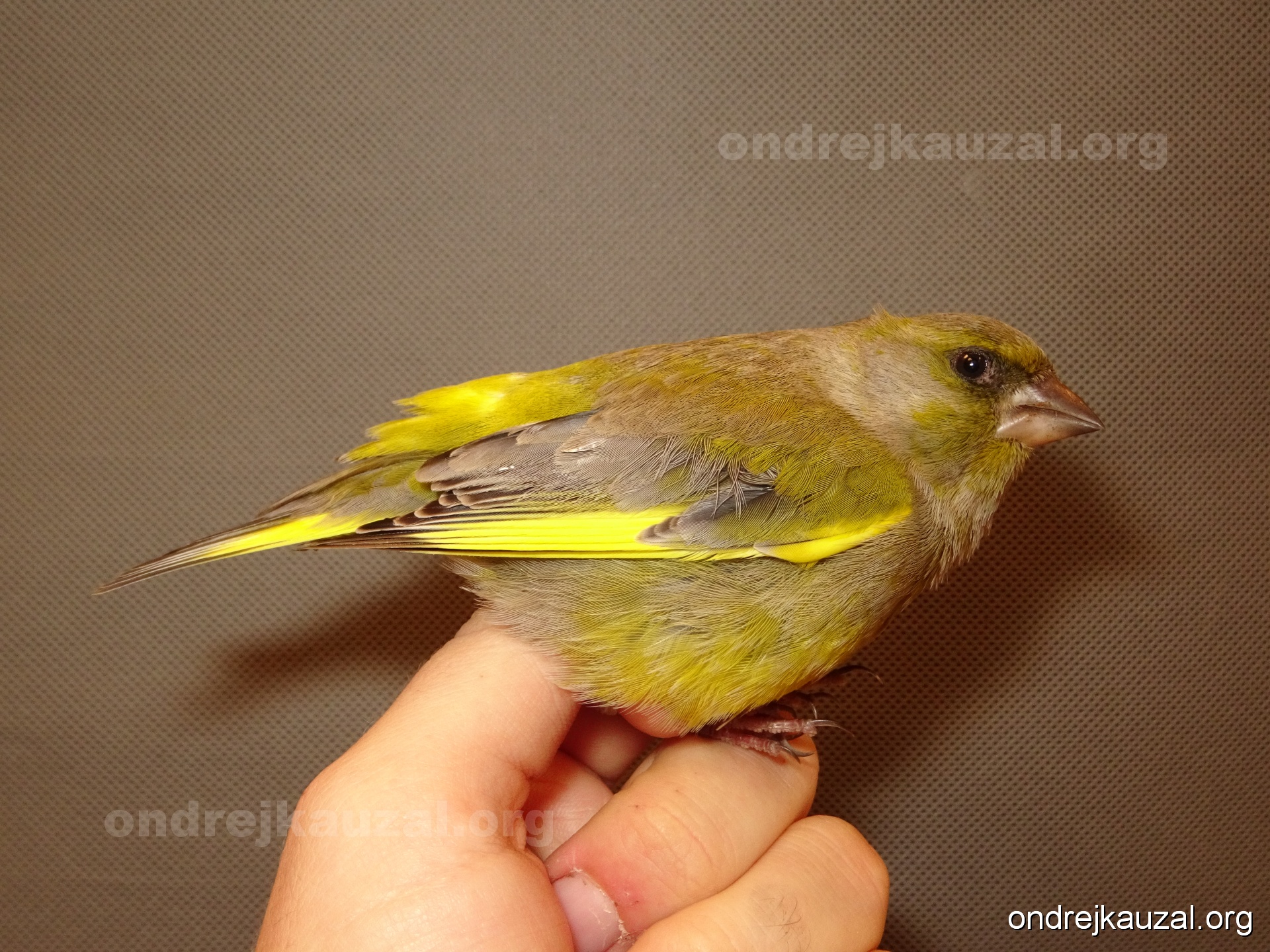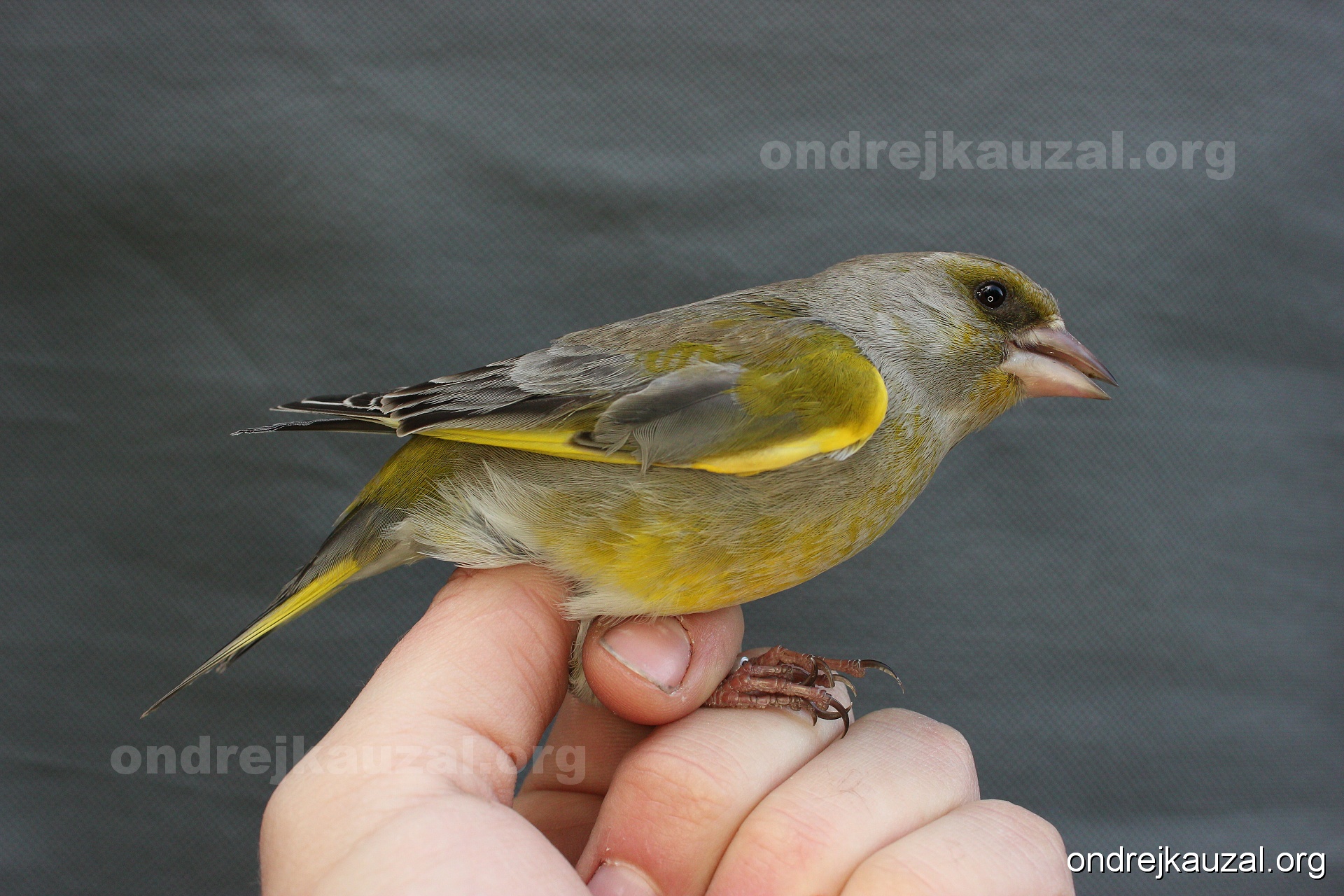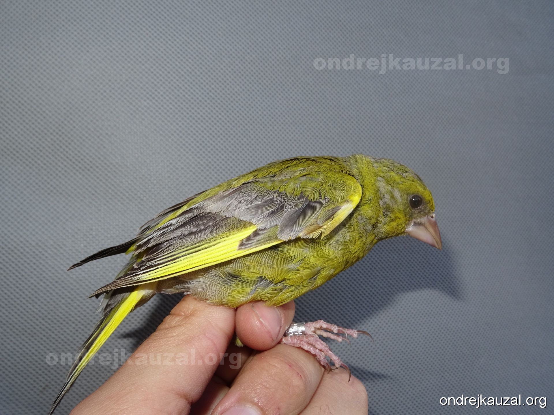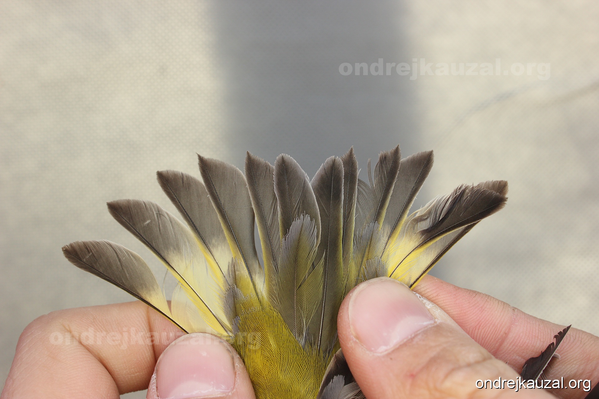 An interesting individual, albeit being in the first year of its life, it has moulted three of its primaries (P5 – P7). Greenfinches occasionally include moult of some primaries during their partial postjuvenile moult.