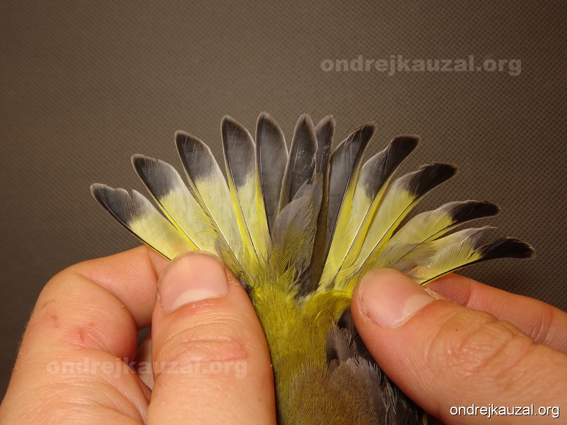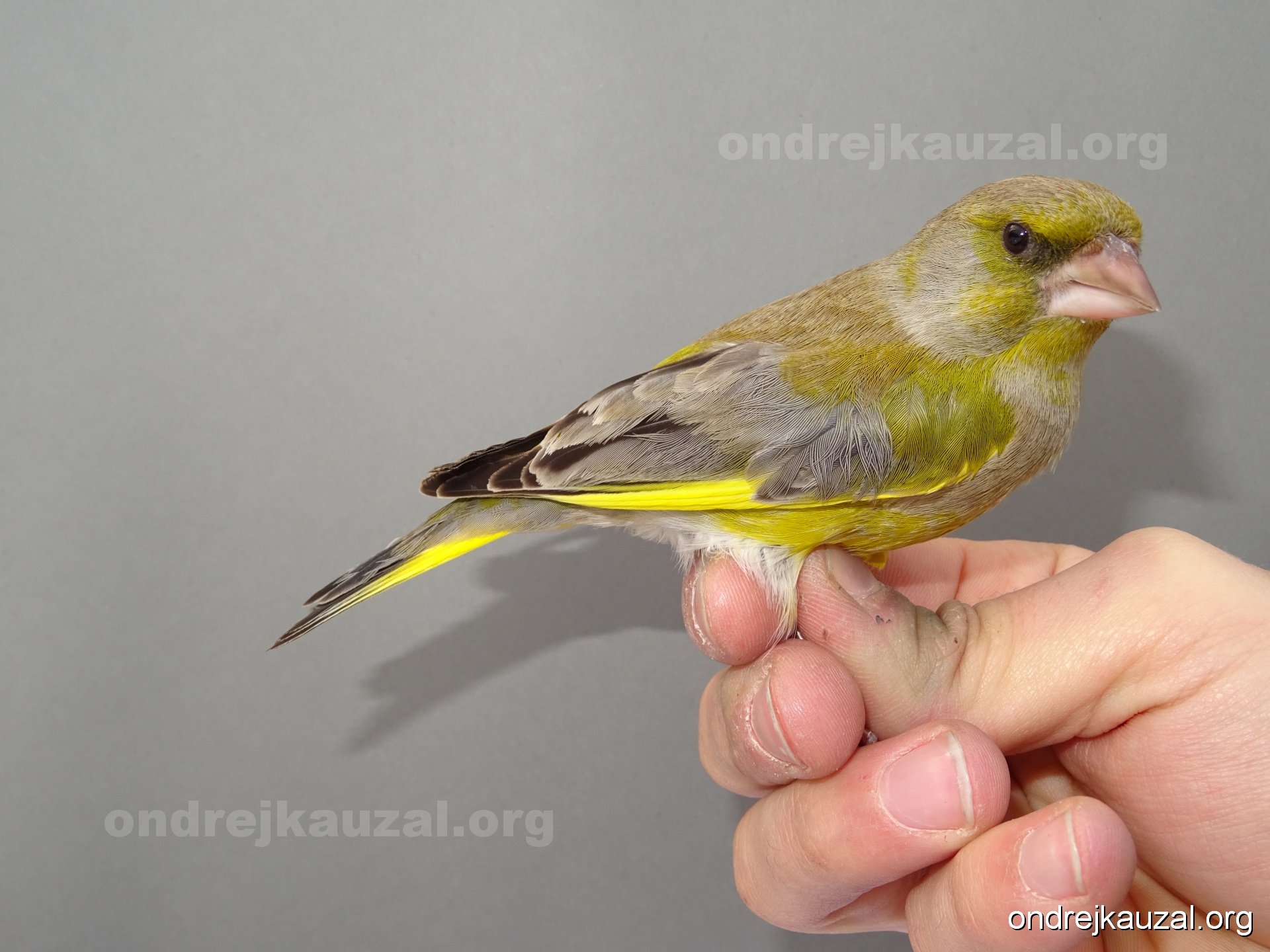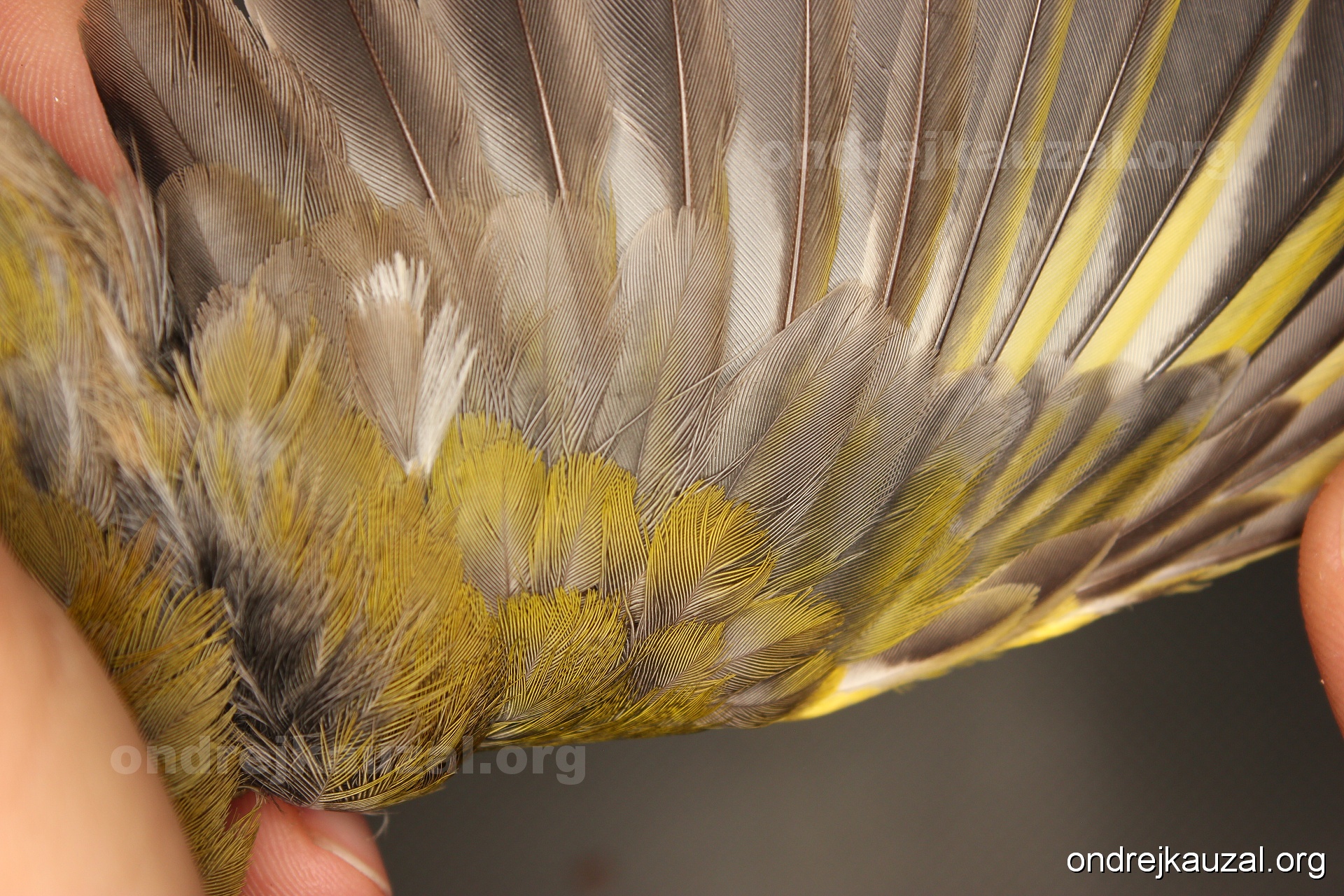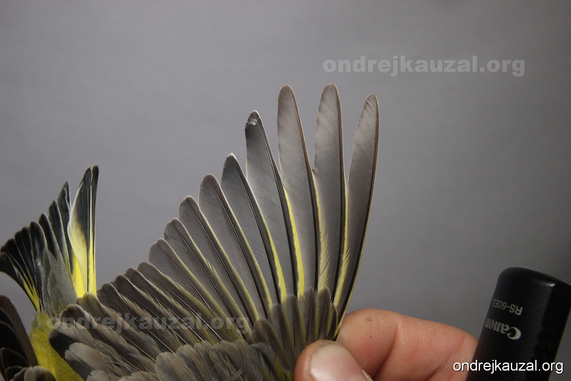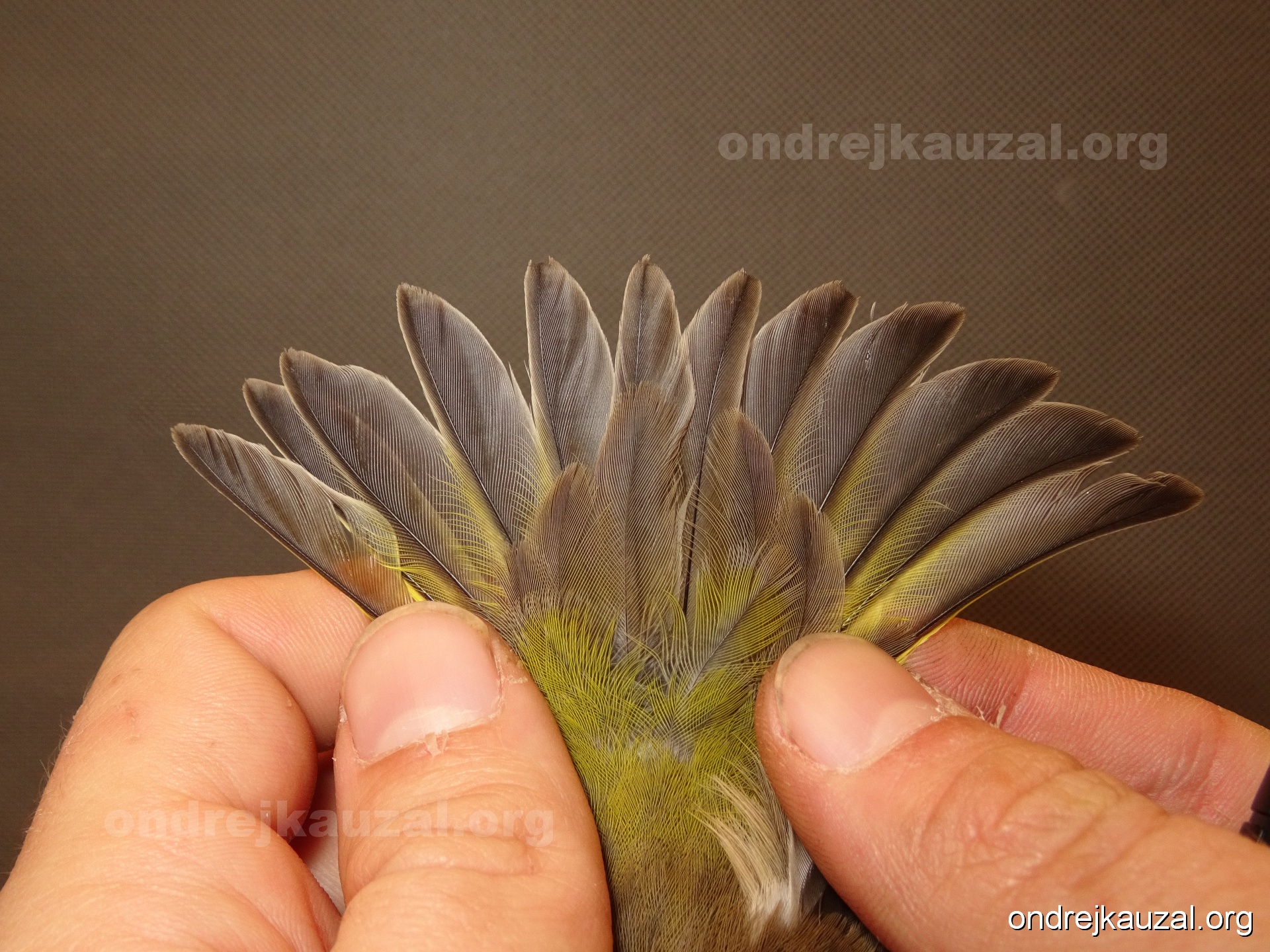 An interesting individual, albeit being in the first year of its life, it has moulted three of its primaries (P5 – P7). Greenfinches occasionally include moult of some primaries during their partial postjuvenile moult.