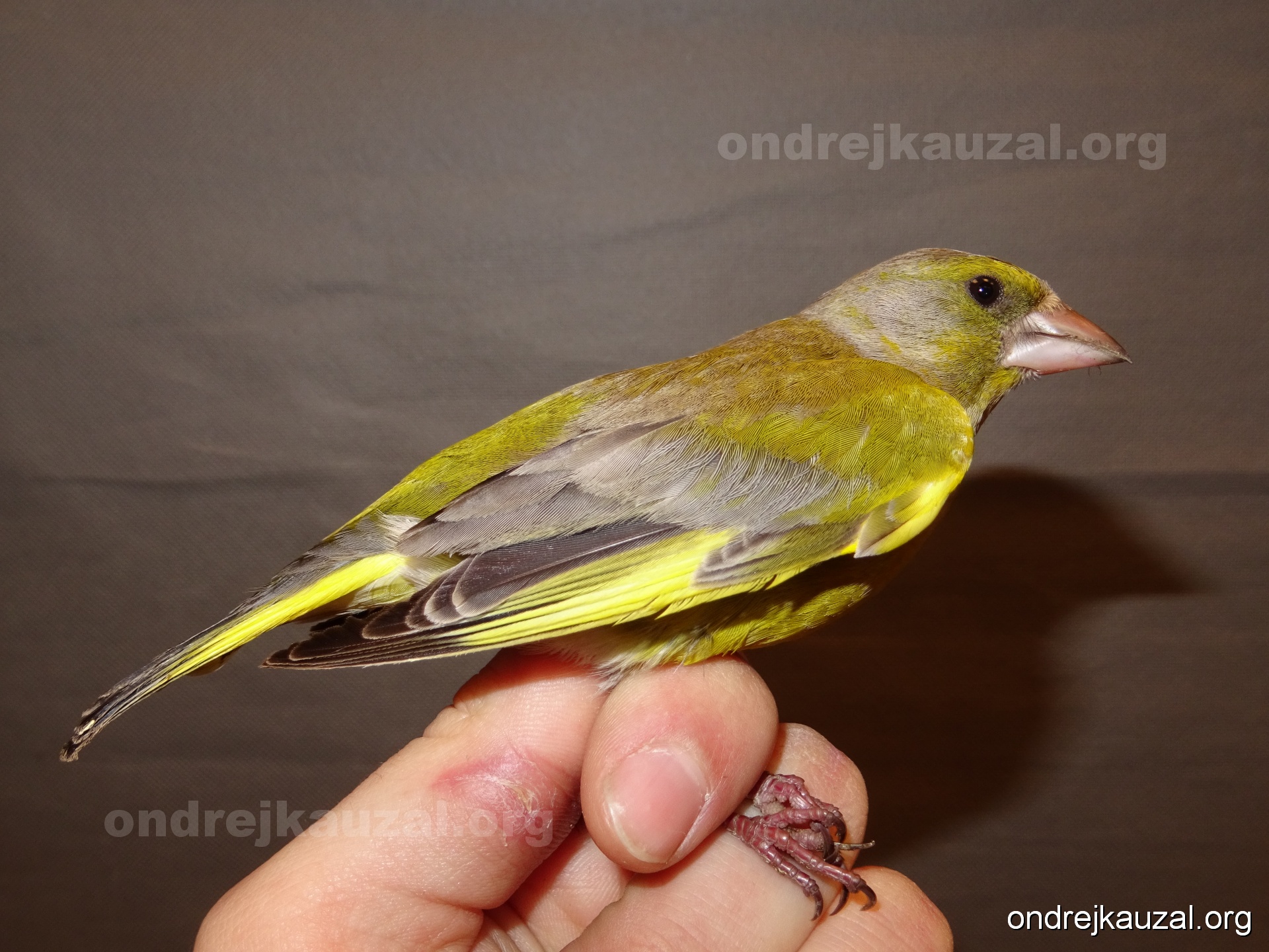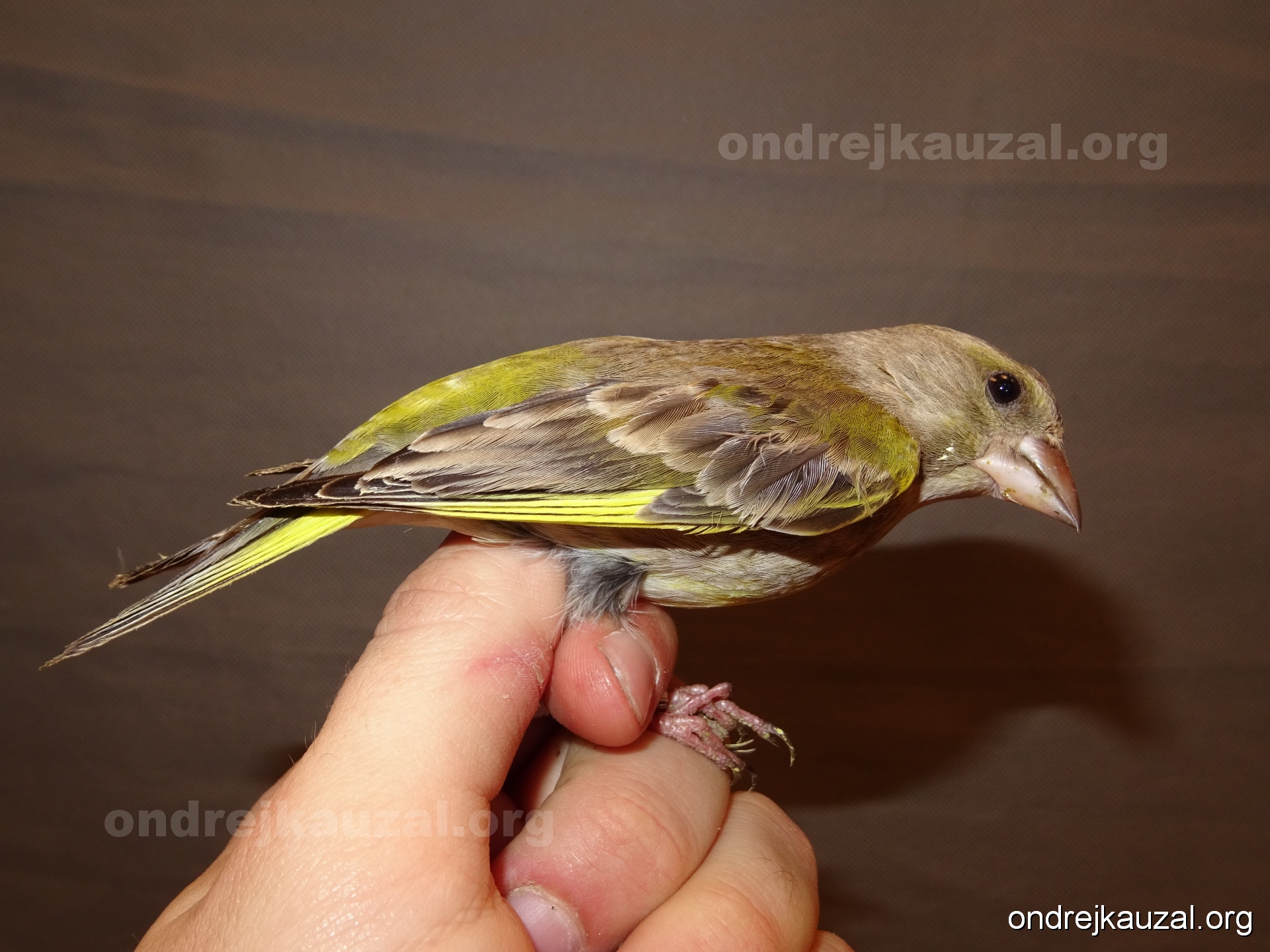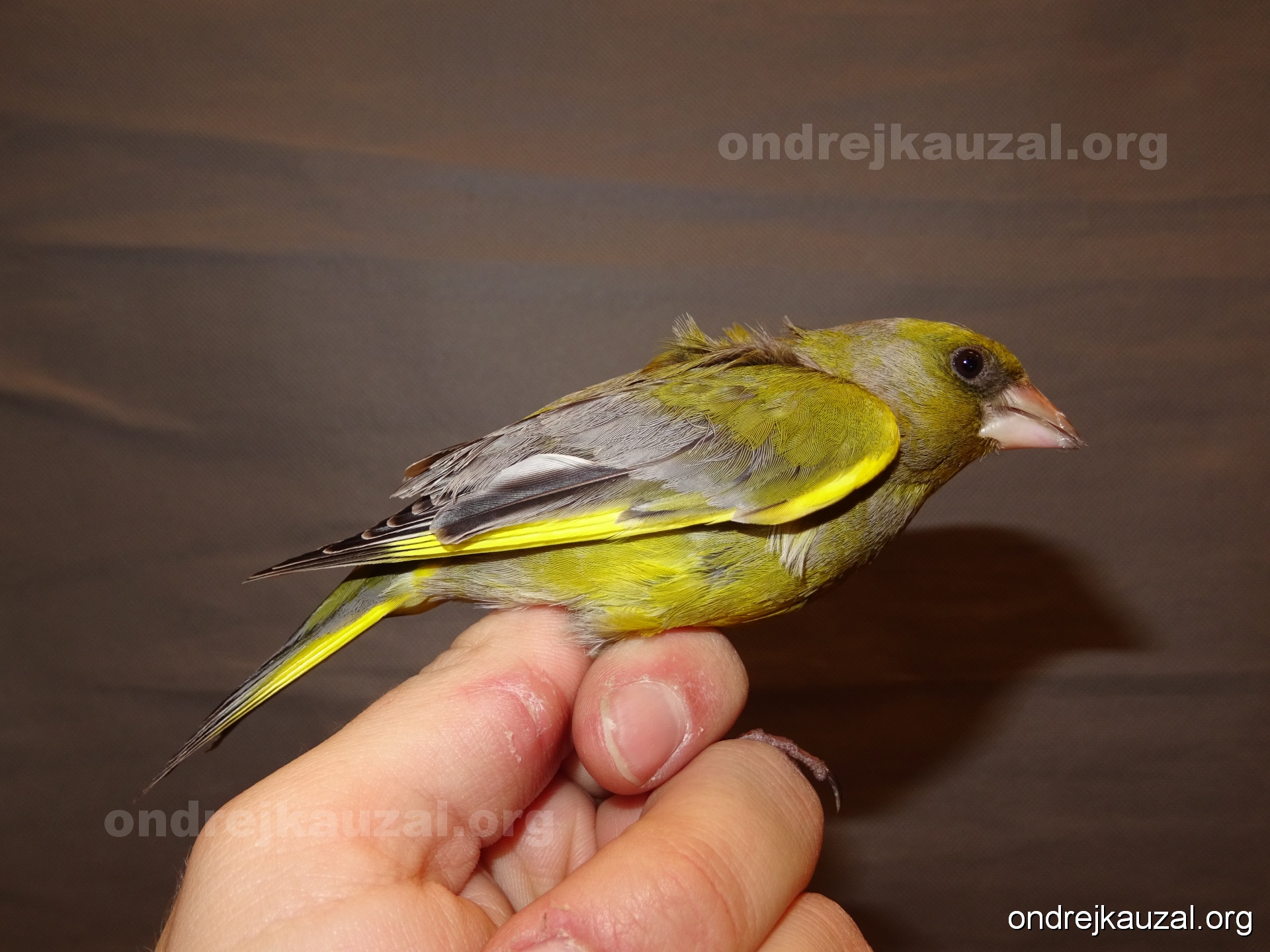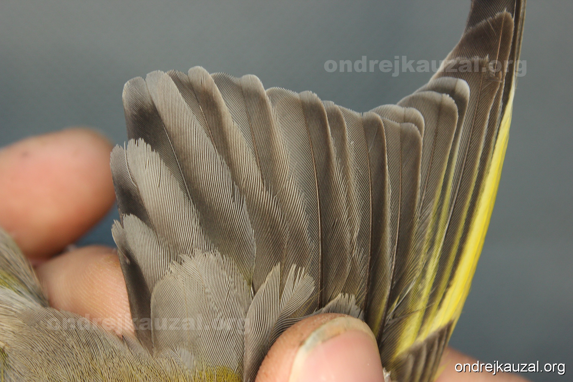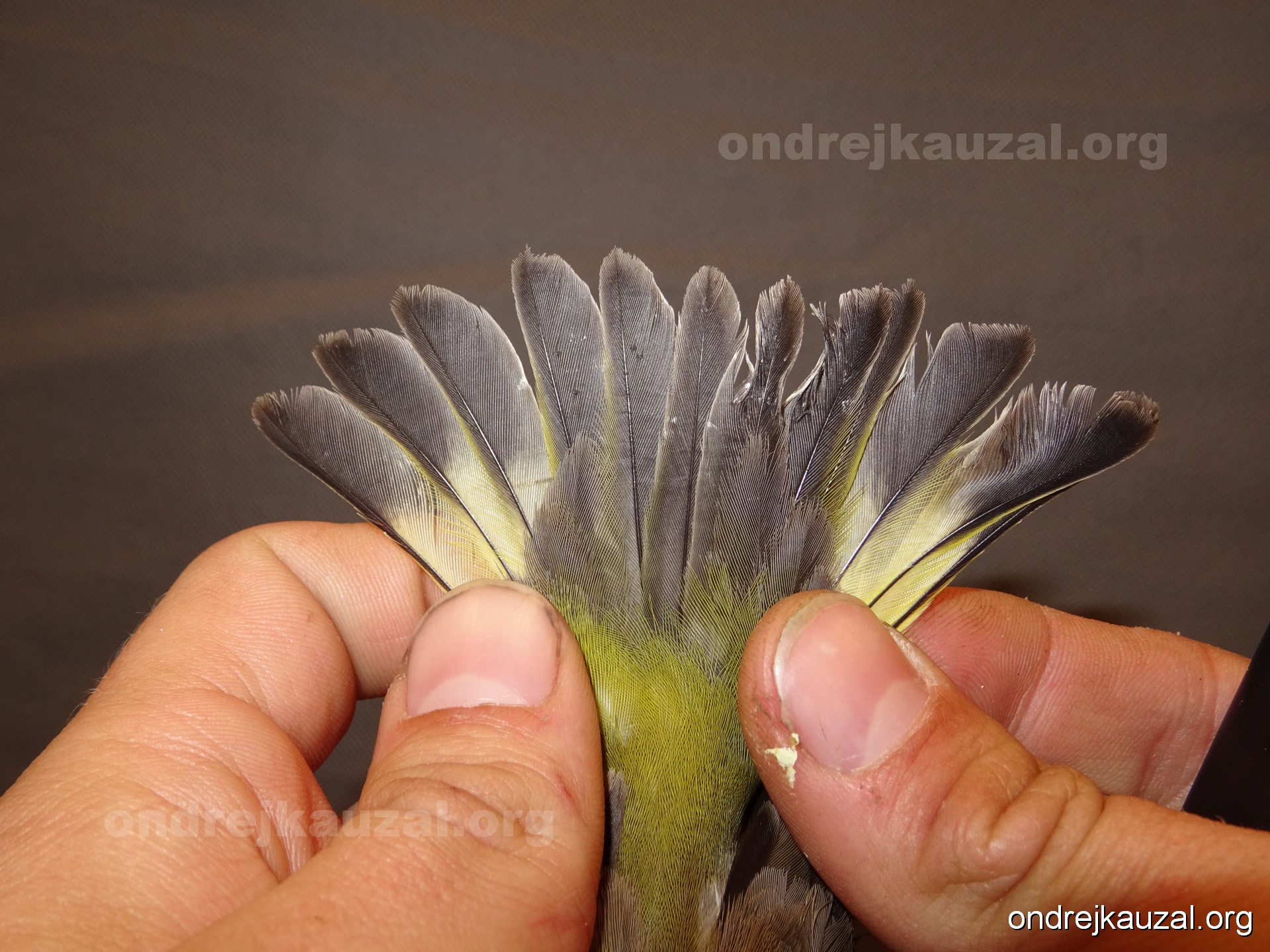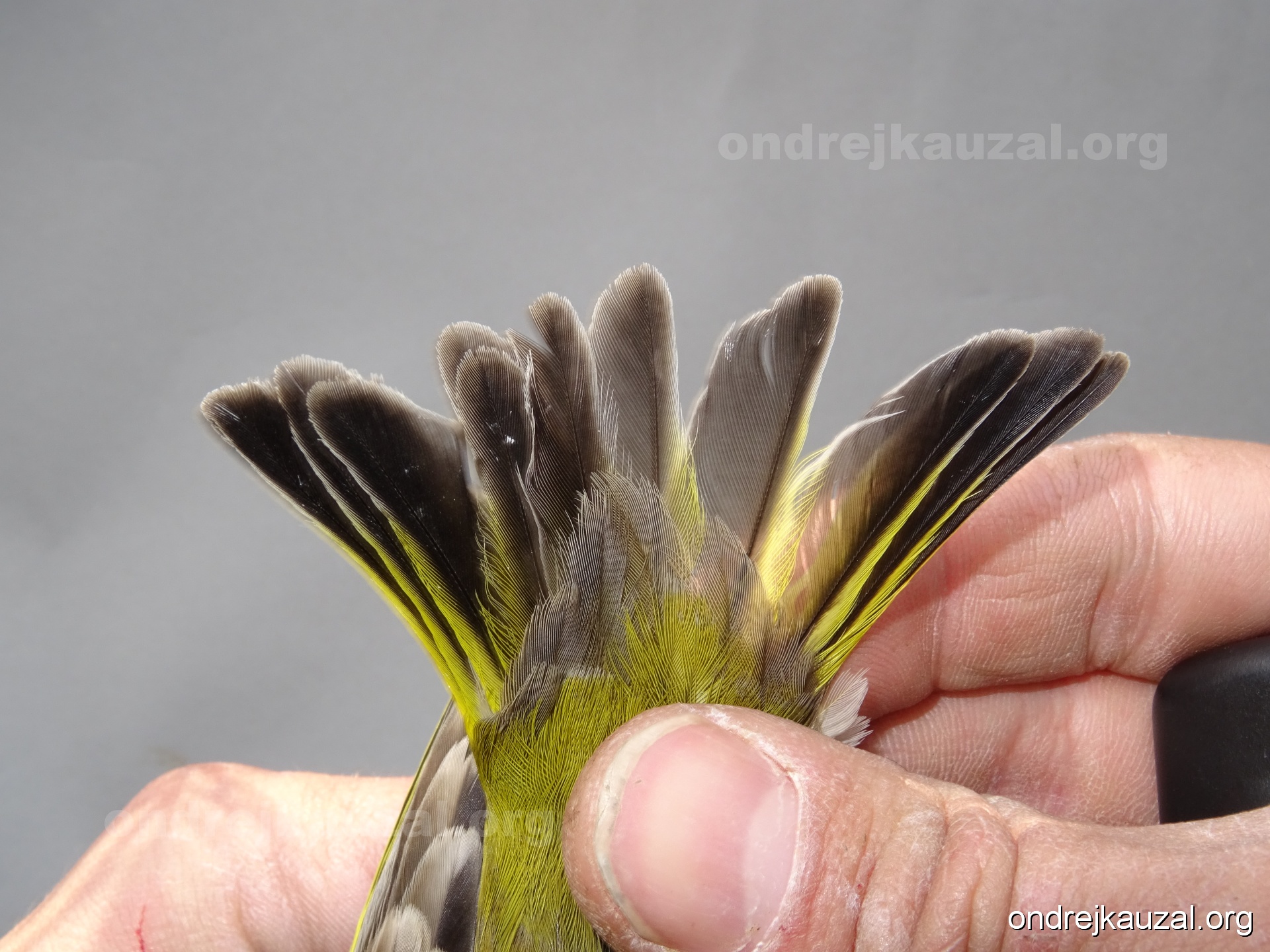 An interesting individual, albeit being in the first year of its life, it has moulted three of its primaries (P5 – P7). Greenfinches occasionally include moult of some primaries during their partial postjuvenile moult.