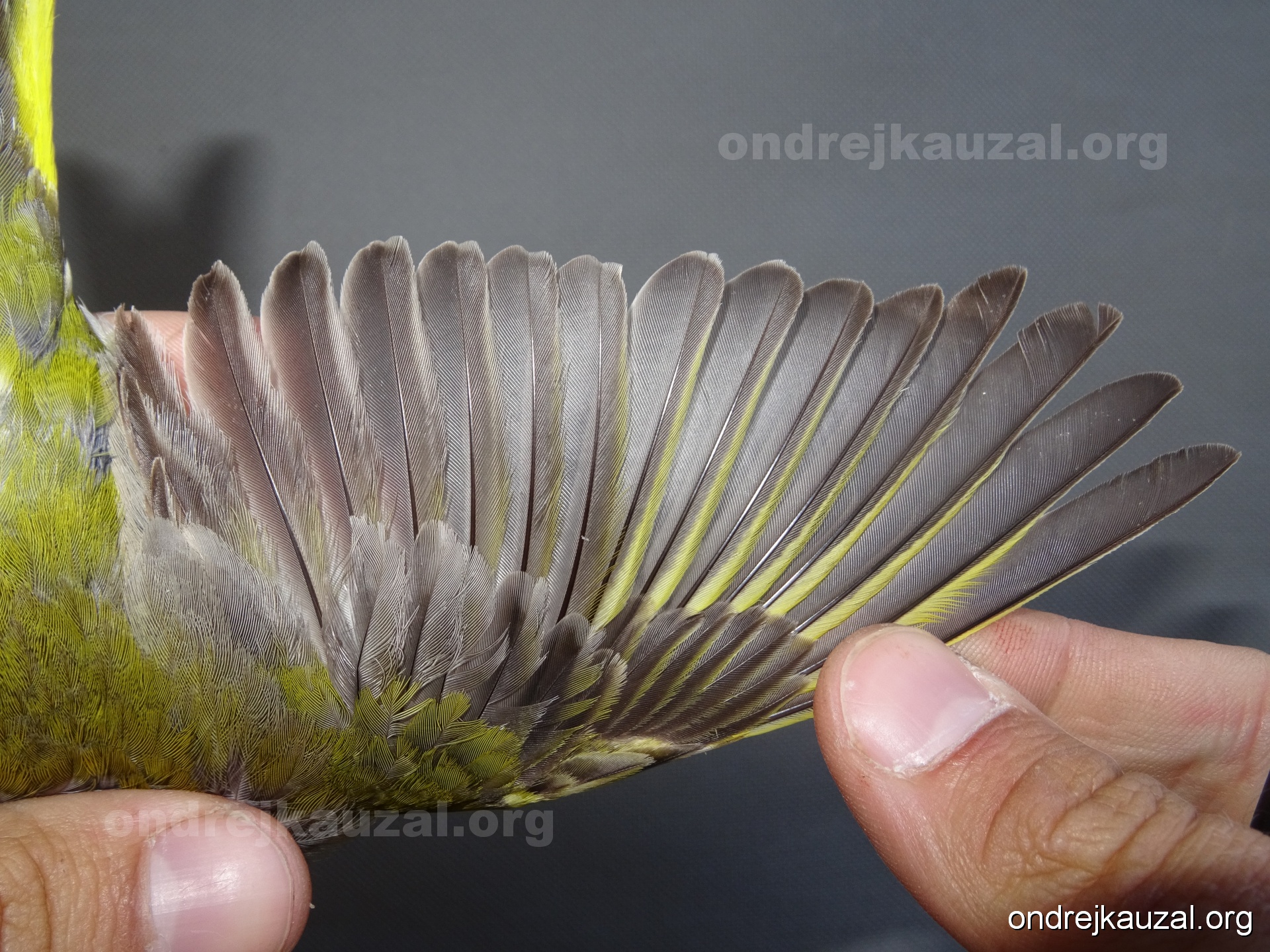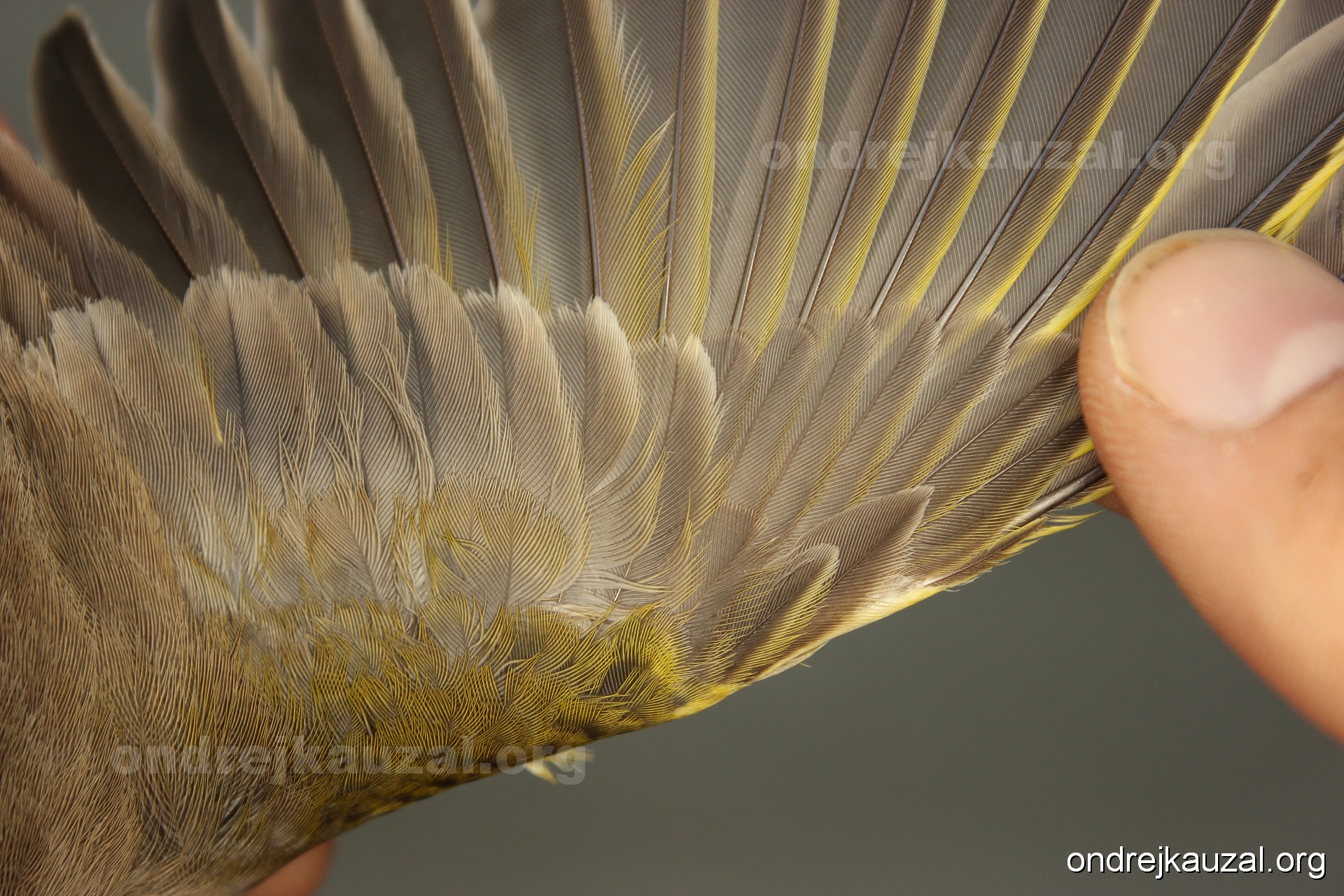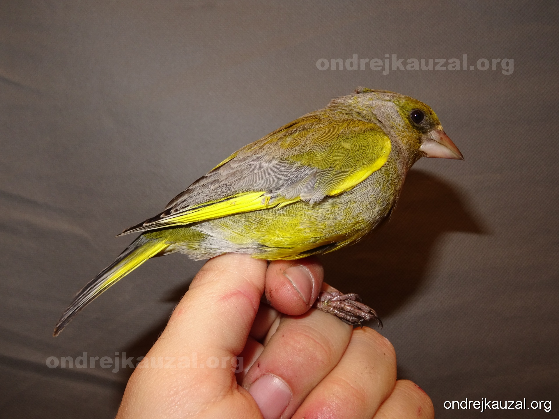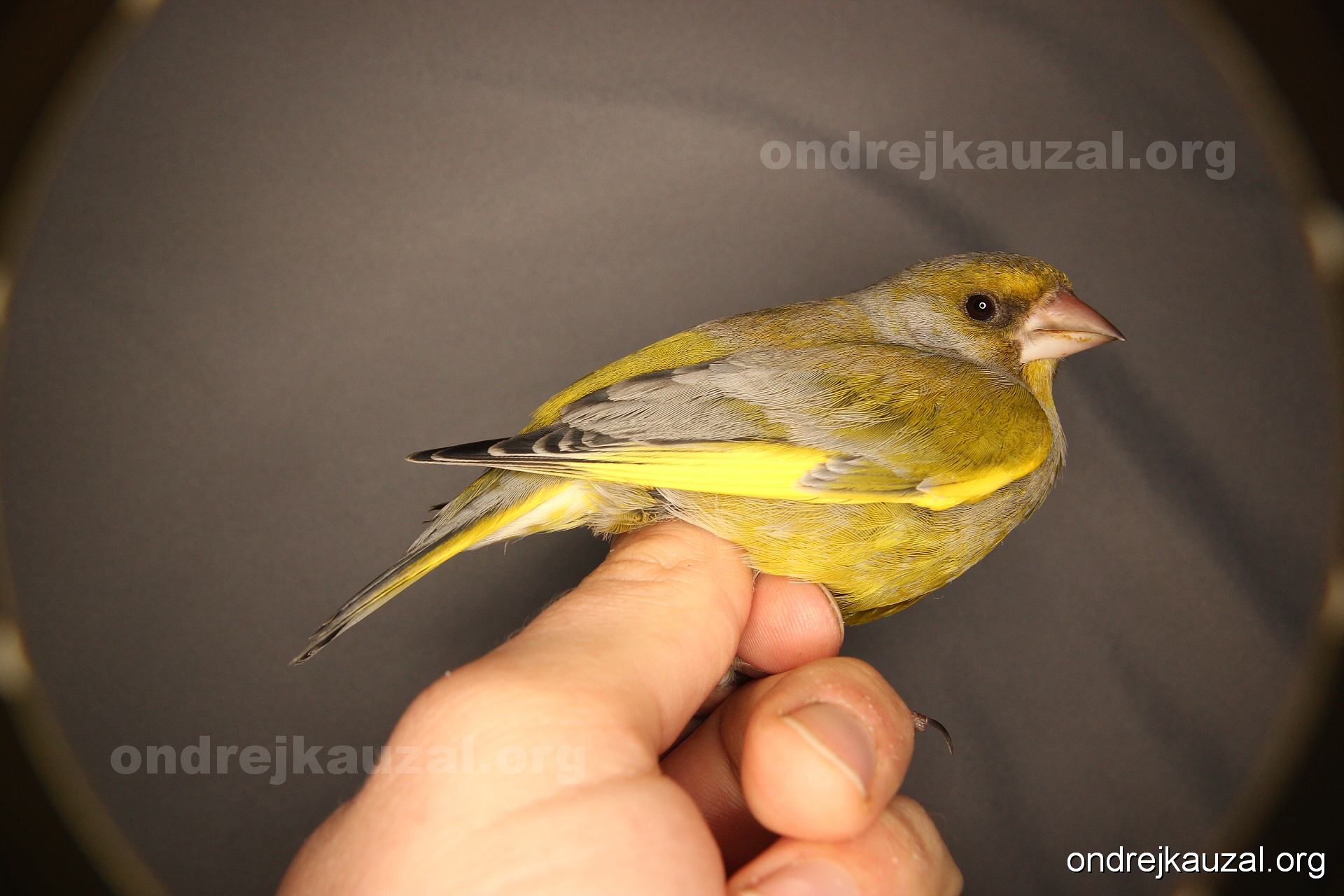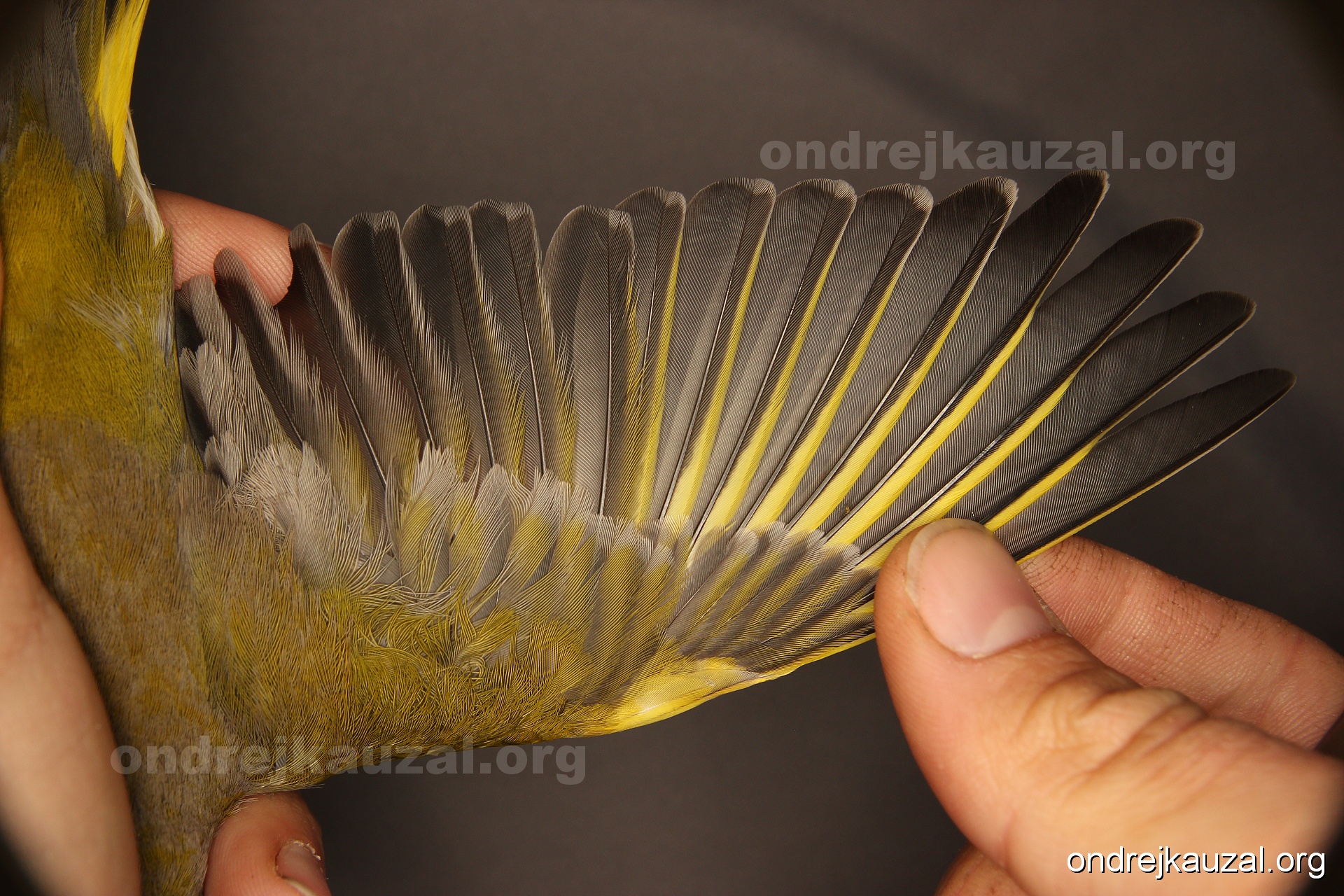 An interesting individual, albeit being in the first year of its life, it has moulted three of its primaries (P5 – P7). Greenfinches occasionally include moult of some primaries during their partial postjuvenile moult.