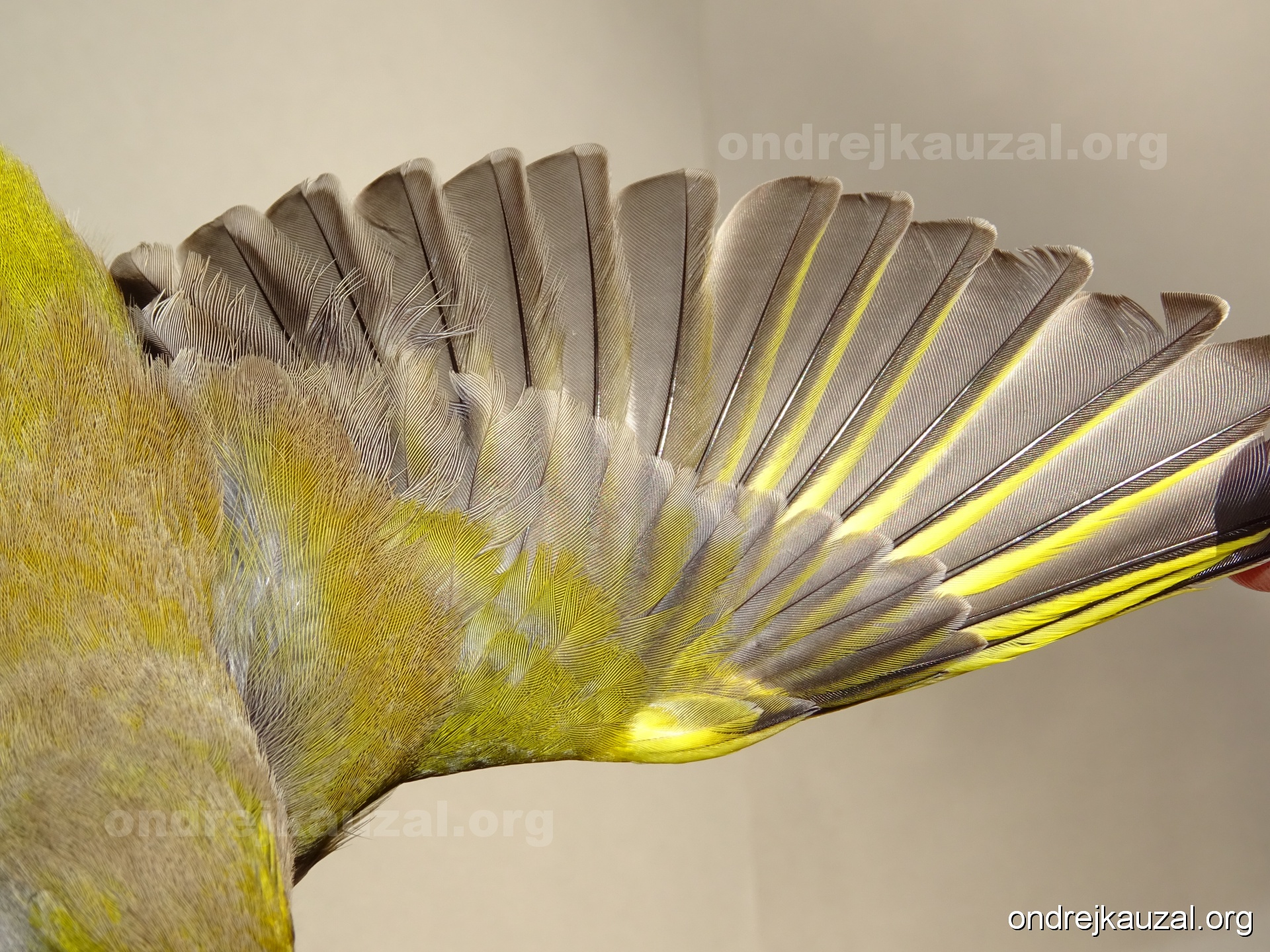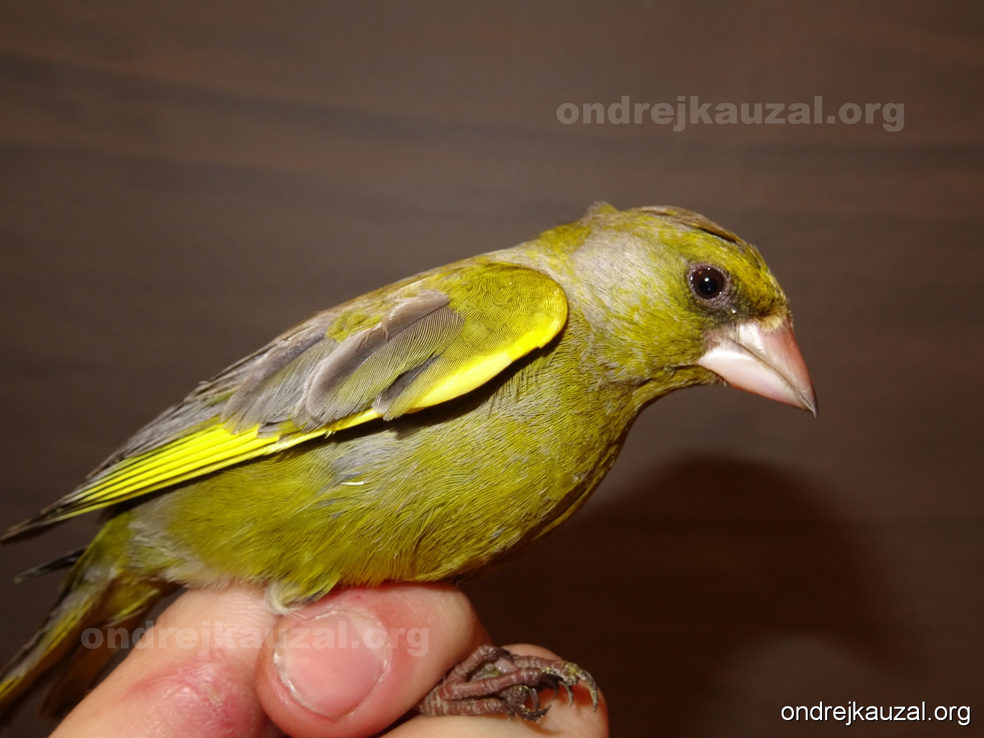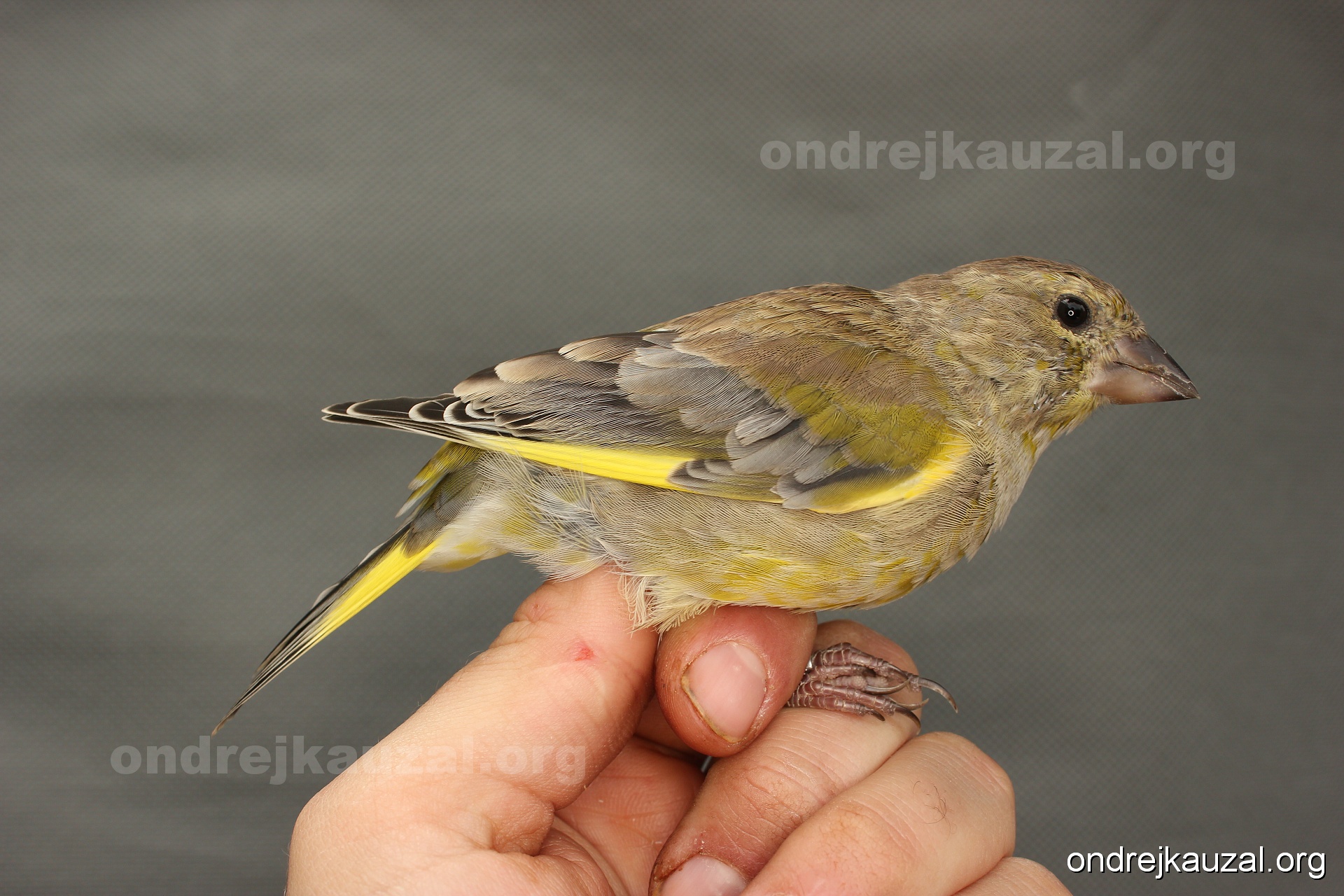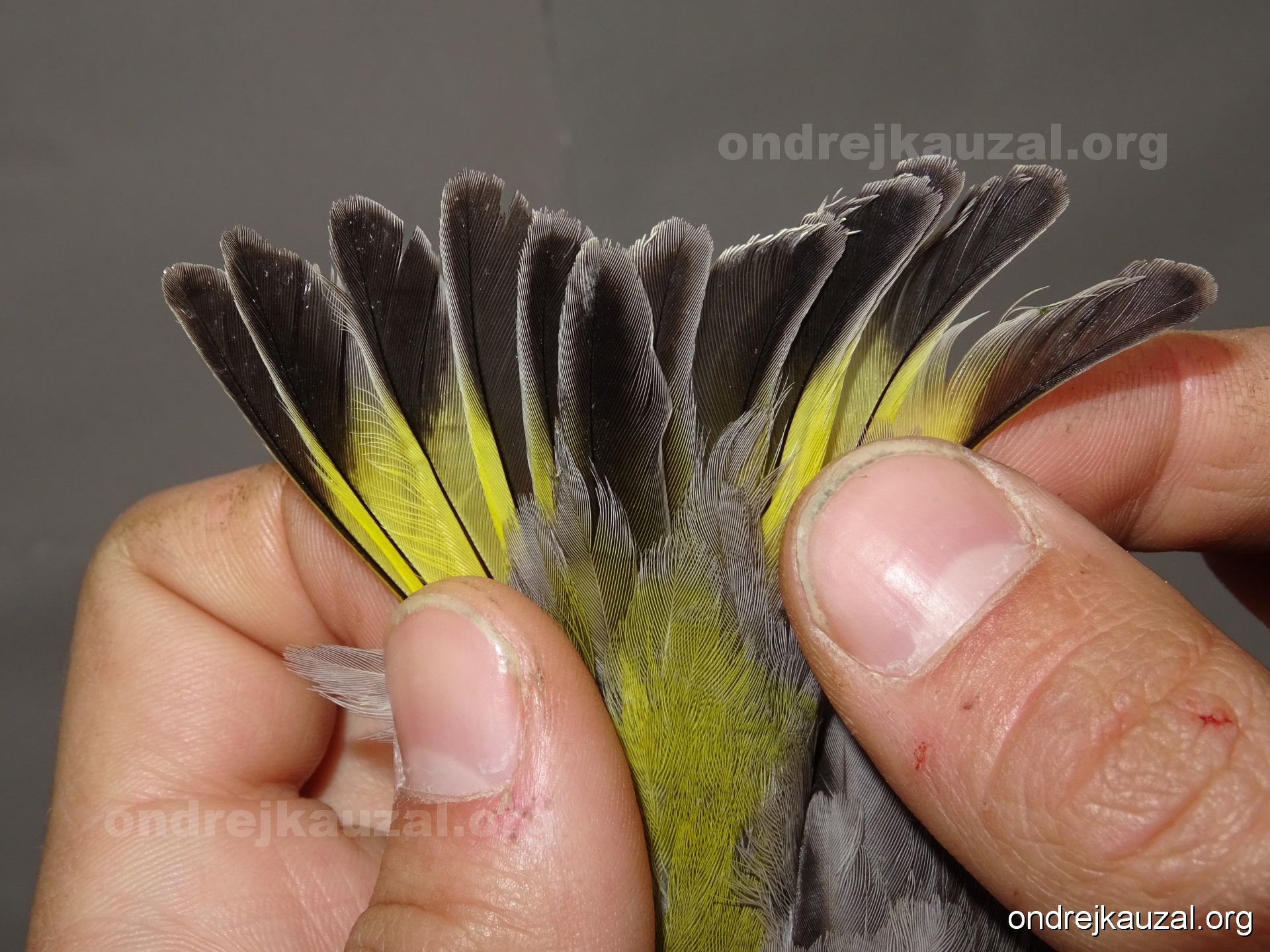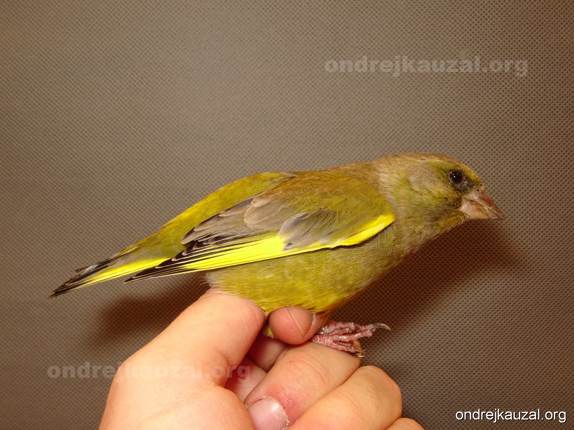 An interesting individual, albeit being in the first year of its life, it has moulted three of its primaries (P5 – P7). Greenfinches occasionally include moult of some primaries during their partial postjuvenile moult.