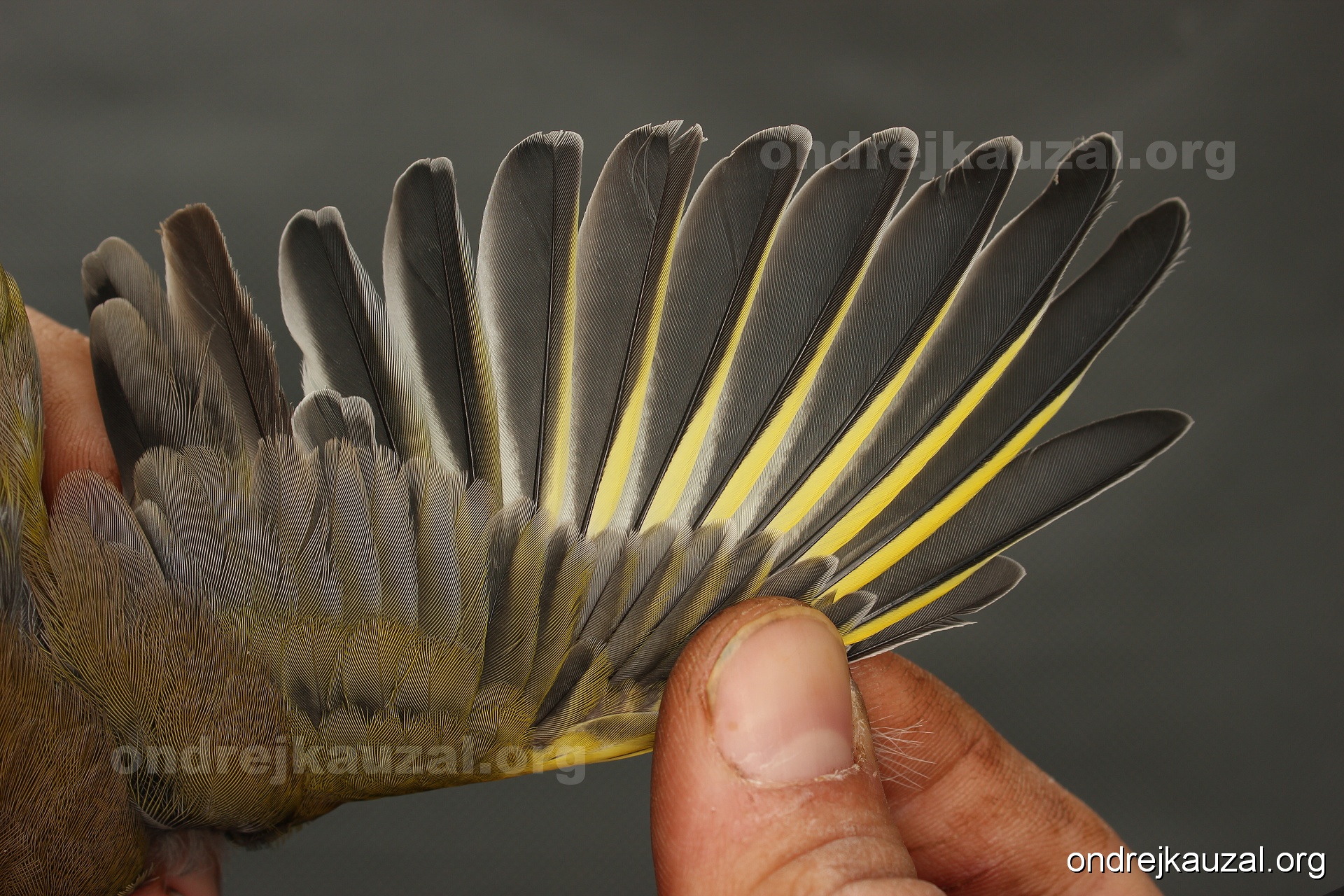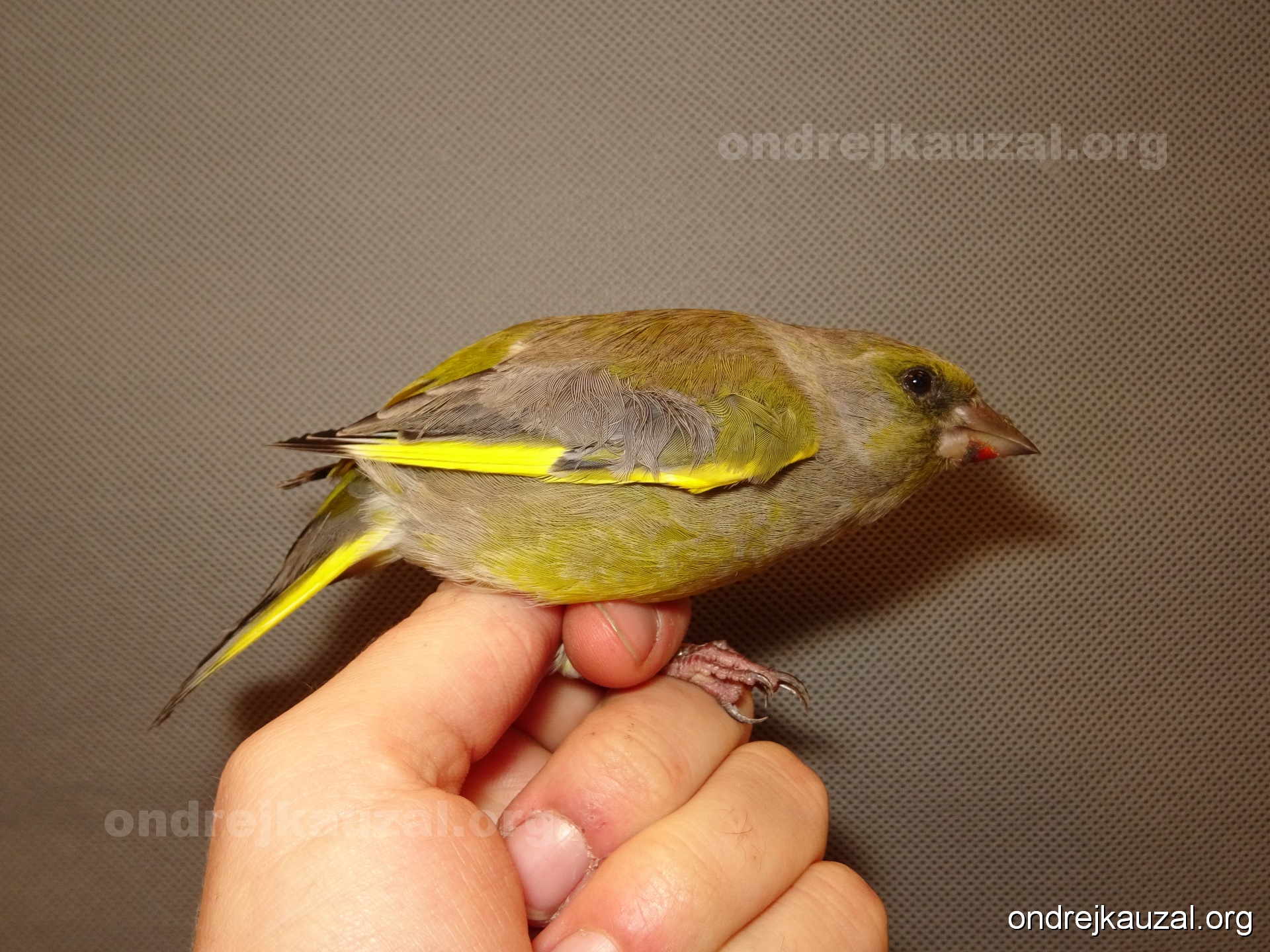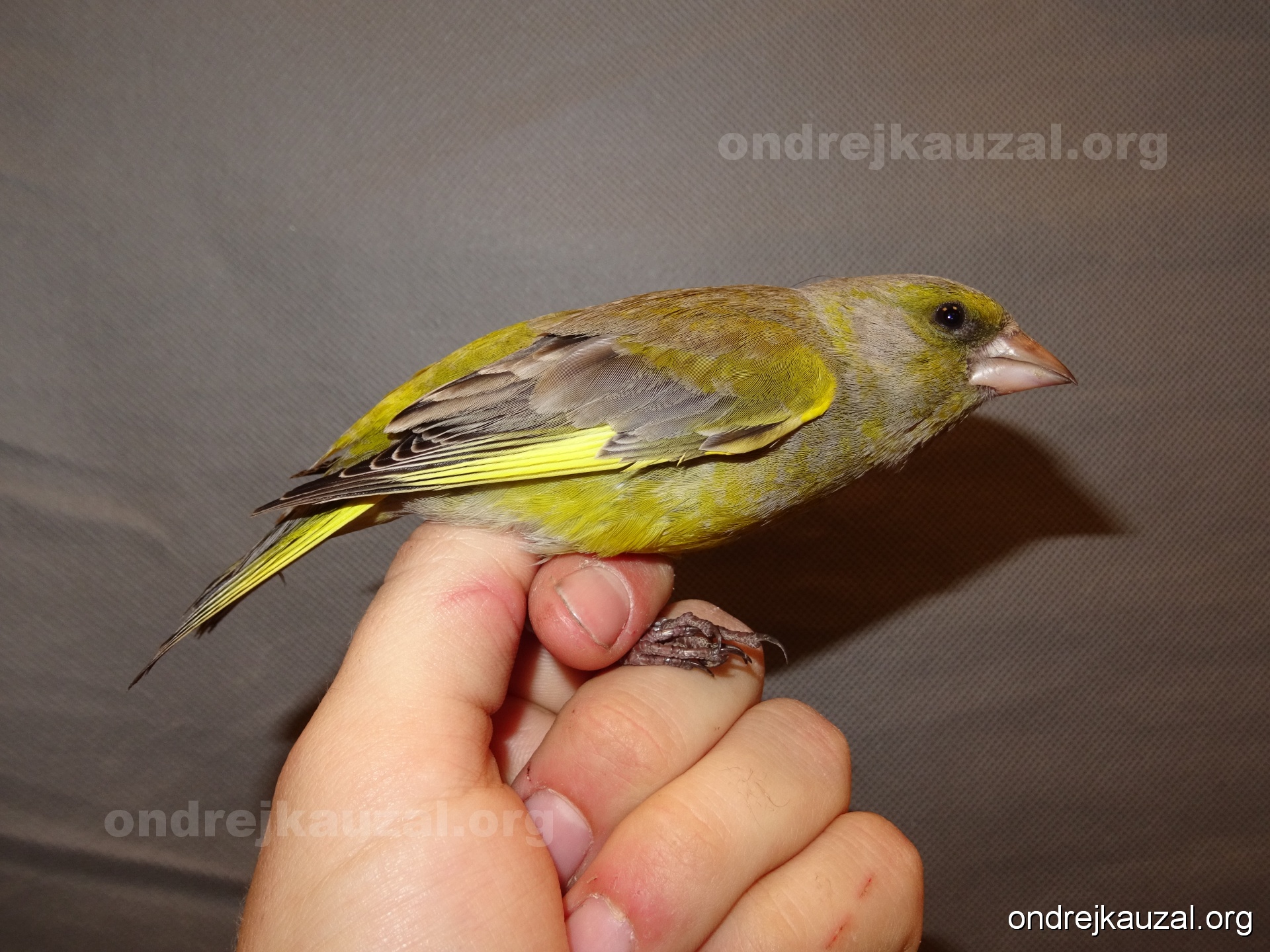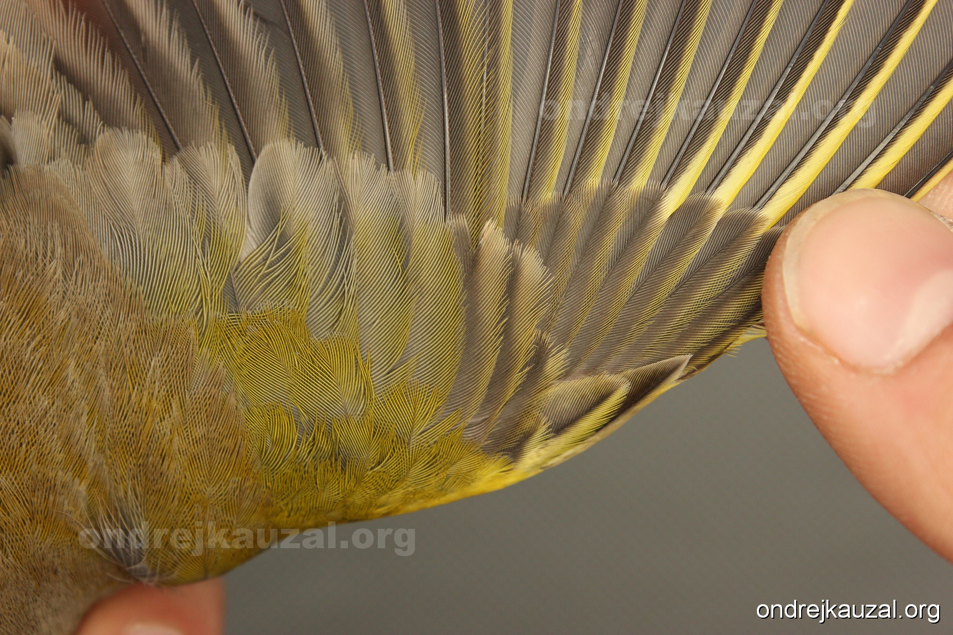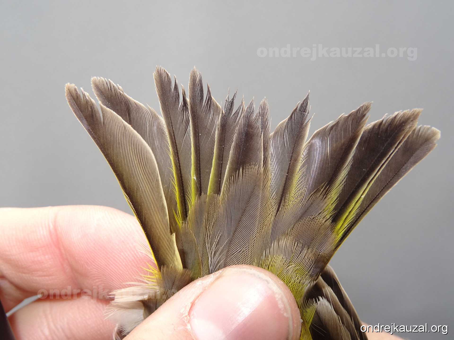 An interesting individual, albeit being in the first year of its life, it has moulted three of its primaries (P5 – P7). Greenfinches occasionally include moult of some primaries during their partial postjuvenile moult.