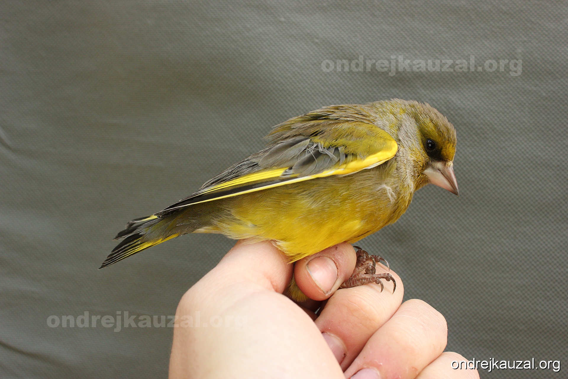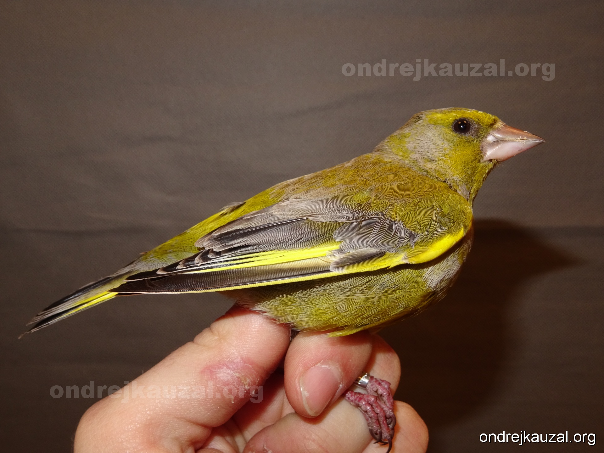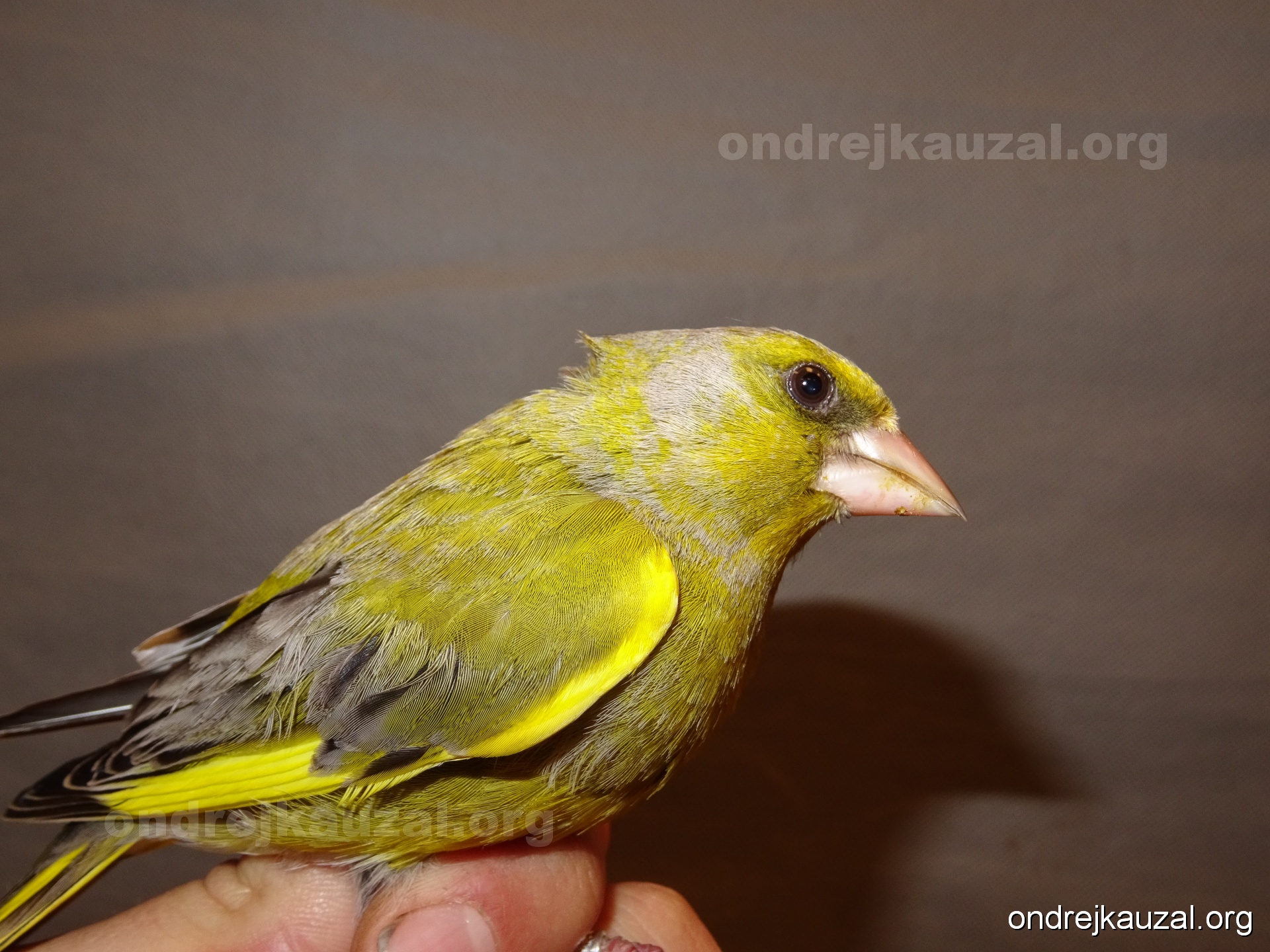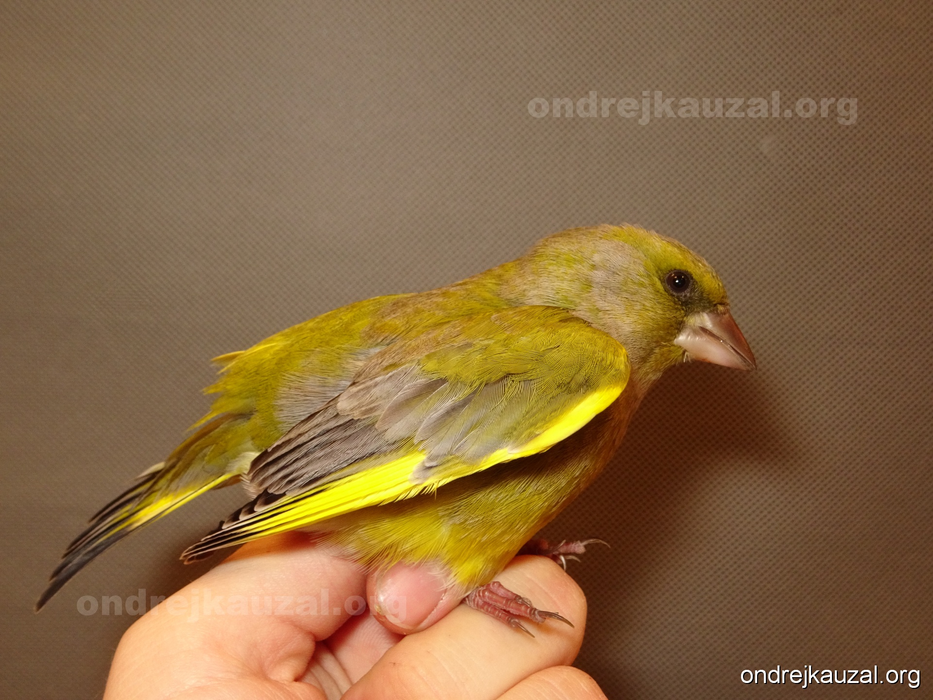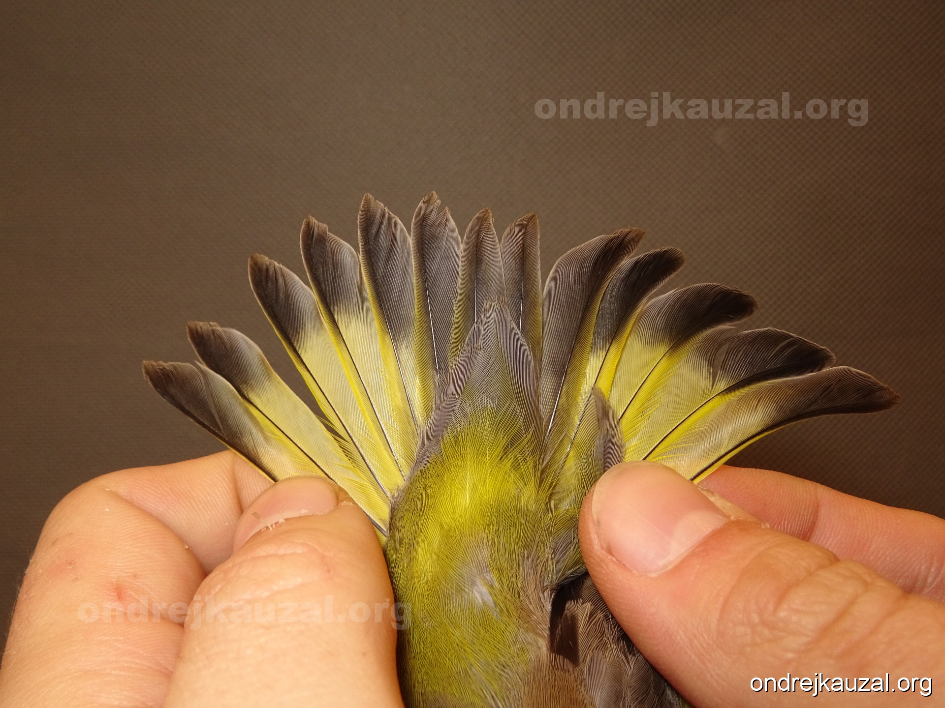 An interesting individual, albeit being in the first year of its life, it has moulted three of its primaries (P5 – P7). Greenfinches occasionally include moult of some primaries during their partial postjuvenile moult.