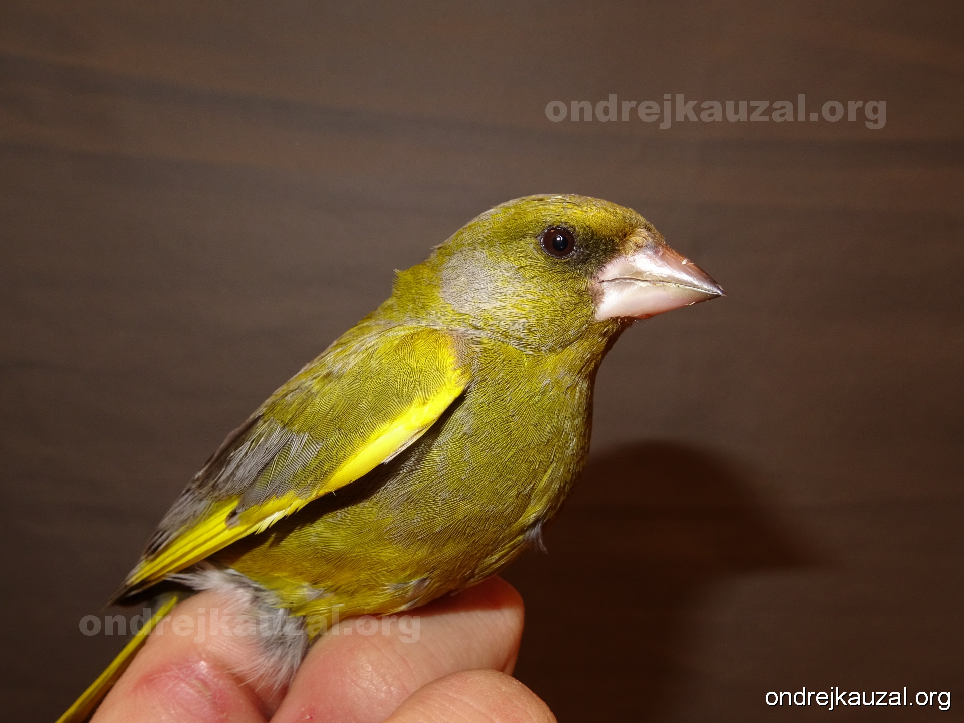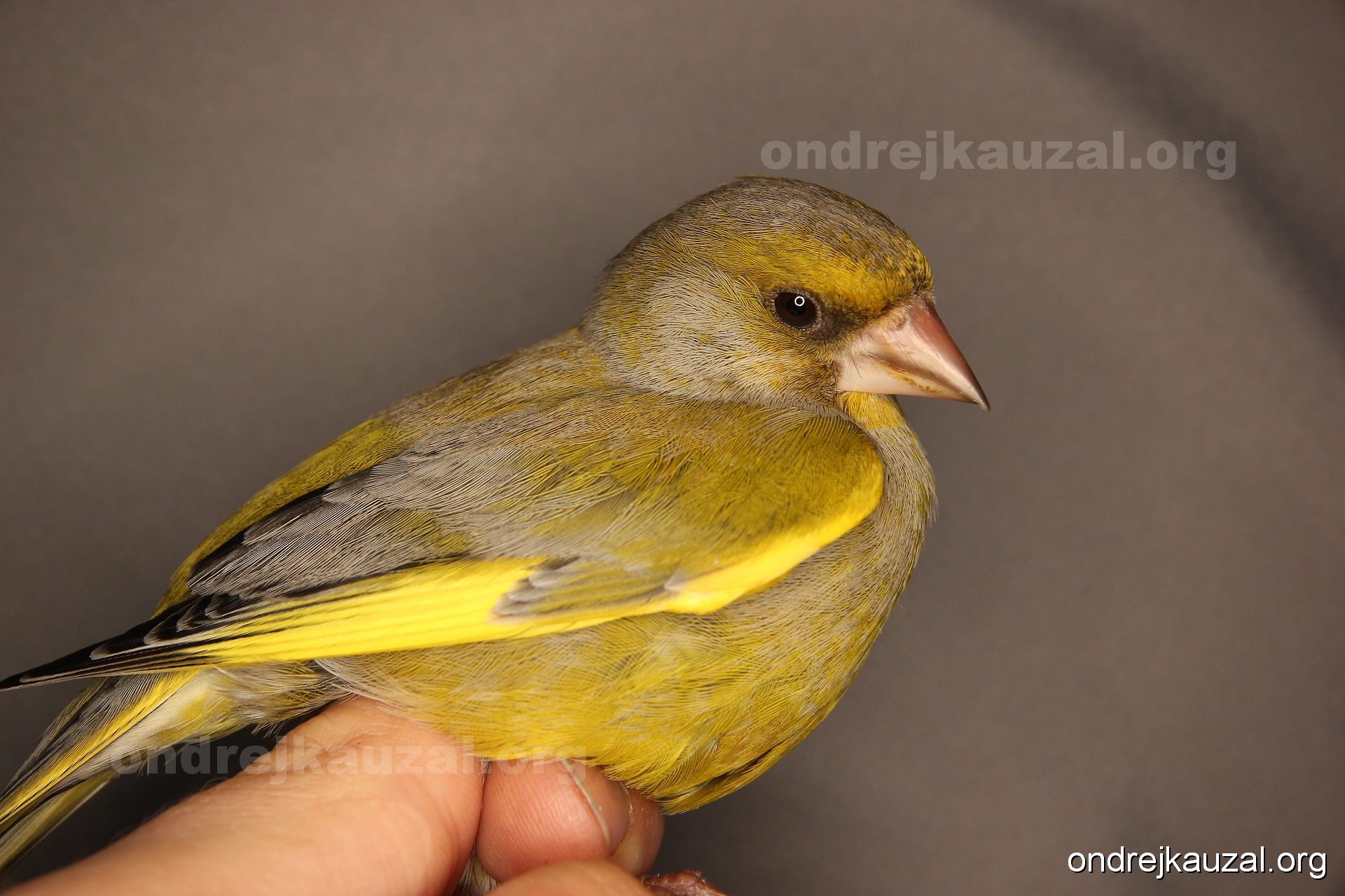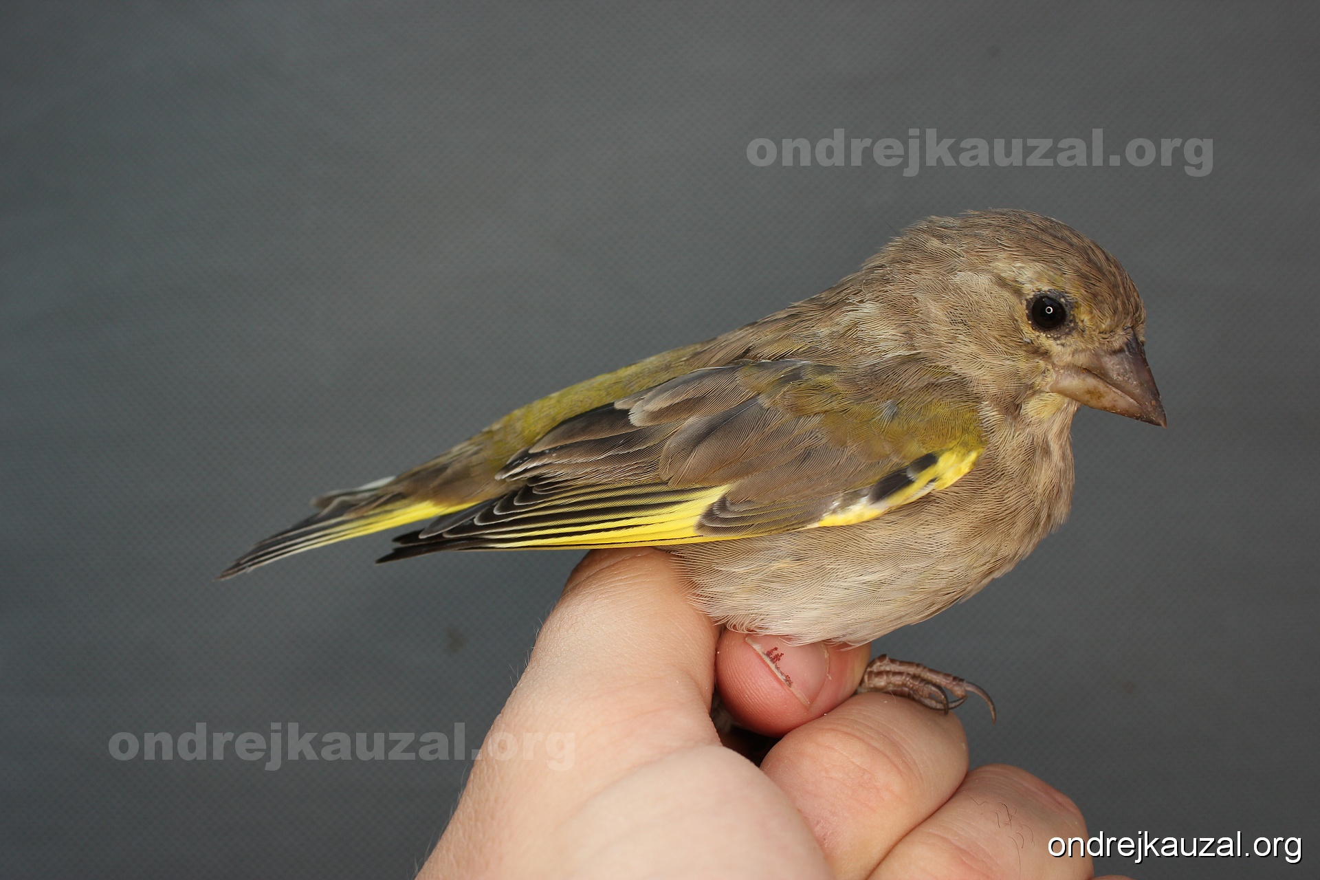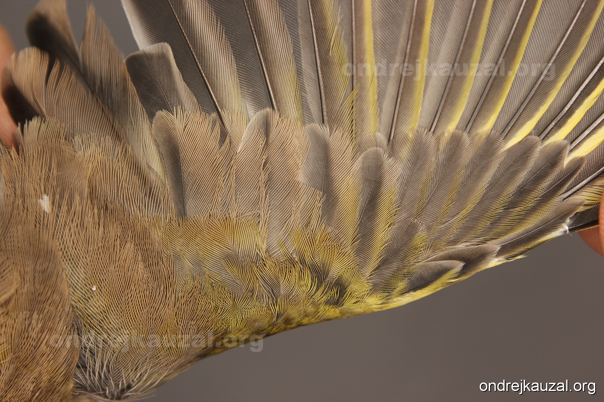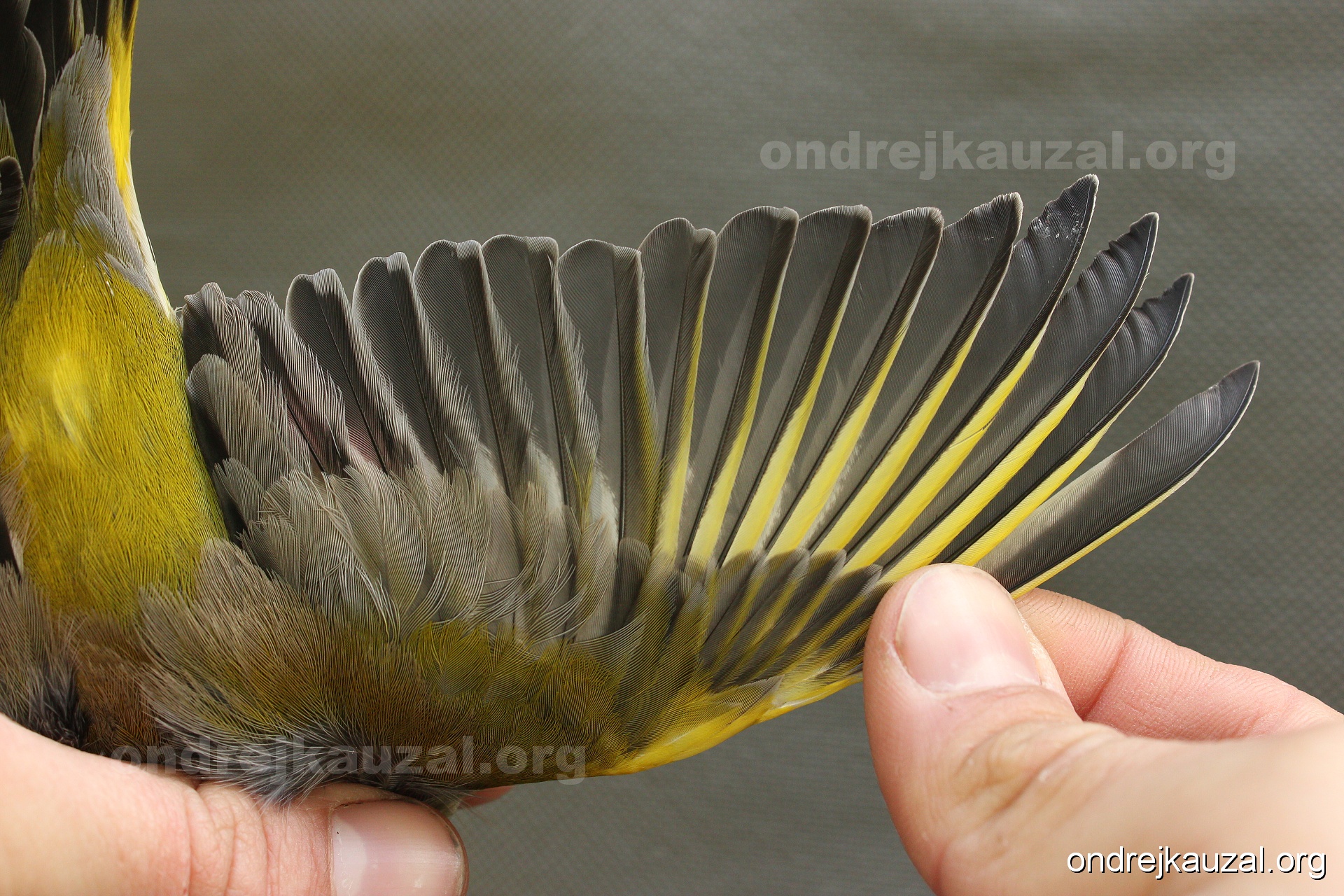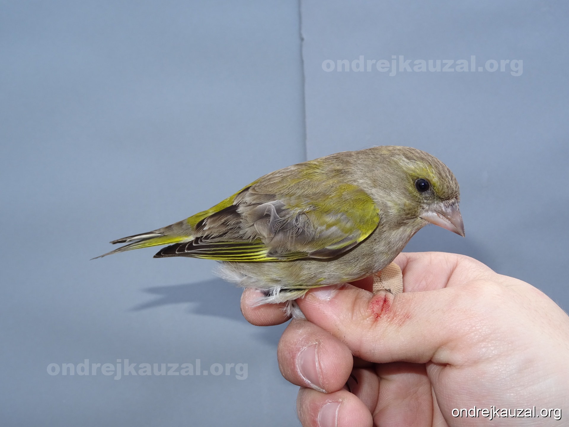 An interesting individual, albeit being in the first year of its life, it has moulted three of its primaries (P5 – P7). Greenfinches occasionally include moult of some primaries during their partial postjuvenile moult.