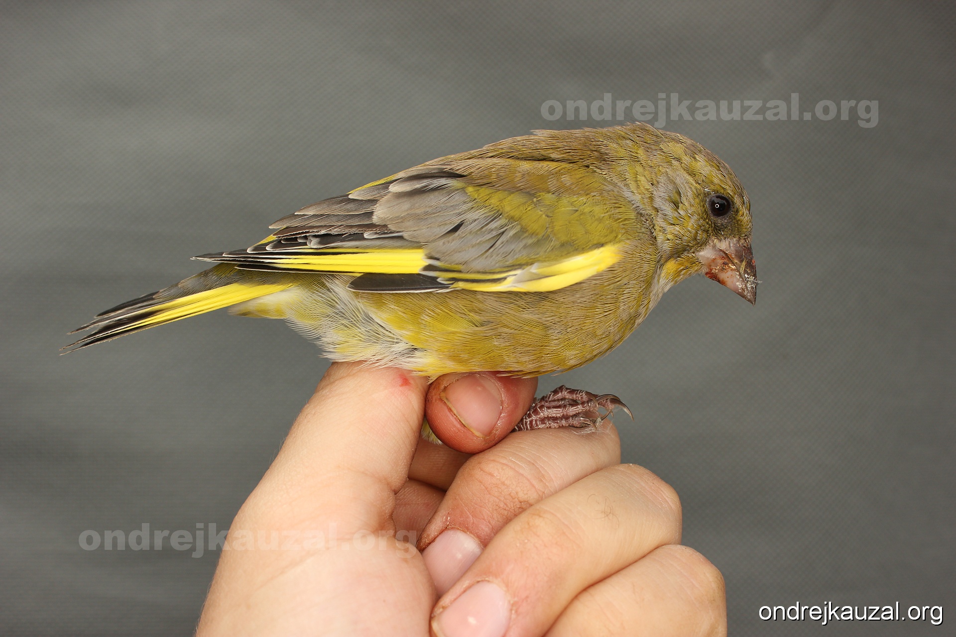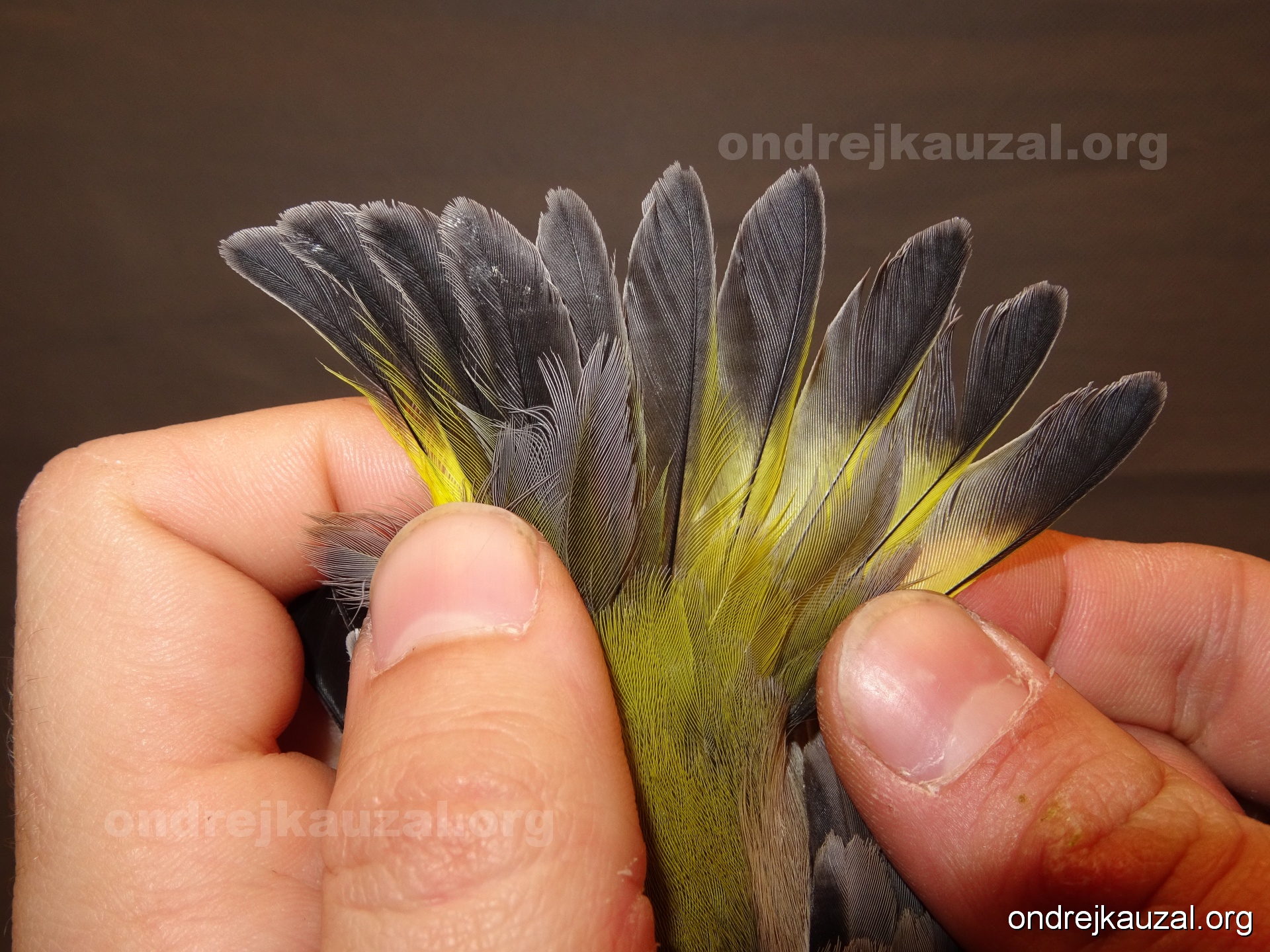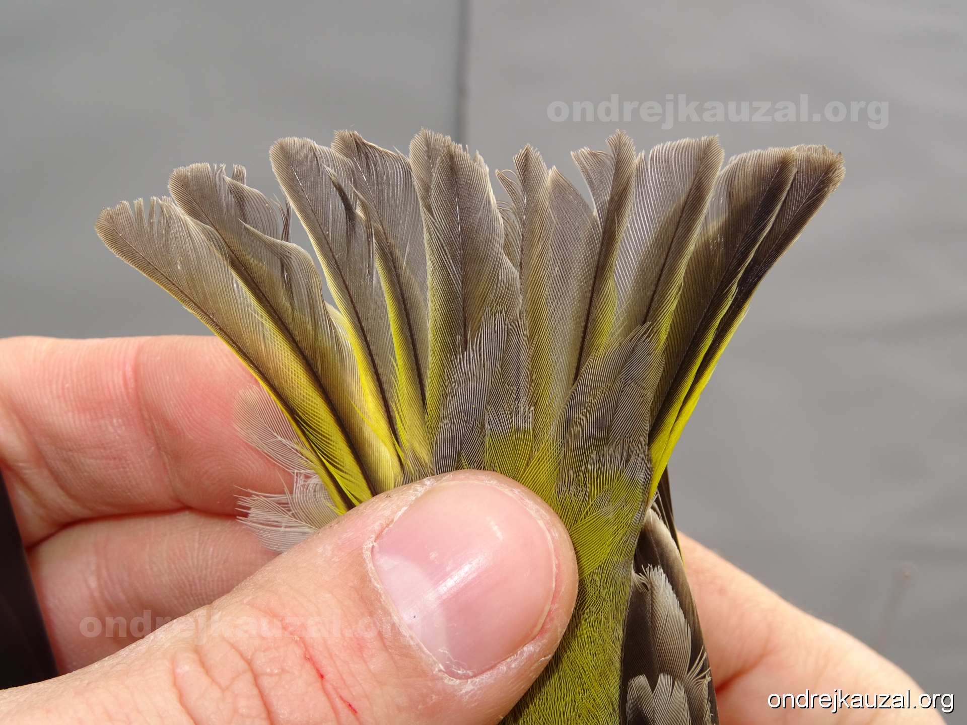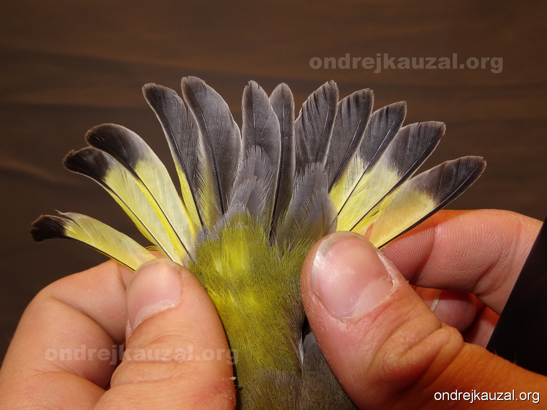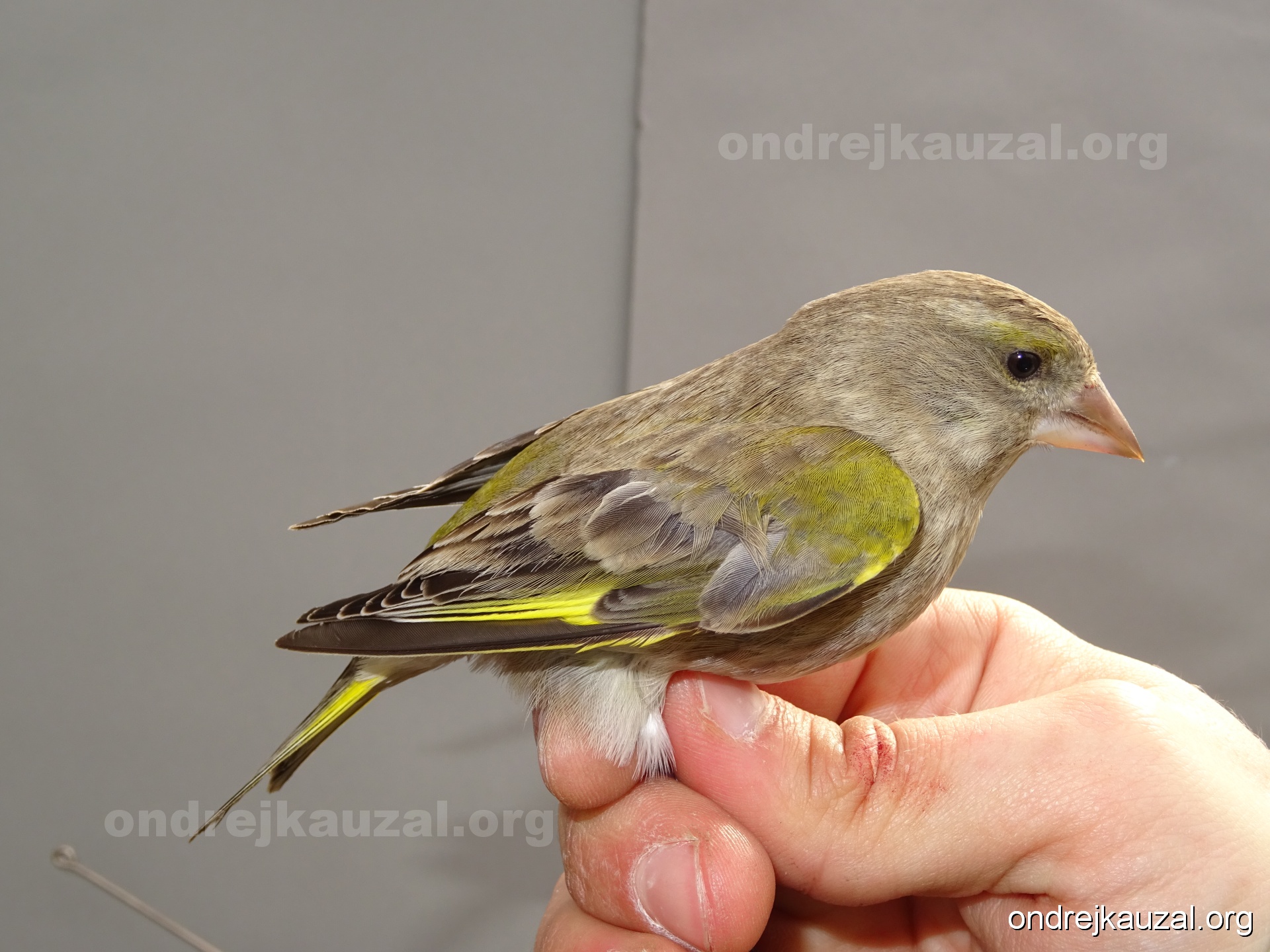 An interesting individual, albeit being in the first year of its life, it has moulted three of its primaries (P5 – P7). Greenfinches occasionally include moult of some primaries during their partial postjuvenile moult.