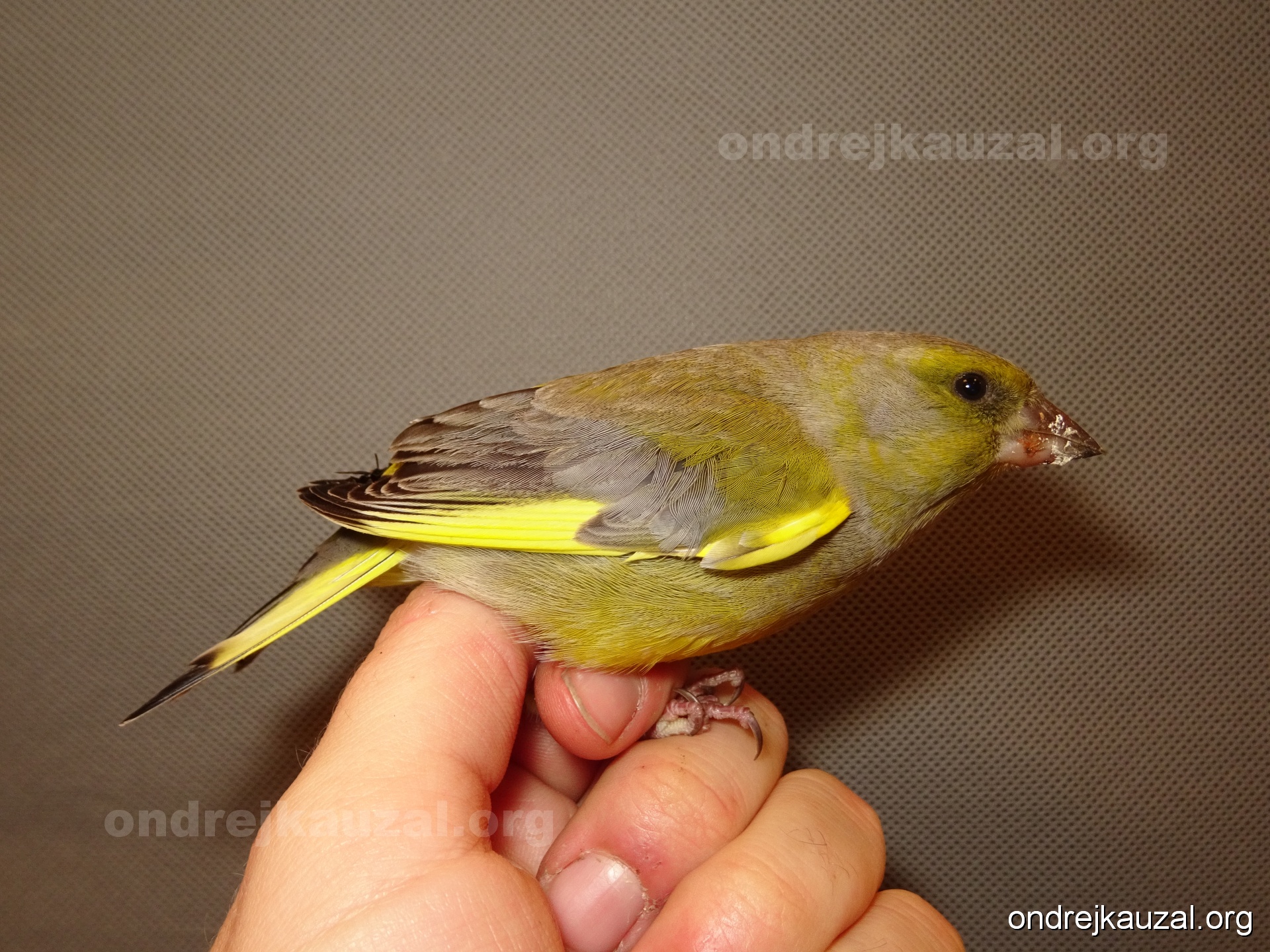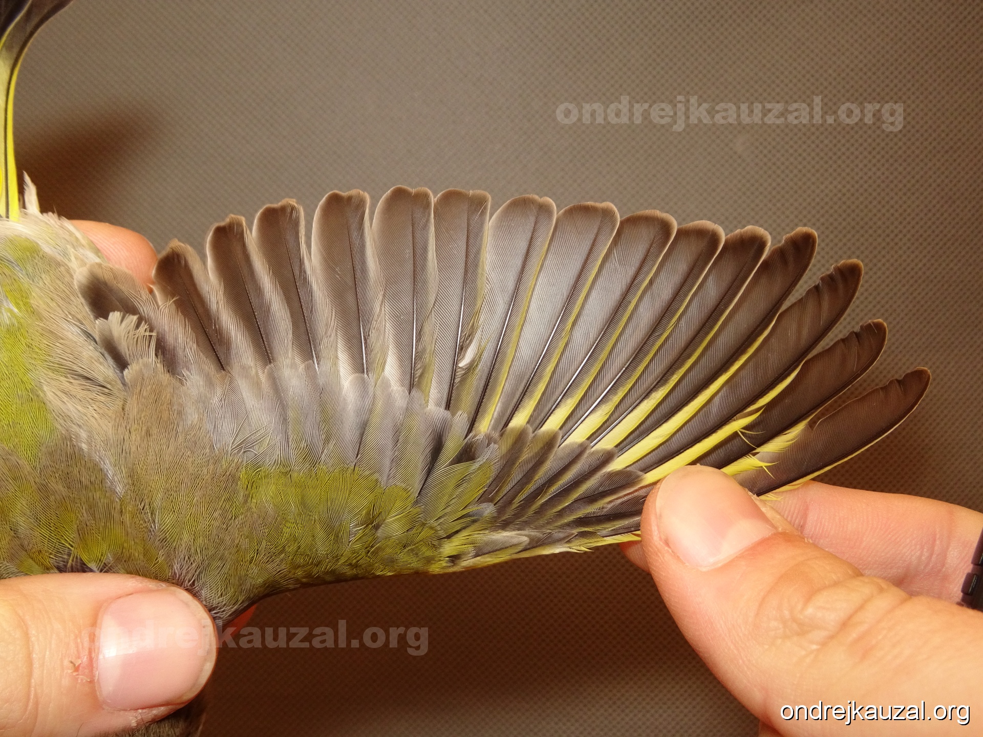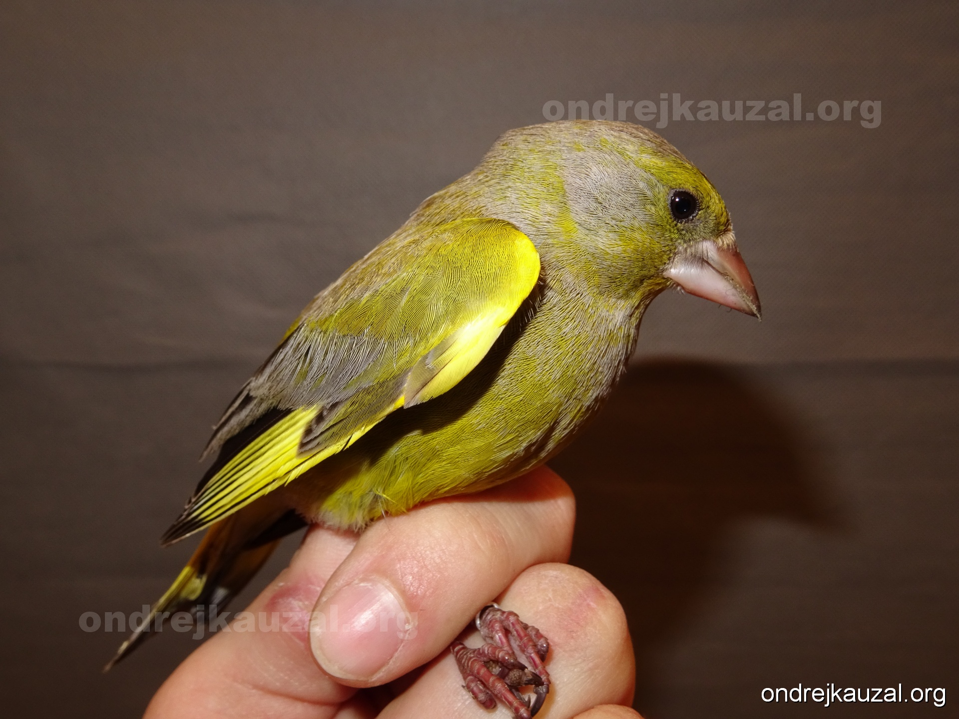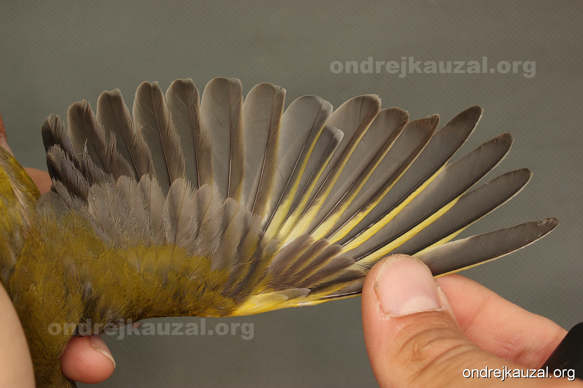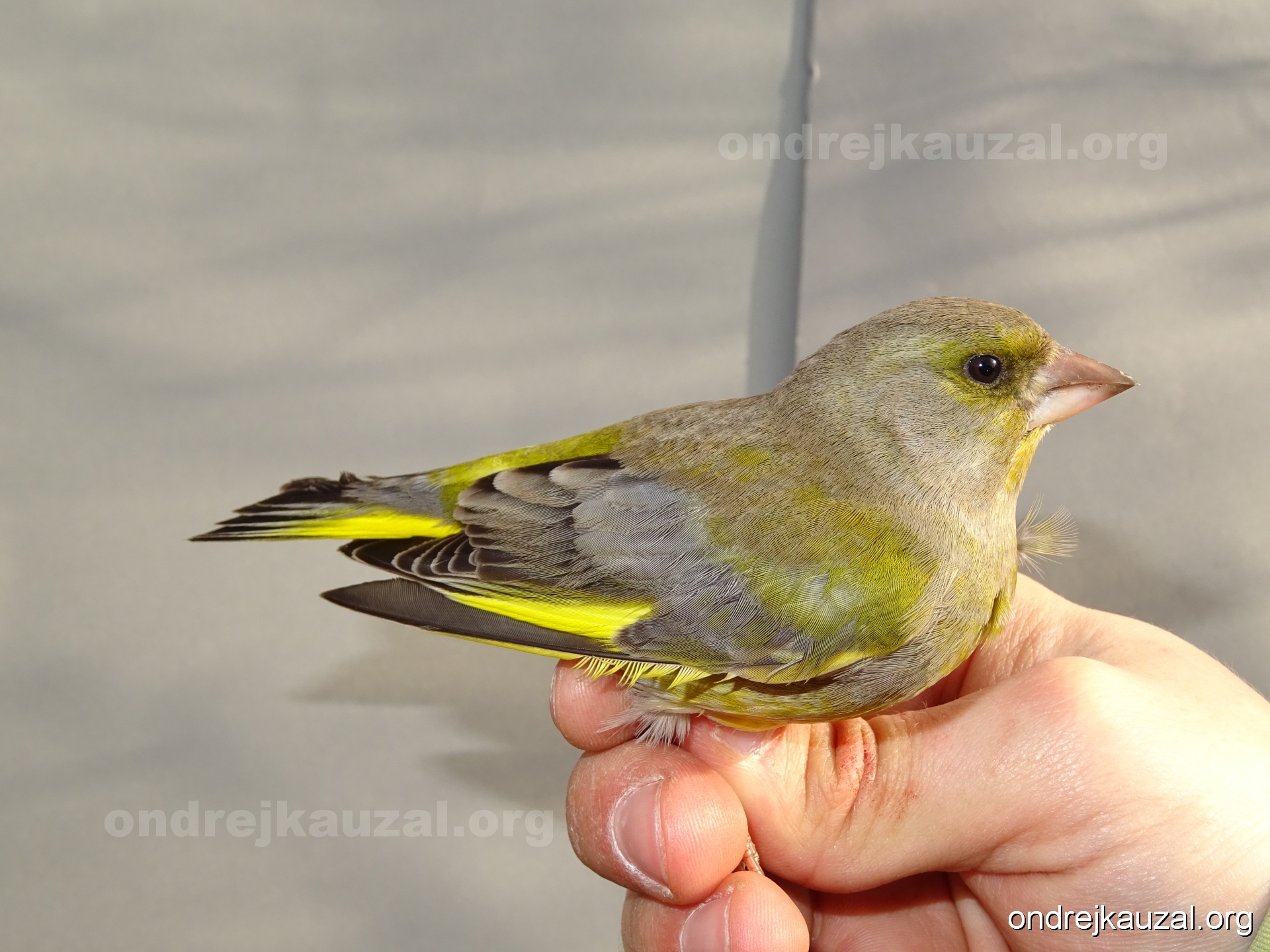 An interesting individual, albeit being in the first year of its life, it has moulted three of its primaries (P5 – P7). Greenfinches occasionally include moult of some primaries during their partial postjuvenile moult.