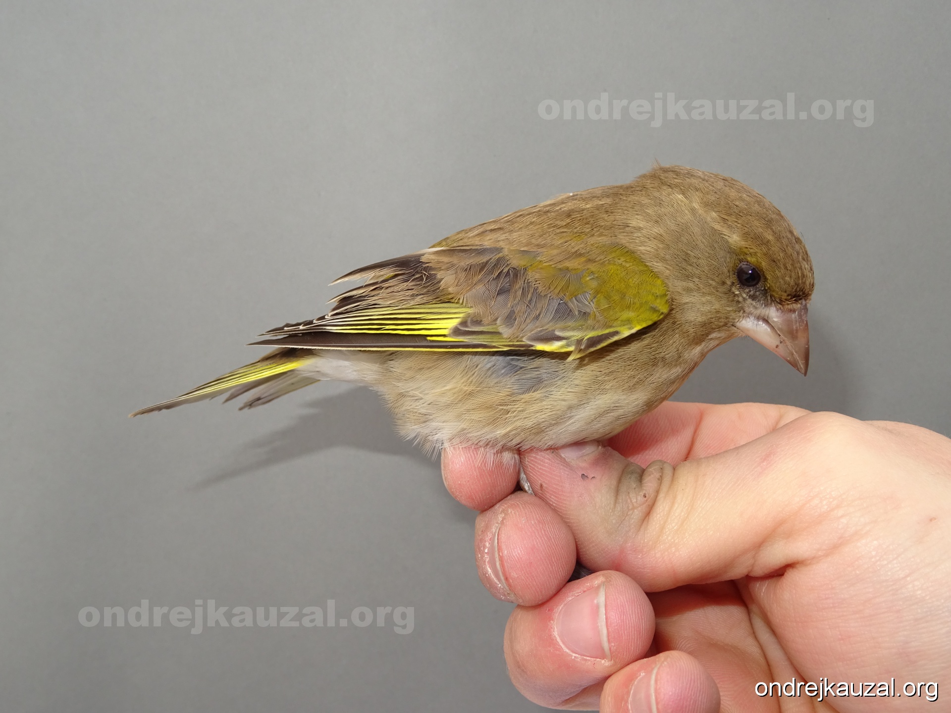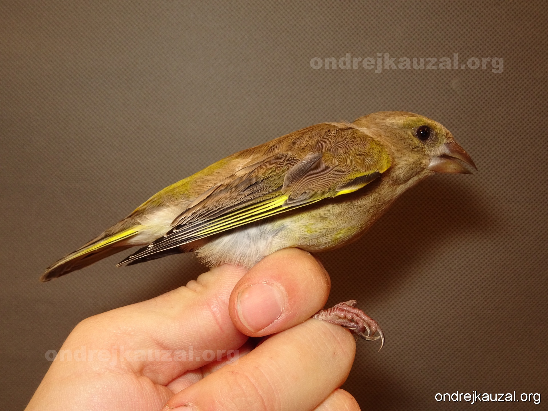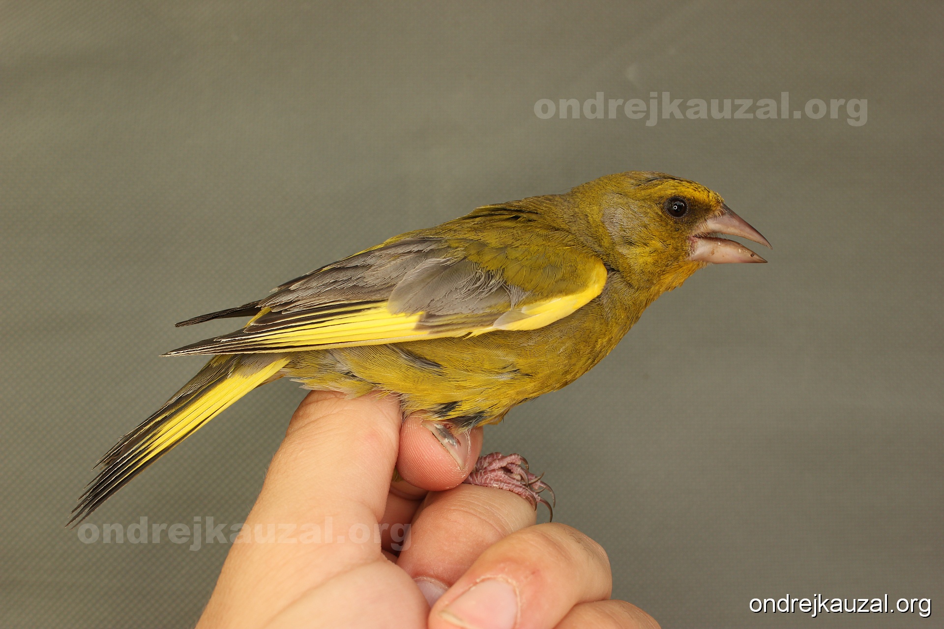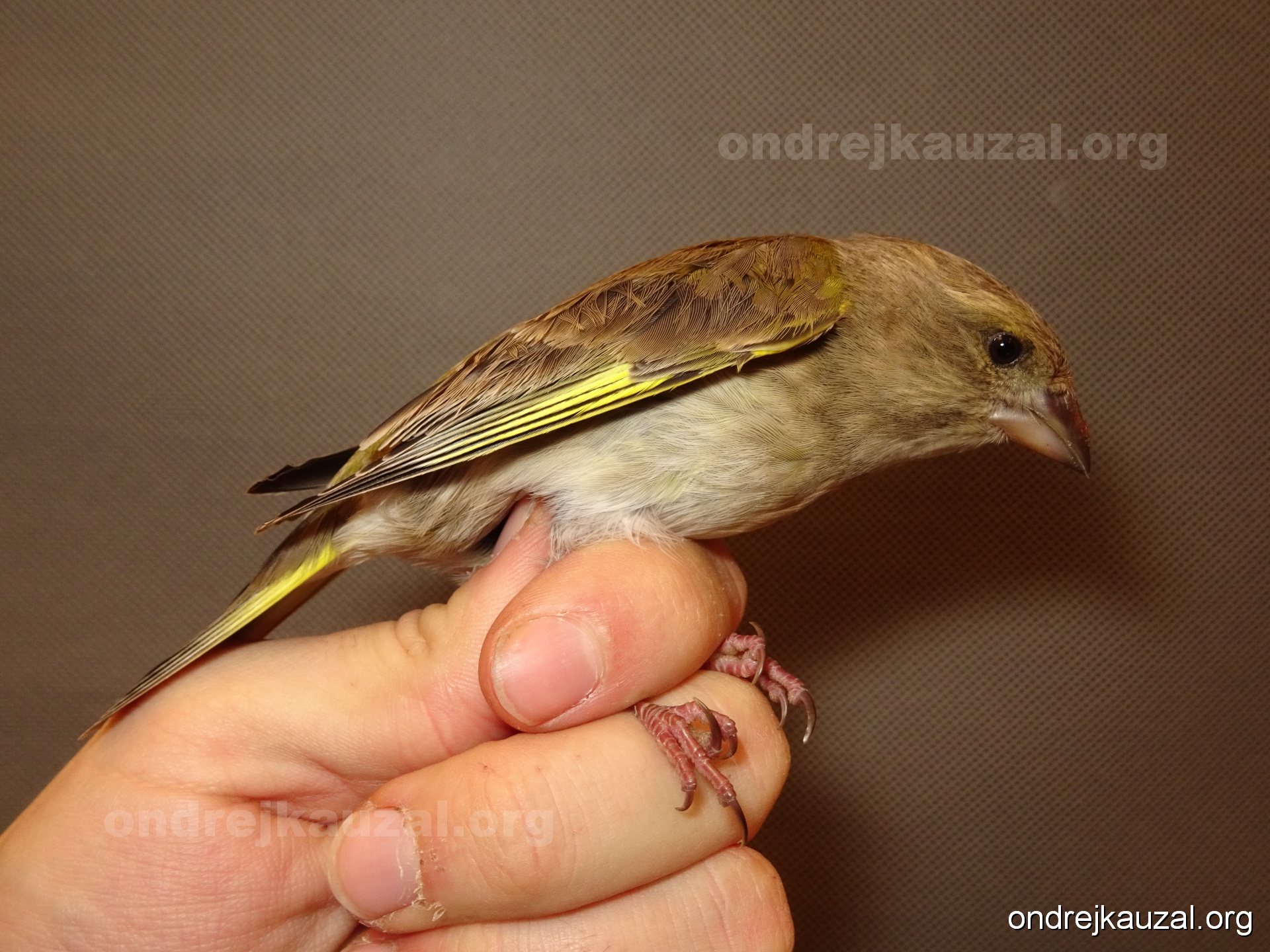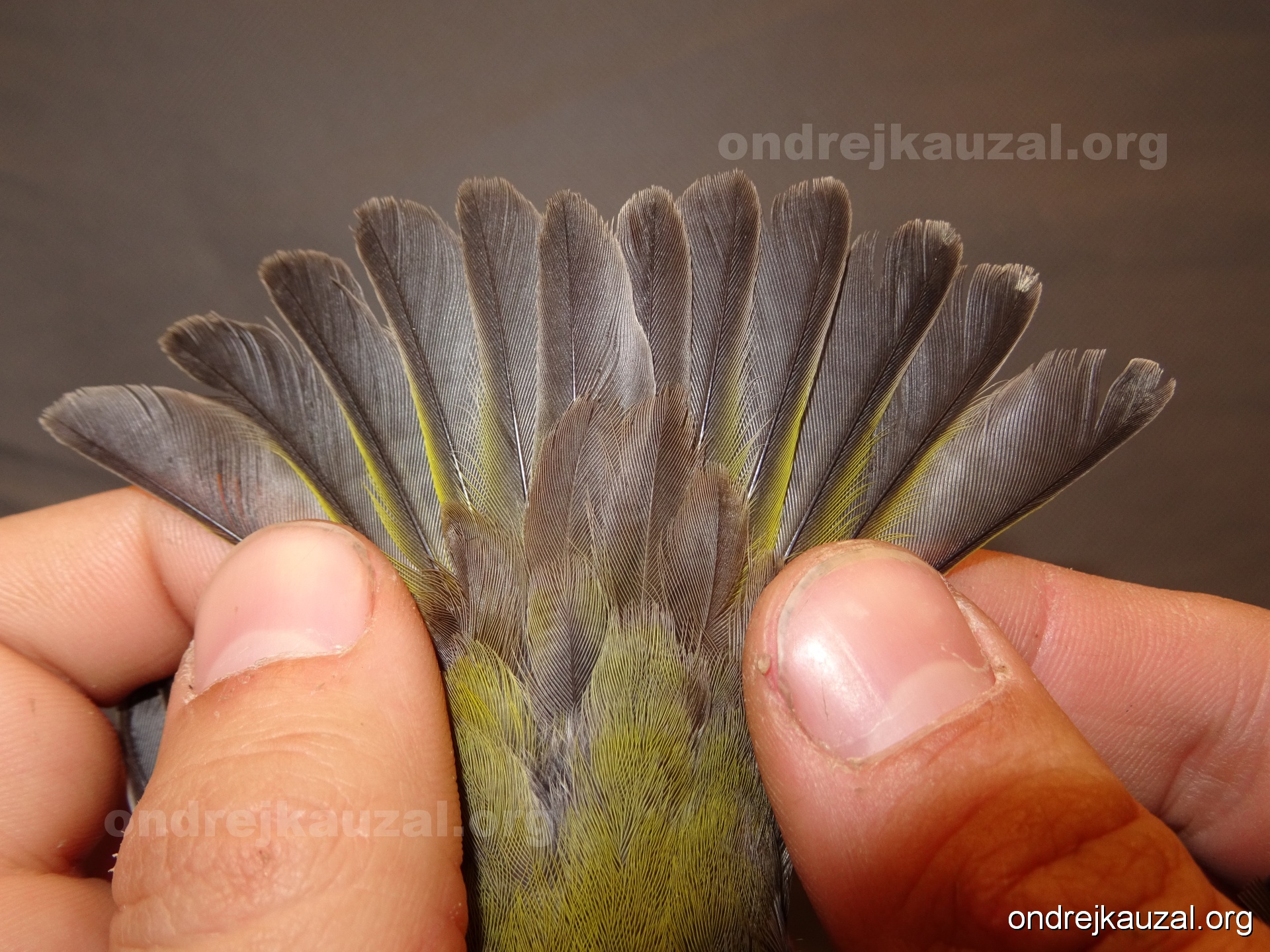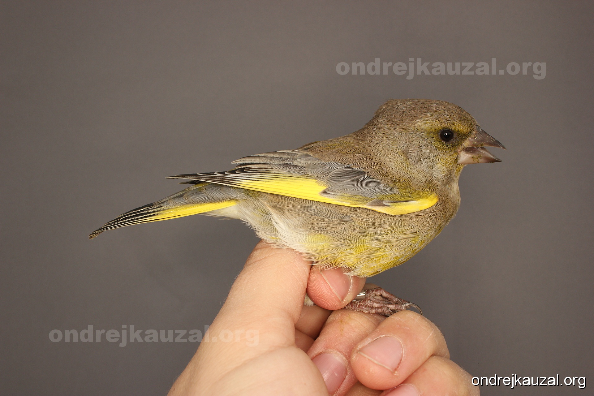 An interesting individual, albeit being in the first year of its life, it has moulted three of its primaries (P5 – P7). Greenfinches occasionally include moult of some primaries during their partial postjuvenile moult.