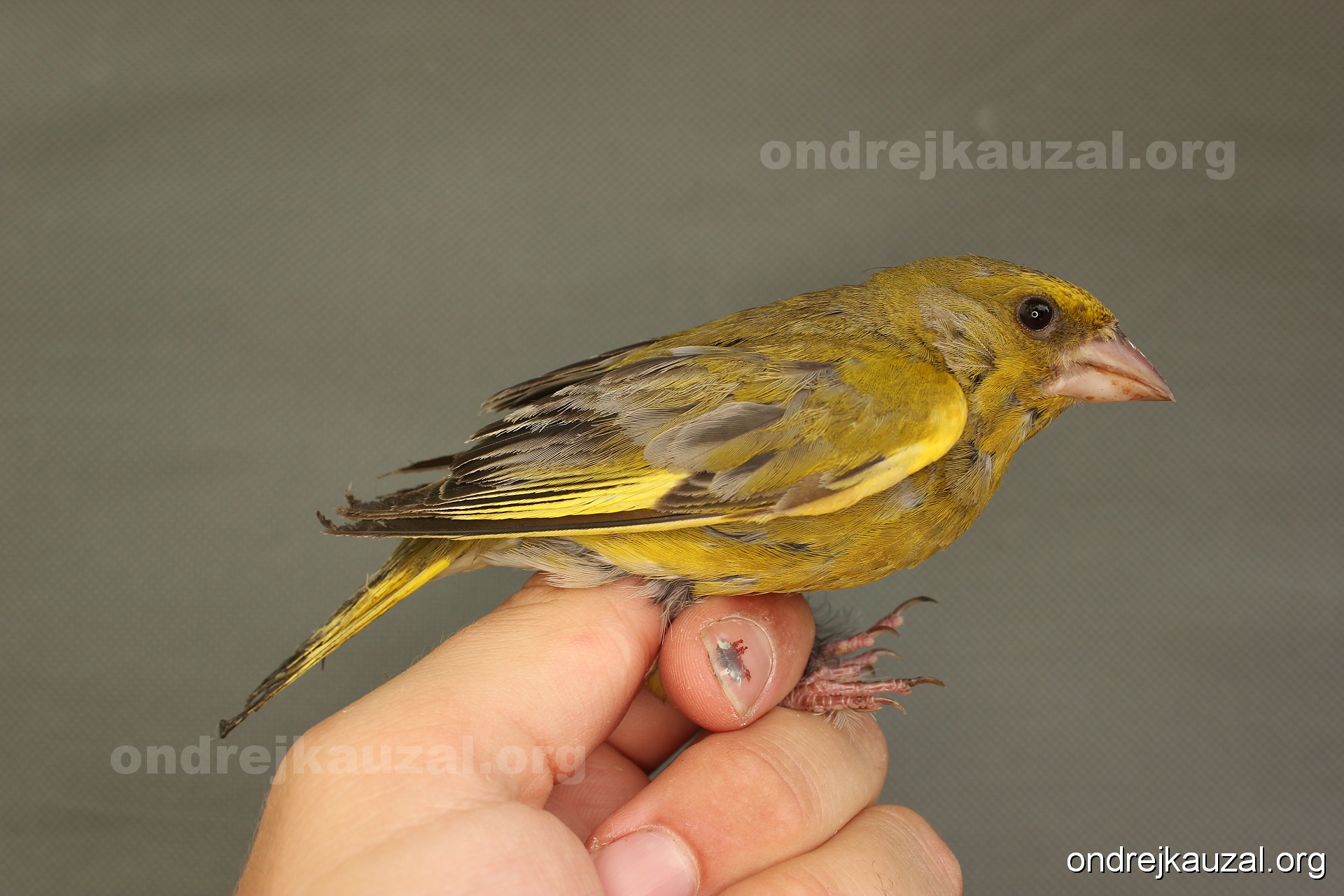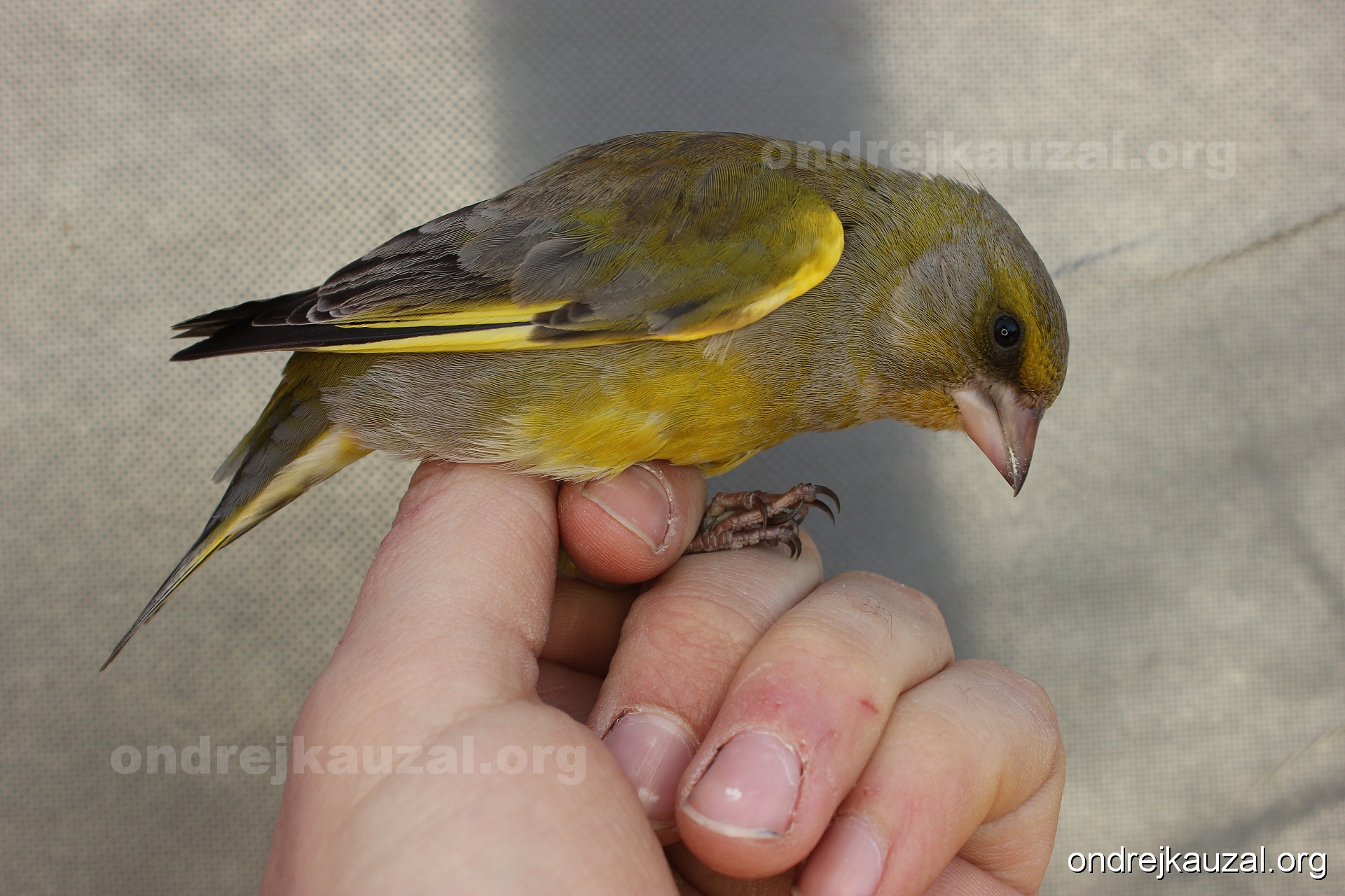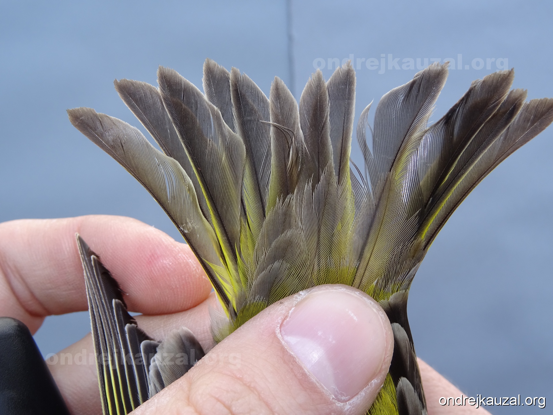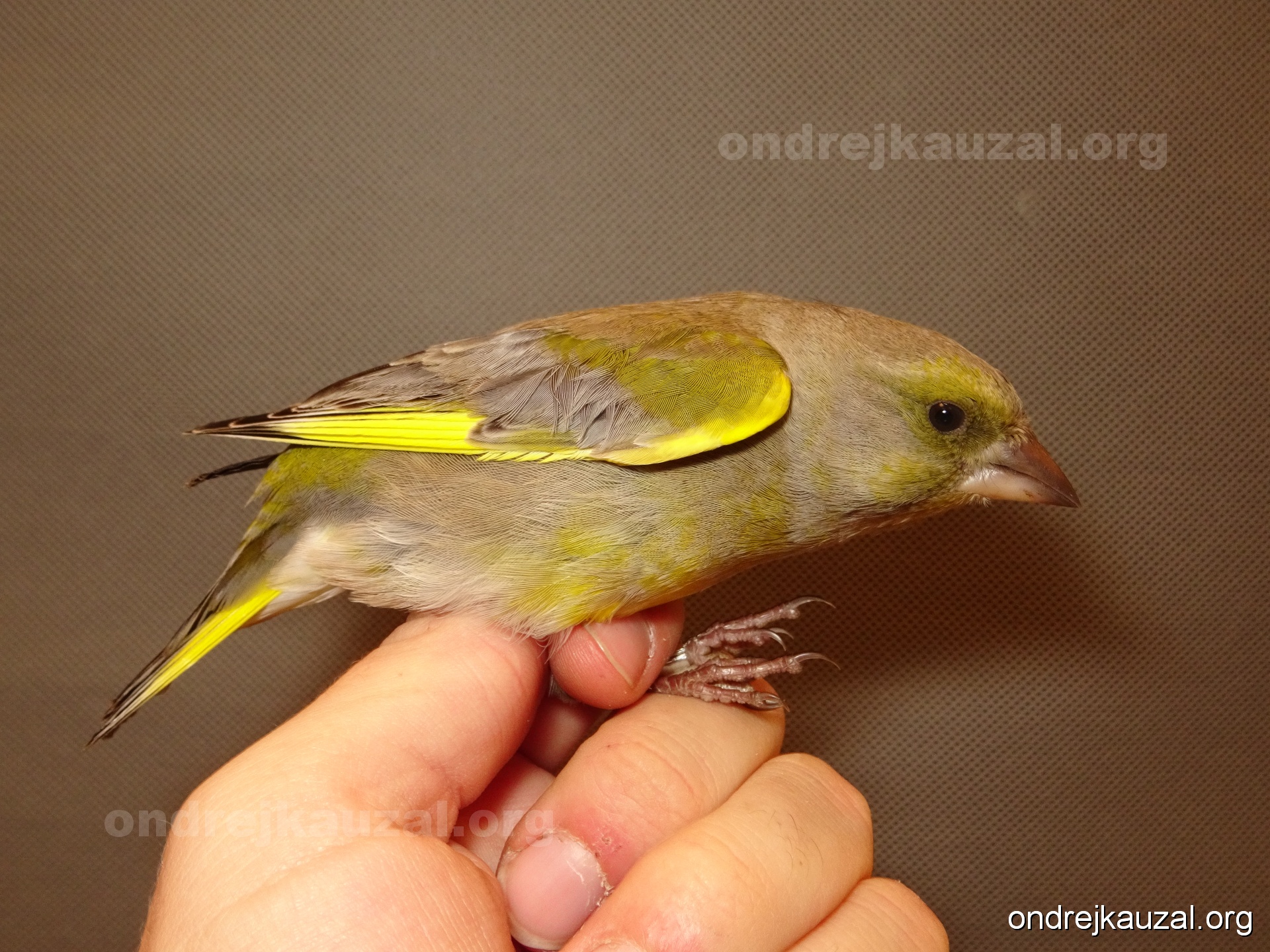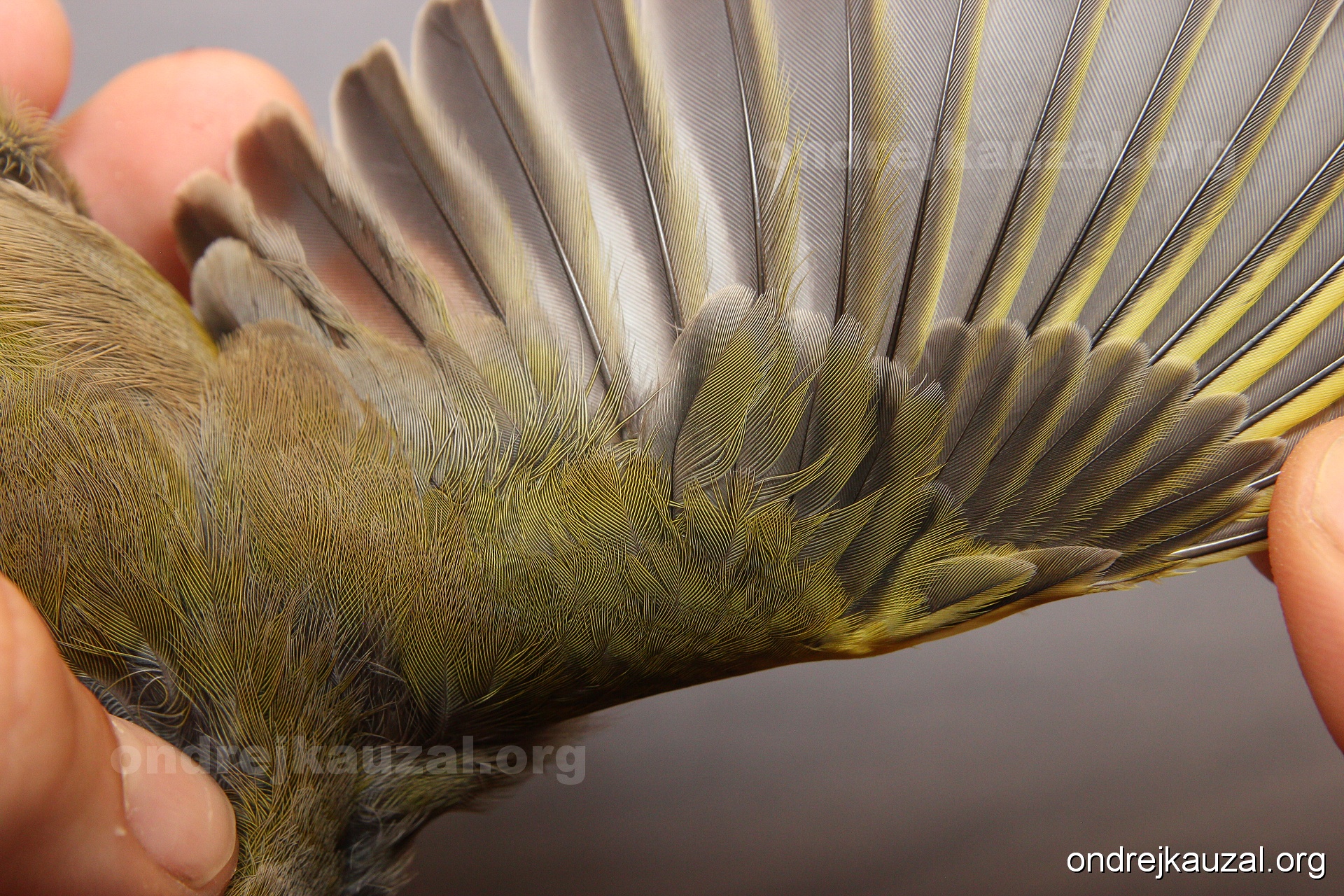 An interesting individual, albeit being in the first year of its life, it has moulted three of its primaries (P5 – P7). Greenfinches occasionally include moult of some primaries during their partial postjuvenile moult.
