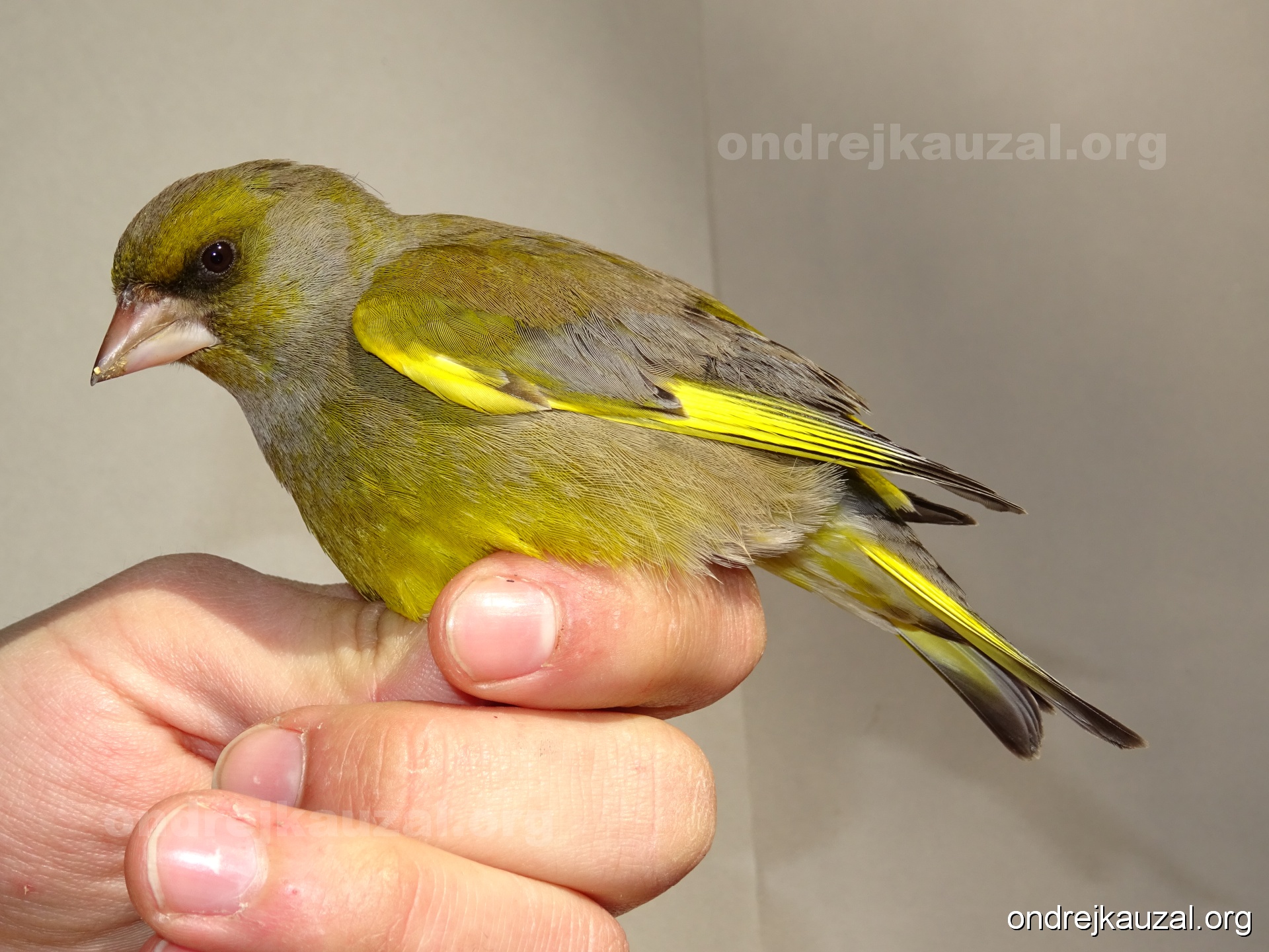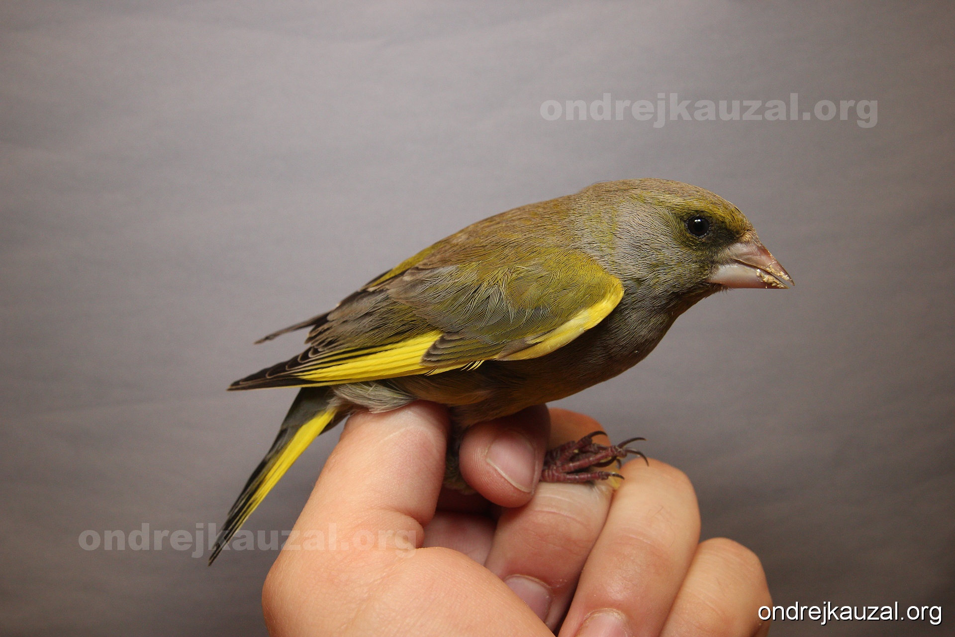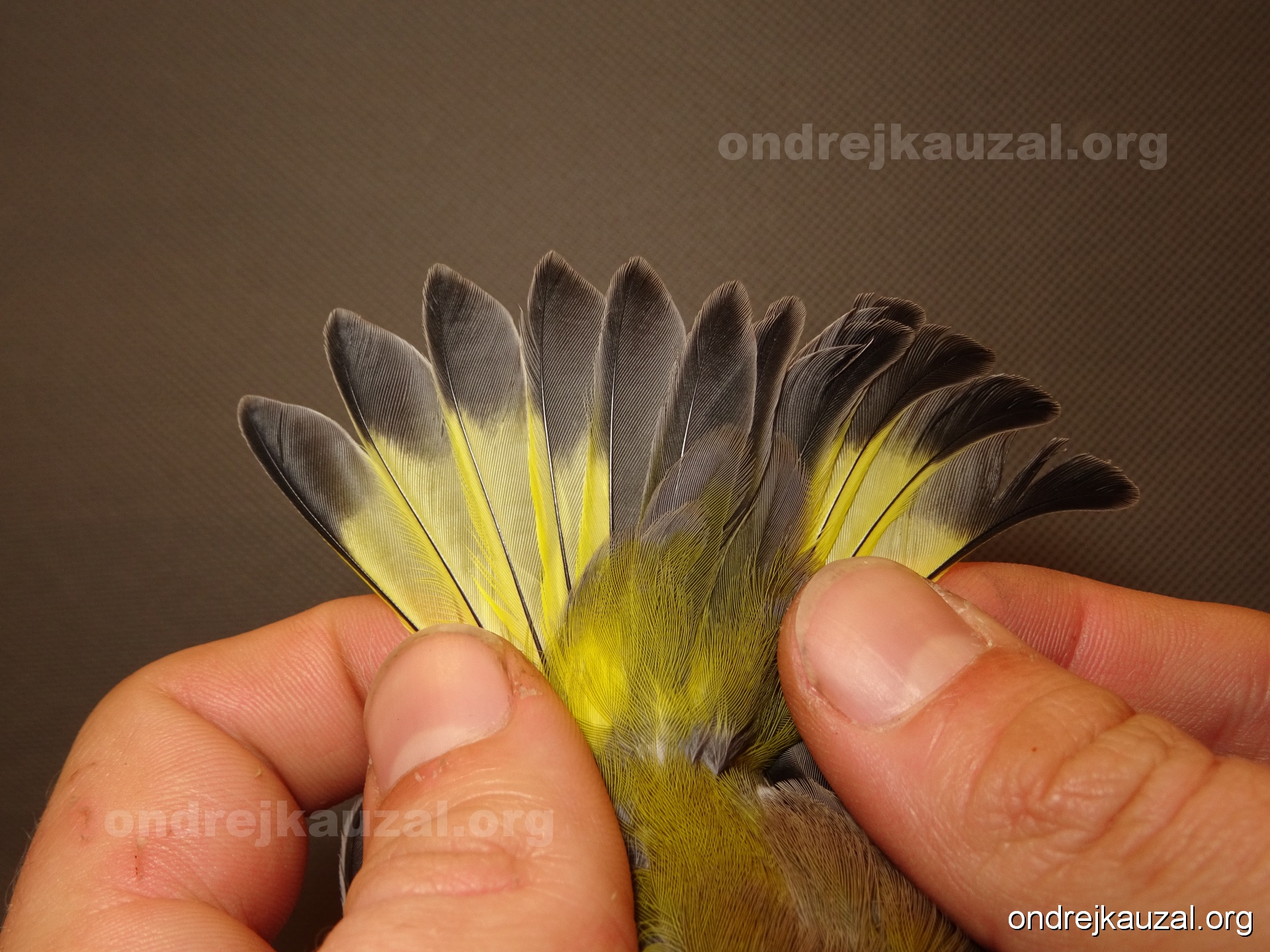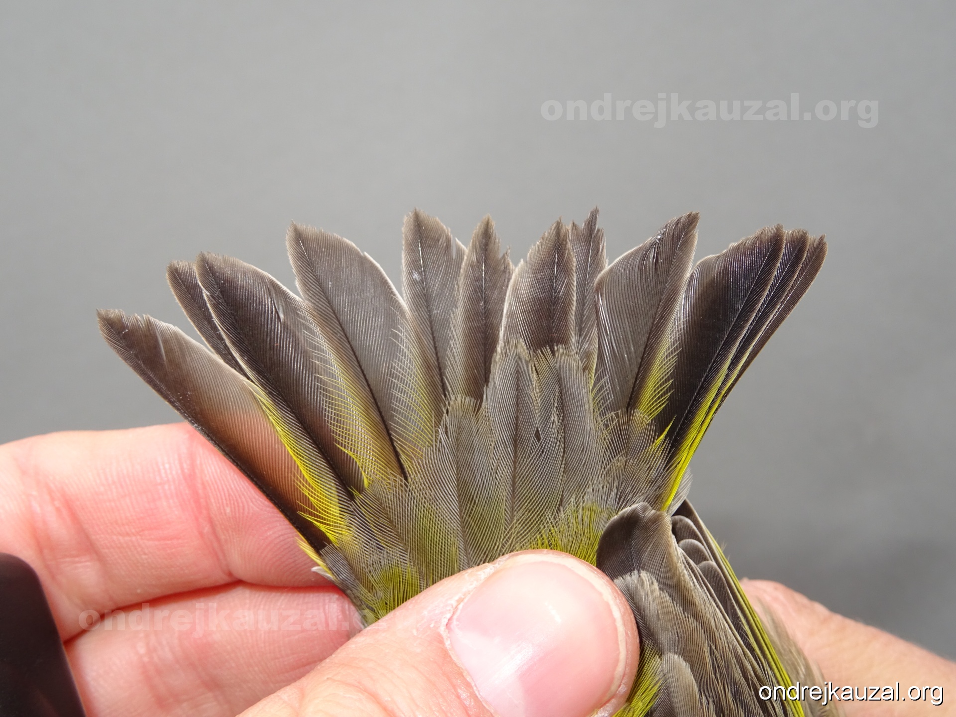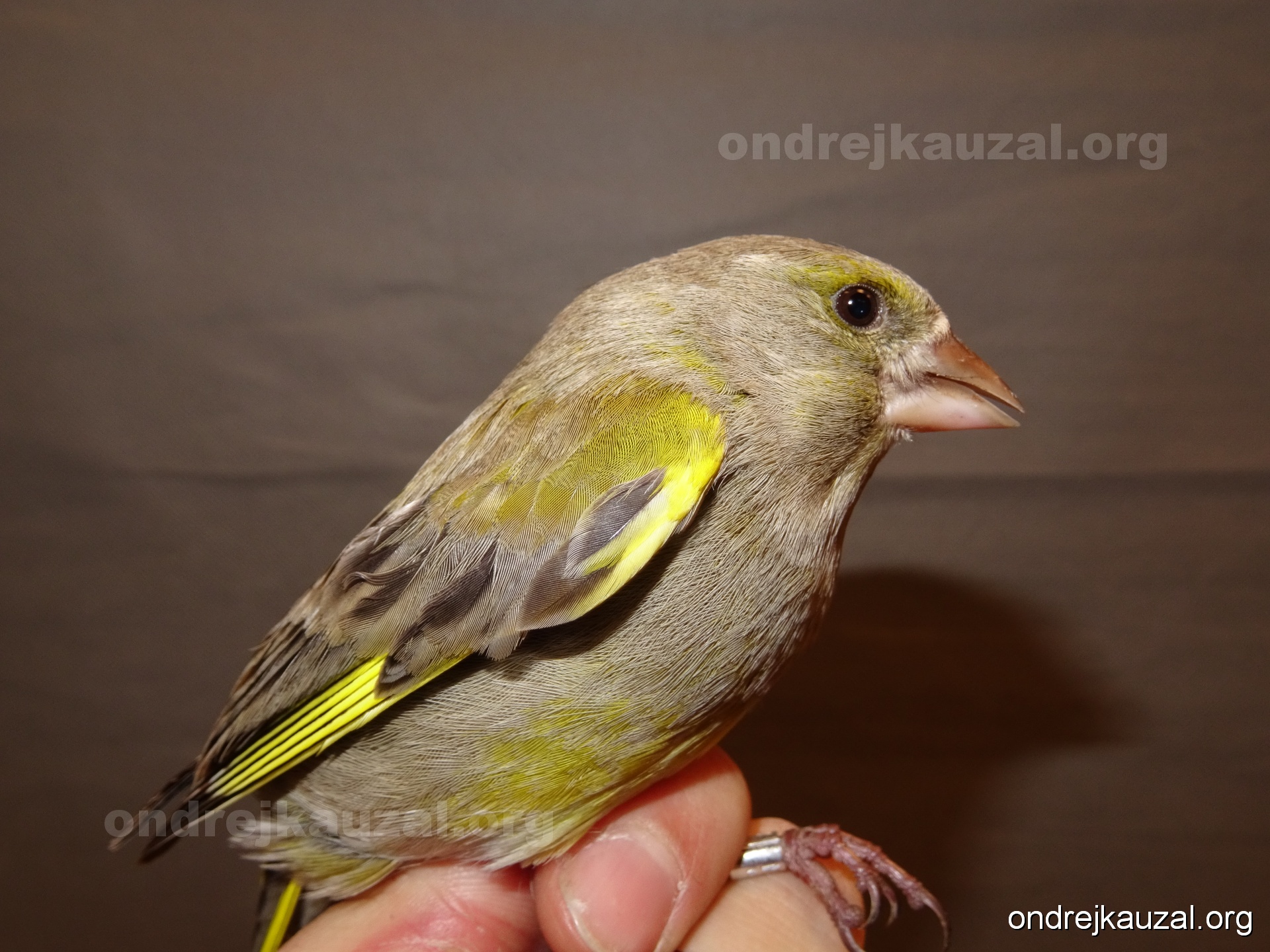 An interesting individual, albeit being in the first year of its life, it has moulted three of its primaries (P5 – P7). Greenfinches occasionally include moult of some primaries during their partial postjuvenile moult.