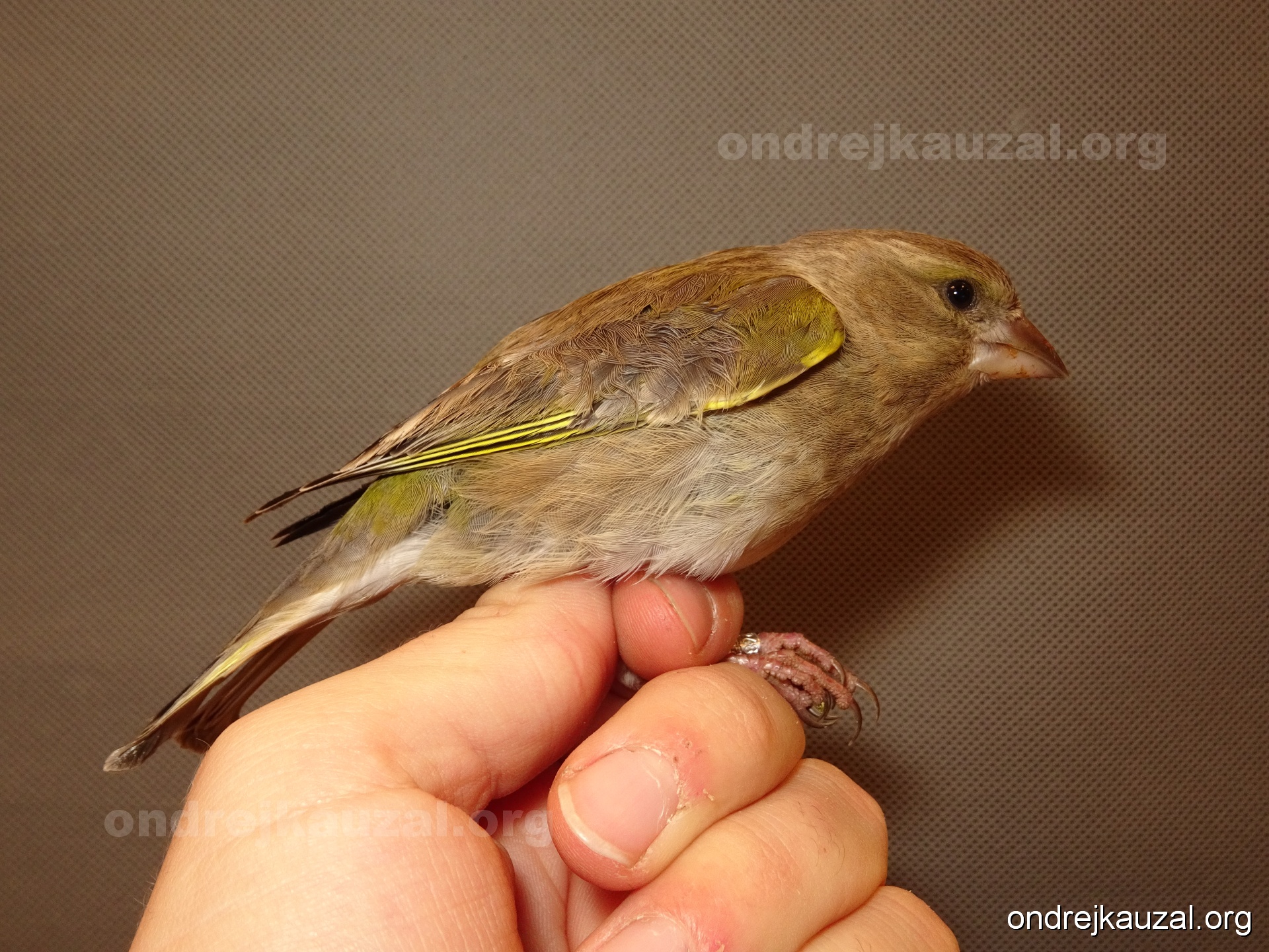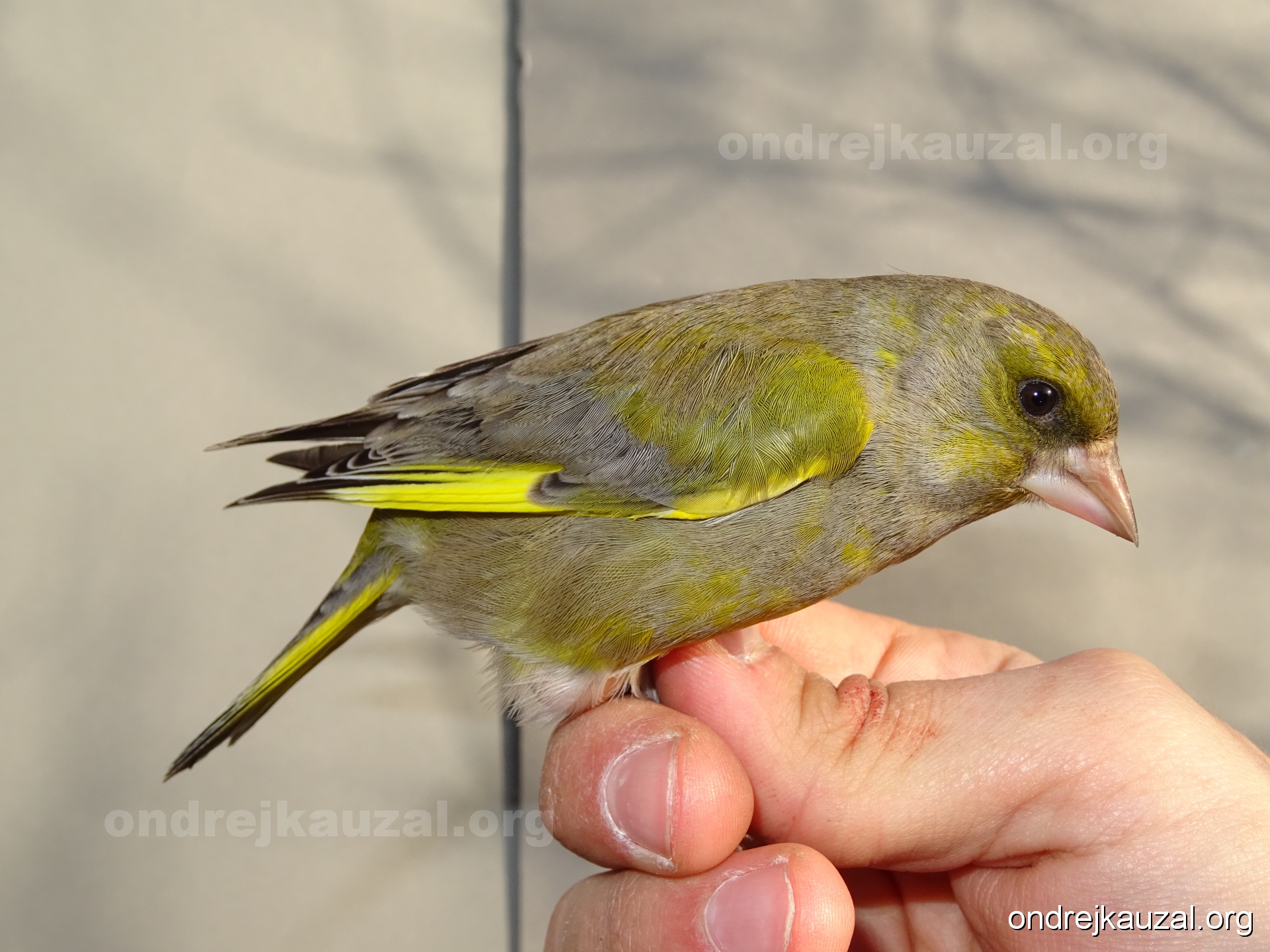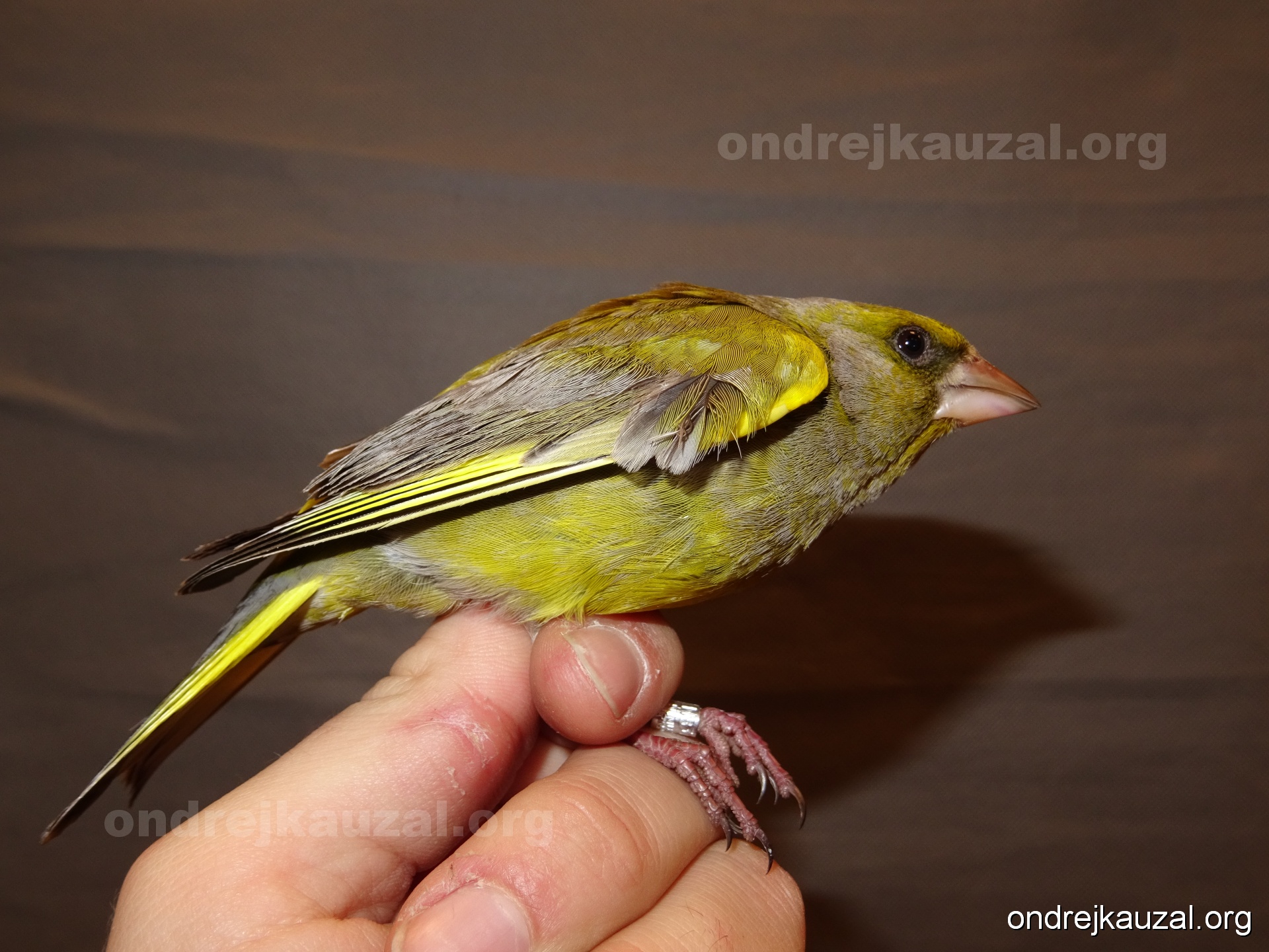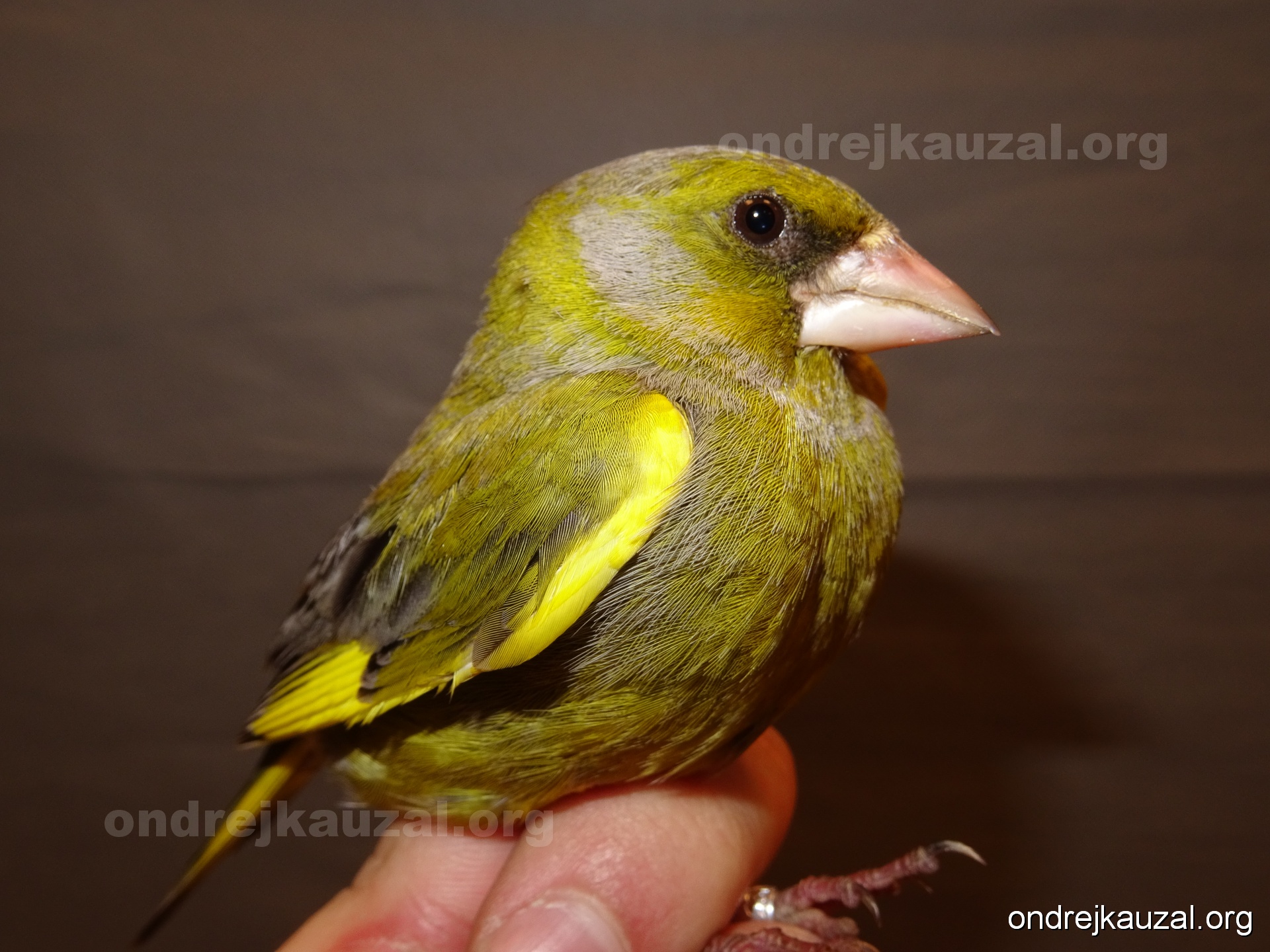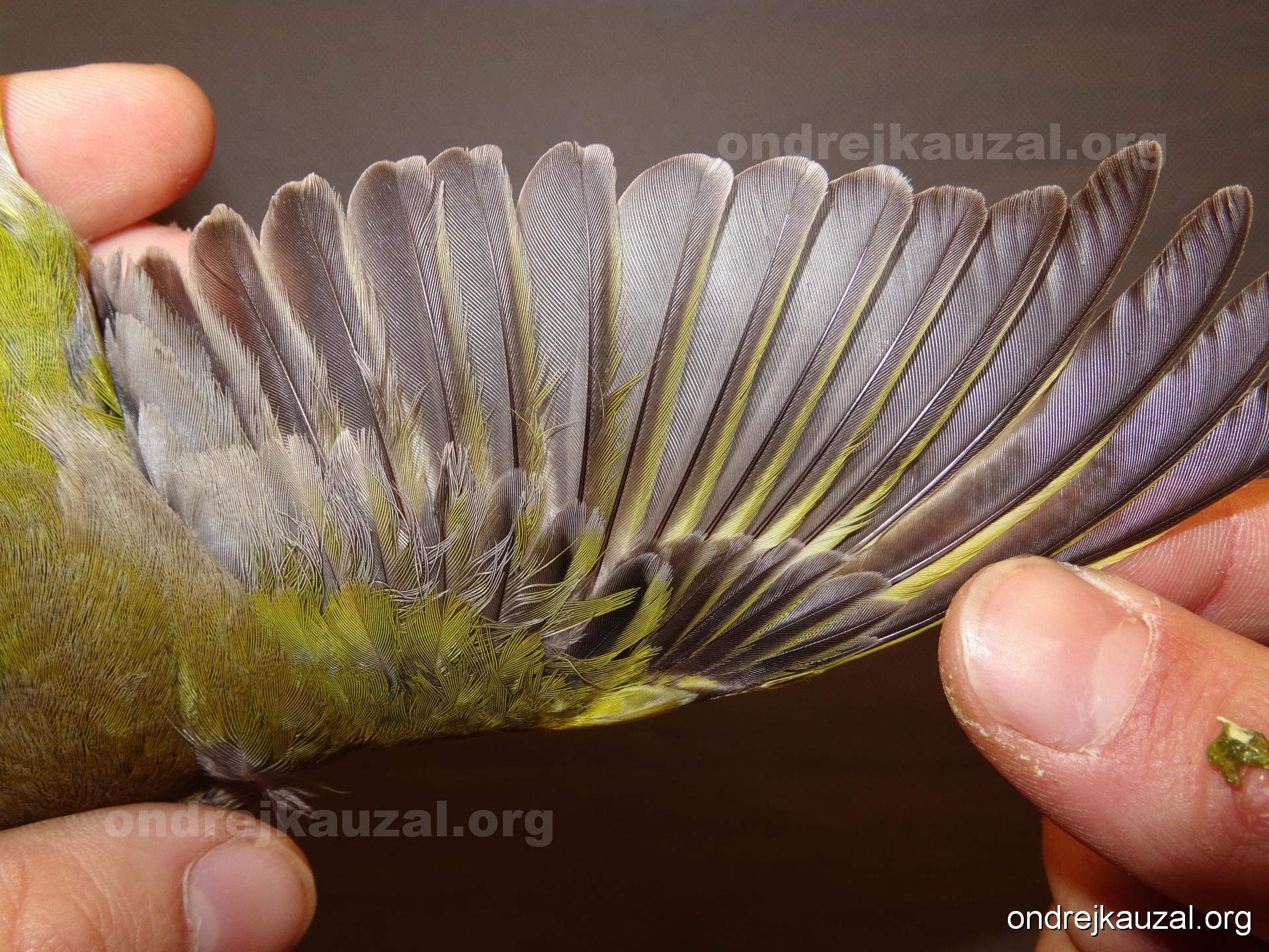 An interesting individual, albeit being in the first year of its life, it has moulted three of its primaries (P5 – P7). Greenfinches occasionally include moult of some primaries during their partial postjuvenile moult.