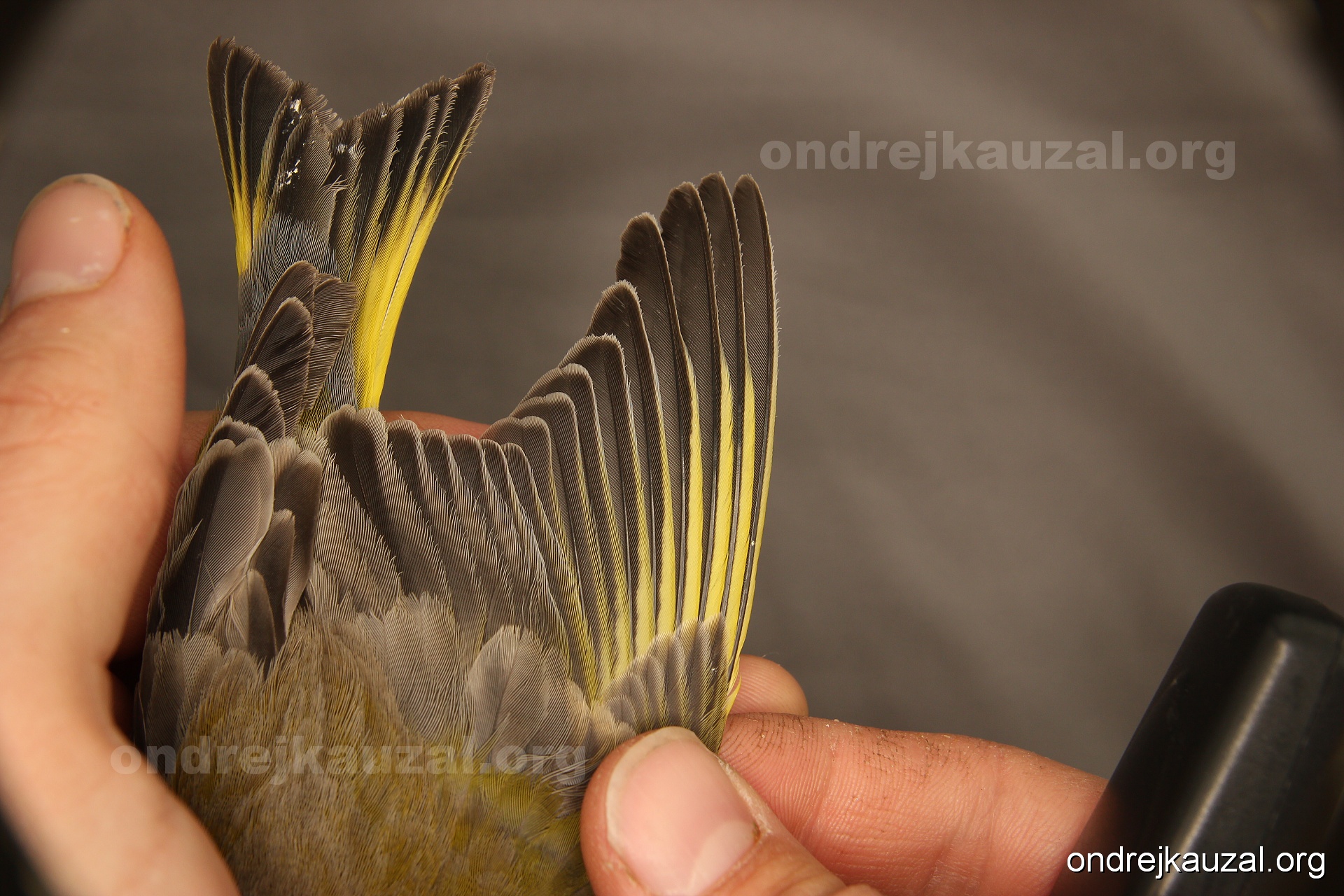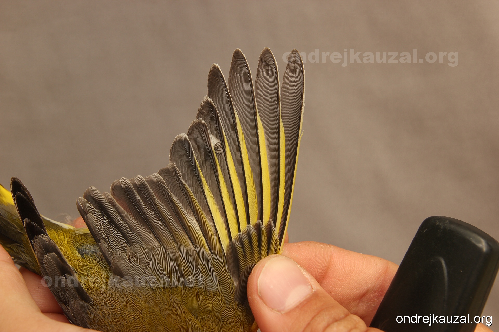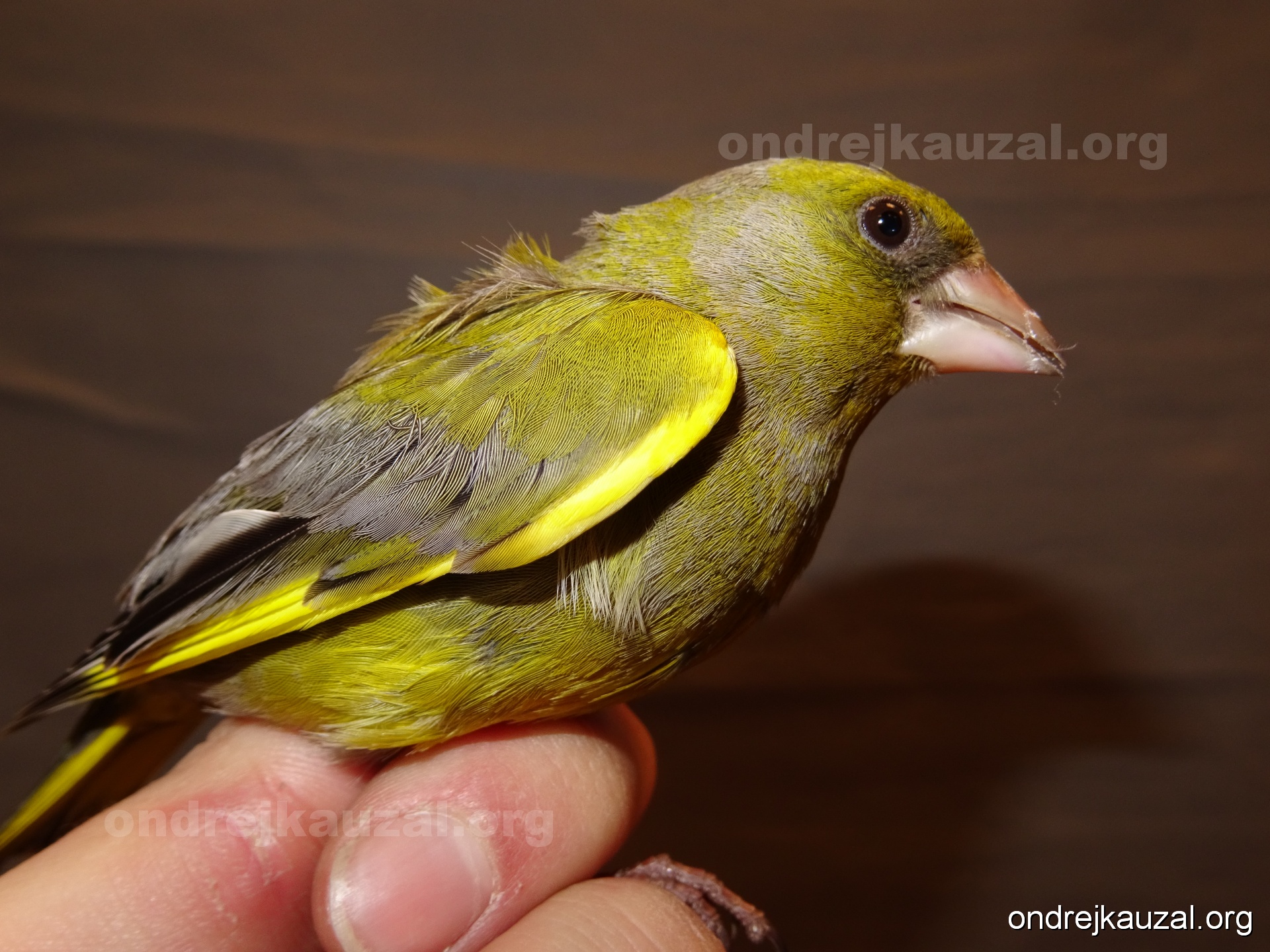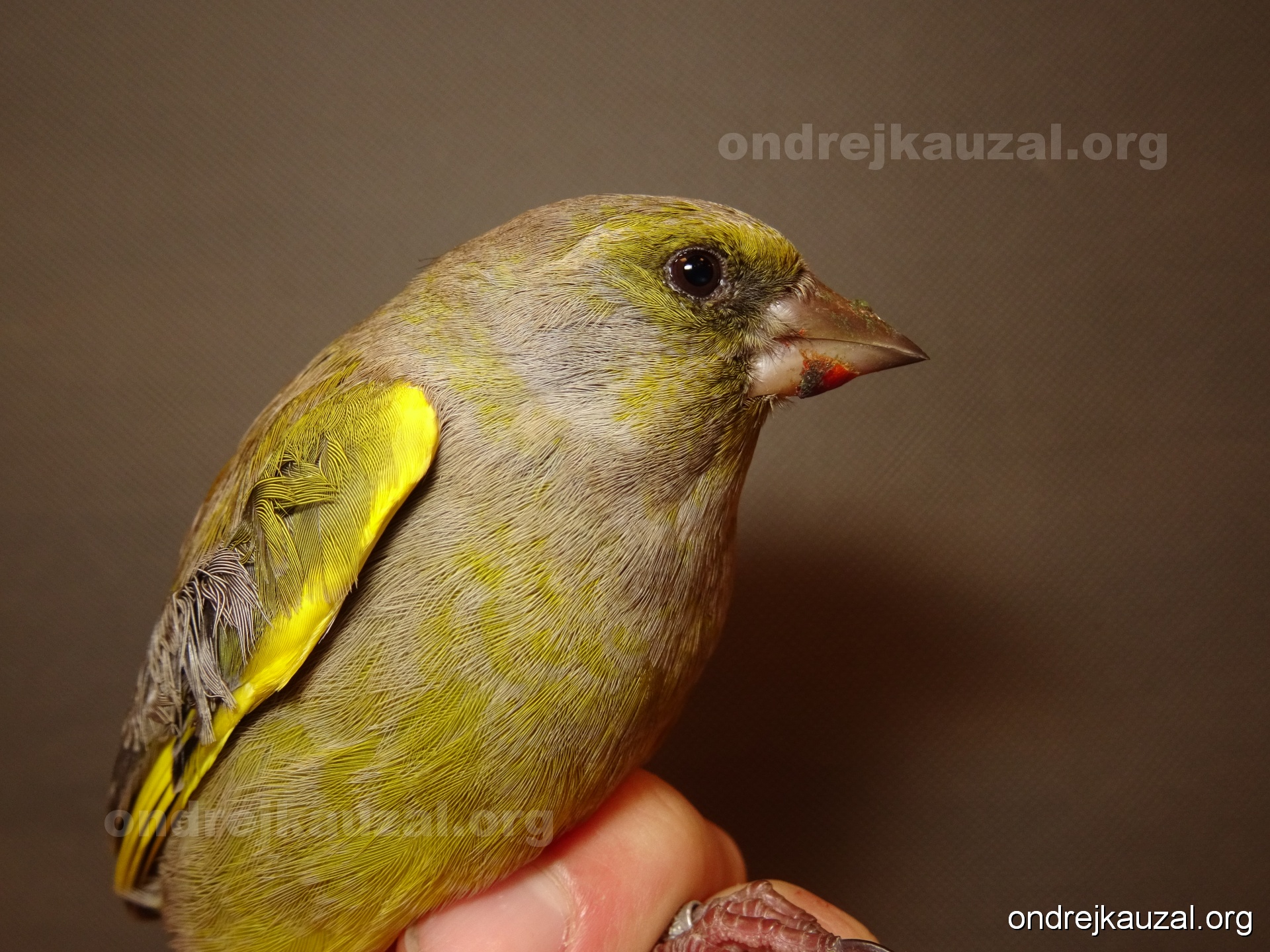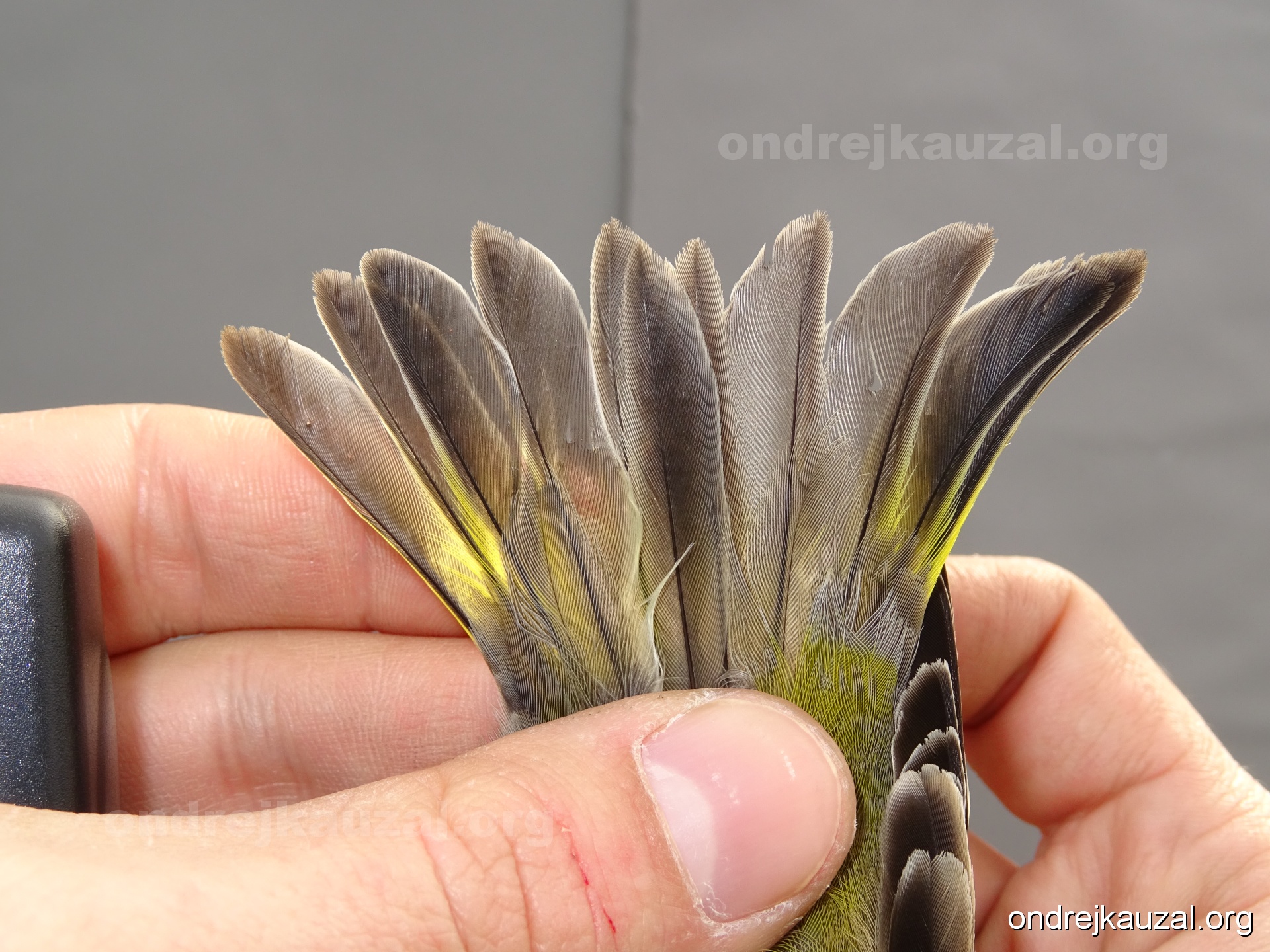 An interesting individual, albeit being in the first year of its life, it has moulted three of its primaries (P5 – P7). Greenfinches occasionally include moult of some primaries during their partial postjuvenile moult.