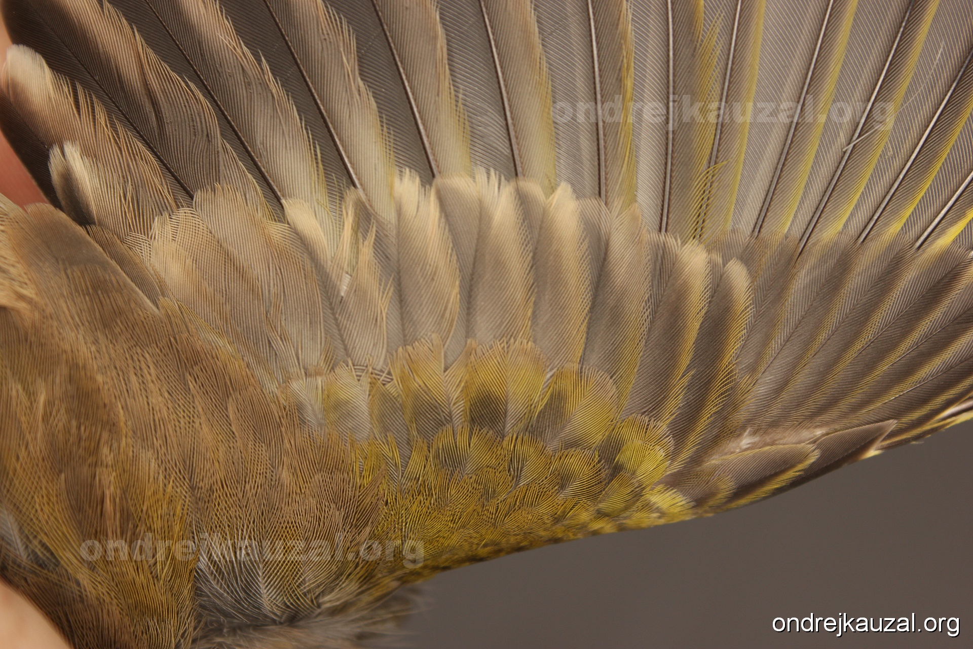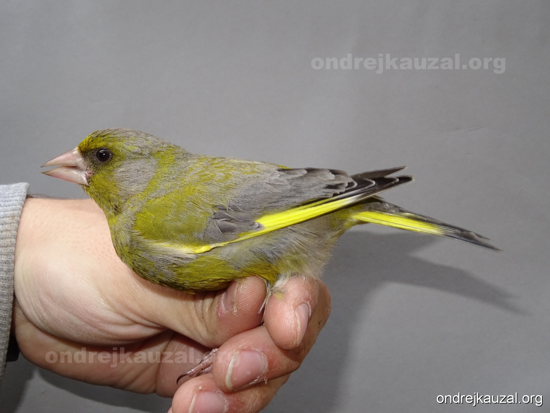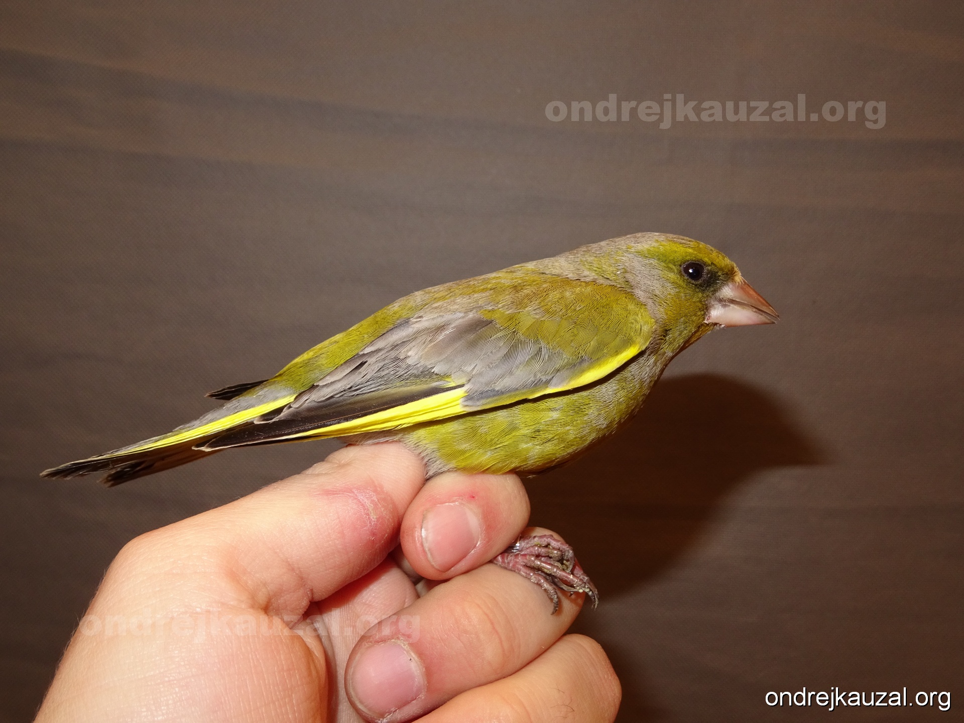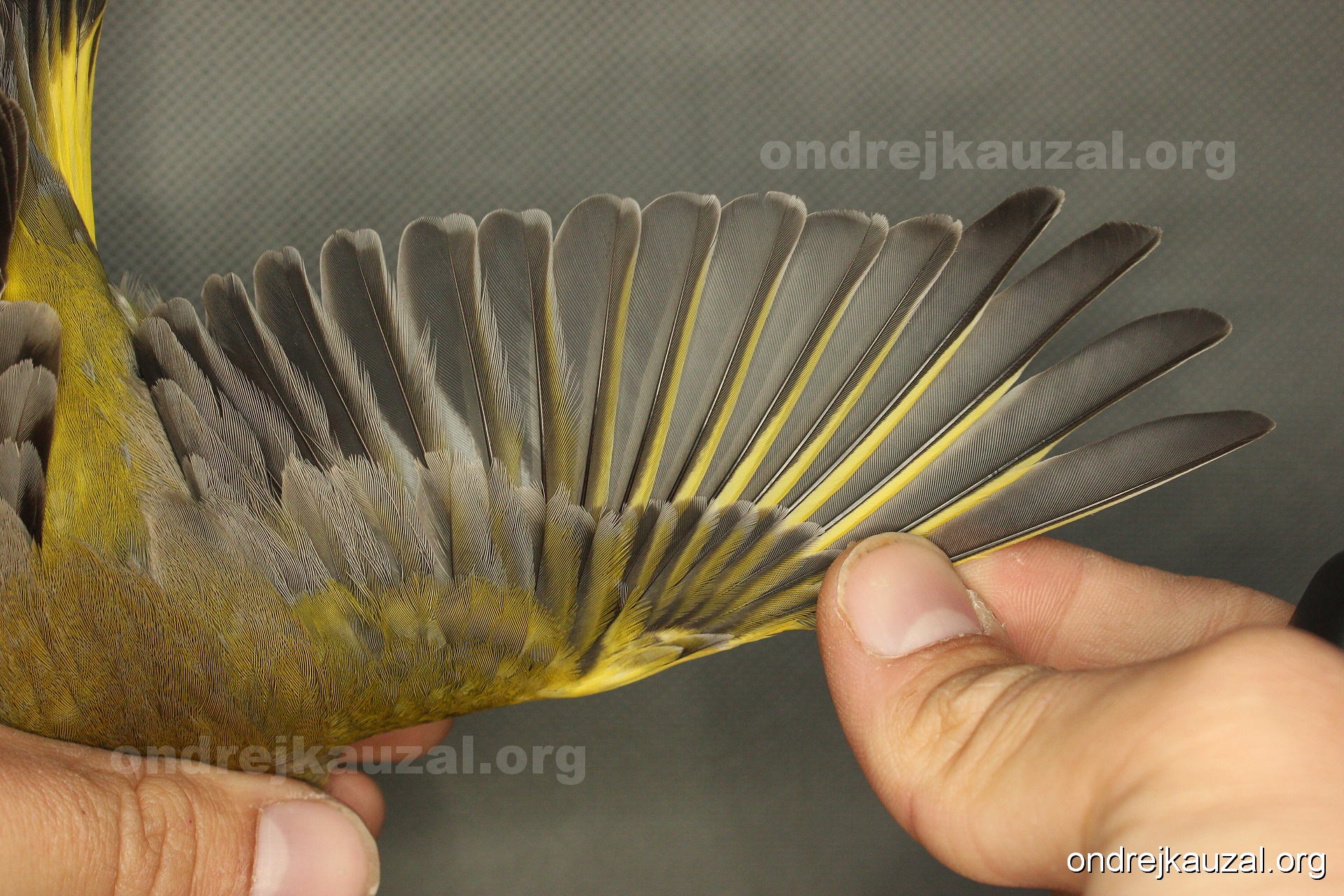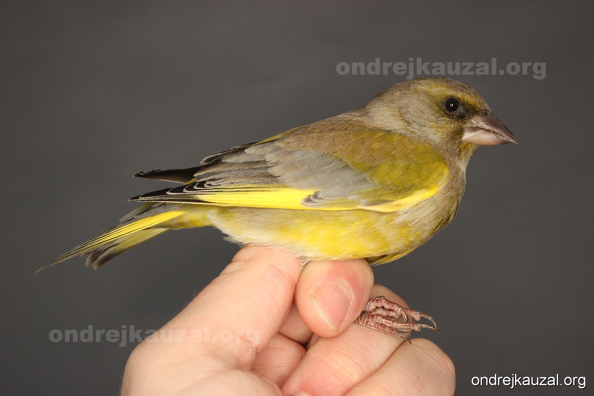 An interesting individual, albeit being in the first year of its life, it has moulted three of its primaries (P5 – P7). Greenfinches occasionally include moult of some primaries during their partial postjuvenile moult.